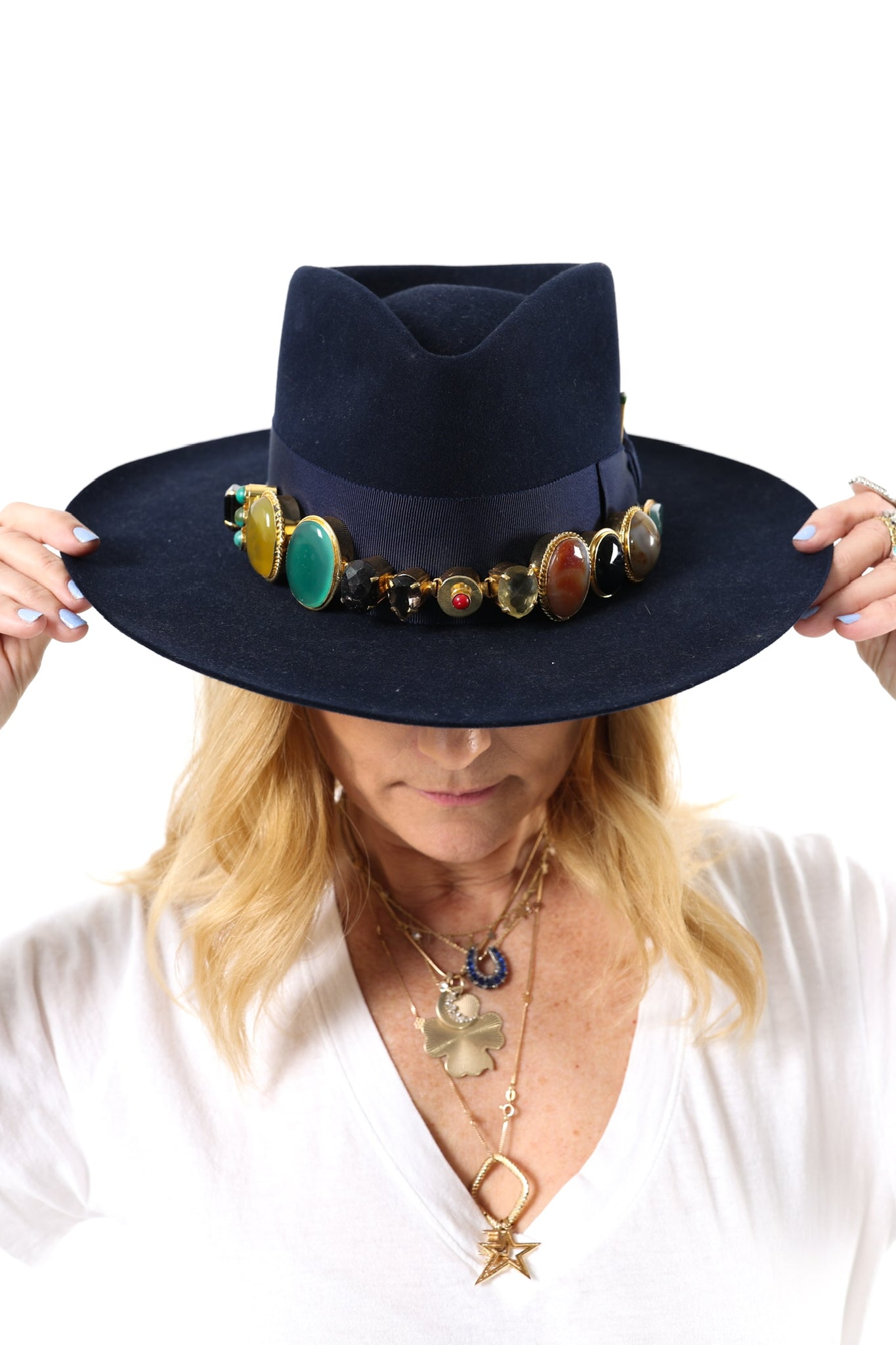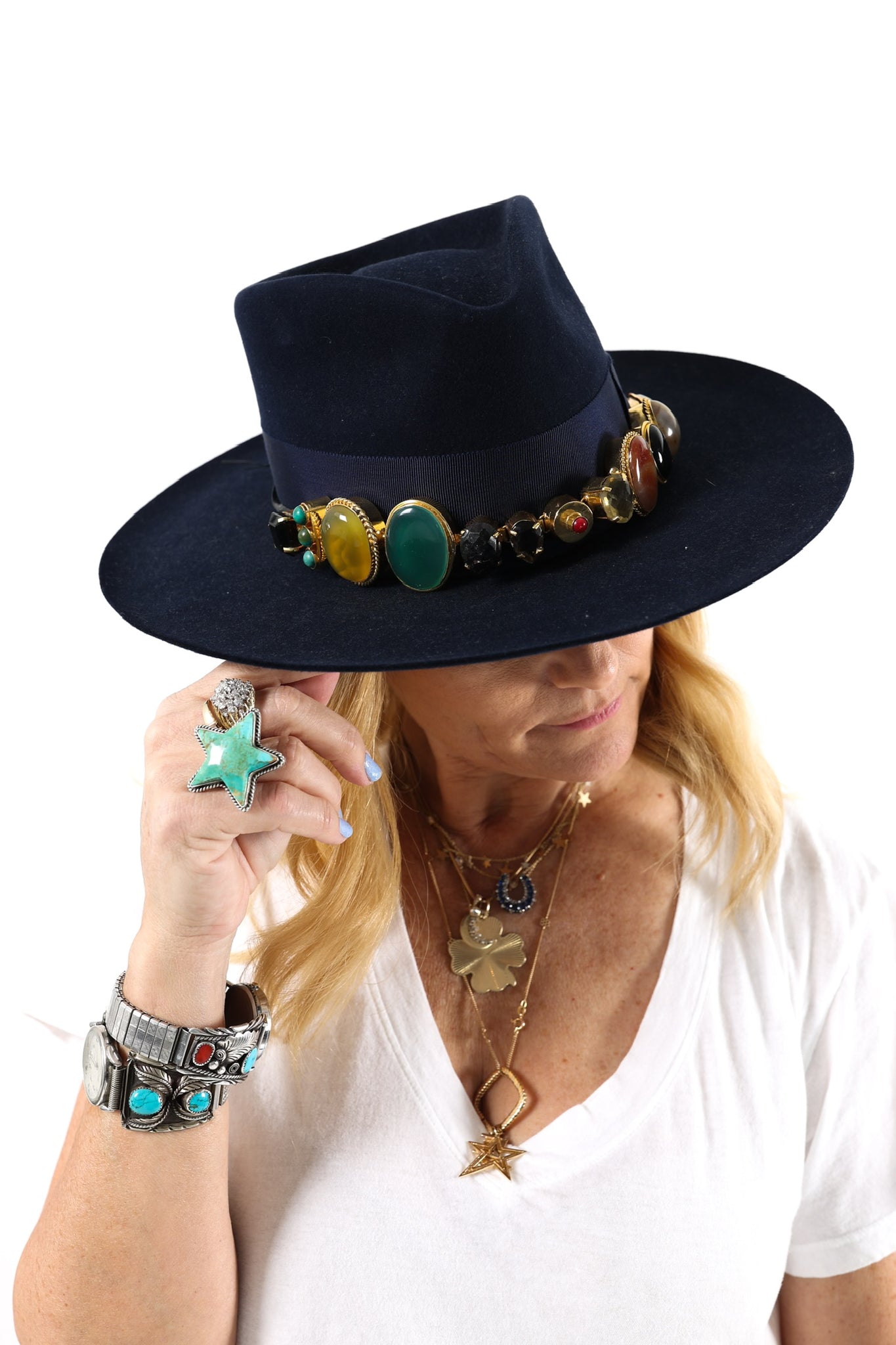Lady Lancaster designed these one of kind hat bands with her friend Moro in Round Top. The components are handmade in Africa. The bands are a combination of stones and glass gems set in brass. There is a leather strap to secure the band around your favorite hat! These pieces are all one of a kind. Due to the amount of stones in the band, they will add a little weight to your hat, however, we believe it is worth it! Please feel free to reach out with any questions or if you would like more info!
