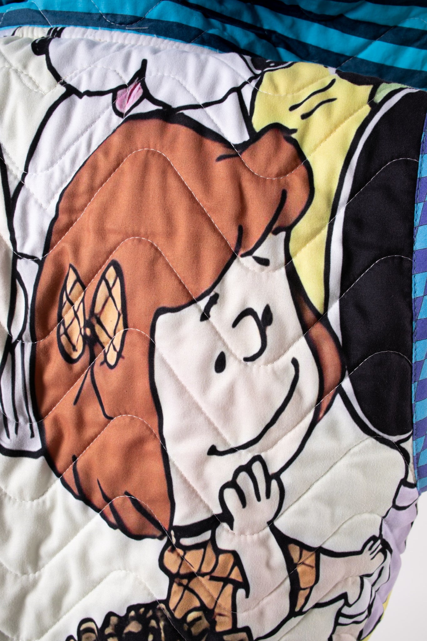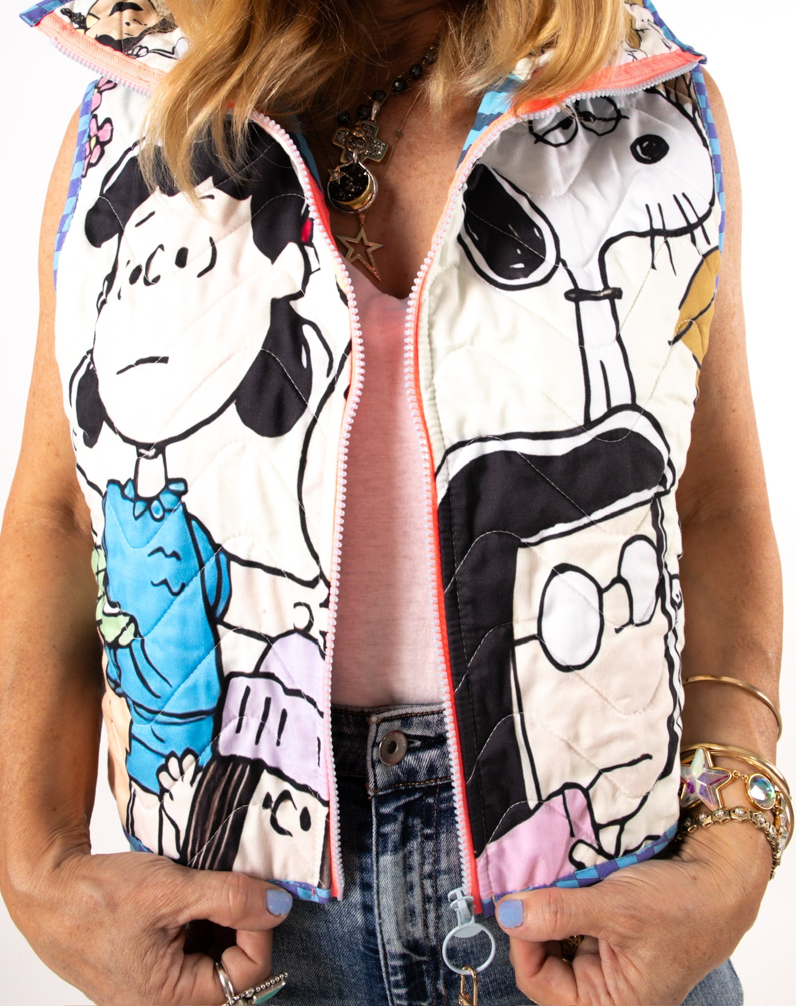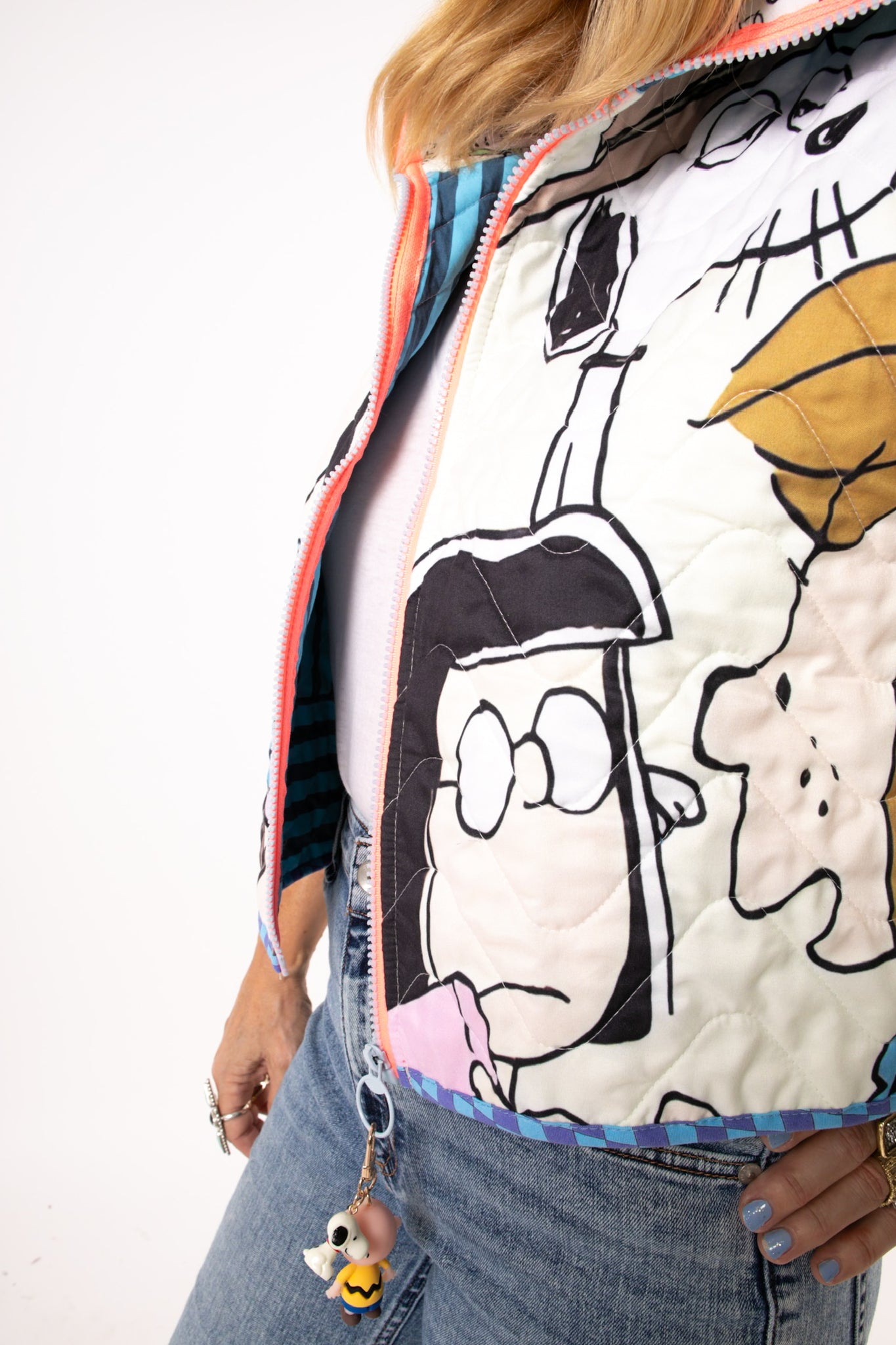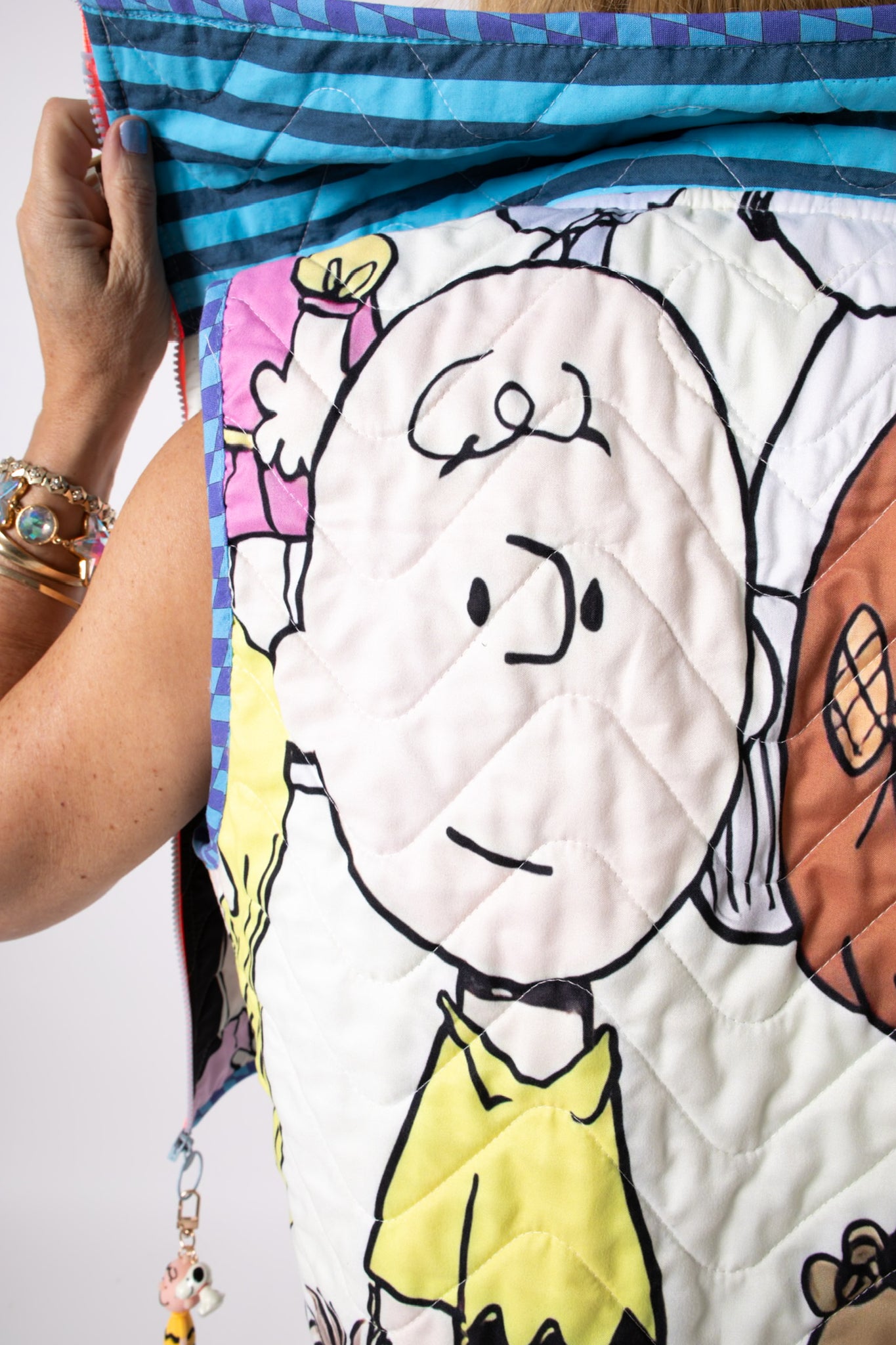 This is an ode to Charles Schultz and part of our Capsule Collection! To make this piece we quilted a vintage Peanuts bedspread with novelty fabric. This is a conversation starter and just plain fun! For a closure we used a neon zipper! We added two sweet interchangeable zipper charms featuring Snoopy and Charlie Brown. In an era when purse charms are all the rage, consider it our modern Labubu. This vest is a Small/Medium. It is designed to be a cropped and boxy fit. Please read the size measurements below for best fit! In our opinion, the quilt is super soft, thin, and has very little loft. If you have further questions, please direct message us and we are happy to send you a video.