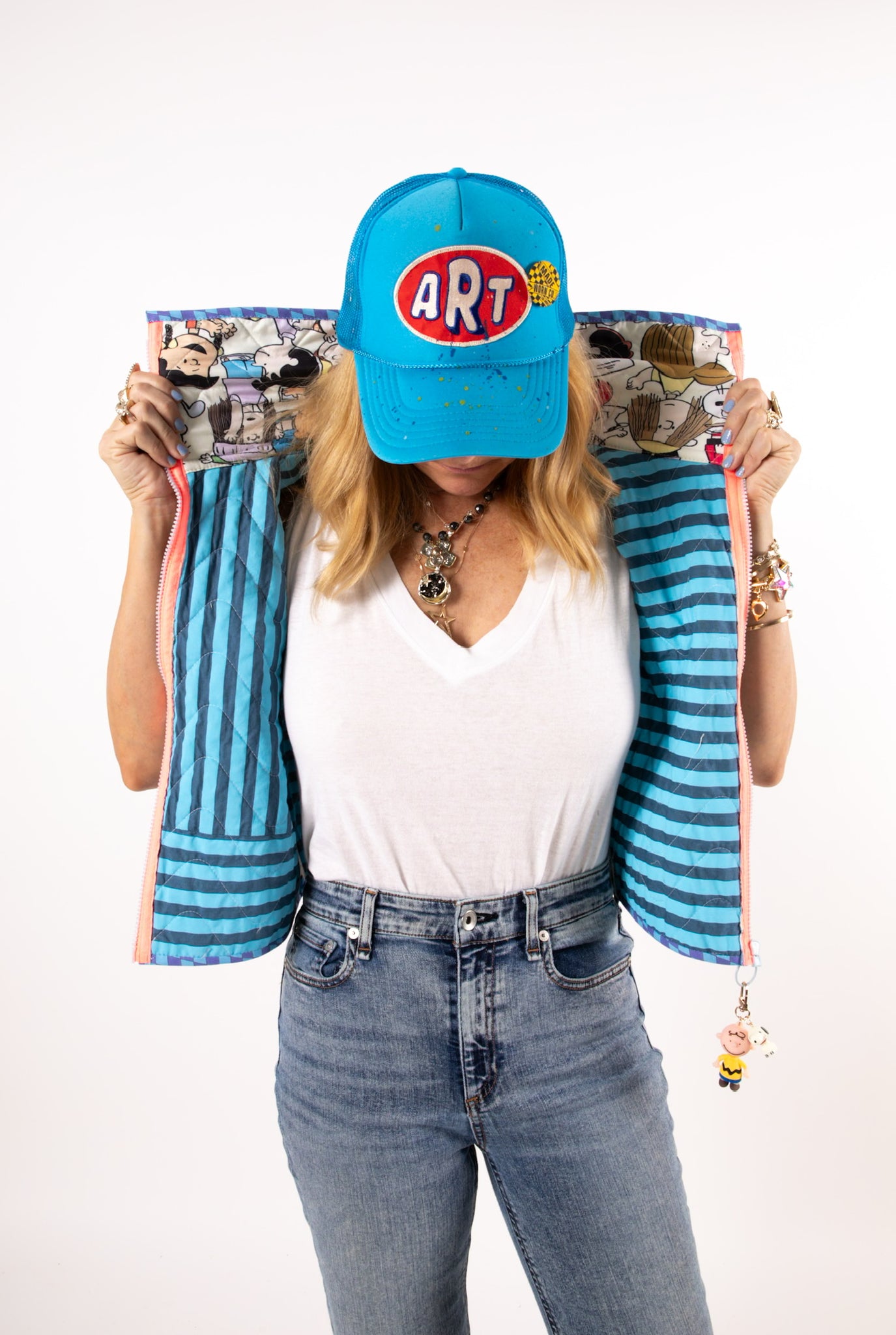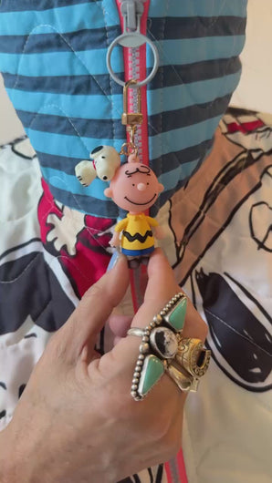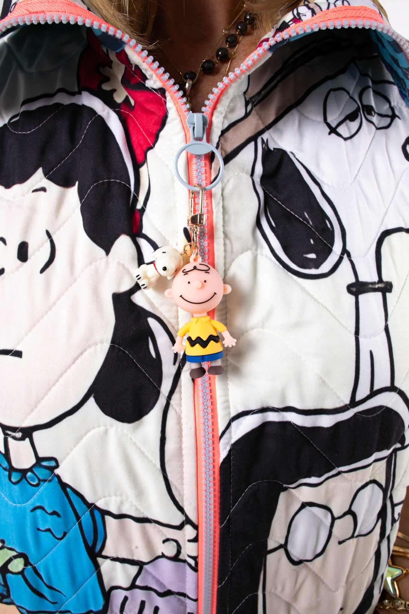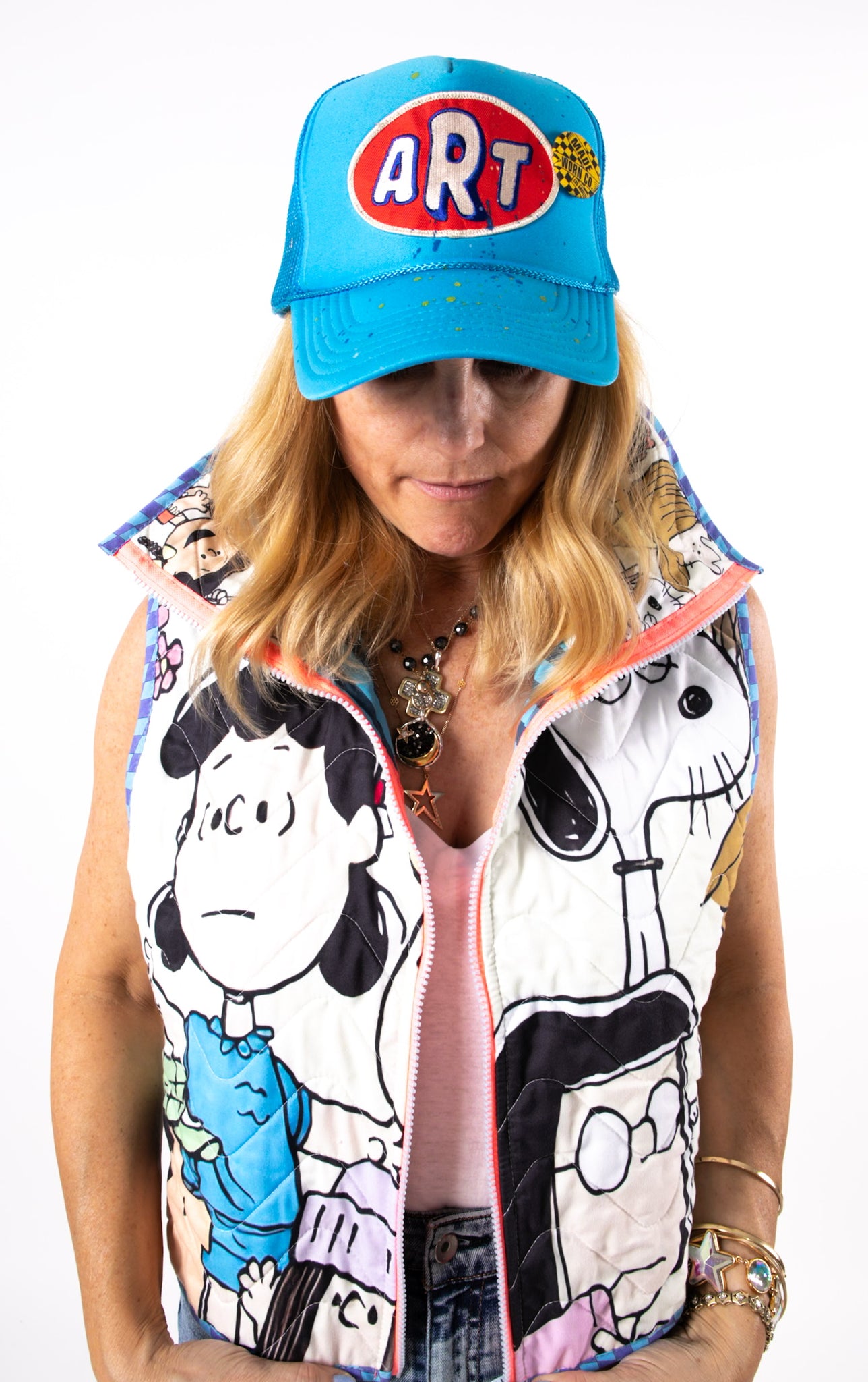 This is an ode to Charles Schultz and part of our Capsule Collection! To make this piece we quilted a vintage Peanuts bedspread with novelty fabric. This is a conversation starter and just plain fun! For a closure we used a neon zipper! We added two sweet interchangeable zipper charms featuring Snoopy and Charlie Brown. In an era when purse charms are all the rage, consider it our modern Labubu. This vest is a Small/Medium. It is designed to be a cropped and boxy fit. Please read the size measurements below for best fit! In our opinion, the quilt is super soft, thin, and has very little loft. If you have further questions, please direct message us and we are happy to send you a video.
