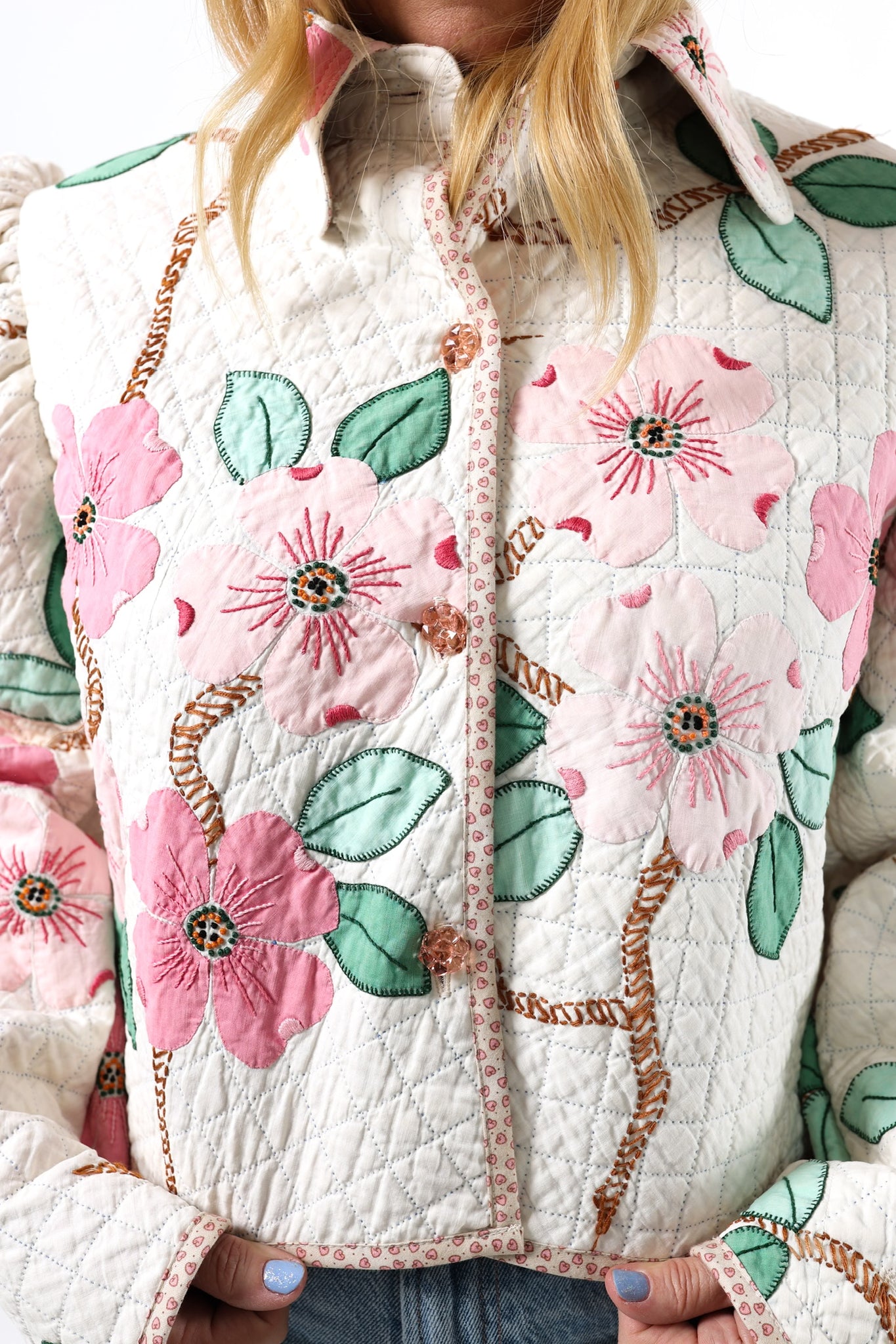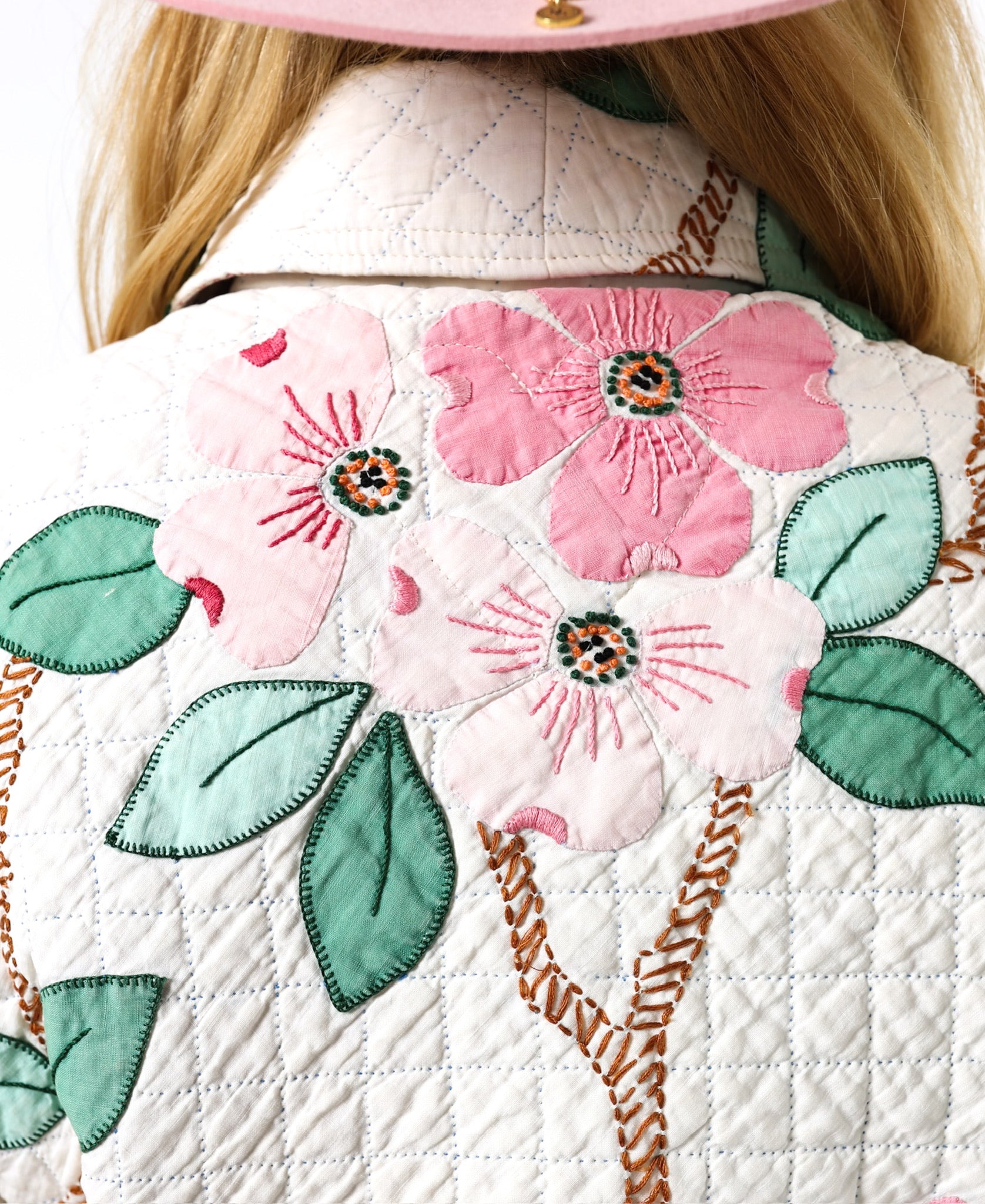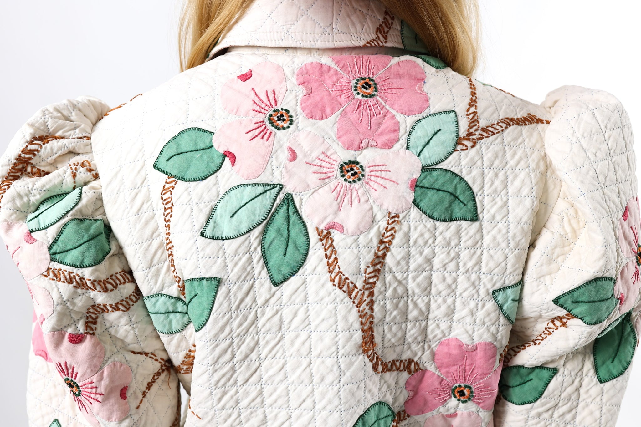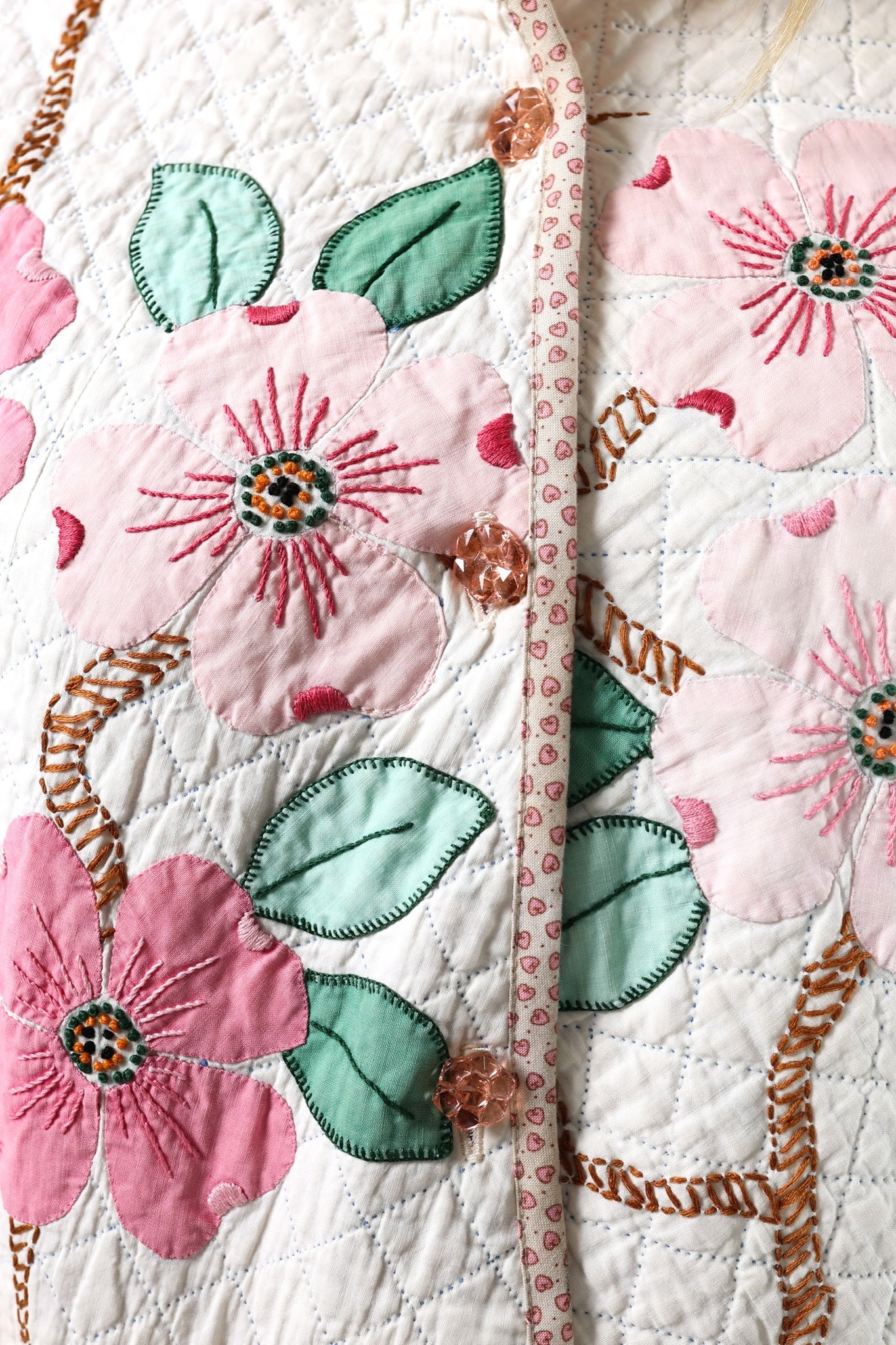 This is an American antique appliqué quilt made circa 1930s to 1960s. It is a beautiful and rare Dogwood quilt. This quilt was made by a master. It is meticulously hand quilted, beautifully hand appliqued, masterfully hand embroidered! The maker backed this quilt with a quality coordinating pink fabric. You will want to cuff the sleeves to show this off! For closures, we added antique pink glass button. In our opinion, the jacket is very thin, made with very soft luxe cotton, and is very comfortable to wear. Please note: there are a few minor age spots and zig zag mends. This is our Queen Bee jacket but without the fitted waist band. Please read measurements below for best fit! If you have any fit questions or would like to see more images or videos of this please direct message us and we would be happy to oblige.