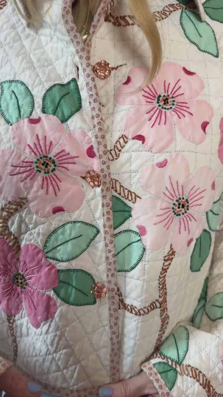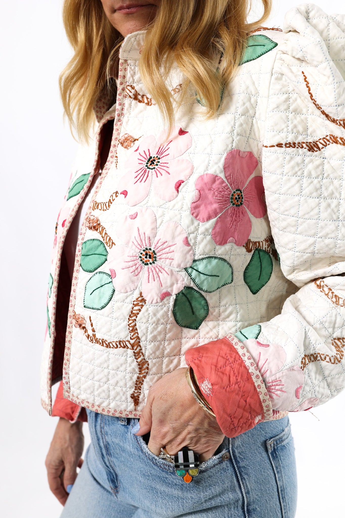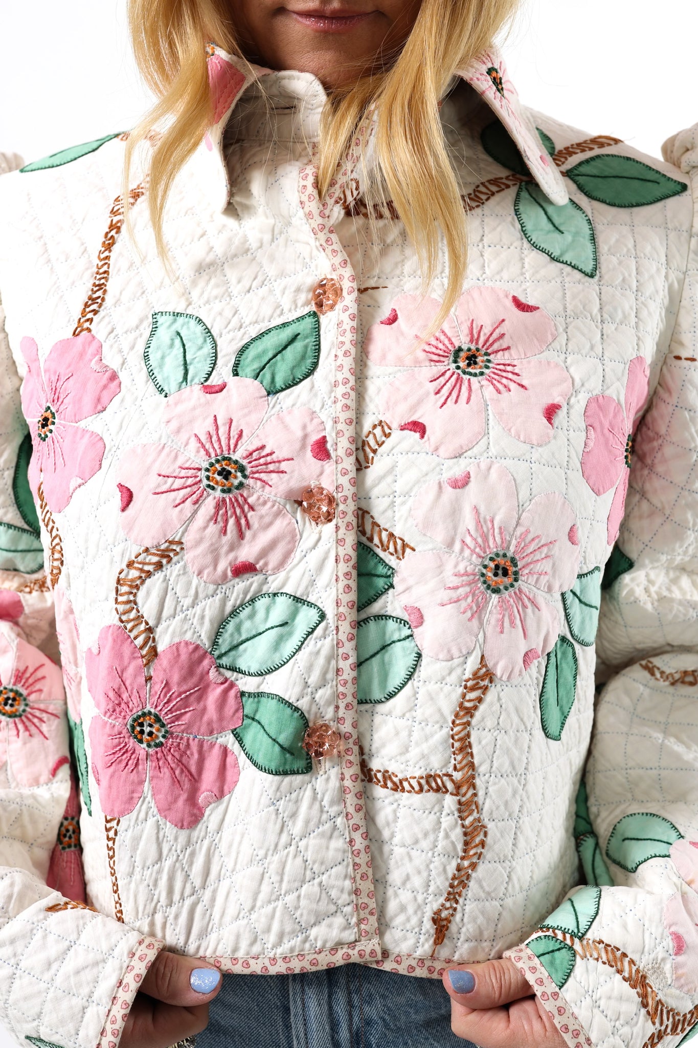 This is an American antique appliqué quilt made circa 1930s to 1960s. It is a beautiful and rare Dogwood quilt. This quilt was made by a master. It is meticulously hand quilted, beautifully hand appliqued, masterfully hand embroidered! The maker backed this quilt with a quality coordinating pink fabric. You will want to cuff the sleeves to show this off! For closures, we added antique pink glass button. In our opinion, the jacket is very thin, made with very soft luxe cotton, and is very comfortable to wear. Please note: there are a few minor age spots and zig zag mends. This is our Queen Bee jacket but without the fitted waist band. Please read measurements below for best fit! If you have any fit questions or would like to see more images or videos of this please direct message us and we would be happy to oblige.