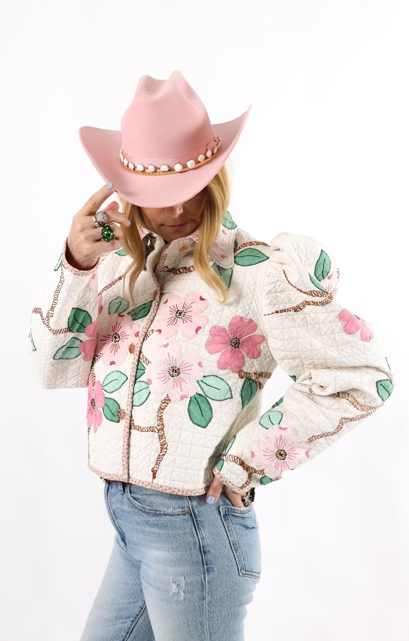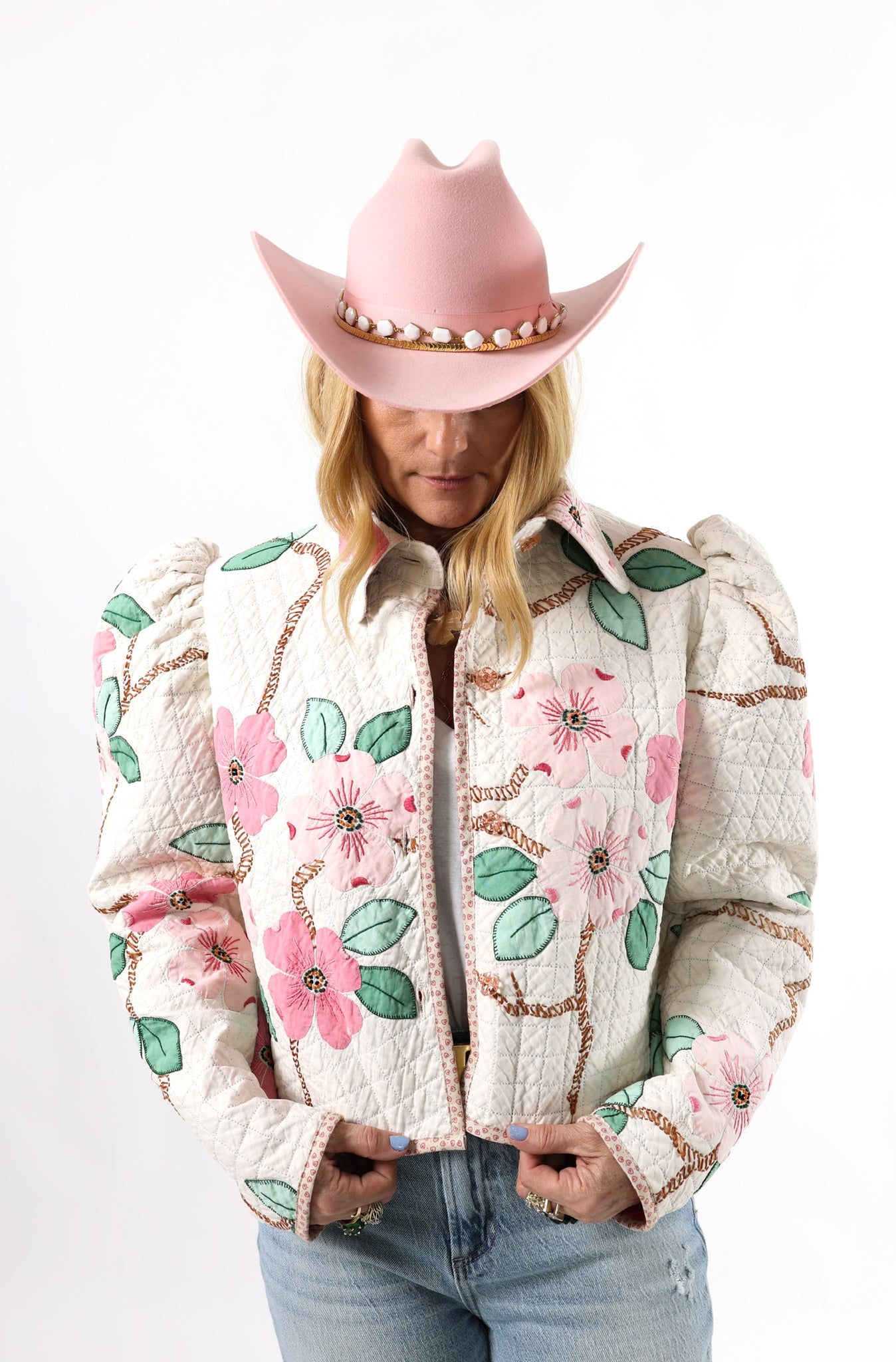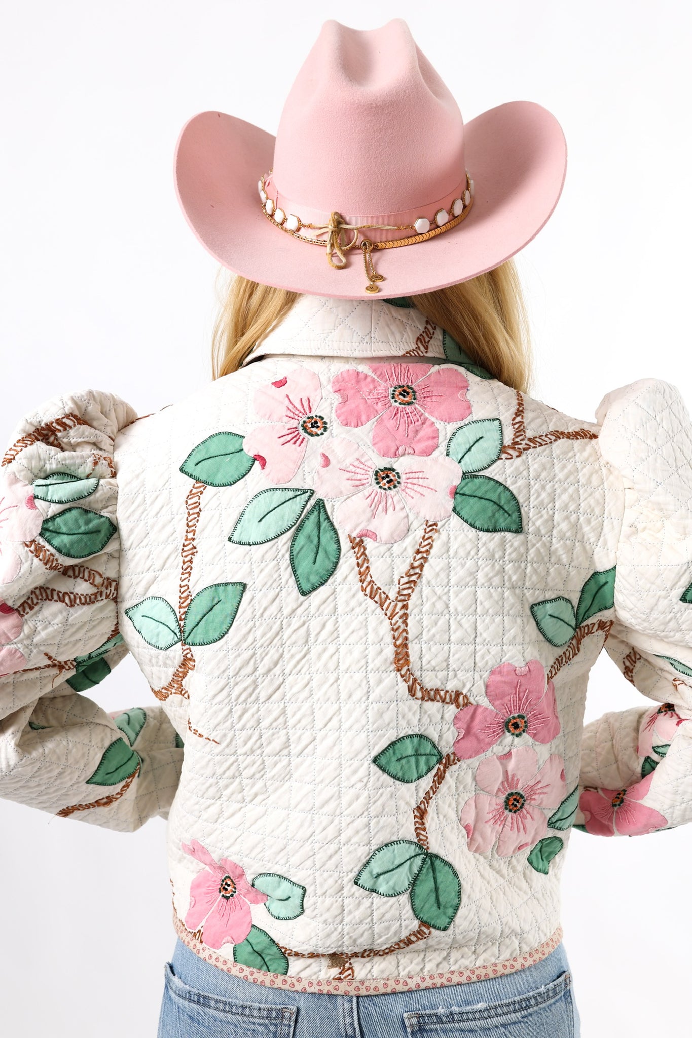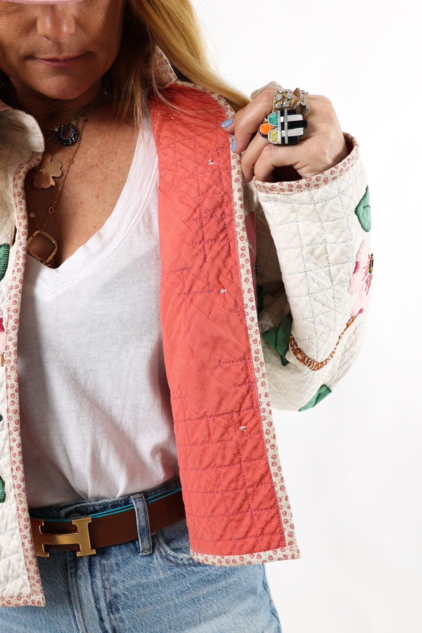 This is an American antique appliqué quilt made circa 1930s to 1960s. It is a beautiful and rare Dogwood quilt. This quilt was made by a master. It is meticulously hand quilted, beautifully hand appliqued, masterfully hand embroidered! The maker backed this quilt with a quality coordinating pink fabric. You will want to cuff the sleeves to show this off! For closures, we added antique pink glass button. In our opinion, the jacket is very thin, made with very soft luxe cotton, and is very comfortable to wear. Please note: there are a few minor age spots and zig zag mends. This is our Queen Bee jacket but without the fitted waist band. Please read measurements below for best fit! If you have any fit questions or would like to see more images or videos of this please direct message us and we would be happy to oblige.