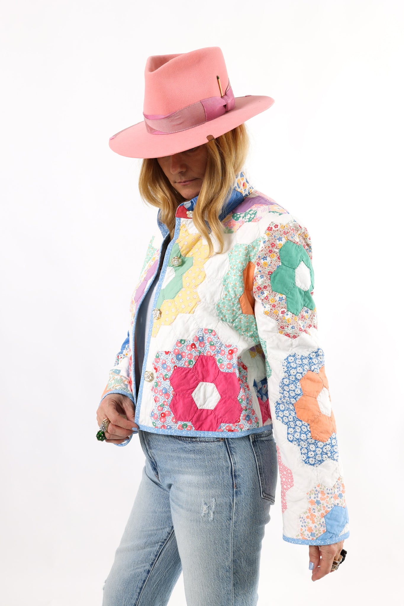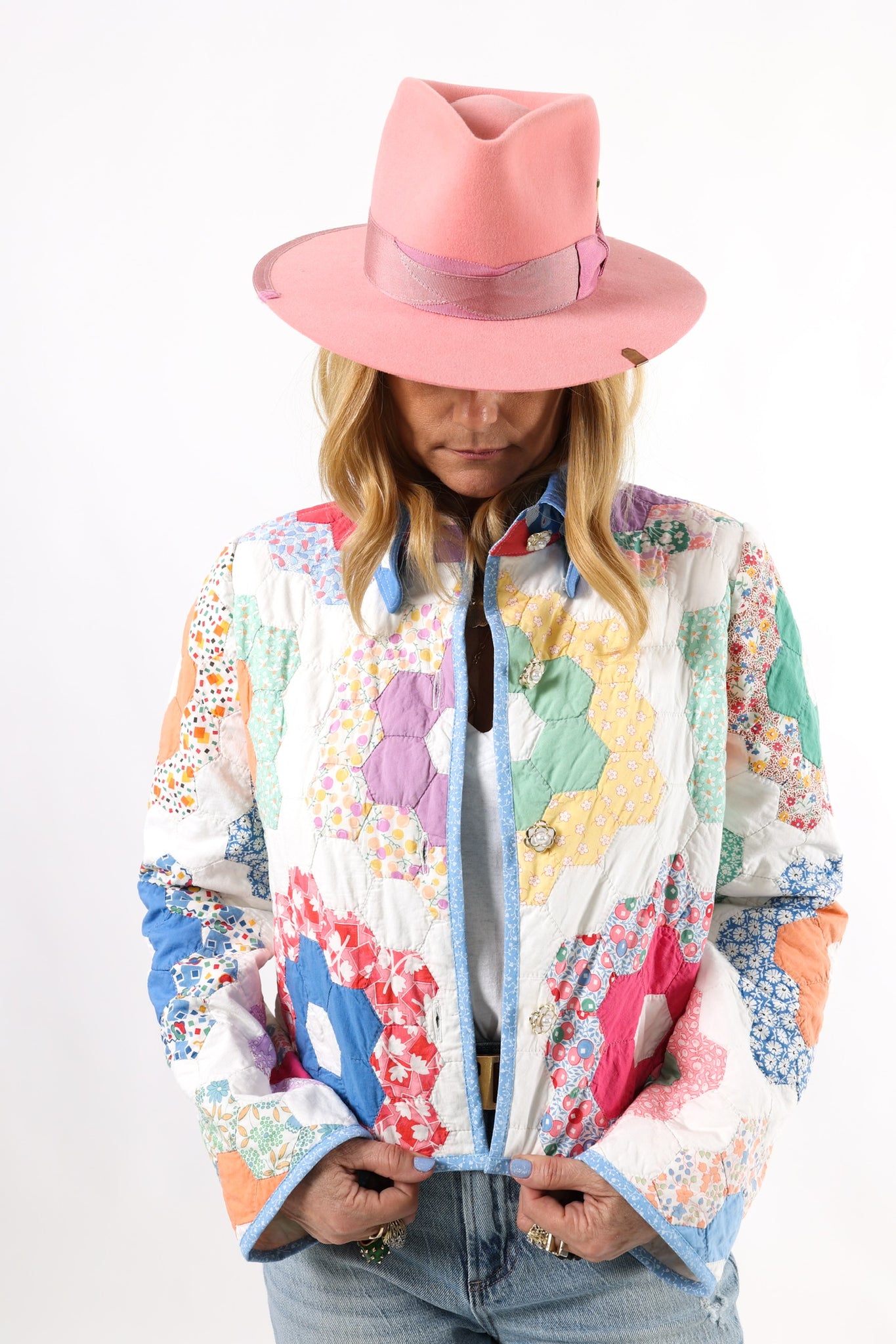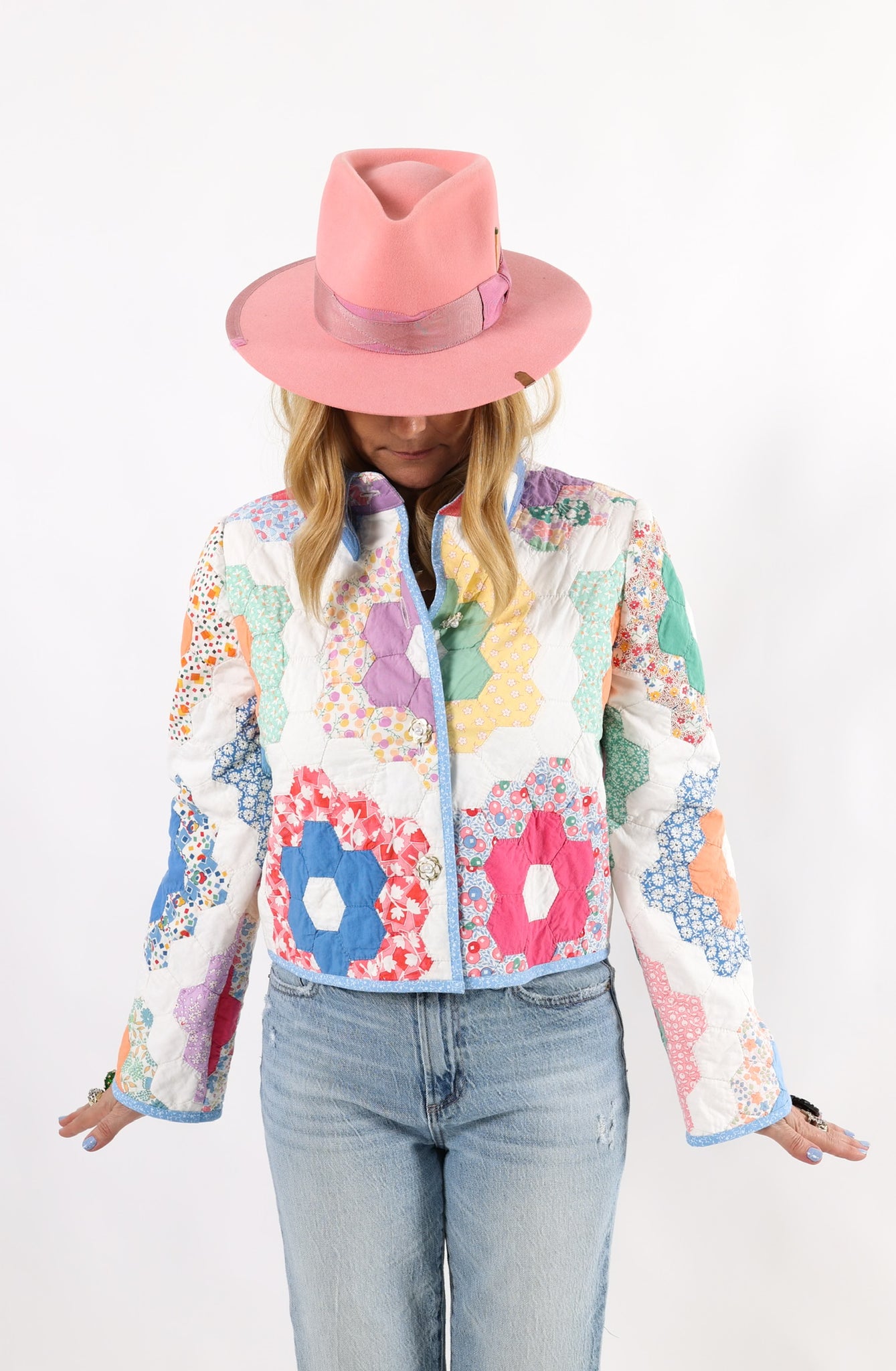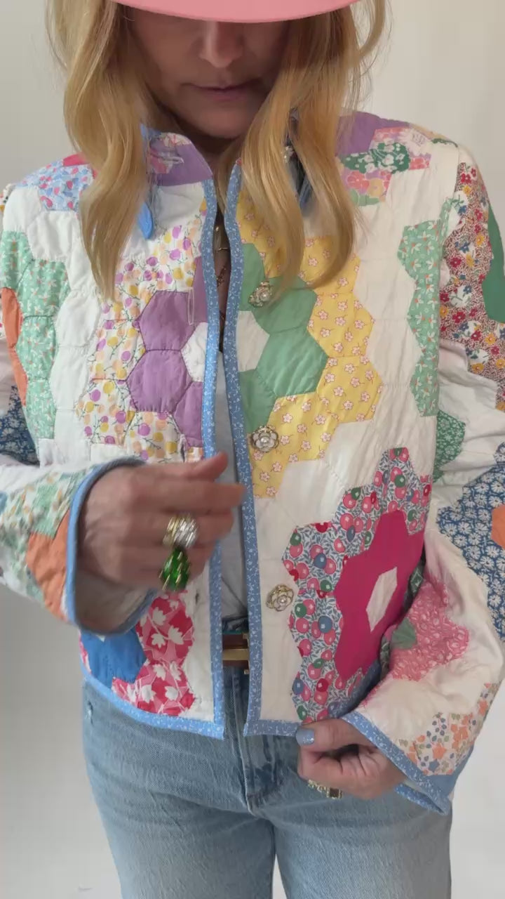 Please note that all of our jackets are made from antique quilts and the fabric reflects this. Our fabrics are sometimes older than 100 years old and are perfectly worn. We believe this is what makes them special and is part of their charm. All of our garments are pre-washed in a special restoration quilt wash. We recommend only spot cleaning if necessary.