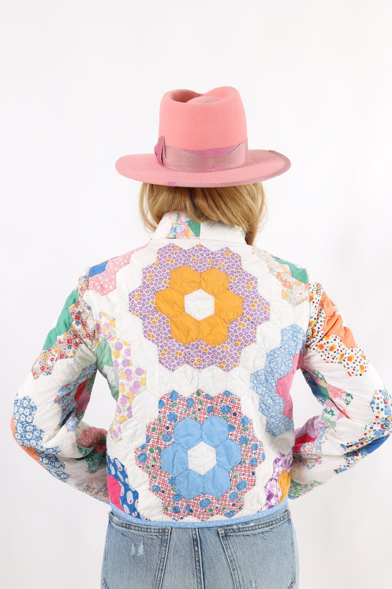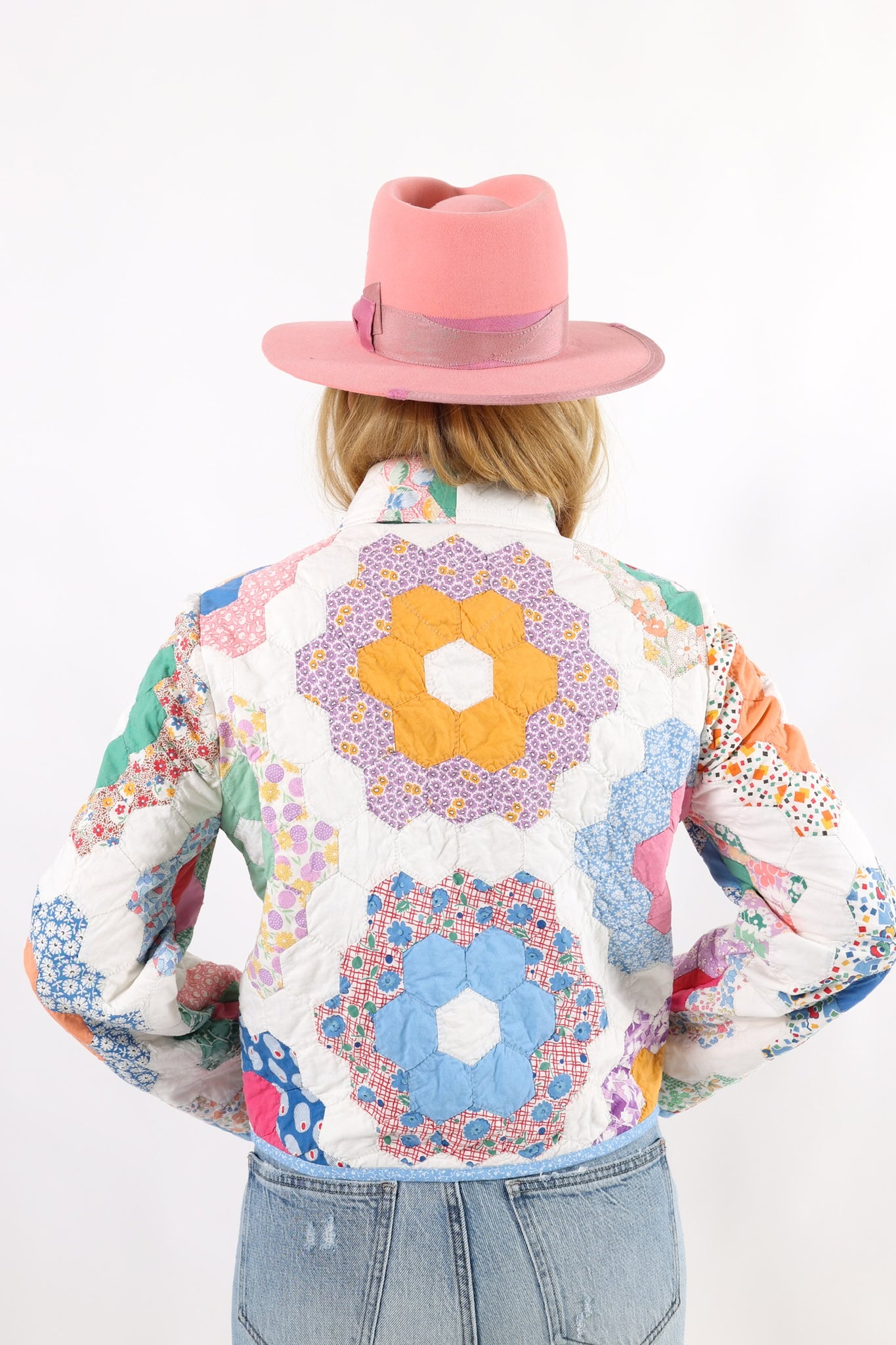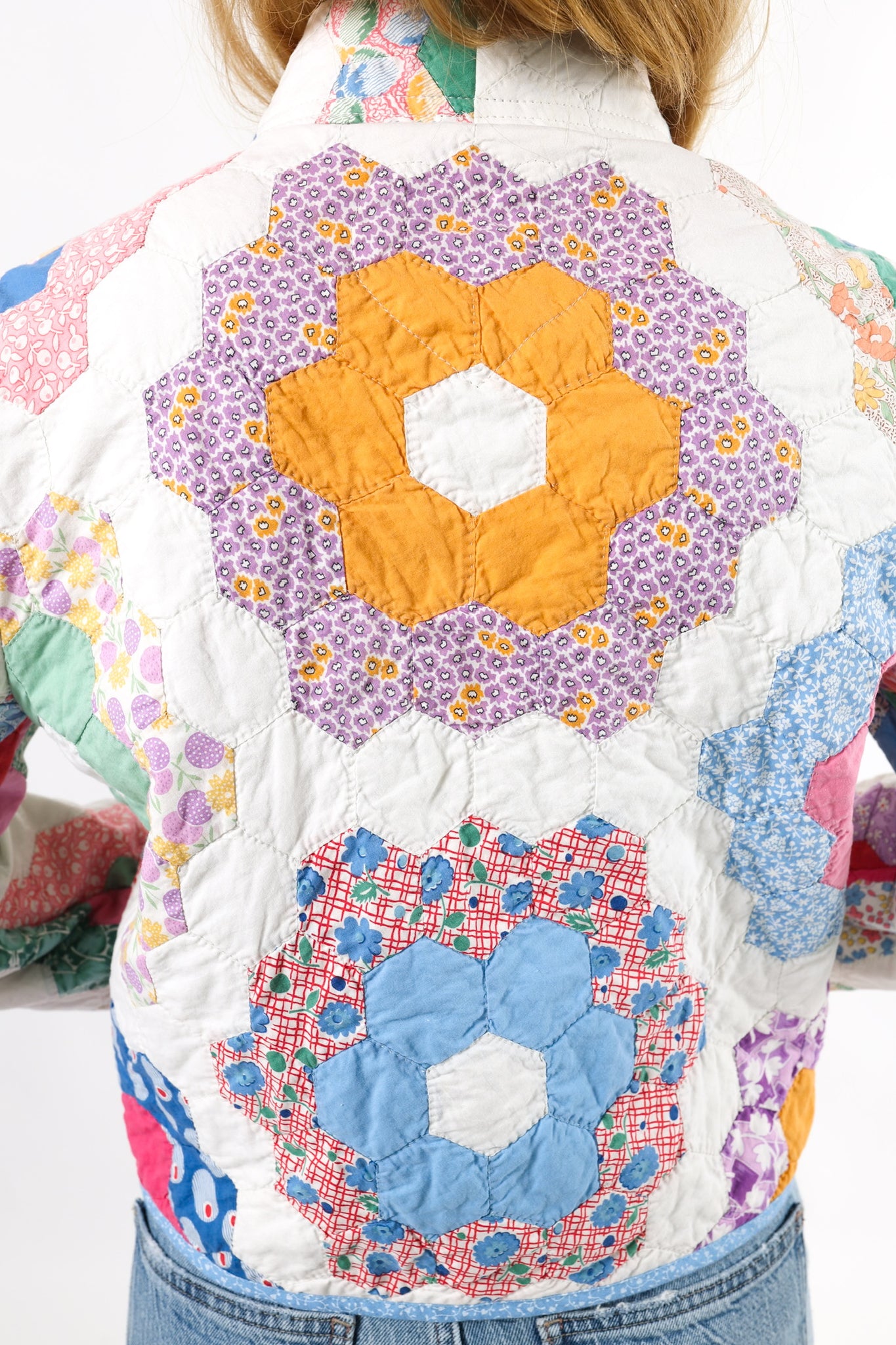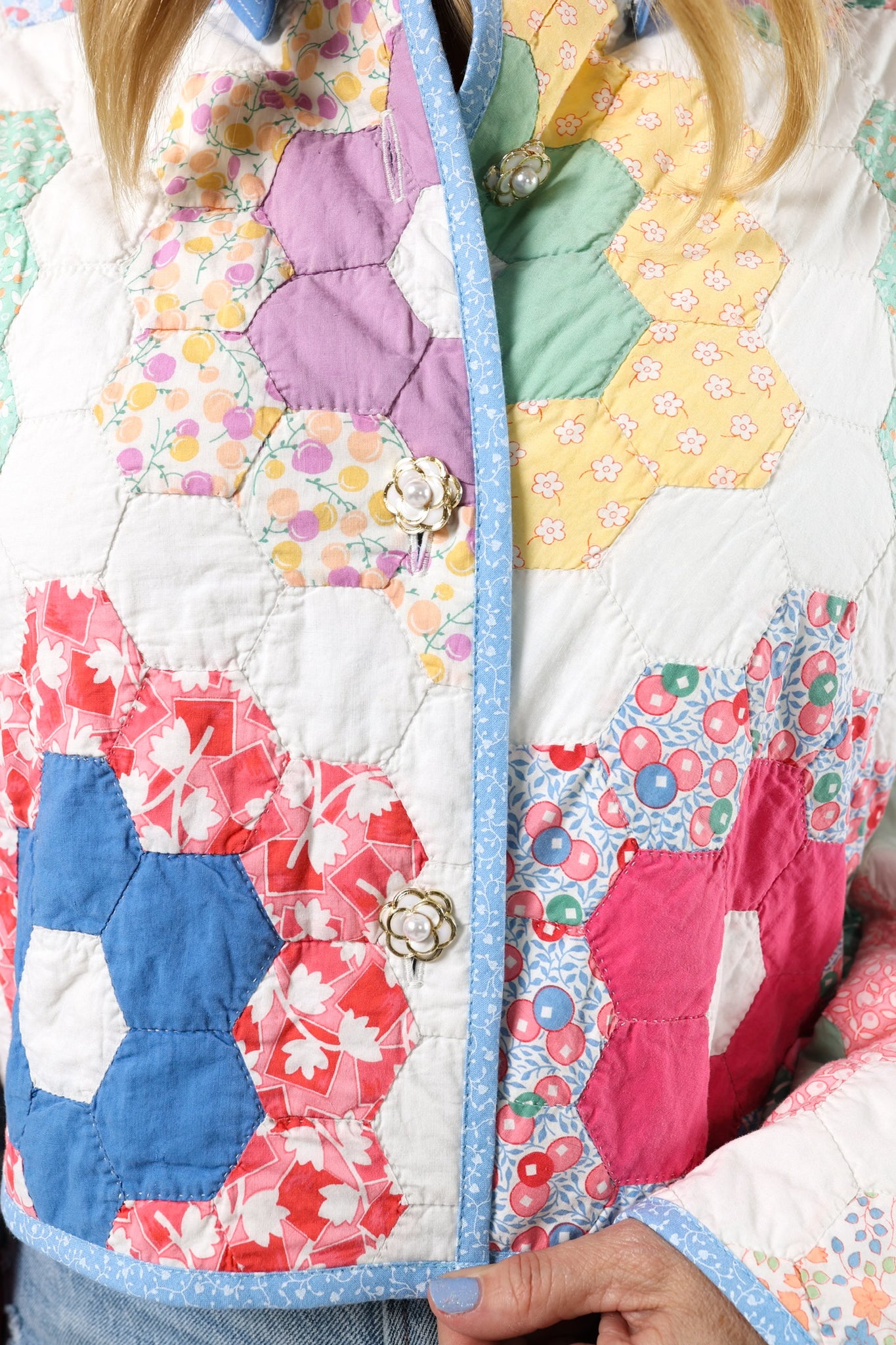This is an antique American quilt made circa 1930s to 1940s. It is a traditional Grandmother's Garden quilt pattern. The quilt has been hand sewn and hand quilted, which is a labor of love and a lost art. The quilt is in excellent condition for it's age! If you are looking to make a statement, you can pair this with the matching Class Act Maxi Skirt for a full quilt ensemble. In our opinion, the jacket is thin, lightweight, and very soft. We used white and gold enamel floral buttons as closures. The maker backed this quilt with a white cotton fabric. This is a size S. Please see size guide and length measurements below. If you have any questions on size or fit please direct message us and we would be happy to help.