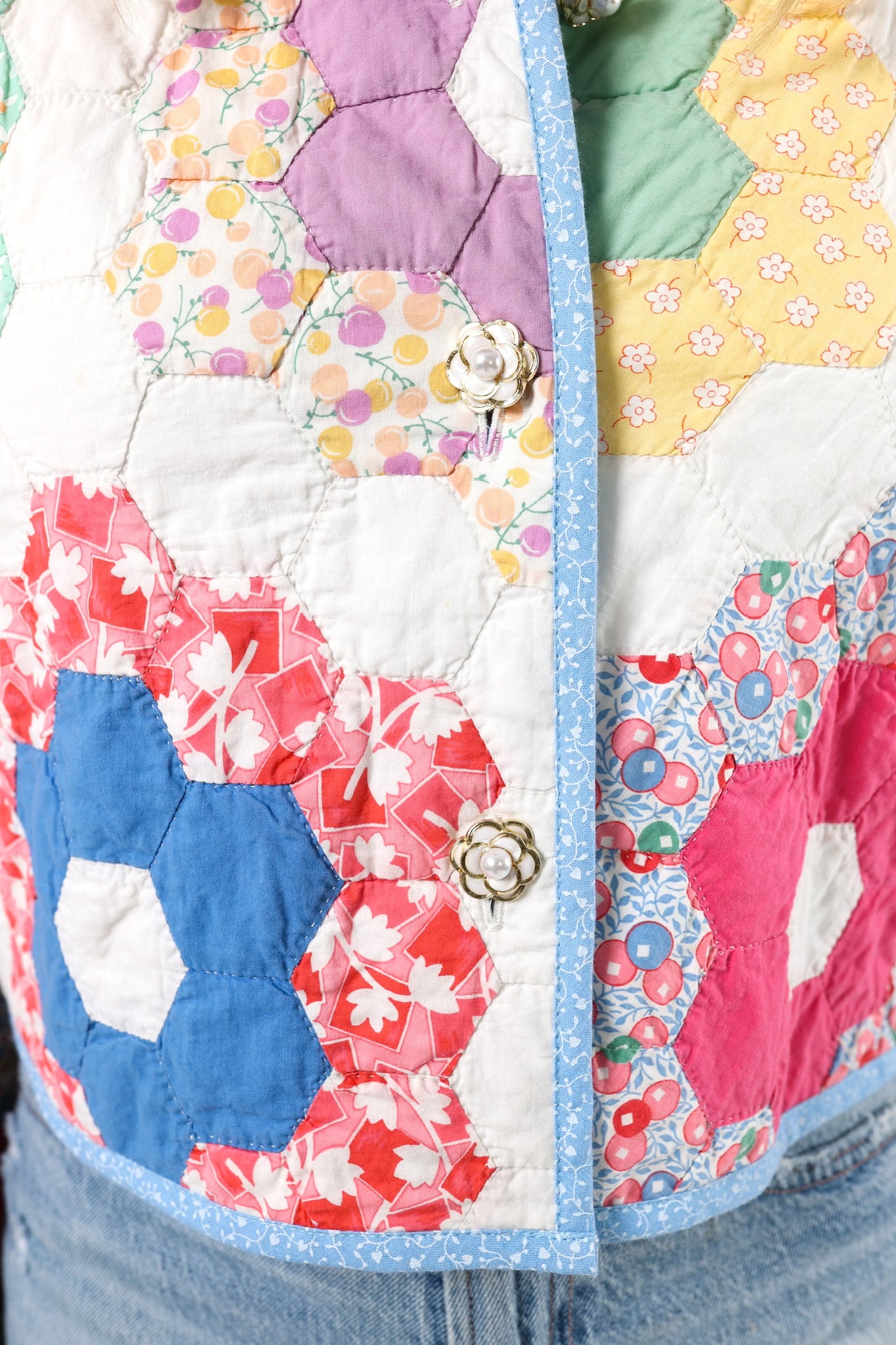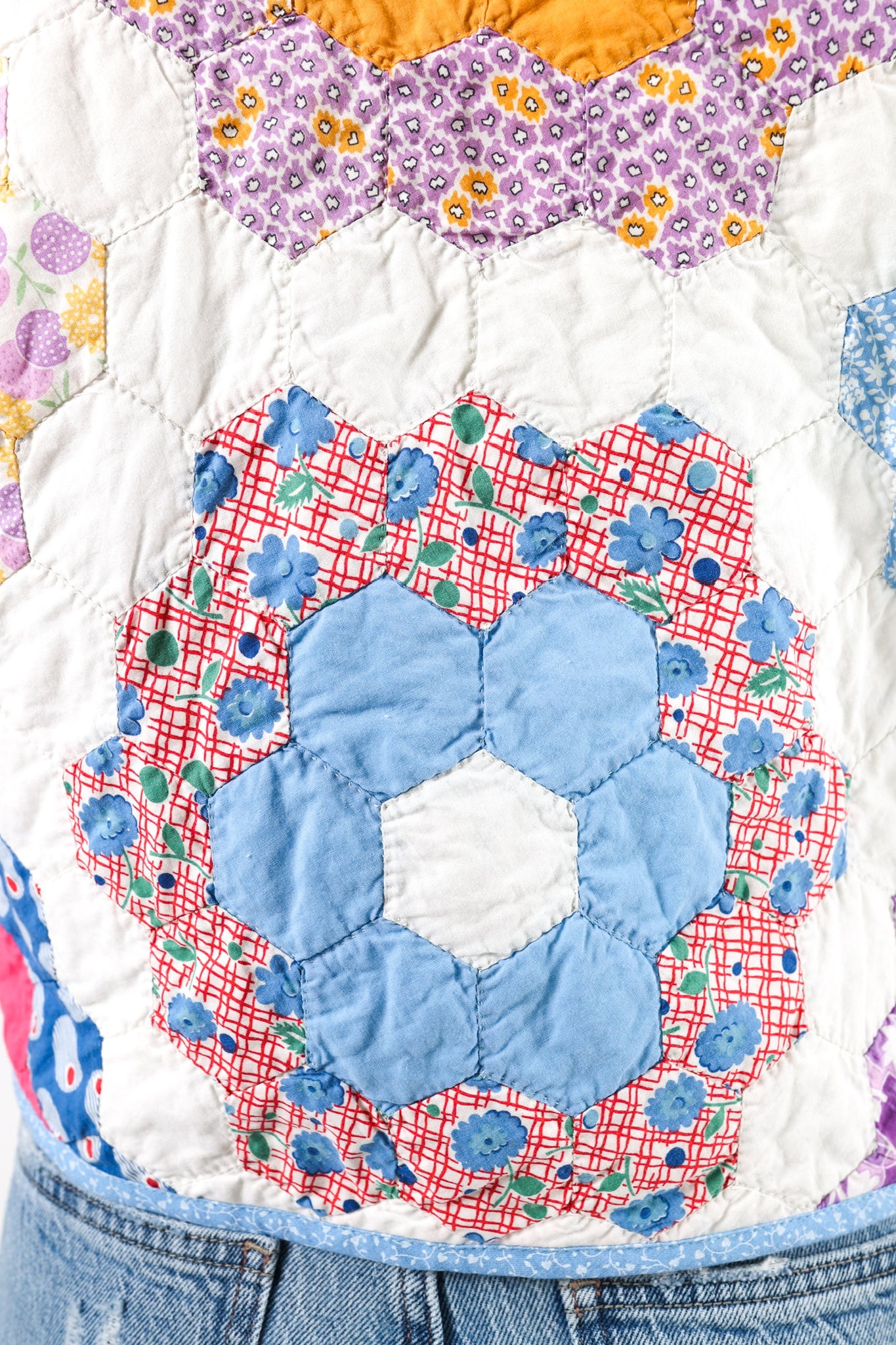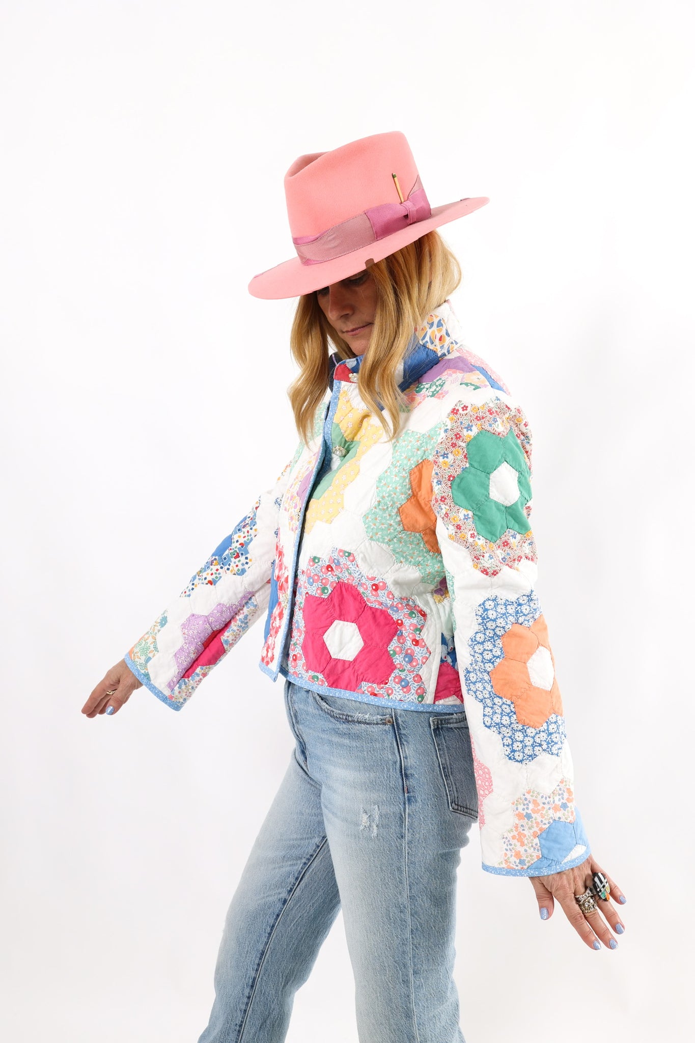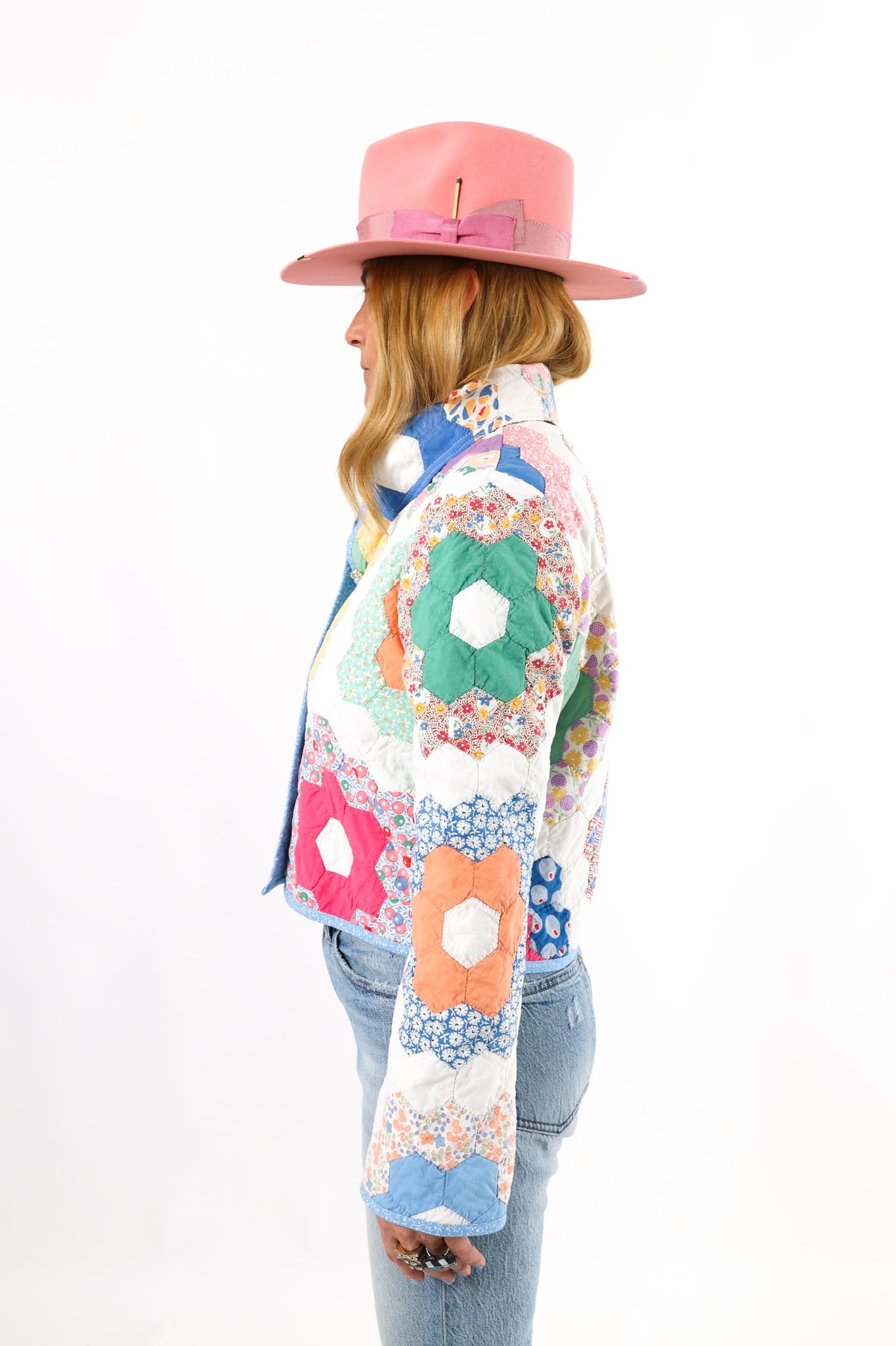 This is an antique American quilt made circa 1930s to 1940s. It is a traditional Grandmother's Garden quilt pattern. The quilt has been hand sewn and hand quilted, which is a labor of love and a lost art. The quilt is in excellent condition for it's age! If you are looking to make a statement, you can pair this with the matching Class Act Maxi Skirt for a full quilt ensemble. In our opinion, the jacket is thin, lightweight, and very soft. We used white and gold enamel floral buttons as closures. The maker backed this quilt with a white cotton fabric. This is a size S. Please see size guide and length measurements below. If you have any questions on size or fit please direct message us and we would be happy to help.