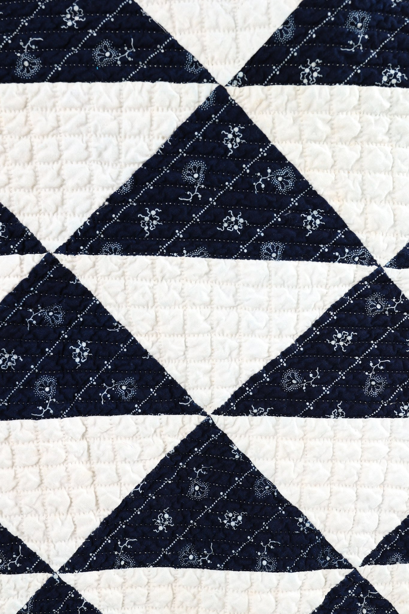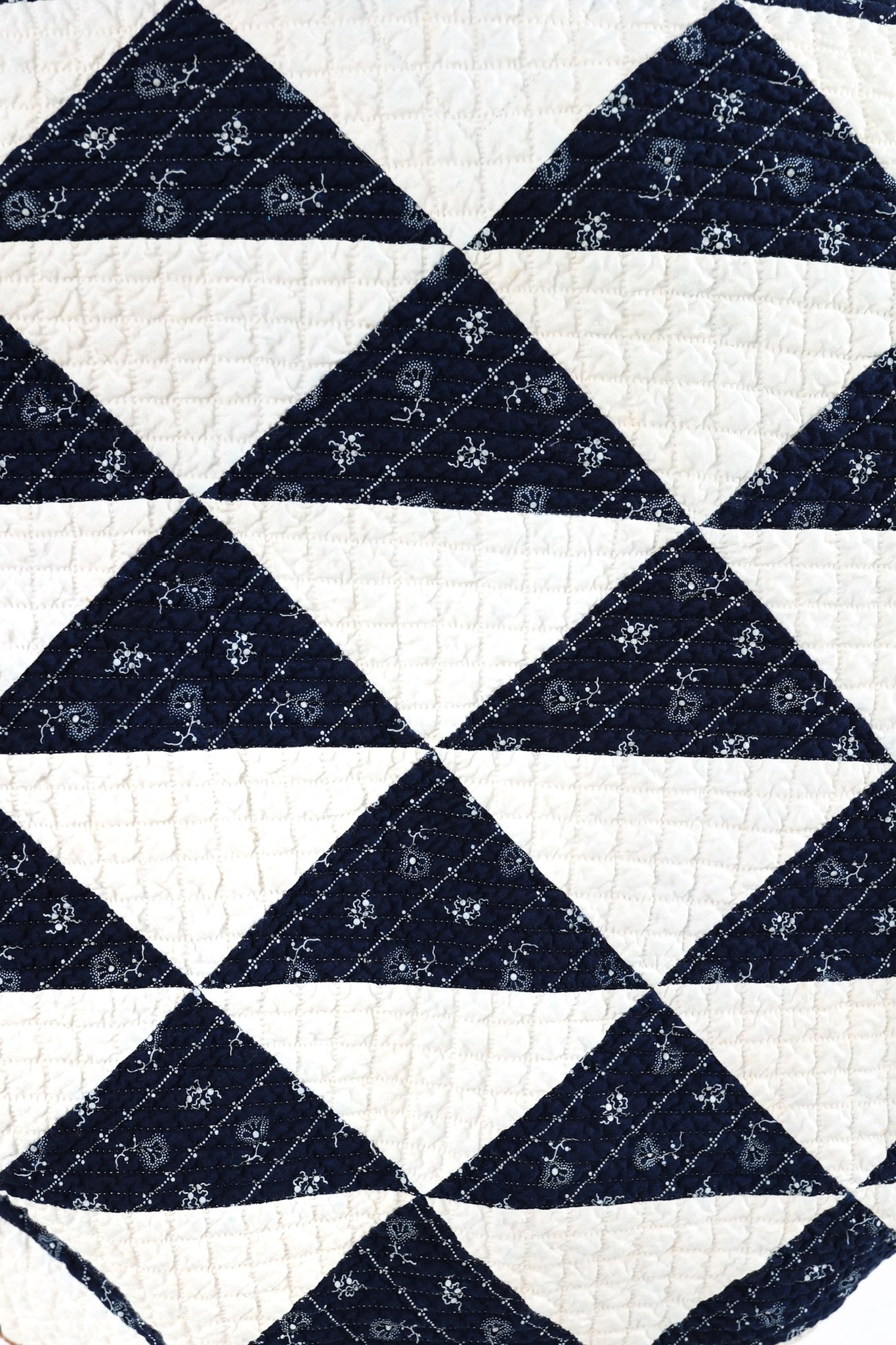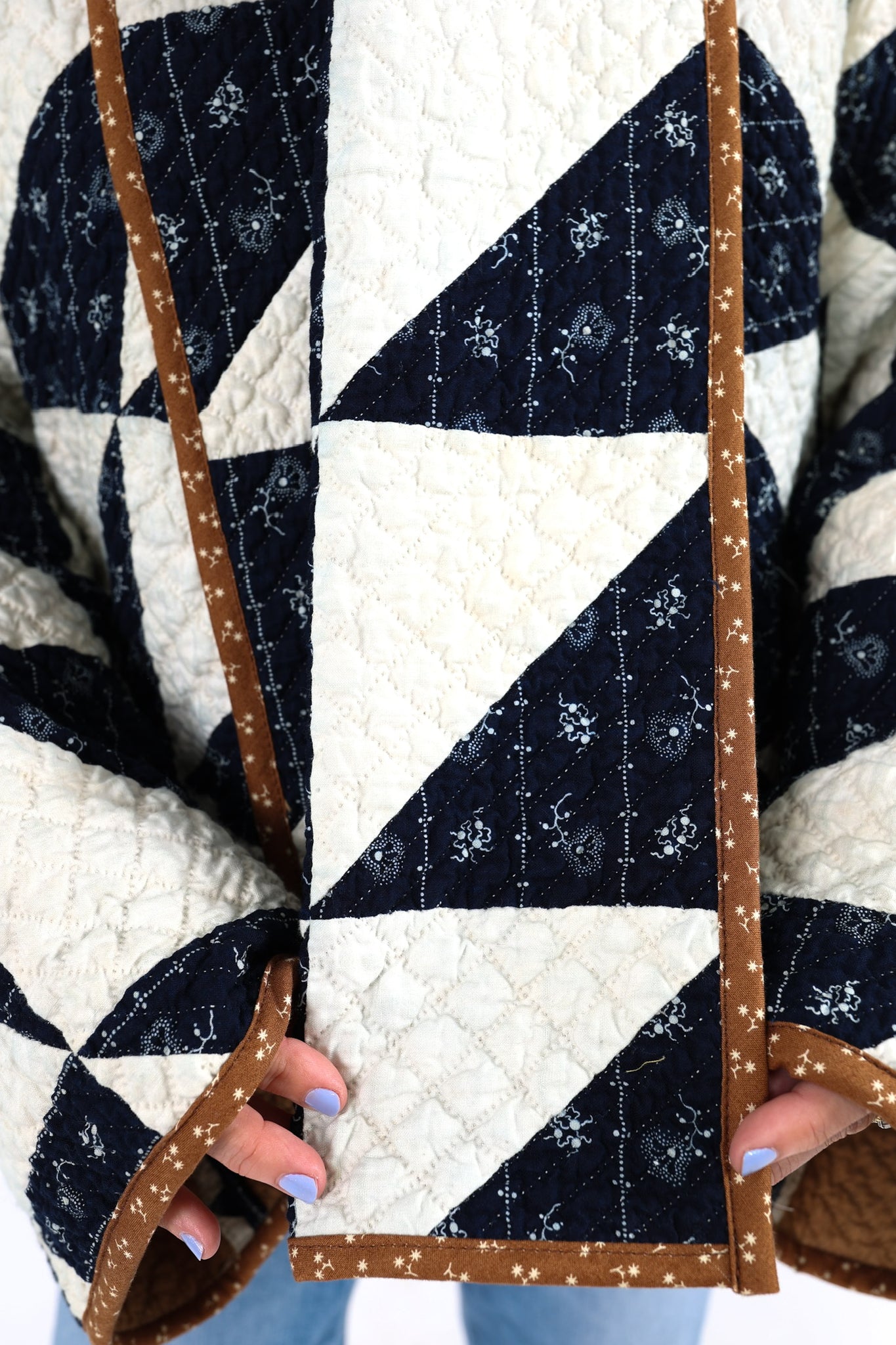 This is an antique American quilt made circa 1880s to 1910. It is a traditional Tens of Armageddon quilt pattern. This quilt was made by an absolute master. The quilting is extremely dense and nothing short of museum quality. It is a Lady Lancaster 10/10. We are the first one to wash this piece. It is overflowing with rare and value antique indigo fabric. We love the Carmel contrasting backing fabric on the inside of the jacket making it completely reversible with endless styling options. We found one subtle age mark on the inside of the jacket and we have photographed for your convenience. In our opinion, the jacket is thin and soft, however, due to the dense amount of hand quilting it does have a little weight and stiffness to it. The quilt is in excellent condition for its age. This is an incredible piece of textile history. If you have further questions, please direct message us and we are happy to send you a video.