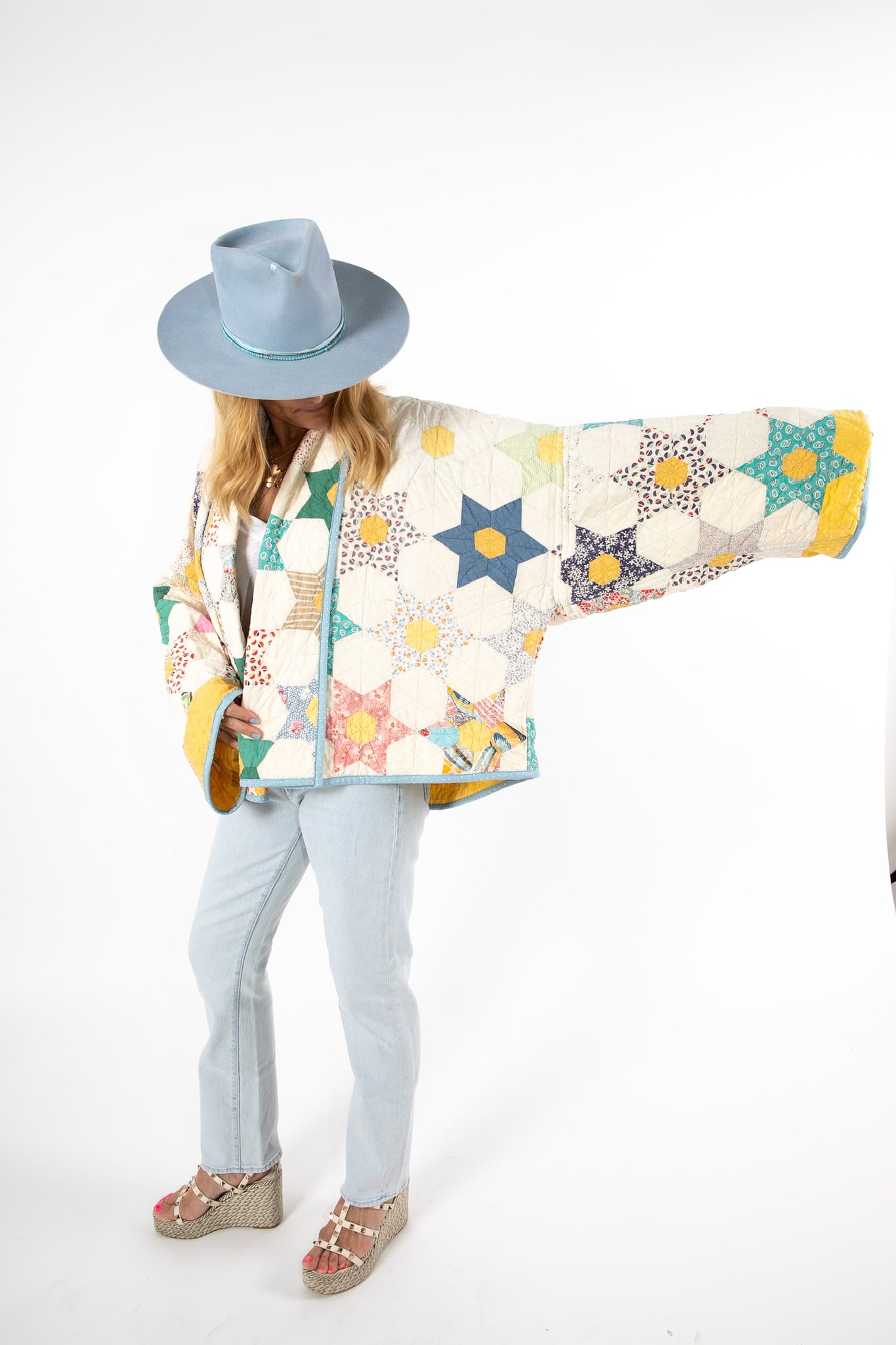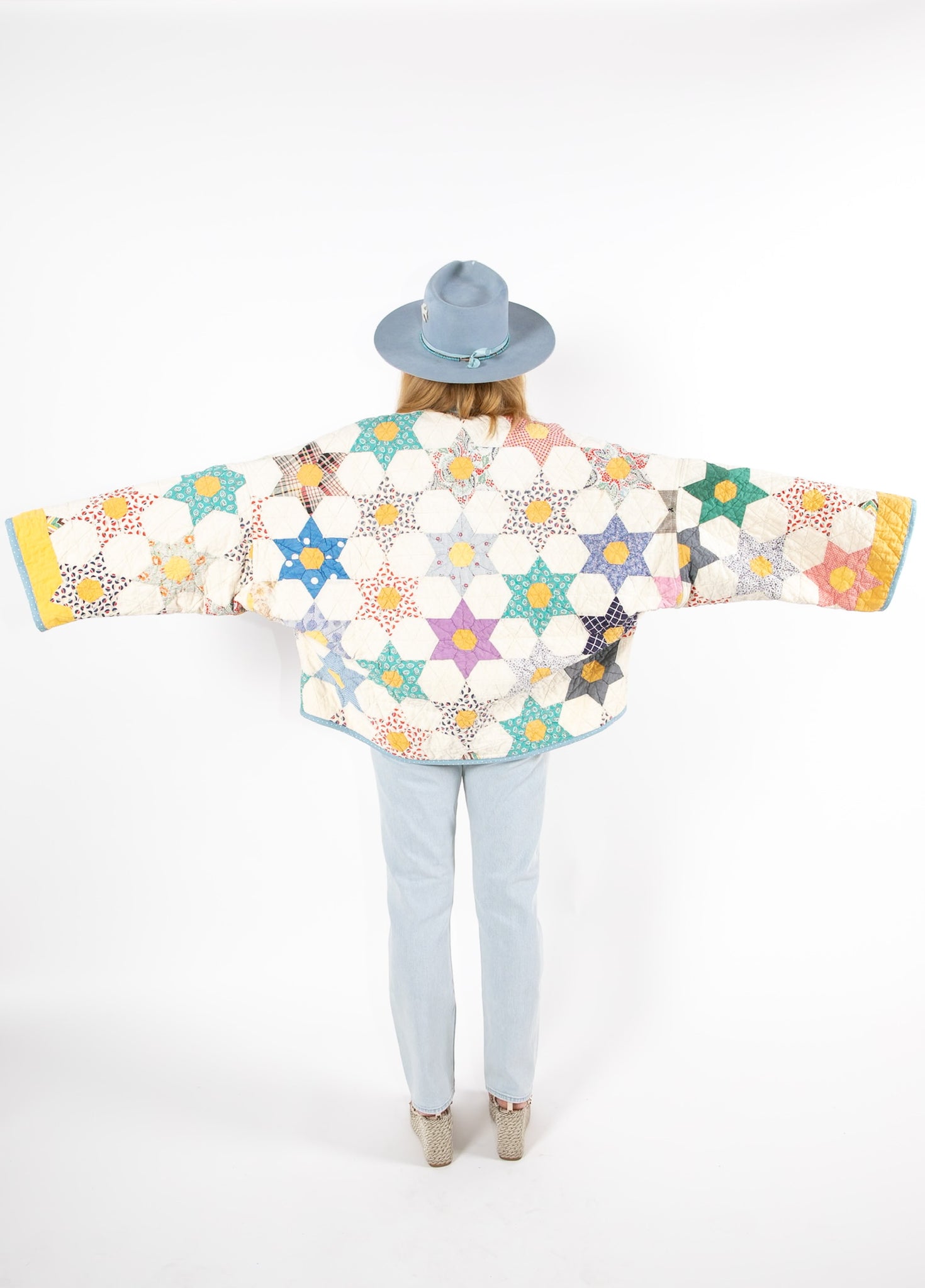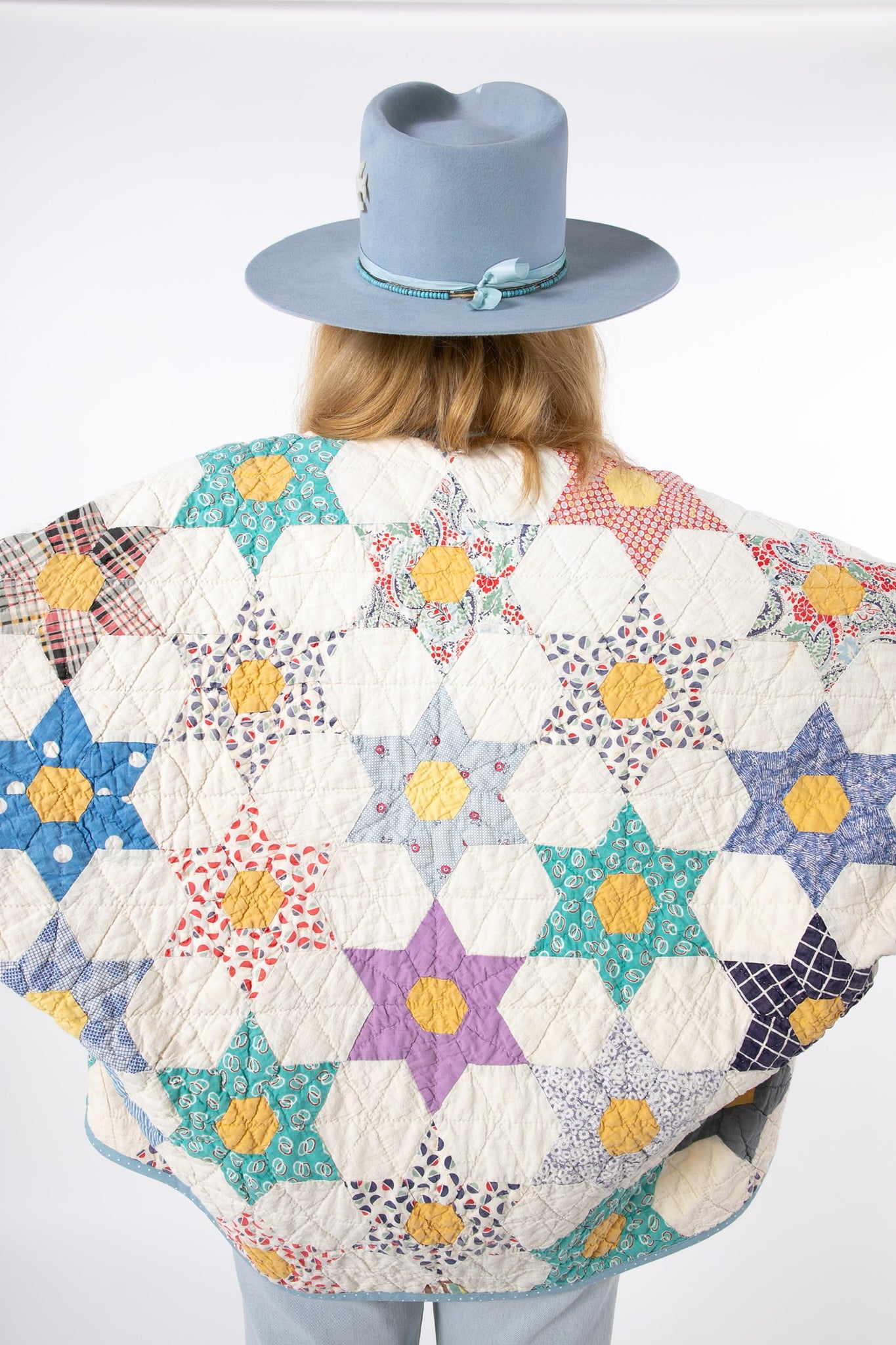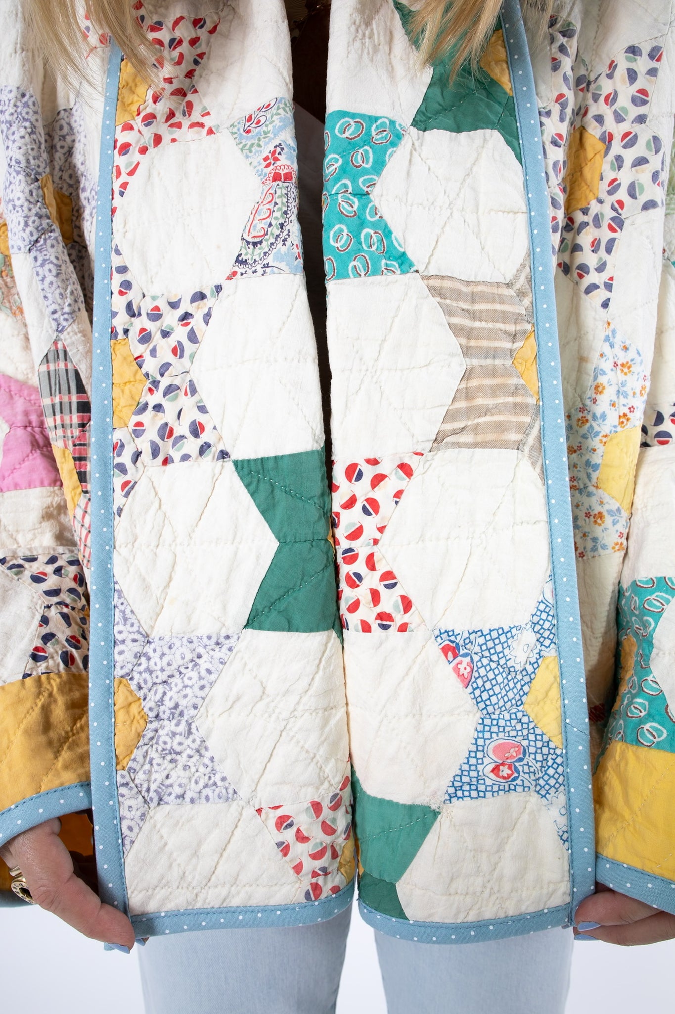 This is an antique American quilt made circa 1930s to 1940s. The quilt pattern has been called many names throughout the years. Our favorites are Texas Star, Friendship Hexagon, Dolly Madison's Star, and Star garden. The quilt has been beautifully hand quilted and hand sewn, which is a labor of love and a lost art. We love the contrasting yellow fabric on the inside of the jacket, this makes the jacket completely reversible. This piece looks fabulous worn inside out and upside down, please see photos. In our opinion, the jacket is thin, lightweight, super soft, a dream to wear, and has a great drape. There is very little to no loft (puffiness)making this jacket extremely comfortable and lightweight. This piece looks good with everything in your closet. The quilt is in great condition for its age. If you have further questions, please direct message us and we are happy to send you a video.