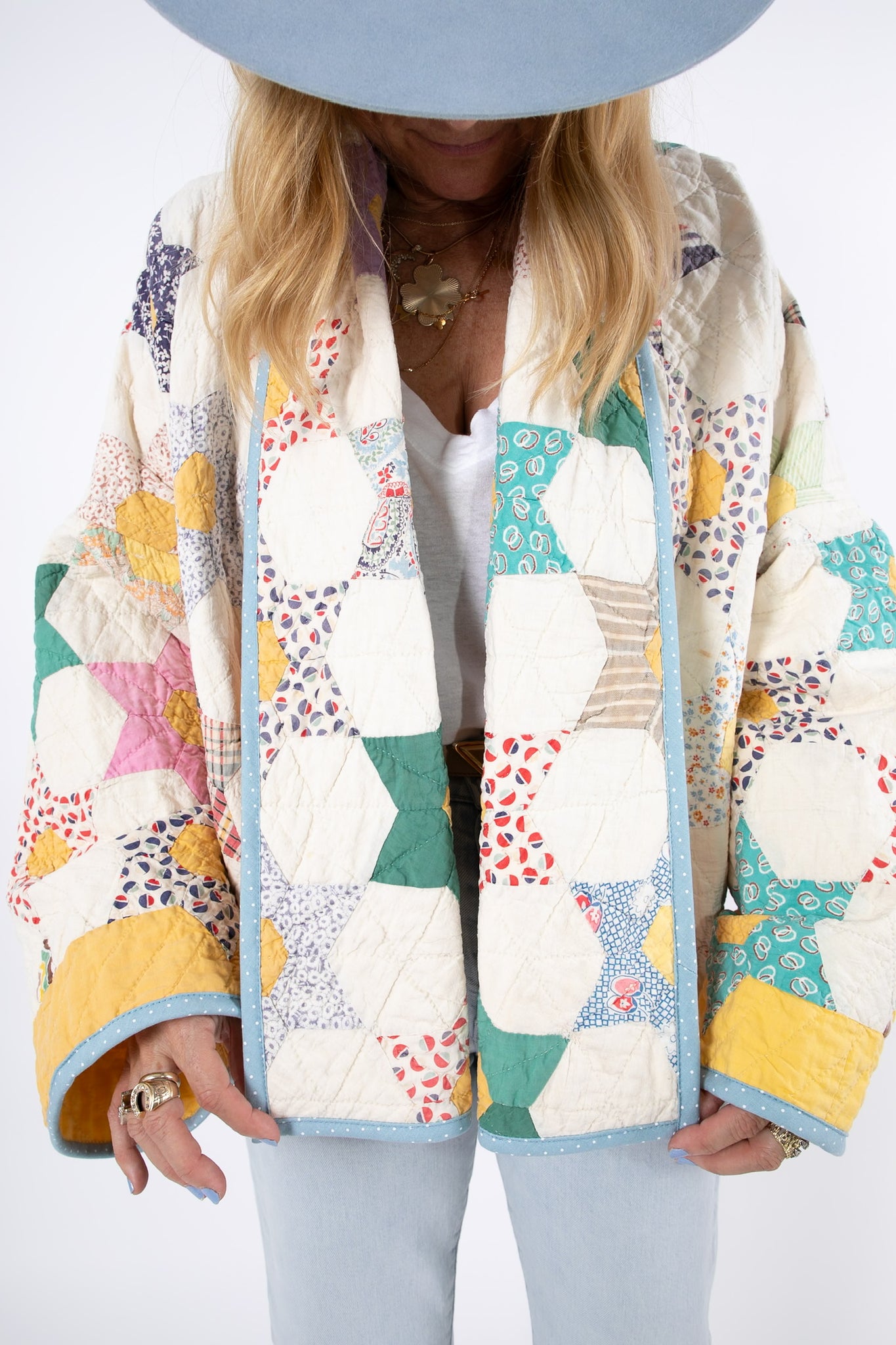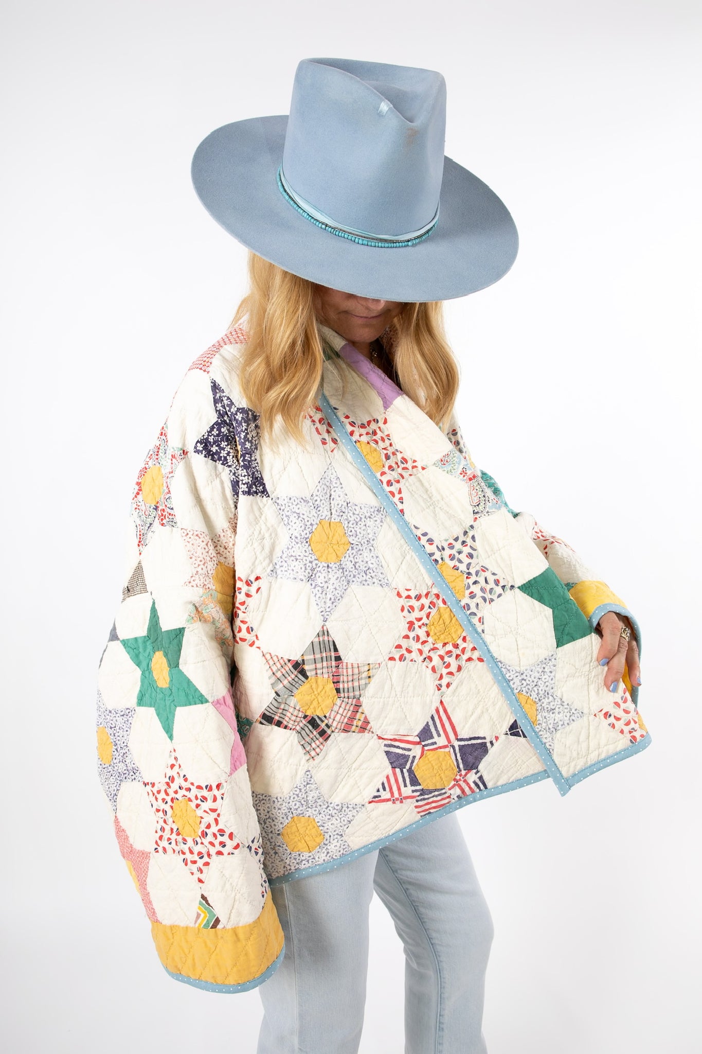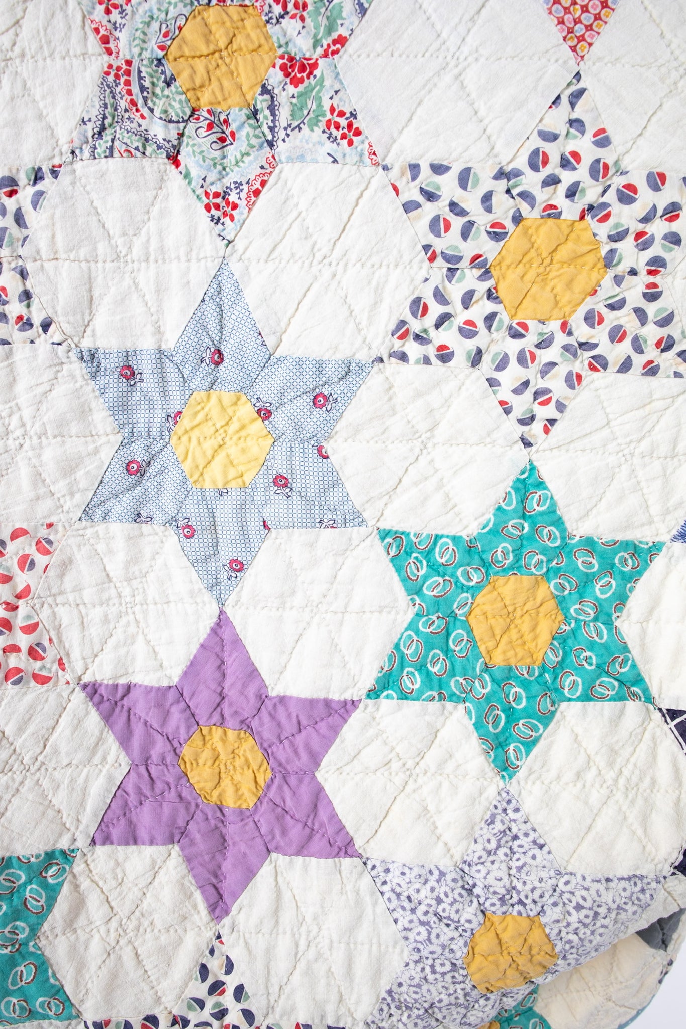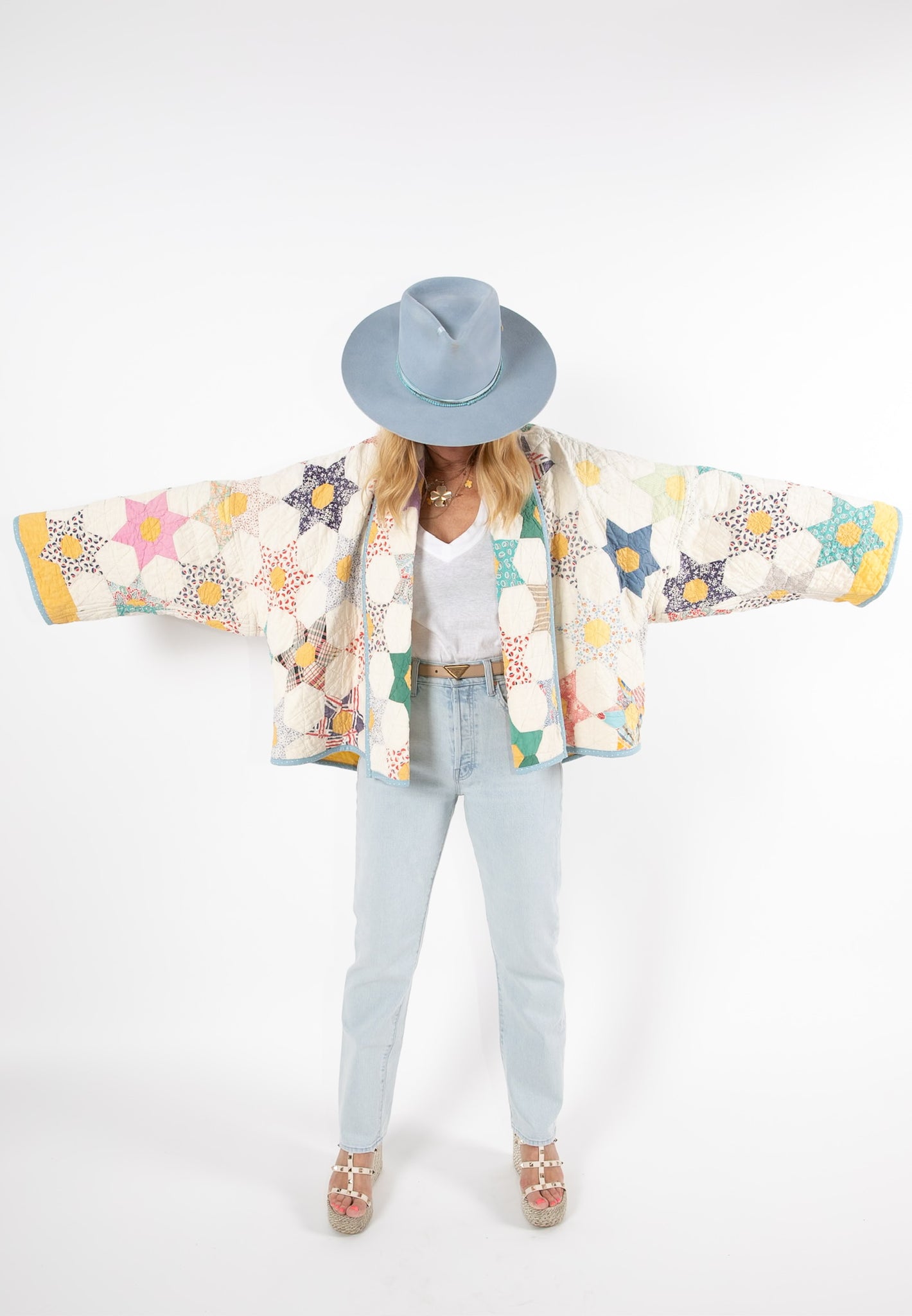 This is an antique American quilt made circa 1930s to 1940s. The quilt pattern has been called many names throughout the years. Our favorites are Texas Star, Friendship Hexagon, Dolly Madison's Star, and Star garden. The quilt has been beautifully hand quilted and hand sewn, which is a labor of love and a lost art. We love the contrasting yellow fabric on the inside of the jacket, this makes the jacket completely reversible. This piece looks fabulous worn inside out and upside down, please see photos. In our opinion, the jacket is thin, lightweight, super soft, a dream to wear, and has a great drape. There is very little to no loft (puffiness)making this jacket extremely comfortable and lightweight. This piece looks good with everything in your closet. The quilt is in great condition for its age. If you have further questions, please direct message us and we are happy to send you a video.