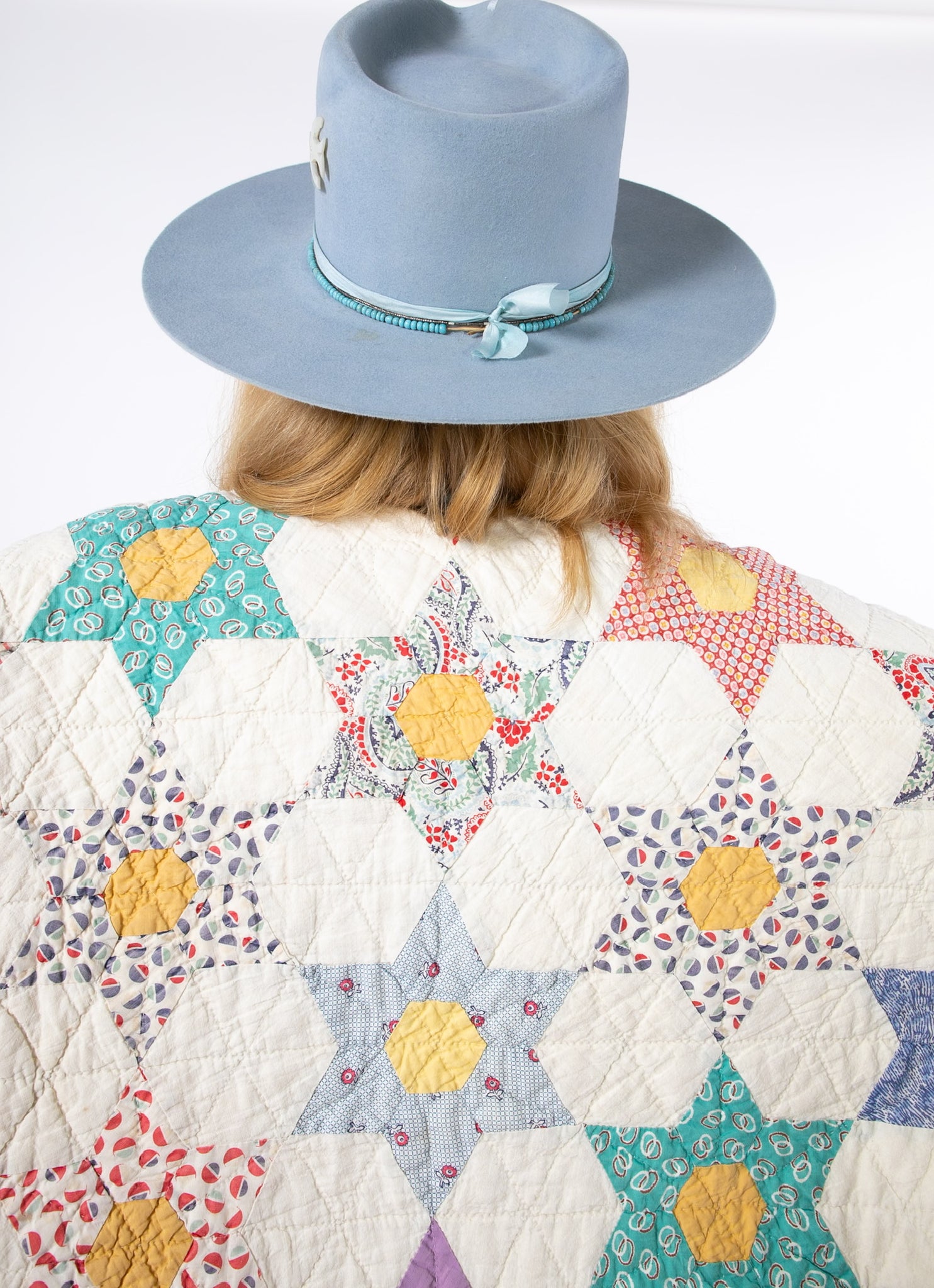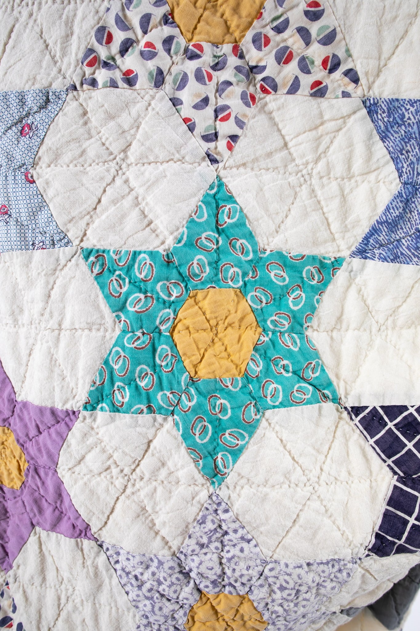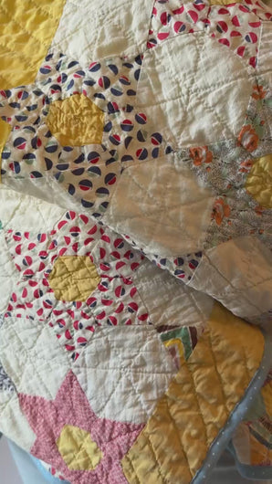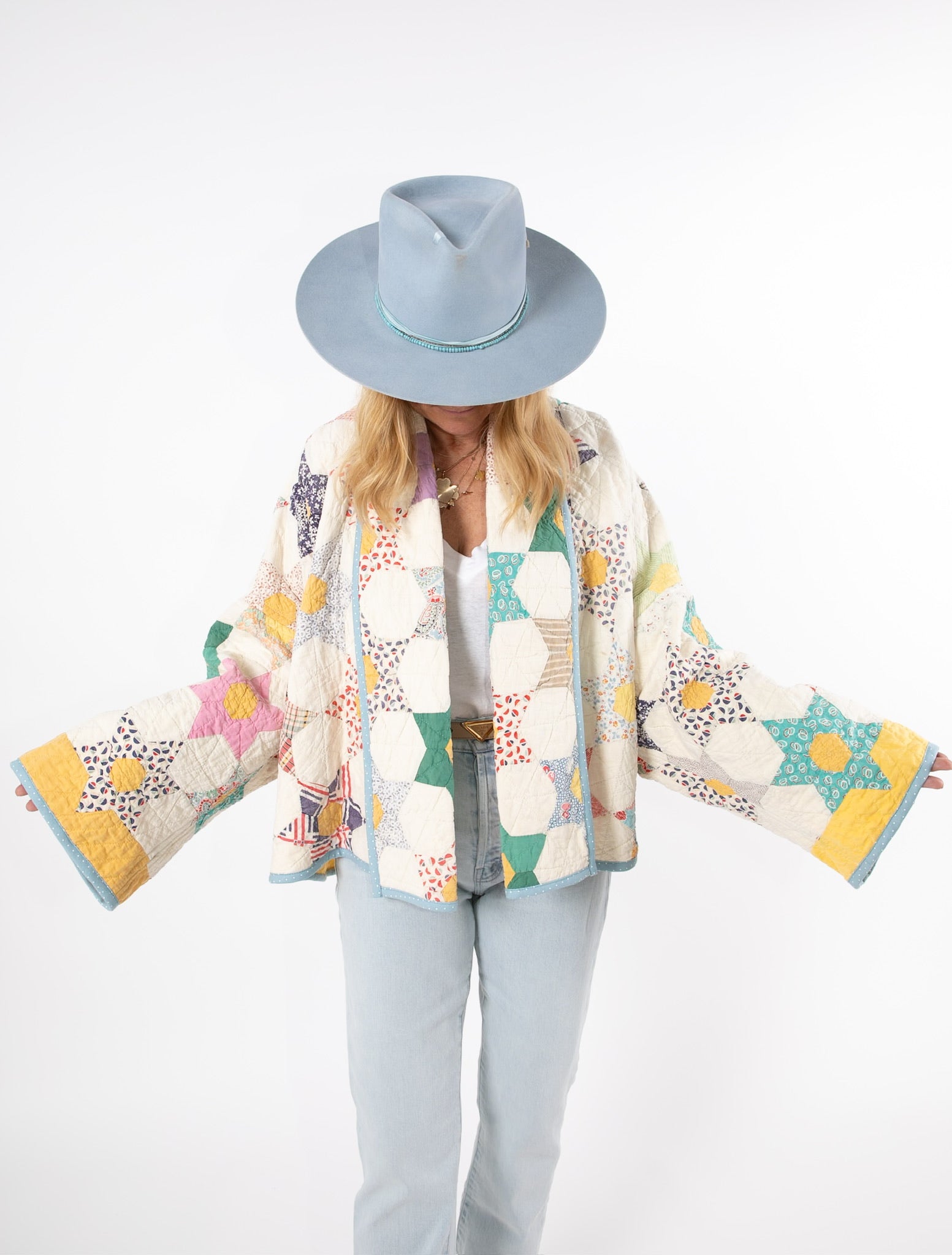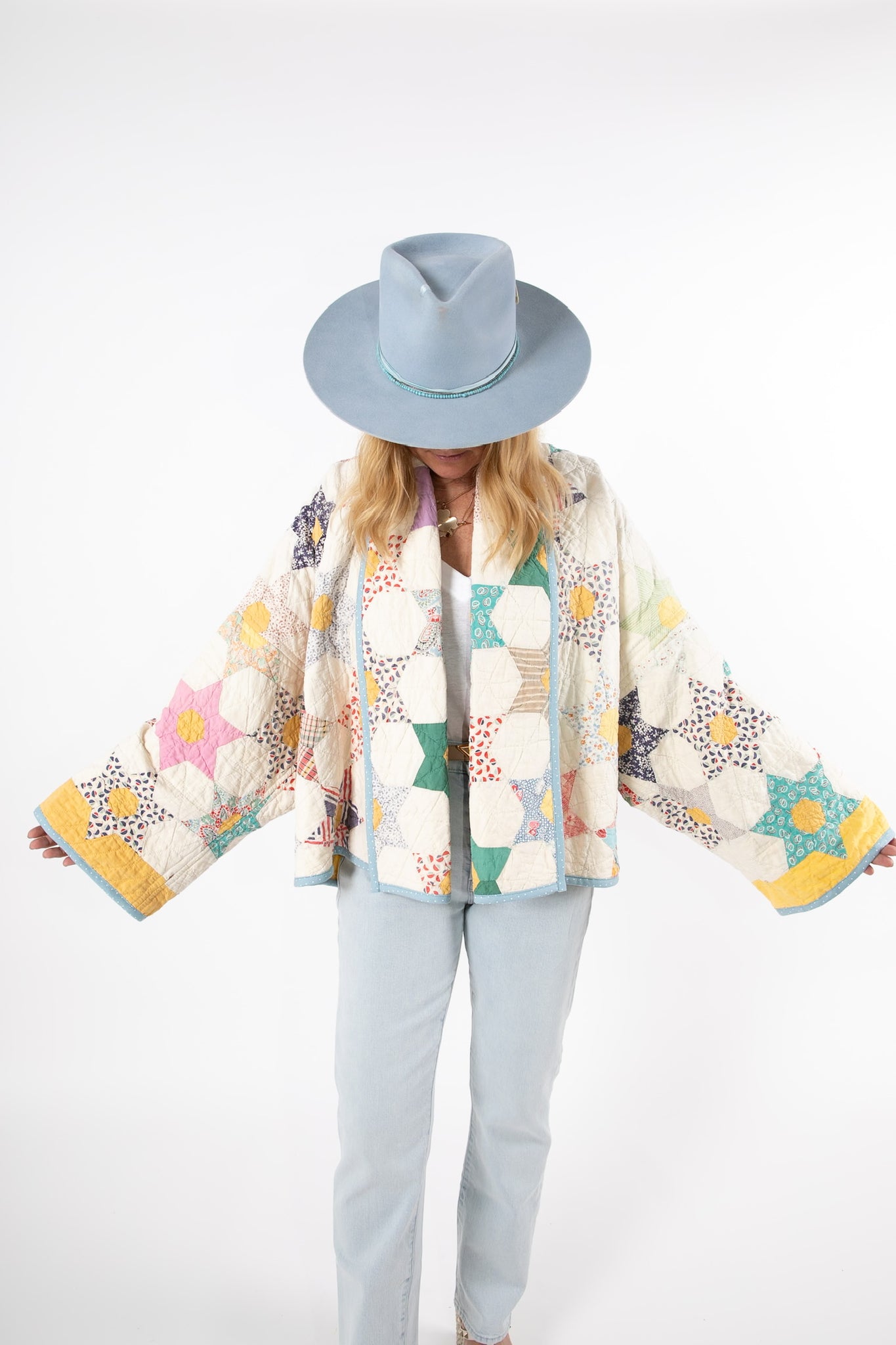 This is an antique American quilt made circa 1930s to 1940s. The quilt pattern has been called many names throughout the years. Our favorites are Texas Star, Friendship Hexagon, Dolly Madison's Star, and Star garden. The quilt has been beautifully hand quilted and hand sewn, which is a labor of love and a lost art. We love the contrasting yellow fabric on the inside of the jacket, this makes the jacket completely reversible. This piece looks fabulous worn inside out and upside down, please see photos. In our opinion, the jacket is thin, lightweight, super soft, a dream to wear, and has a great drape. There is very little to no loft (puffiness)making this jacket extremely comfortable and lightweight. This piece looks good with everything in your closet. The quilt is in great condition for its age. If you have further questions, please direct message us and we are happy to send you a video.
