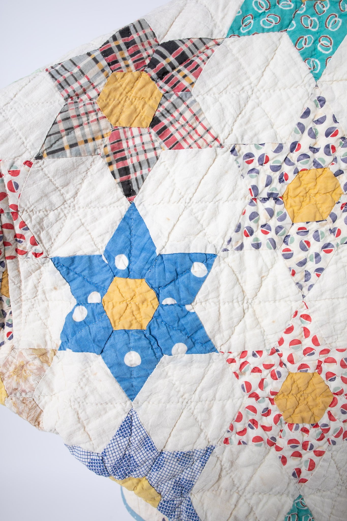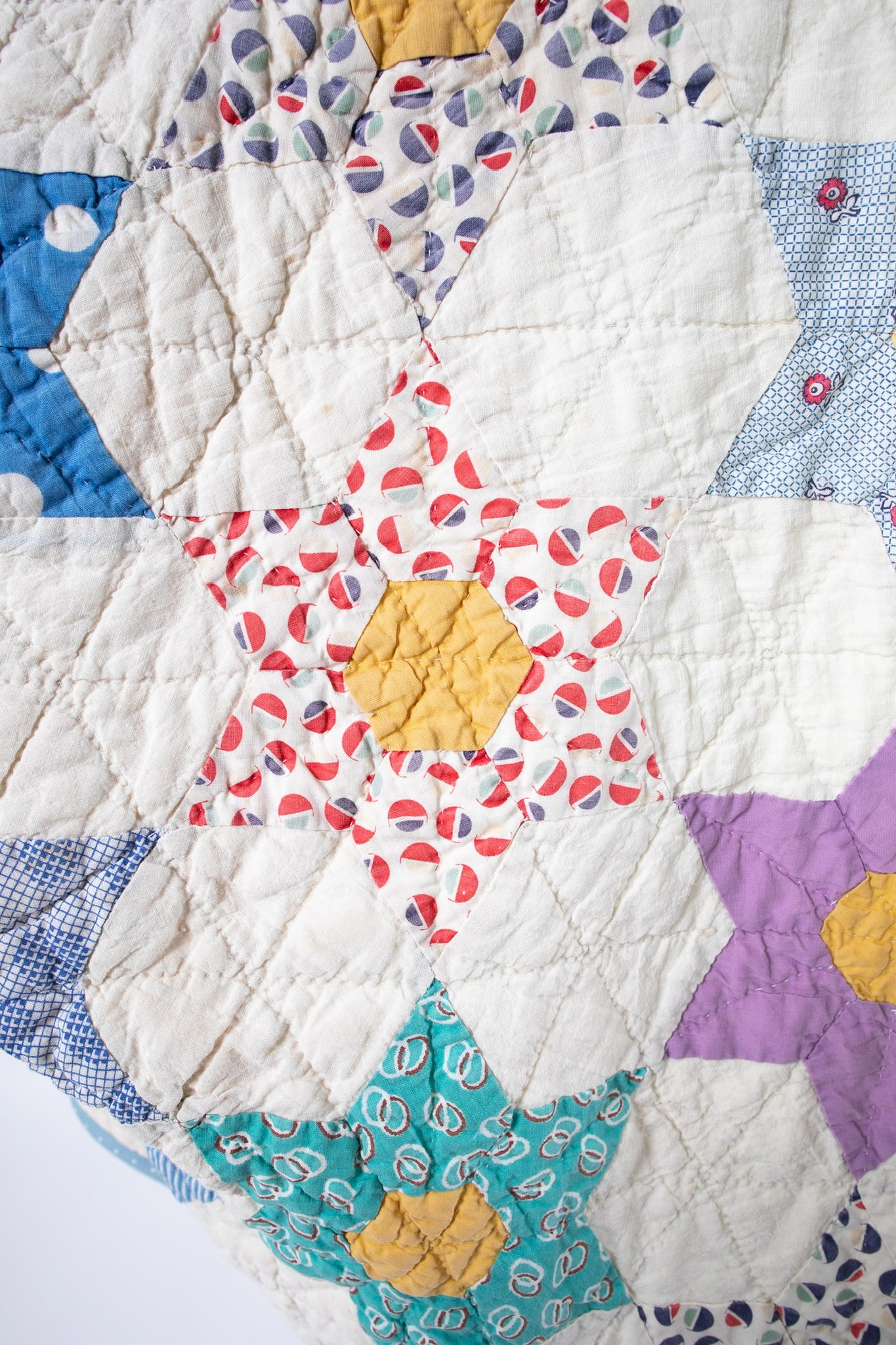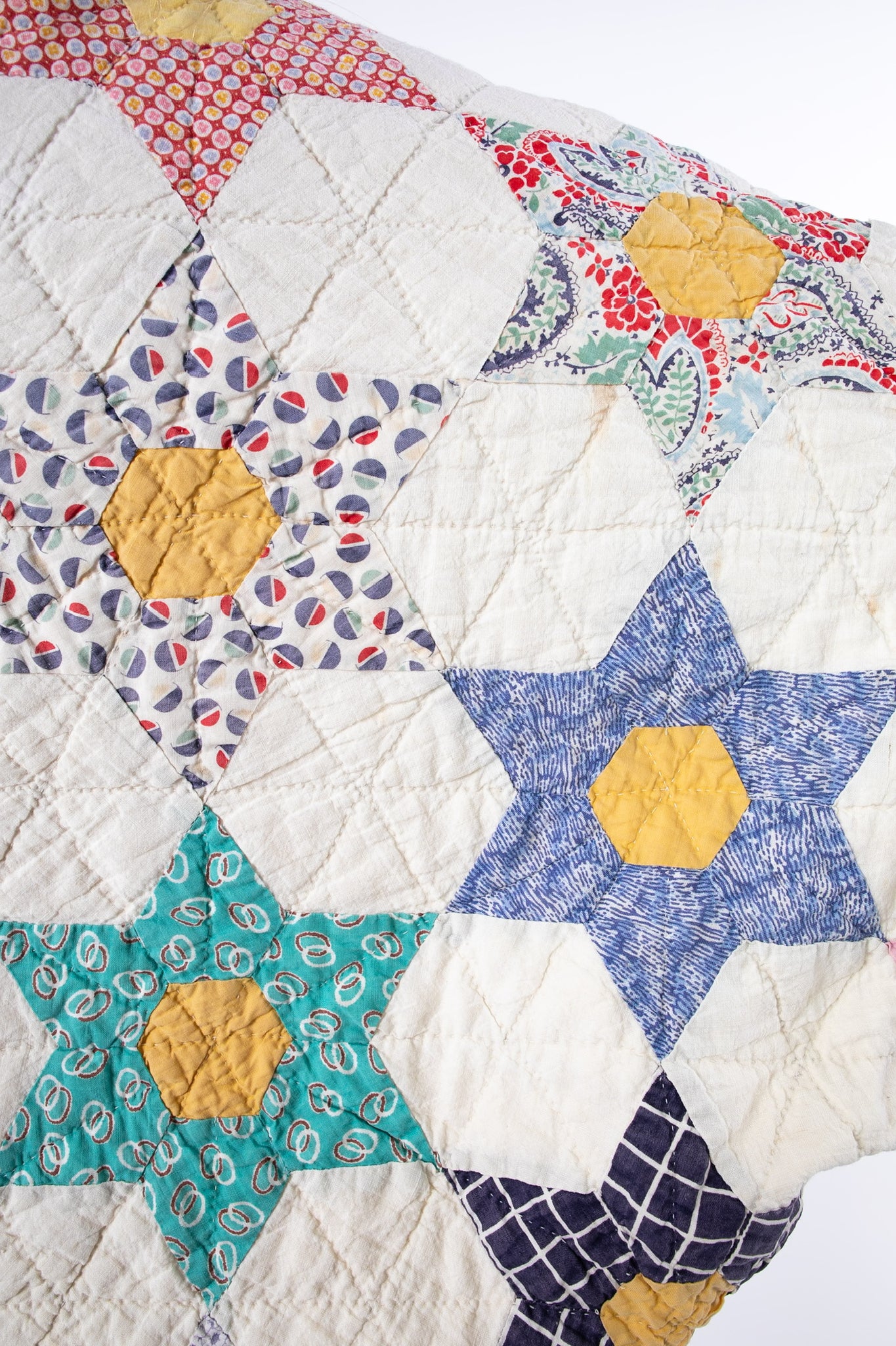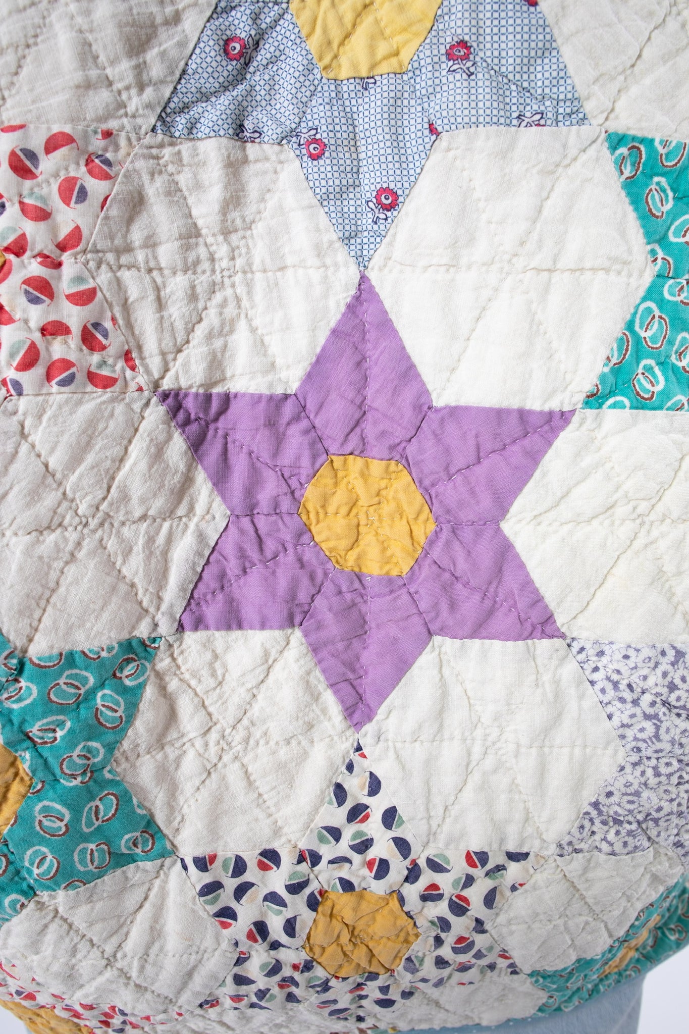 This is an antique American quilt made circa 1930s to 1940s. The quilt pattern has been called many names throughout the years. Our favorites are Texas Star, Friendship Hexagon, Dolly Madison's Star, and Star garden. The quilt has been beautifully hand quilted and hand sewn, which is a labor of love and a lost art. We love the contrasting yellow fabric on the inside of the jacket, this makes the jacket completely reversible. This piece looks fabulous worn inside out and upside down, please see photos. In our opinion, the jacket is thin, lightweight, super soft, a dream to wear, and has a great drape. There is very little to no loft (puffiness)making this jacket extremely comfortable and lightweight. This piece looks good with everything in your closet. The quilt is in great condition for its age. If you have further questions, please direct message us and we are happy to send you a video.