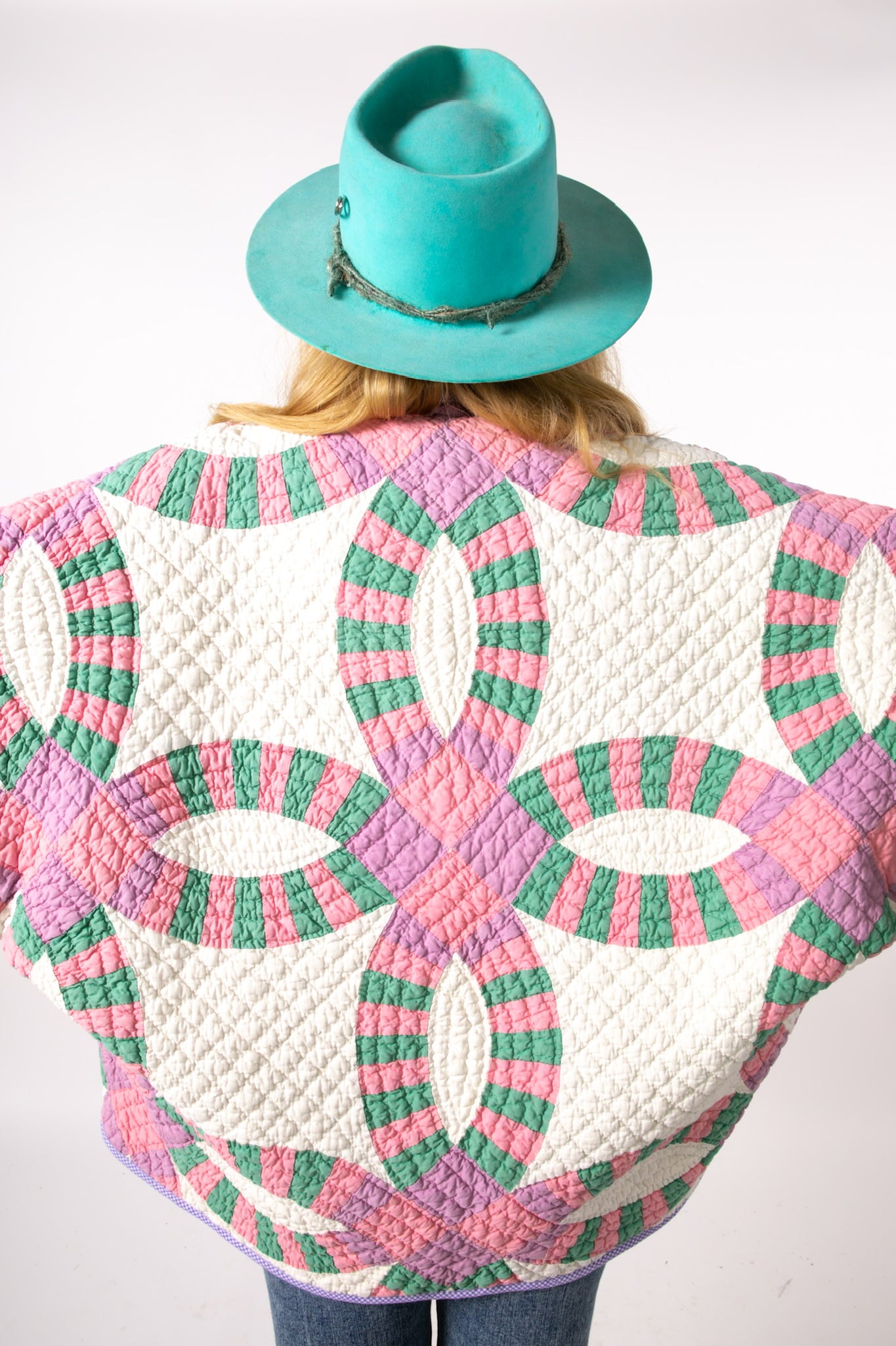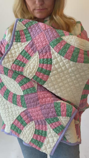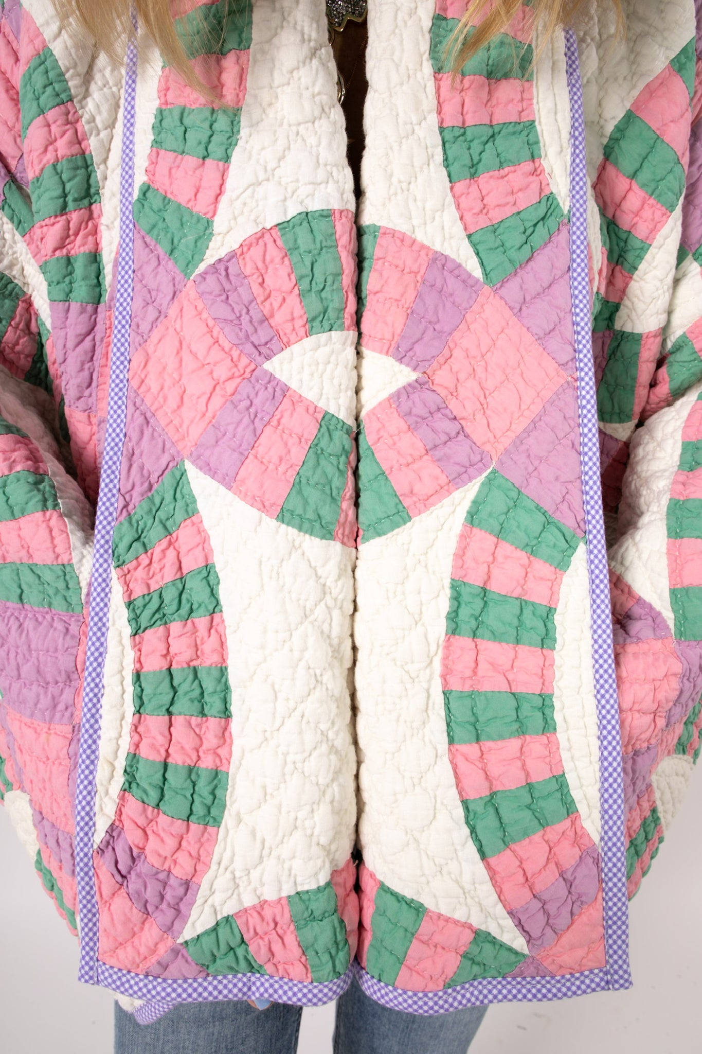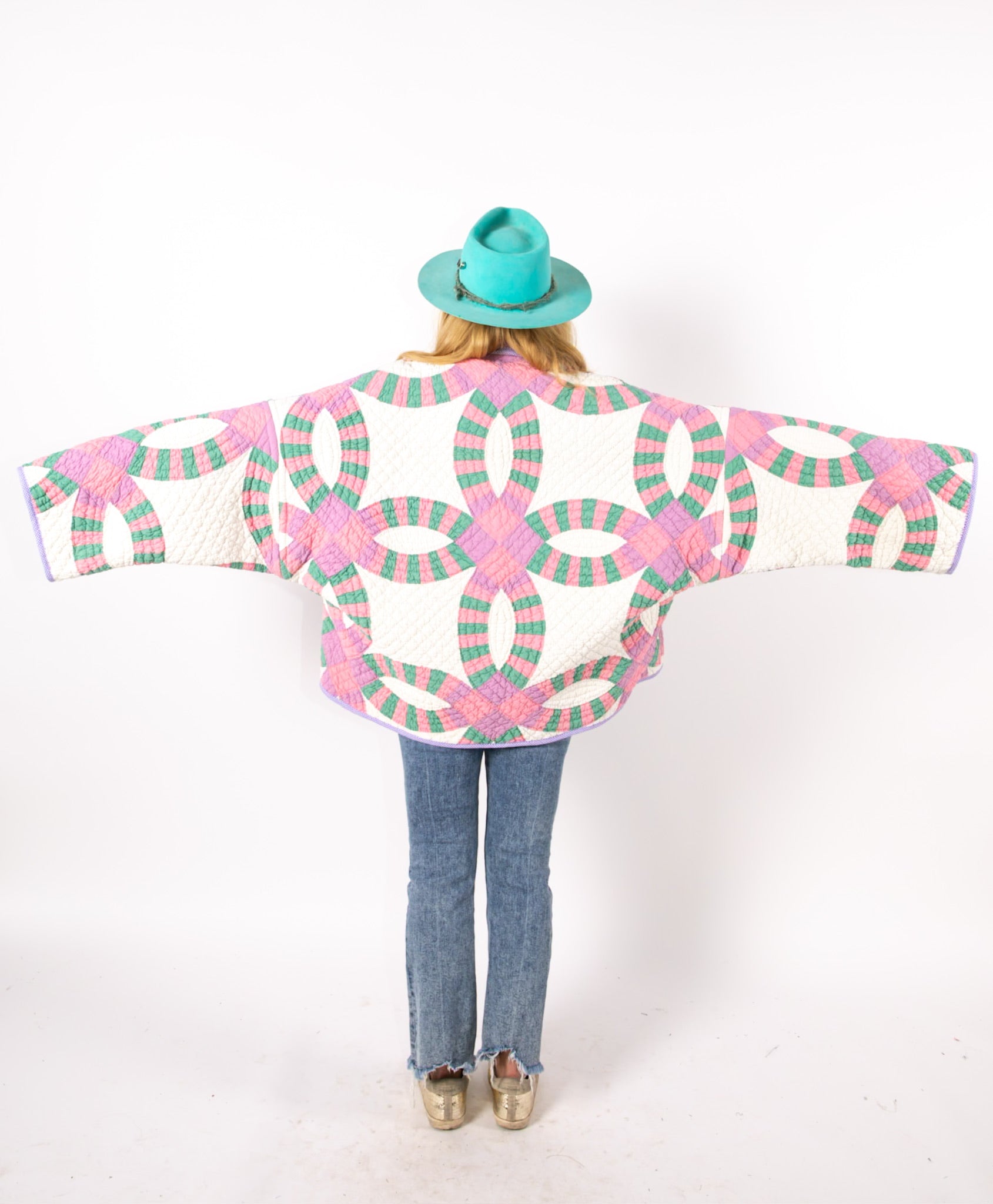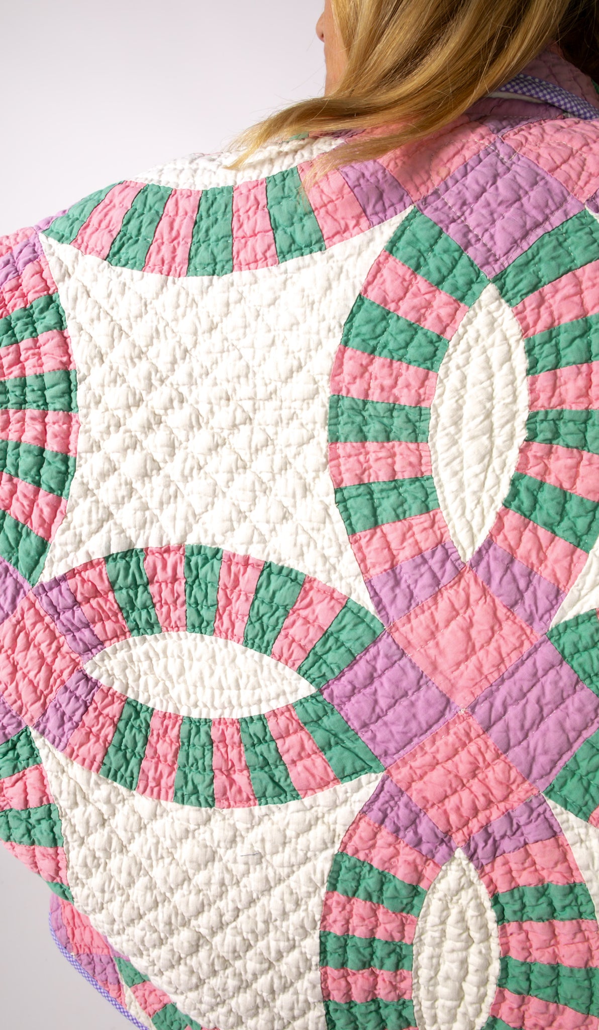 This is an antique American quilt made circa 1930s to 1960s. It is a traditional Wedding Ring quilt pattern. The maker was a master. The quilt is exquisite for its hand sewing and hand quilting. Please Note: the grounding fabric is not a crisp white, nor was it ever intended to be white, it is more of an ivory. The maker backed this quilt(inside of jacket) with a cotton muslin fabric. In our opinion, the jacket is very soft, very lightweight, and has medium loft(puffiness). Even though this is our standard Ethel pattern the sleeves feel longer. If you are familiar with our Ethel and are a petite, please request the sleeves to be shortened. Please note there are many small and faint age spot on the inside of the jacket. They do not bleed to the outside. If you have further questions, please direct message us and we are happy to send you a video.
