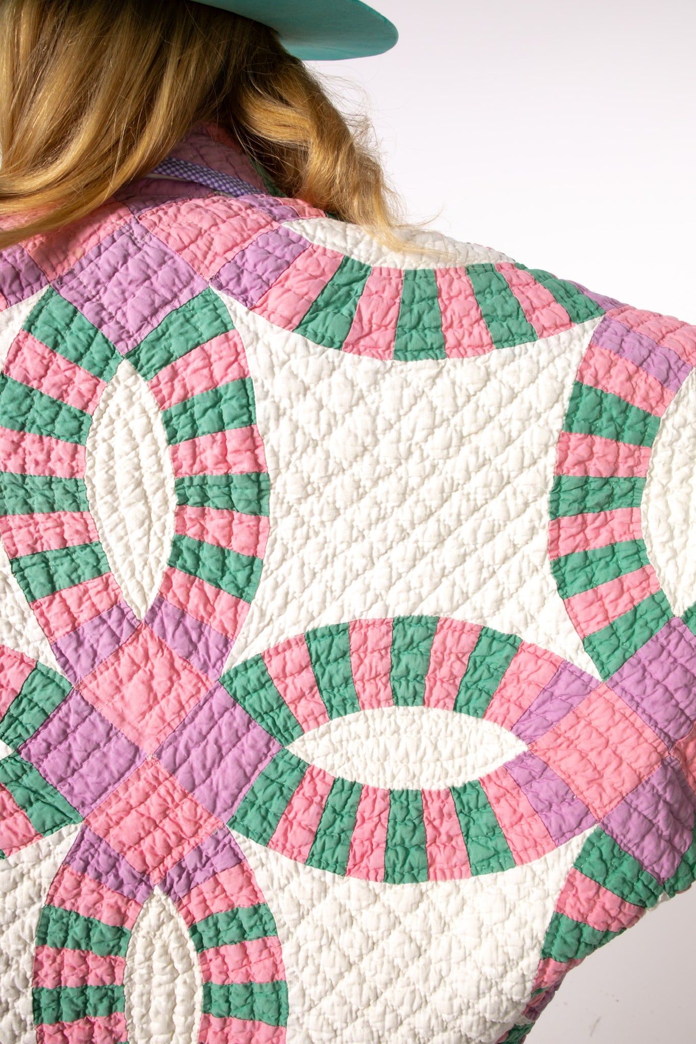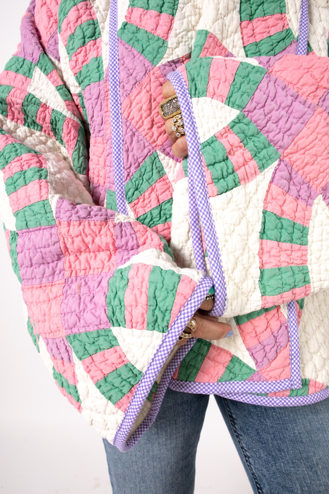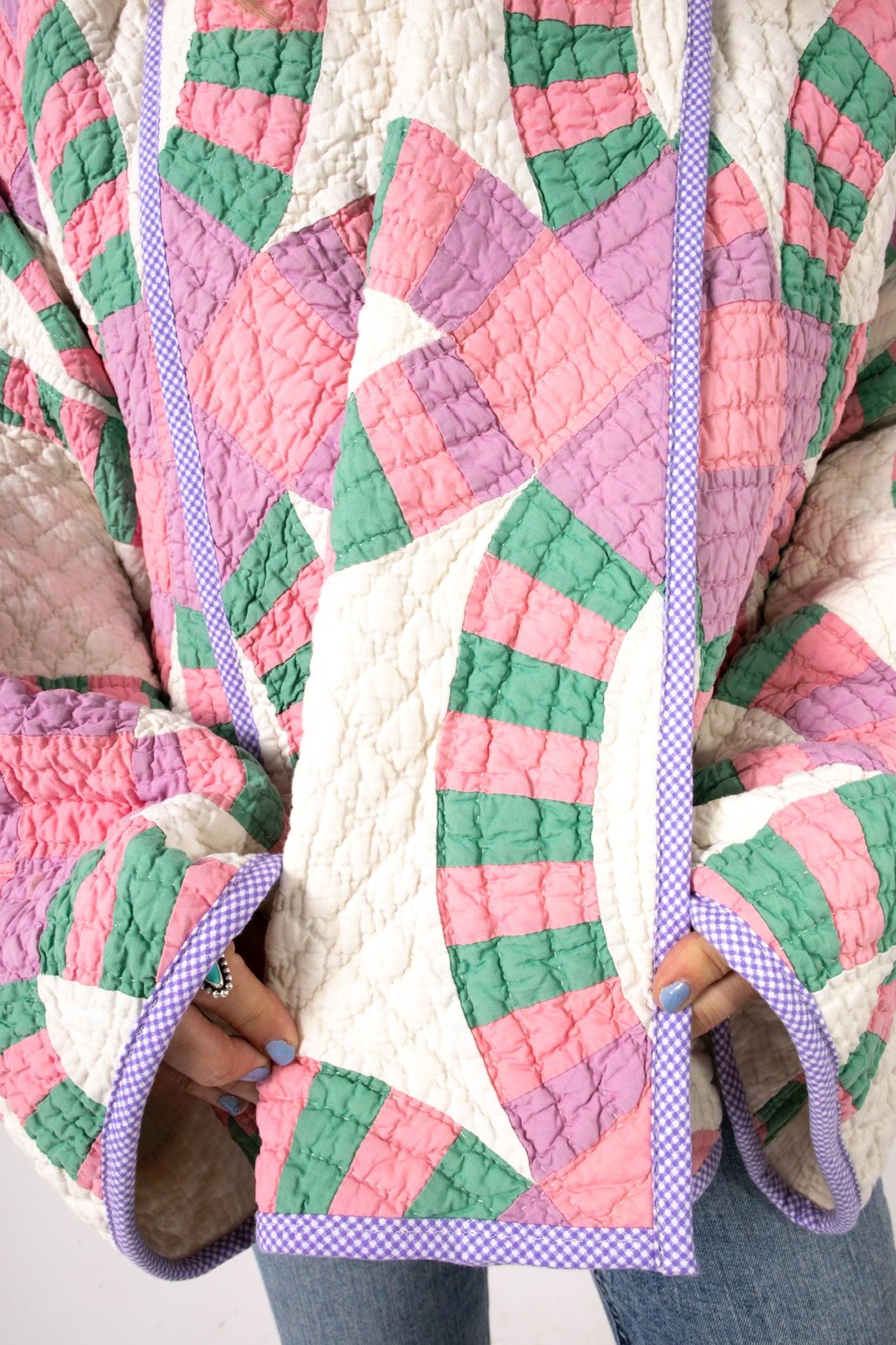This is an antique American quilt made circa 1930s to 1960s. It is a traditional Wedding Ring quilt pattern. The maker was a master. The quilt is exquisite for its hand sewing and hand quilting. Please Note: the grounding fabric is not a crisp white, nor was it ever intended to be white, it is more of an ivory. The maker backed this quilt(inside of jacket) with a cotton muslin fabric. In our opinion, the jacket is very soft, very lightweight, and has medium loft(puffiness). Even though this is our standard Ethel pattern the sleeves feel longer. If you are familiar with our Ethel and are a petite, please request the sleeves to be shortened. Please note there are many small and faint age spot on the inside of the jacket. They do not bleed to the outside. If you have further questions, please direct message us and we are happy to send you a video.