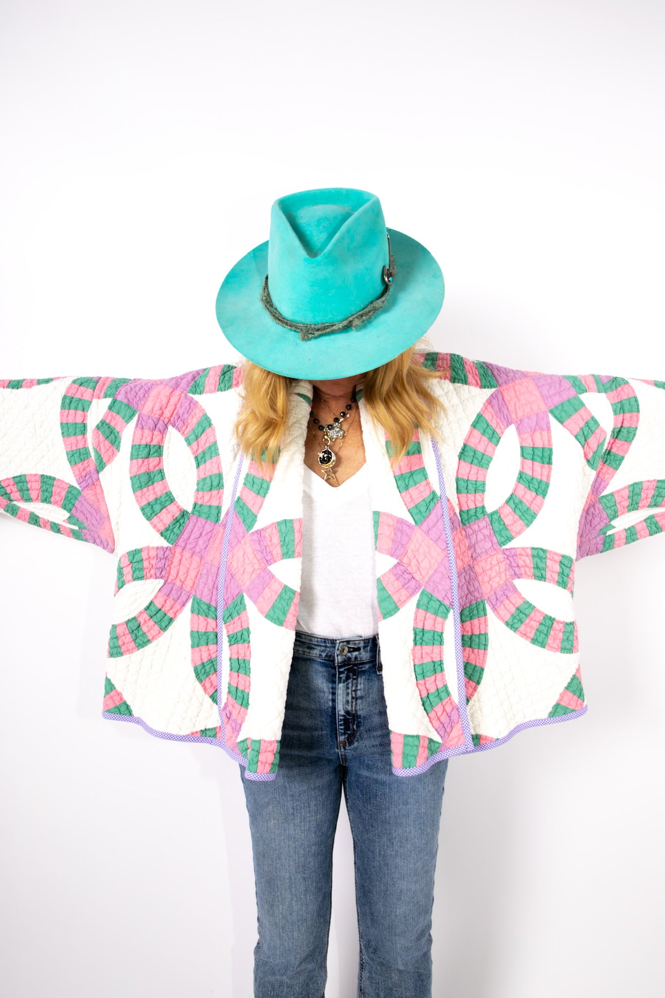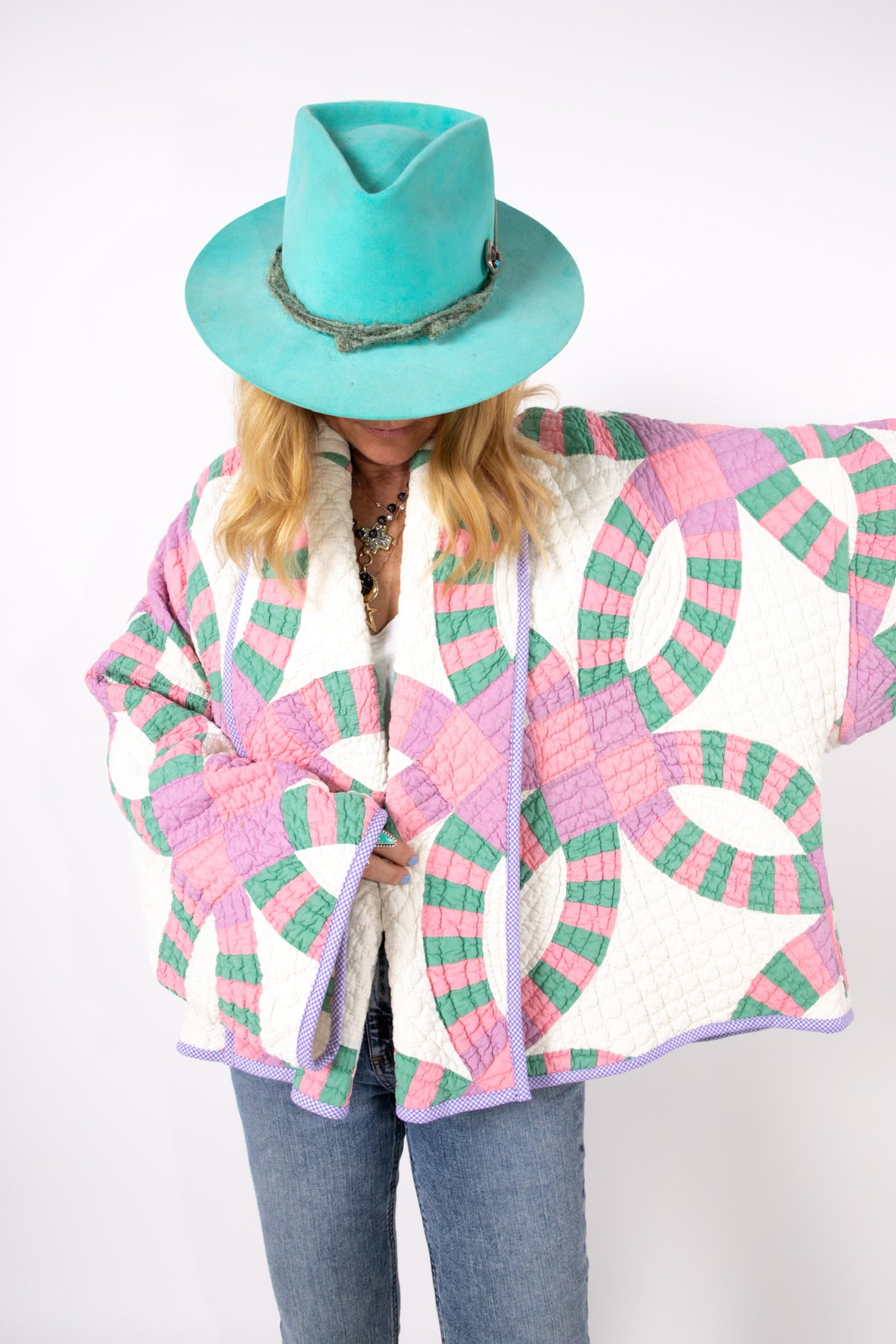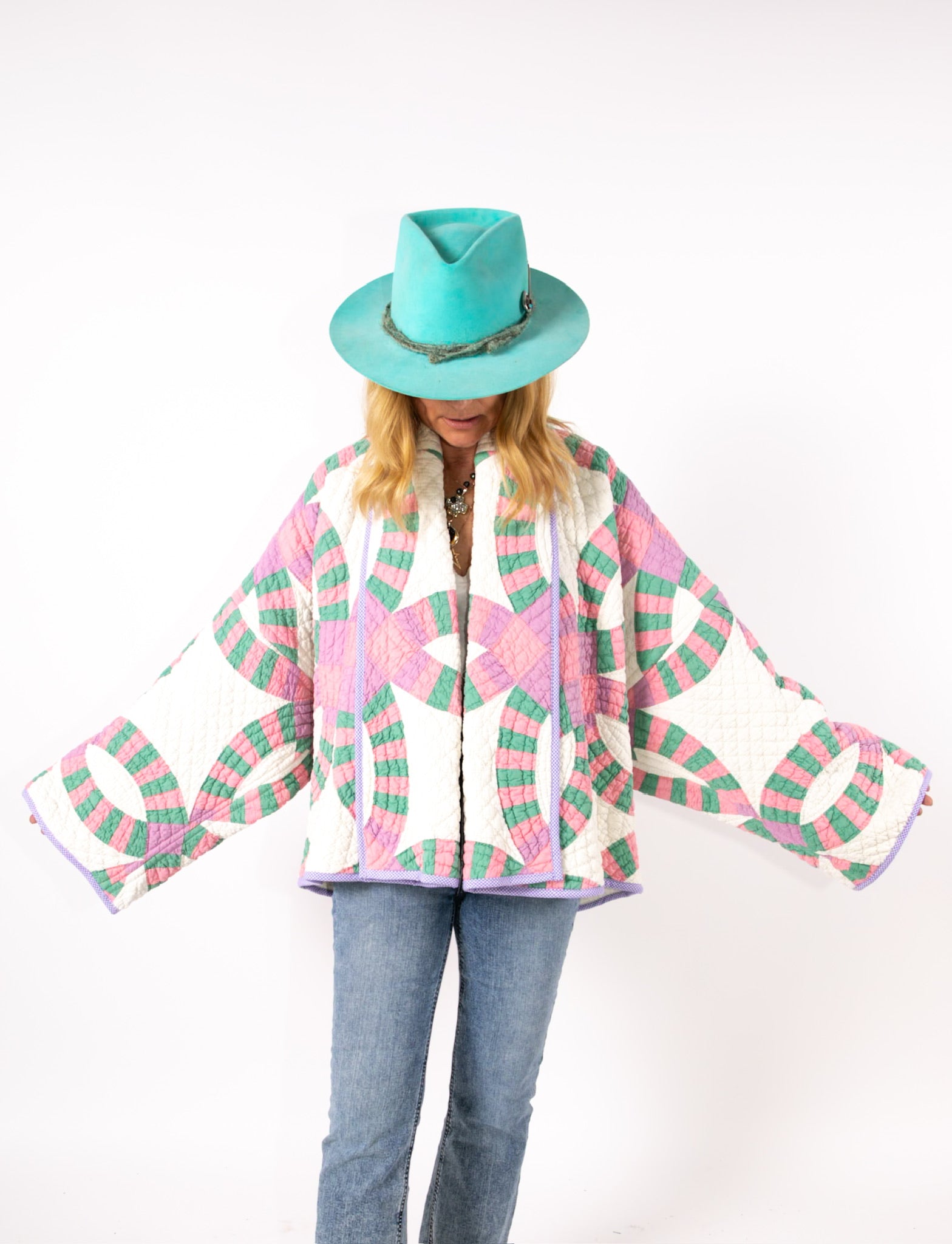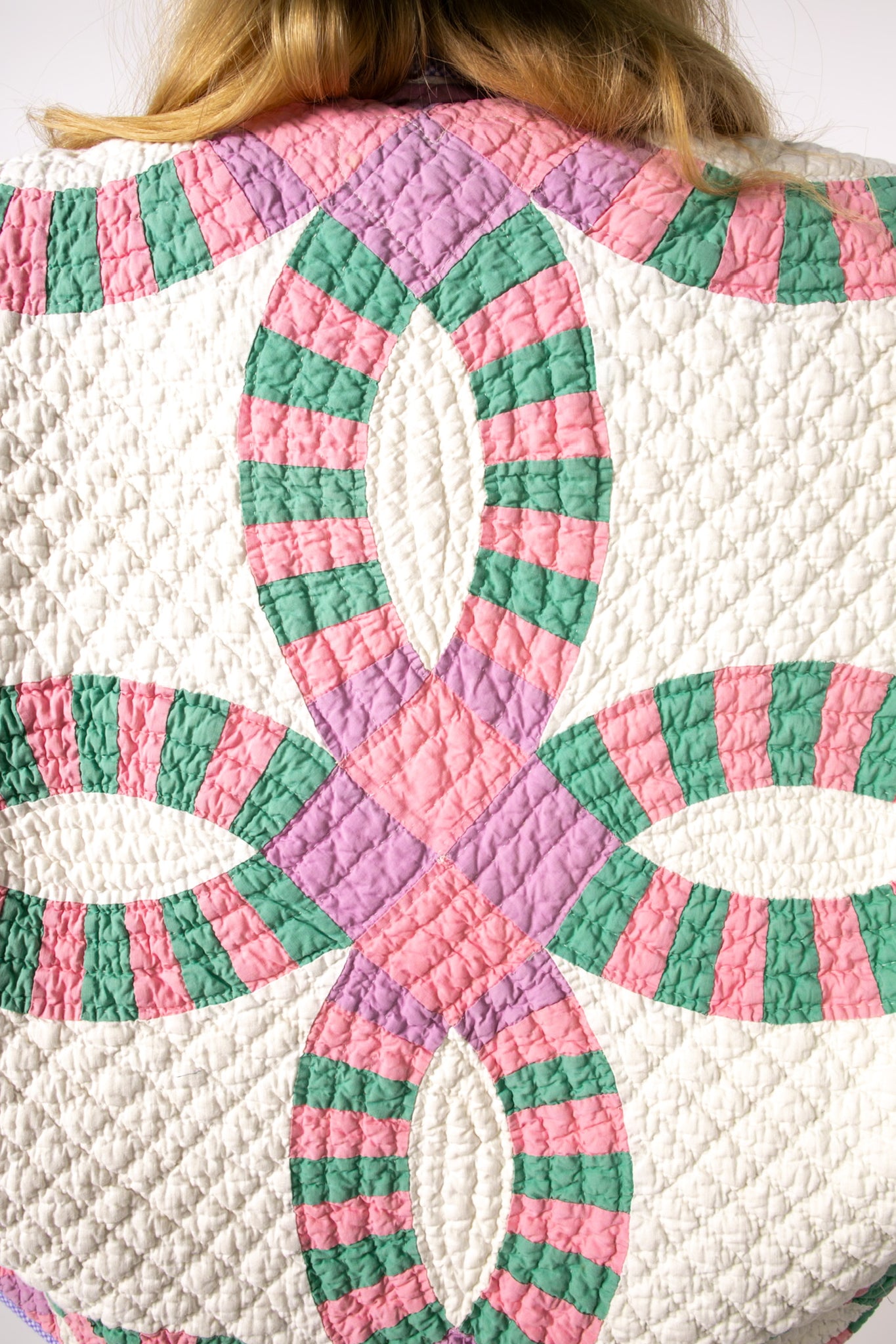 This is an antique American quilt made circa 1930s to 1960s. It is a traditional Wedding Ring quilt pattern. The maker was a master. The quilt is exquisite for its hand sewing and hand quilting. Please Note: the grounding fabric is not a crisp white, nor was it ever intended to be white, it is more of an ivory. The maker backed this quilt(inside of jacket) with a cotton muslin fabric. In our opinion, the jacket is very soft, very lightweight, and has medium loft(puffiness). Even though this is our standard Ethel pattern the sleeves feel longer. If you are familiar with our Ethel and are a petite, please request the sleeves to be shortened. Please note there are many small and faint age spot on the inside of the jacket. They do not bleed to the outside. If you have further questions, please direct message us and we are happy to send you a video.