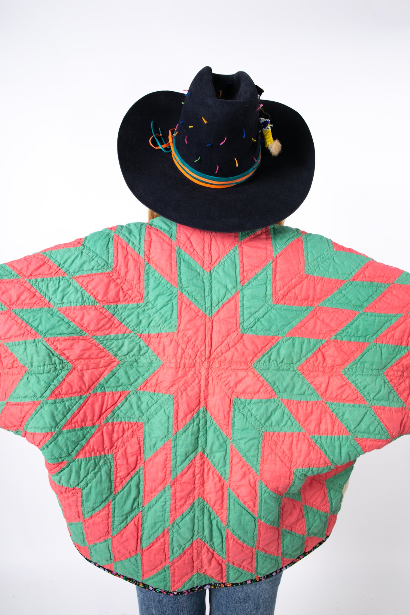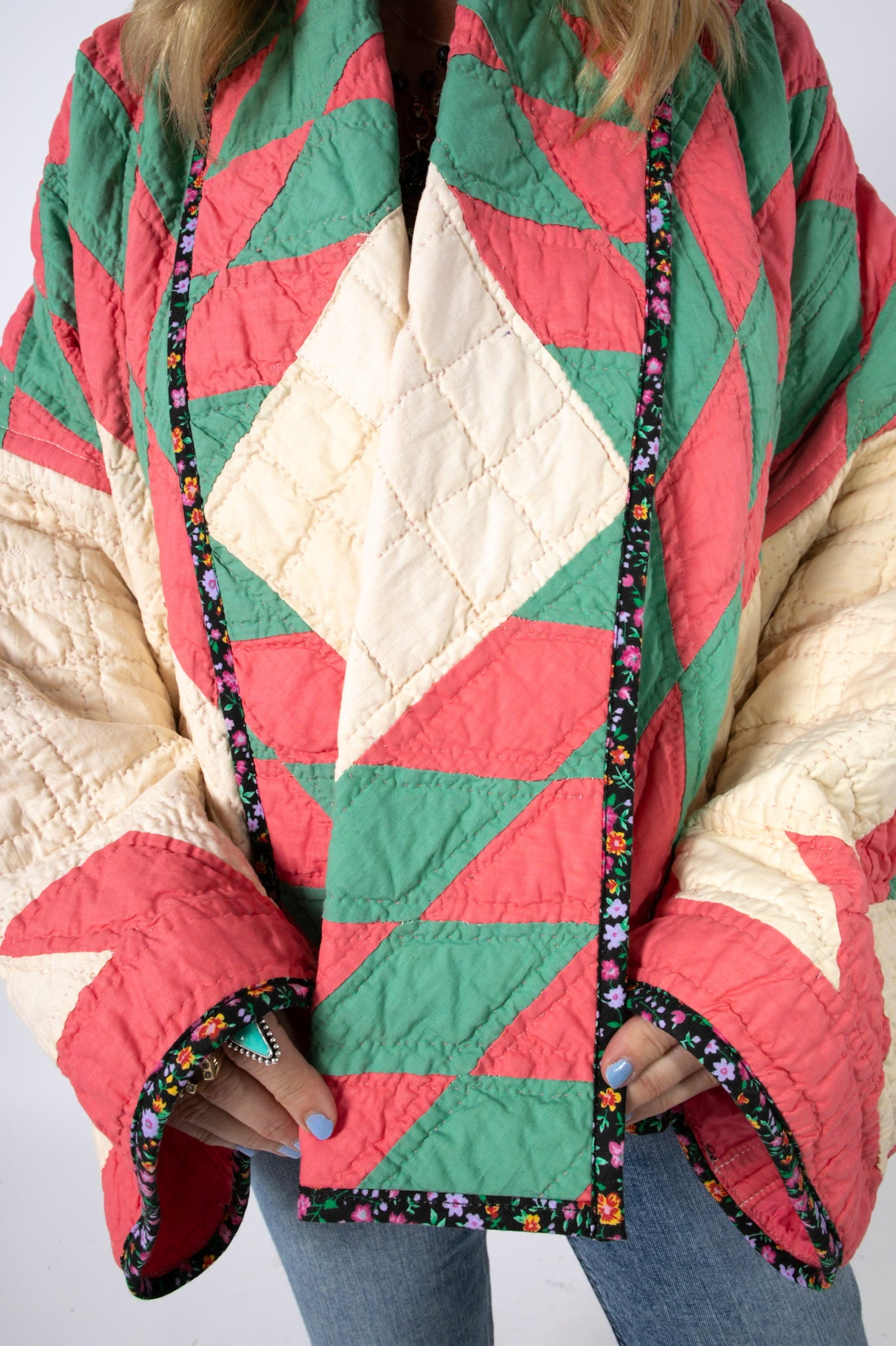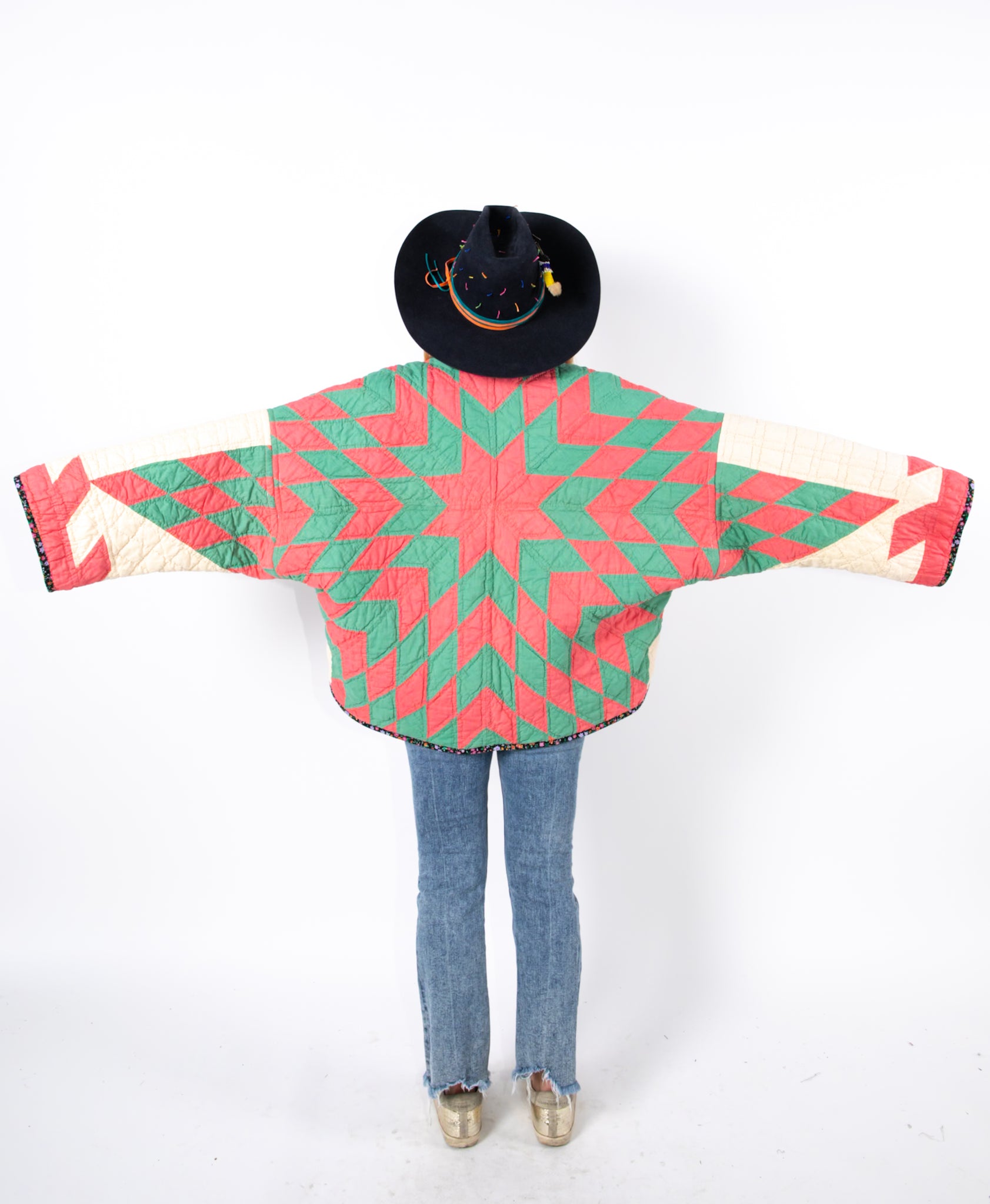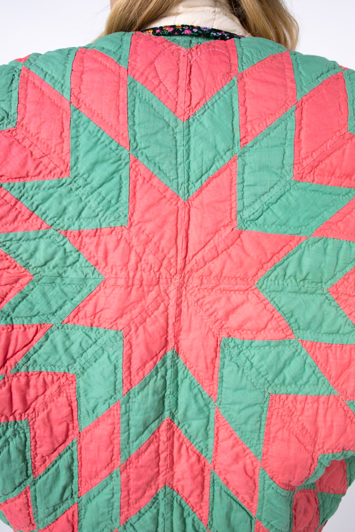 This is an antique American quilt made circa 1930s to 1960s. It is a traditional Lone Star quilt pattern with an elevated border. We have preserved and displayed this border on the cuffs of the sleeves. The quilt has been beautifully hand quilted and hand sewn. The maker quilted with a pint thread which adds extra interest and fun to this piece! The ground fabric is not white nor was it ever intended to be, it is almond. As an added bonus the quilt is backed(inside of jacket) with a coordinating pink fabric. You will want to cuff the sleeves or wear this piece upside down! In our opinion, the jacket is thin, soft, lightweight, and has a flattering drape. Please note: There is an age mark on the inside of the jacket that does not show through to the outside of the jacket. It is located under the armpit. We have included photos for your convenience. There are also a few zig zag mends. Please see a photo of the most prominent ones on the shawl. If you have further questions, please direct message us and we are happy to send you a video.