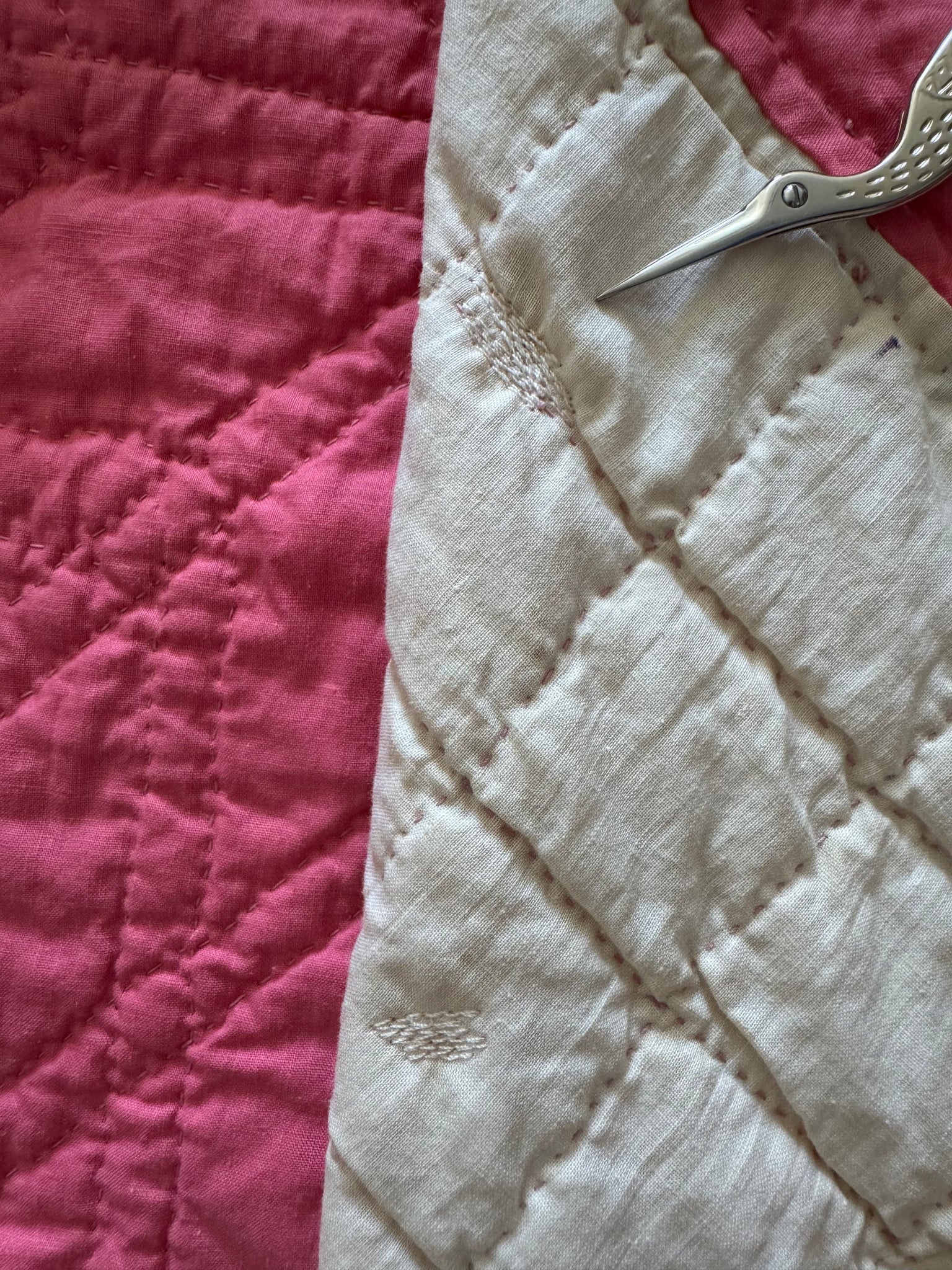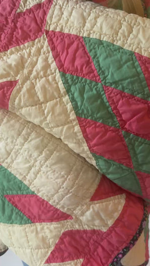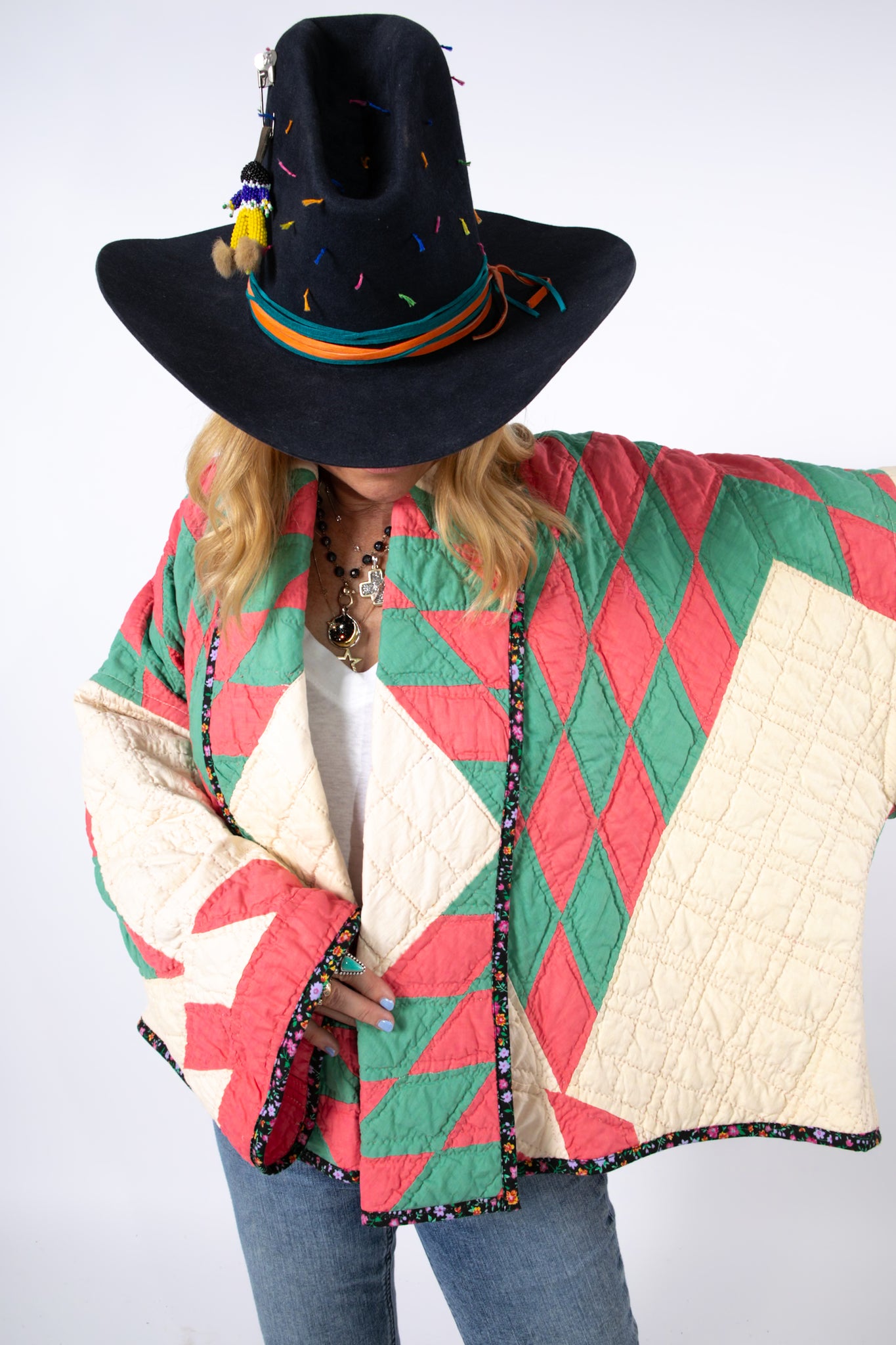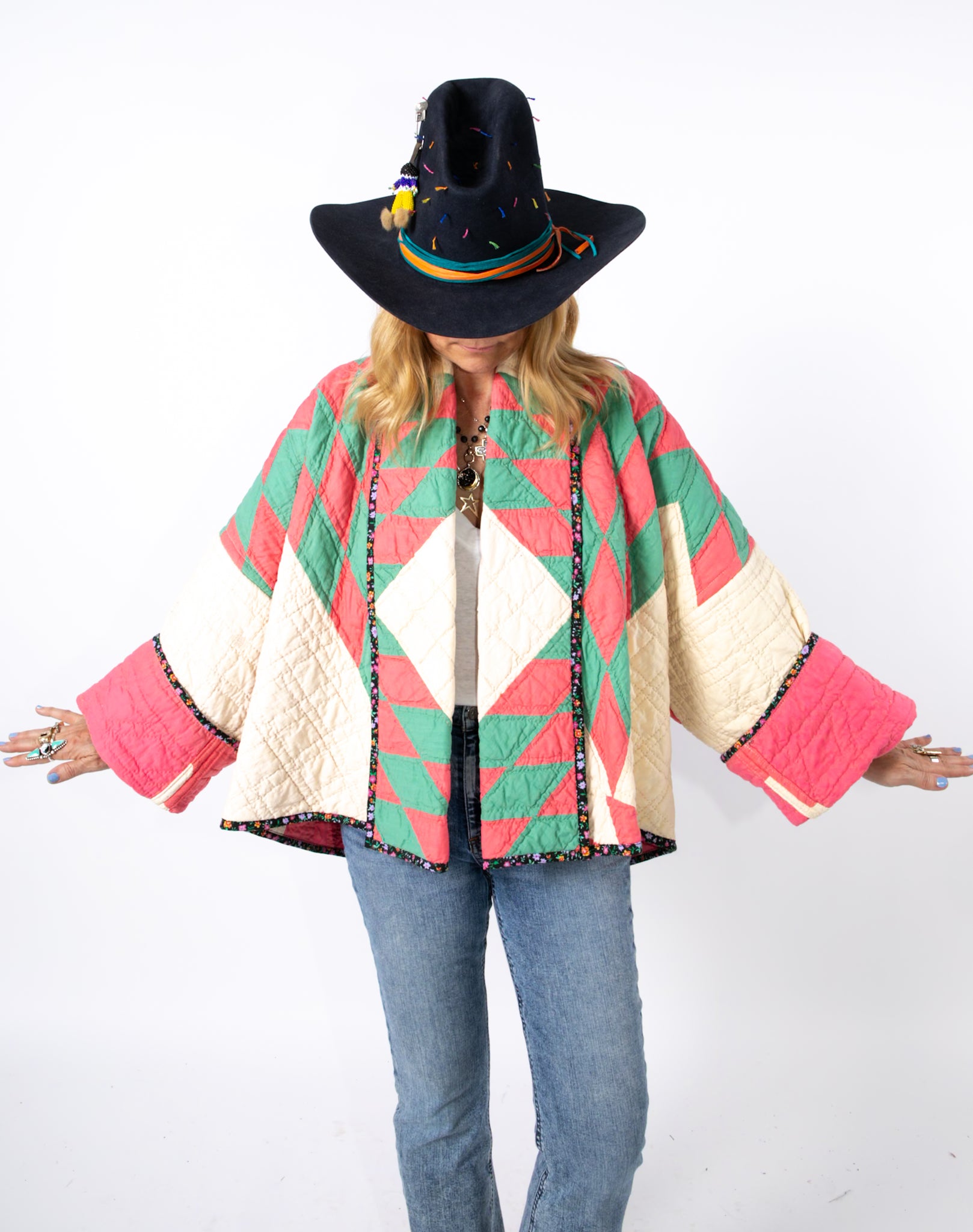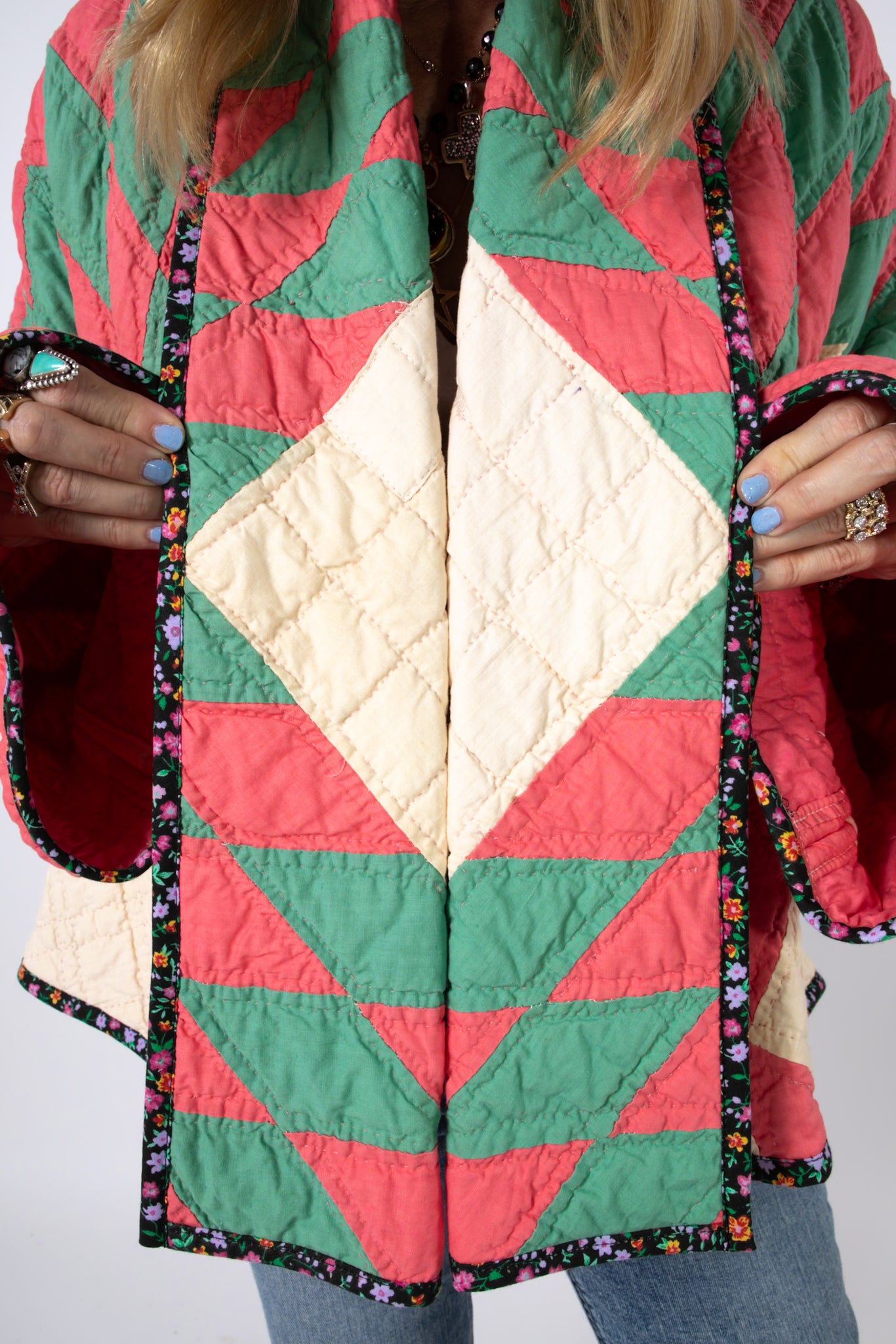 This is an antique American quilt made circa 1930s to 1960s. It is a traditional Lone Star quilt pattern with an elevated border. We have preserved and displayed this border on the cuffs of the sleeves. The quilt has been beautifully hand quilted and hand sewn. The maker quilted with a pint thread which adds extra interest and fun to this piece! The ground fabric is not white nor was it ever intended to be, it is almond. As an added bonus the quilt is backed(inside of jacket) with a coordinating pink fabric. You will want to cuff the sleeves or wear this piece upside down! In our opinion, the jacket is thin, soft, lightweight, and has a flattering drape. Please note: There is an age mark on the inside of the jacket that does not show through to the outside of the jacket. It is located under the armpit. We have included photos for your convenience. There are also a few zig zag mends. Please see a photo of the most prominent ones on the shawl. If you have further questions, please direct message us and we are happy to send you a video.