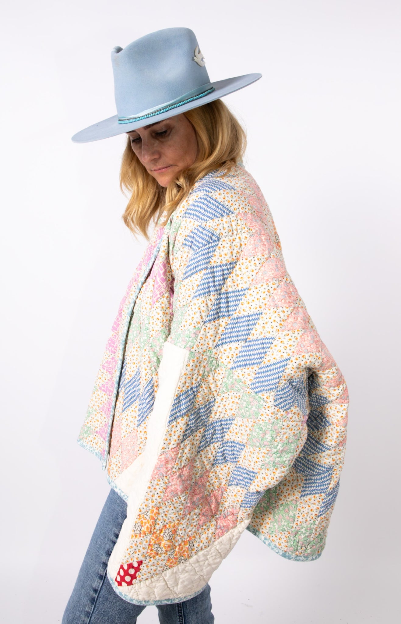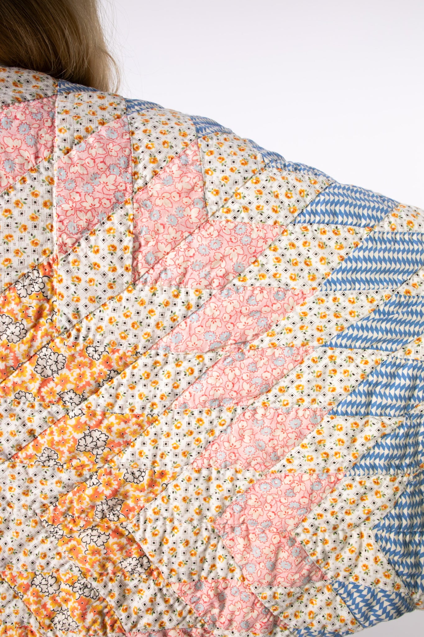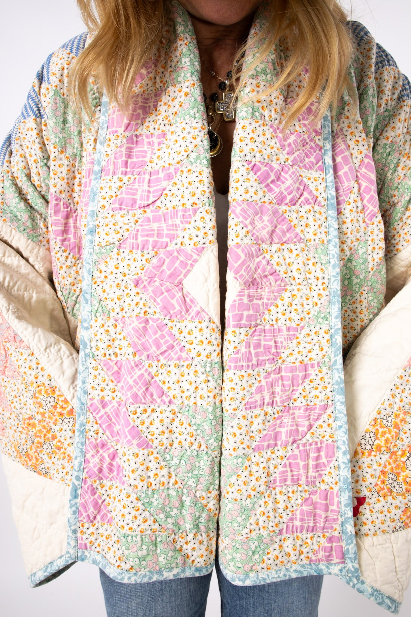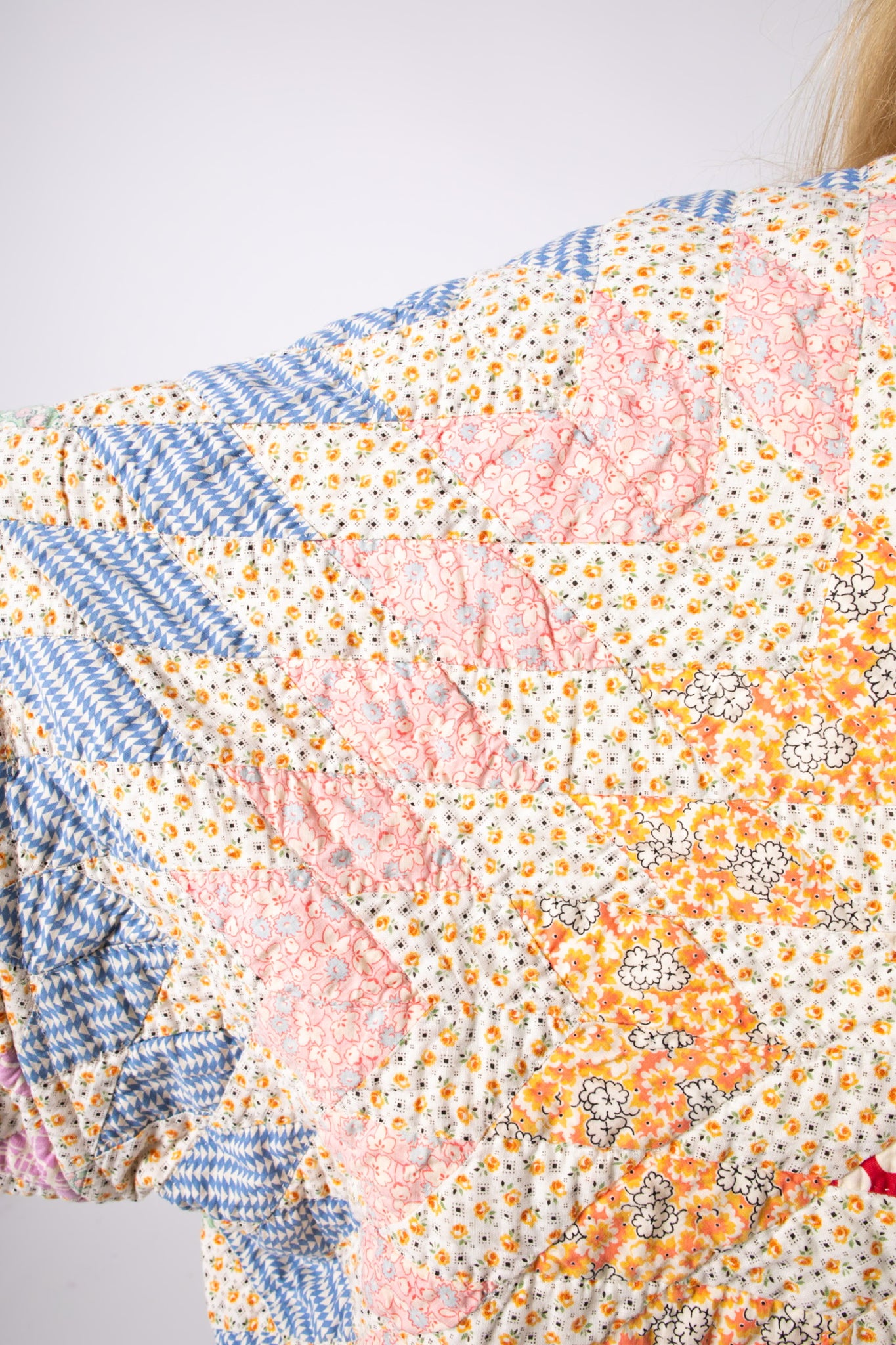 Please note that all of our jackets are made from antique quilts and the fabric reflects this. Our fabrics are sometimes older than 100 years and we believe that makes them perfectly imperfect. This is what makes them a one-of-a-kind piece of art. All of our garments are pre-washed in a special restoration quilt wash. We recommend spot cleaning if necessary.