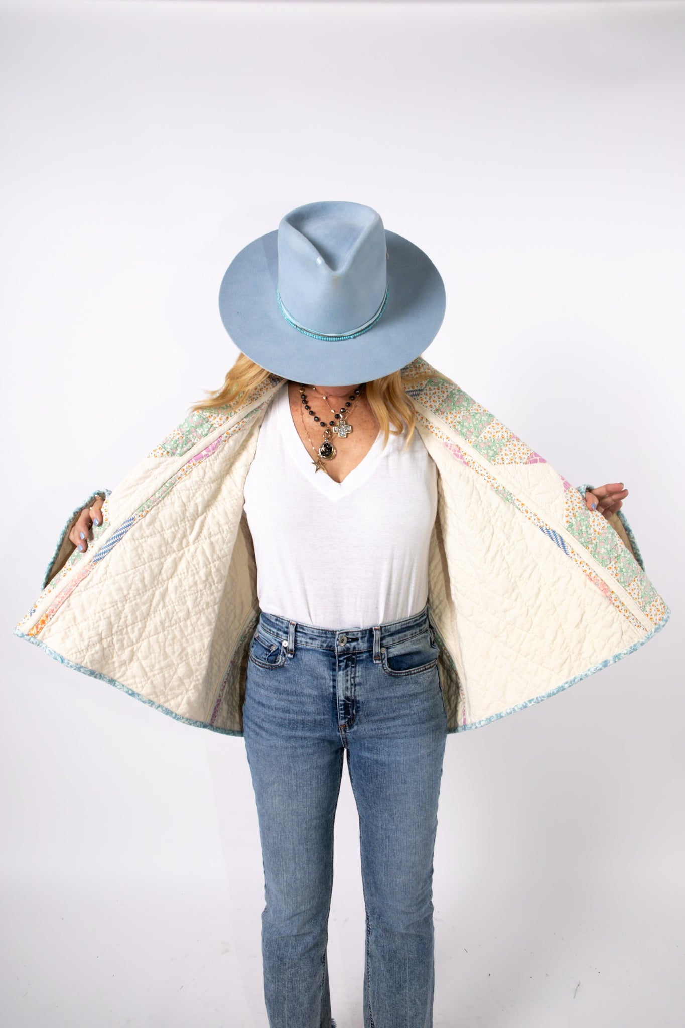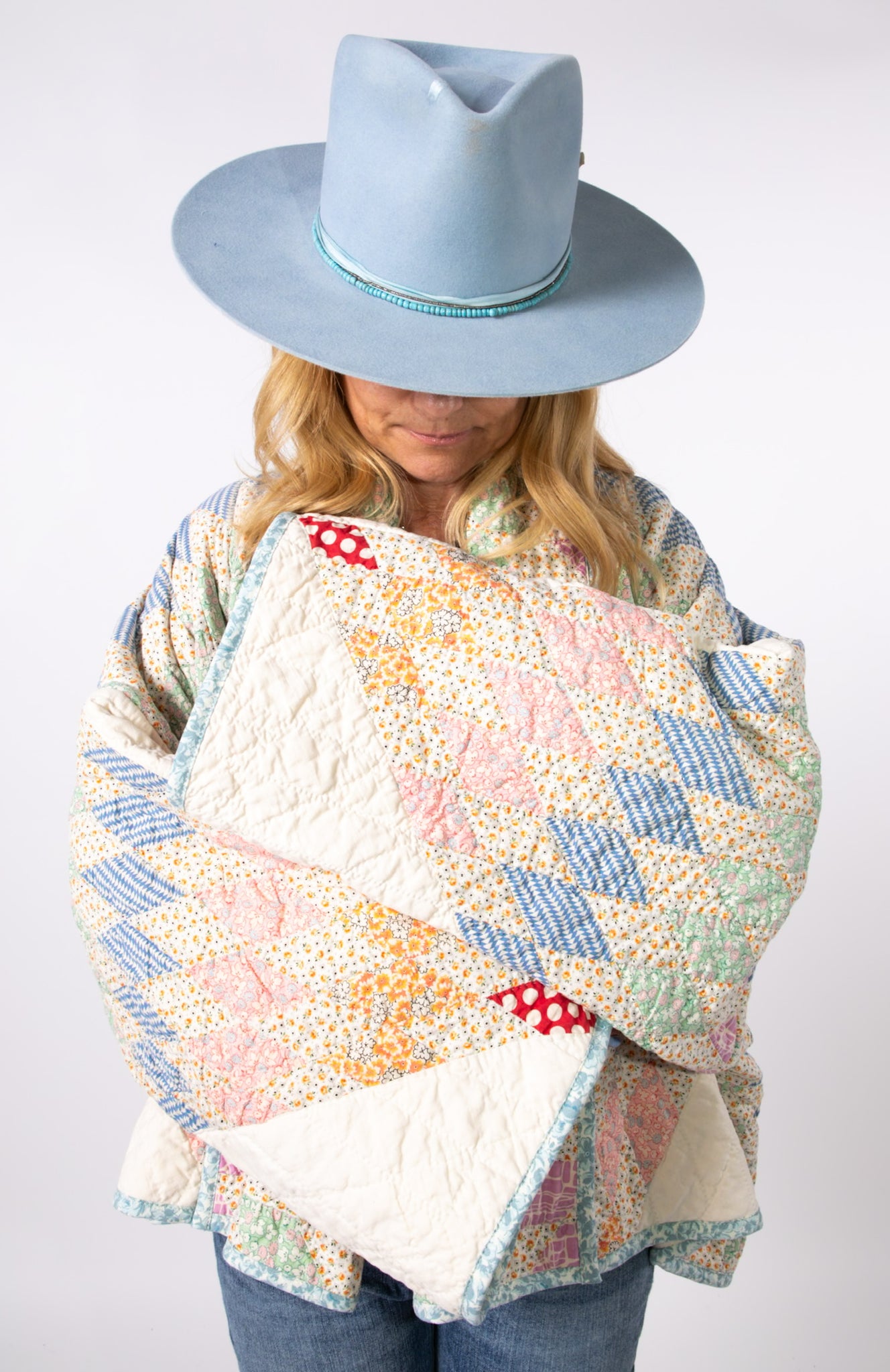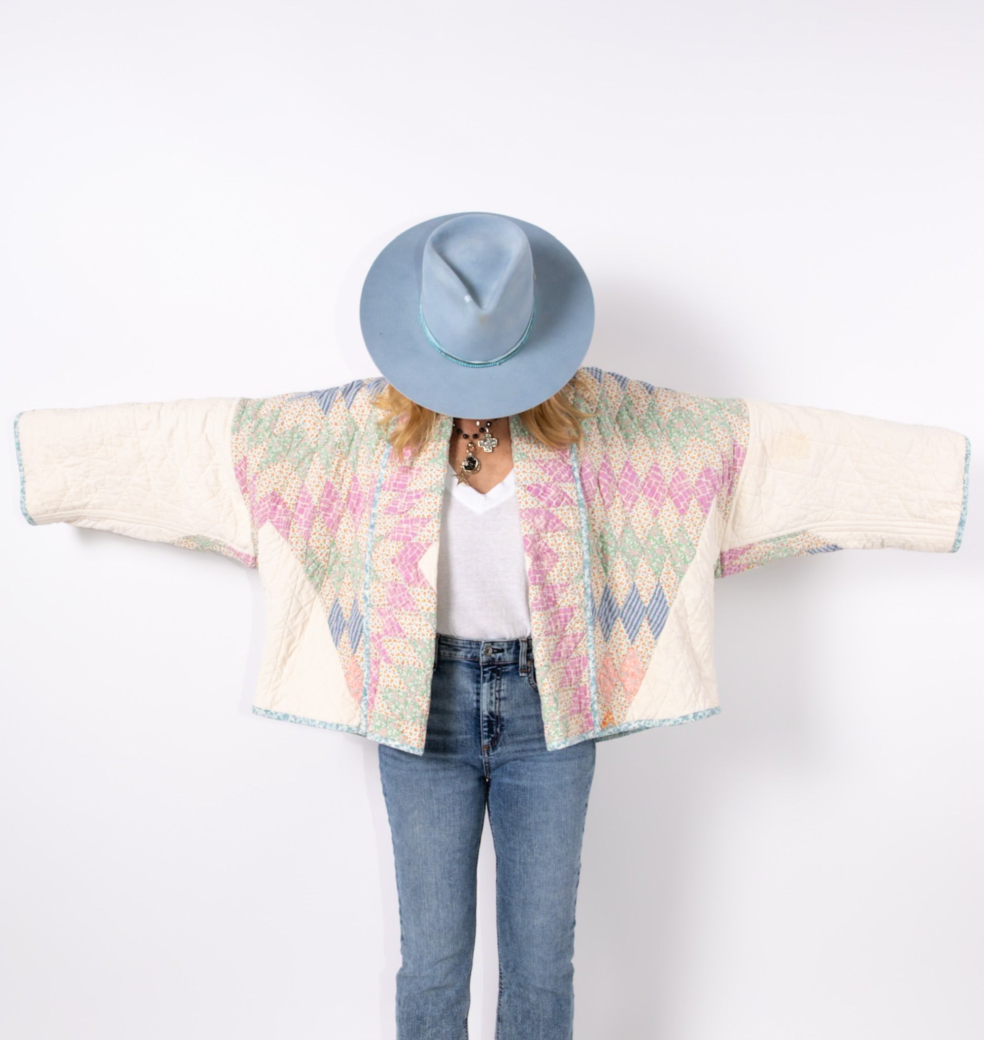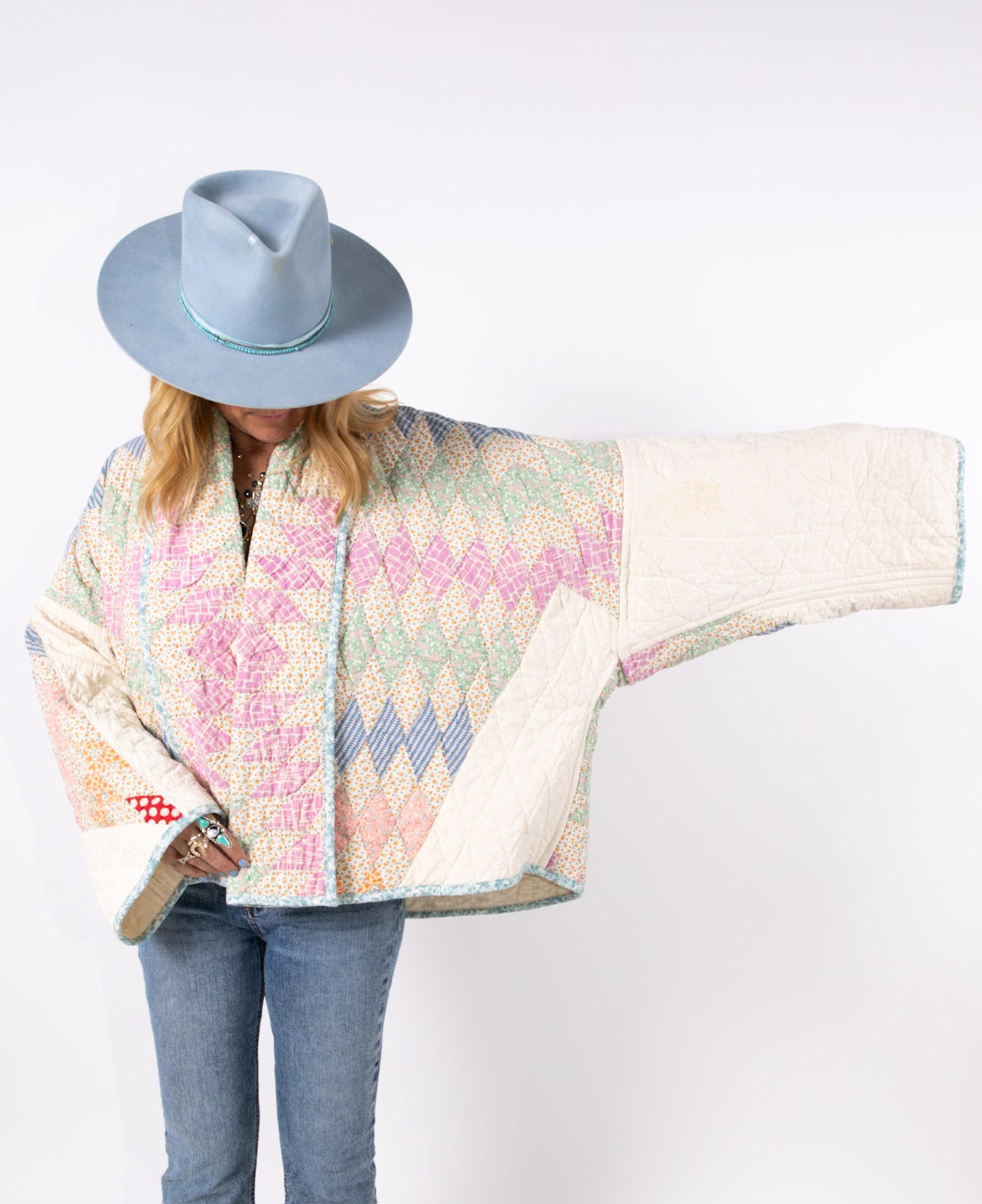 Please note that all of our jackets are made from antique quilts and the fabric reflects this. Our fabrics are sometimes older than 100 years and we believe that makes them perfectly imperfect. This is what makes them a one-of-a-kind piece of art. All of our garments are pre-washed in a special restoration quilt wash. We recommend spot cleaning if necessary.