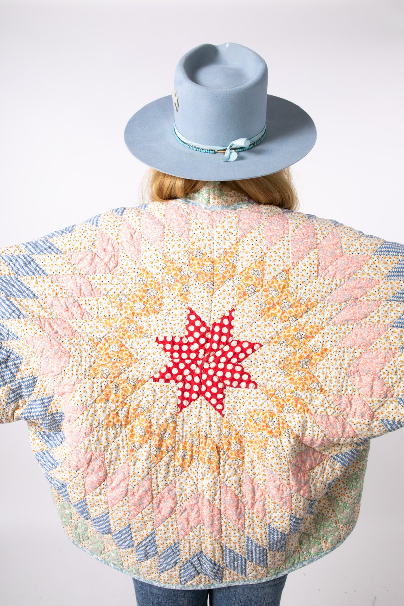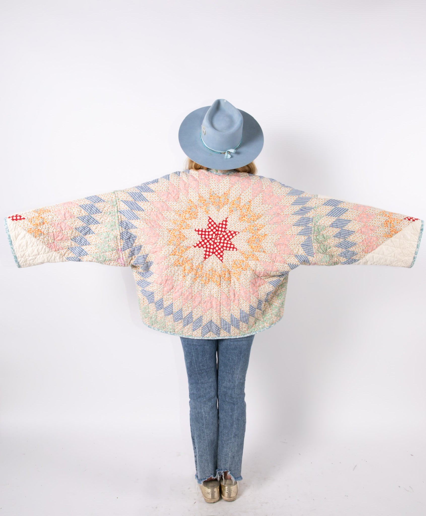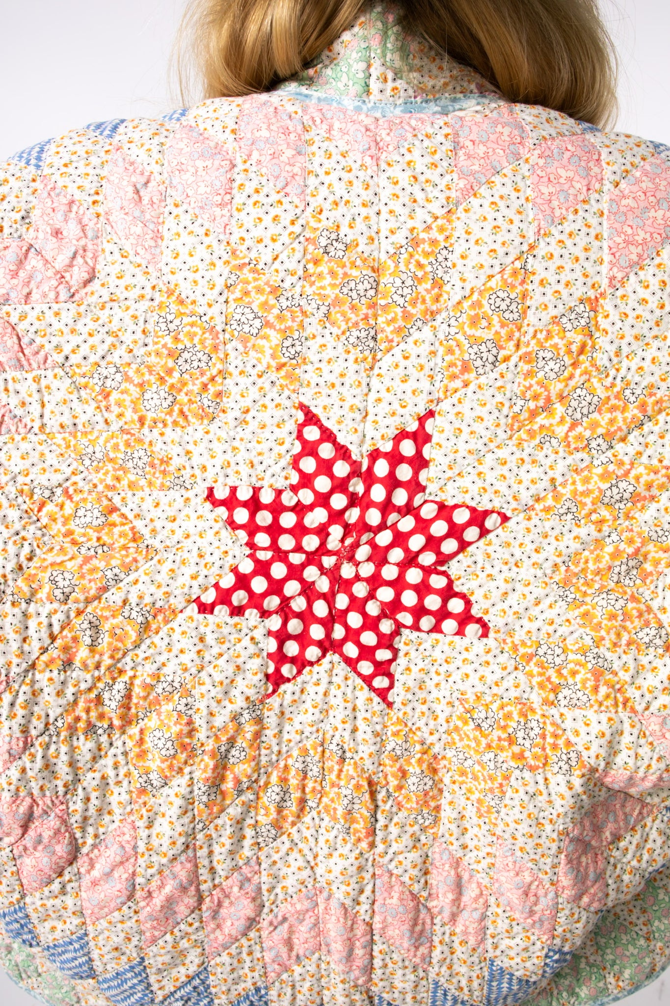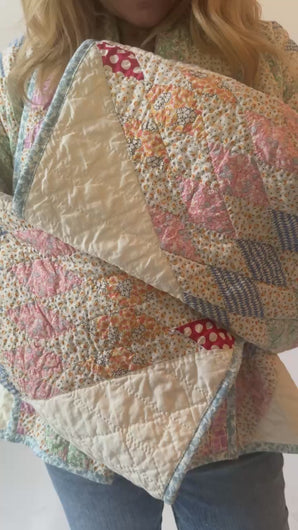 This is an antique American quilt made circa 1930s to 1950s. It is a traditional Lone Star quilt pattern. The maker used a variety of beautiful novelty and feedsack fabrics. The quilt has been beautifully hand quilted, it was made by a master. The maker backed the quilt(inside of jacket) with a cotton muslin fabric. In our opinion, the jacket is thin, soft, lightweight, and has a flattering drape. This is a Lady Lancaster 10/10. If you love pastels, and a subtle statement, this is the jacket for you! The quilt is in excellent condition for its age. If you have further questions, please direct message us and we are happy to send you a video.