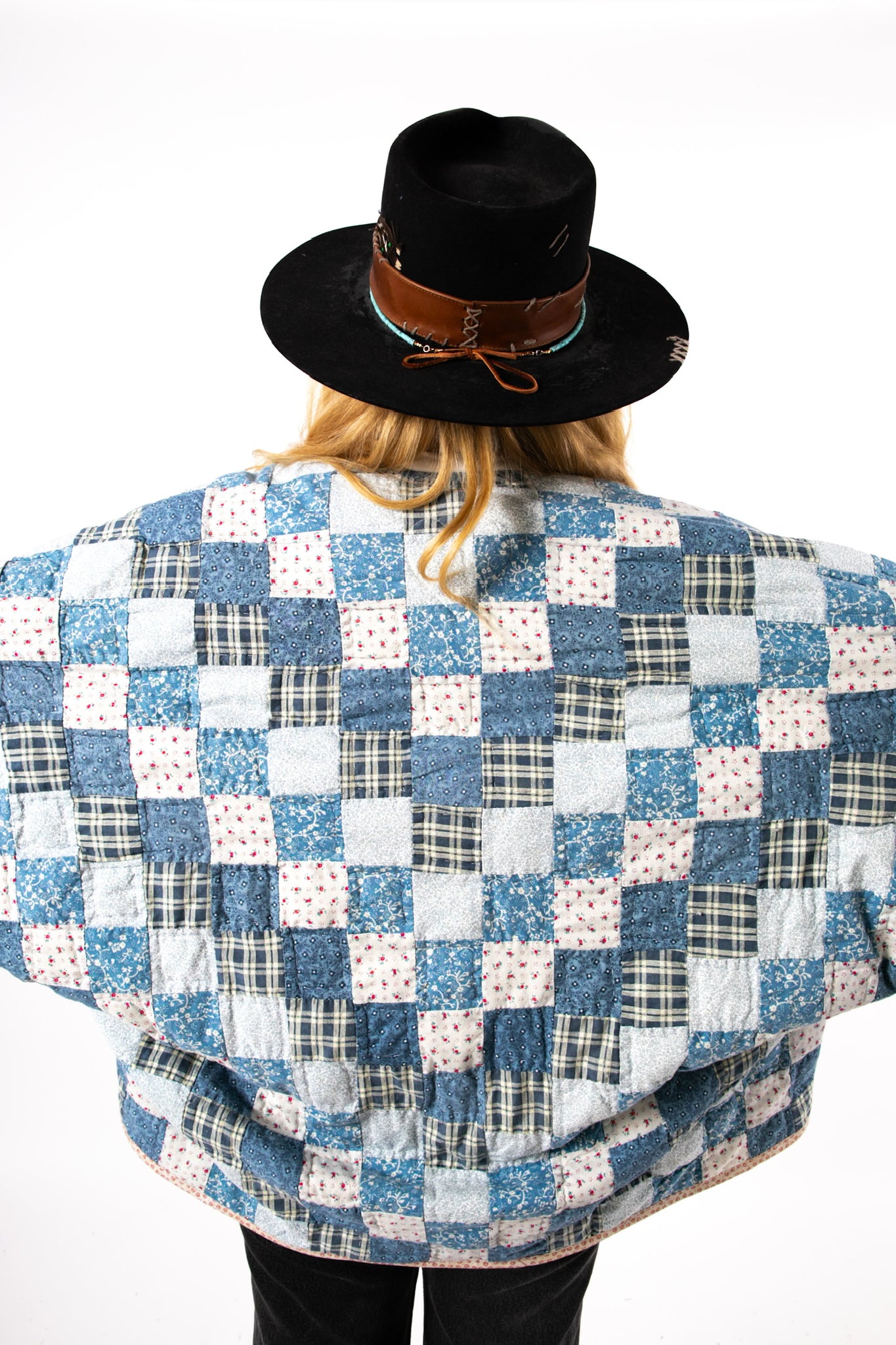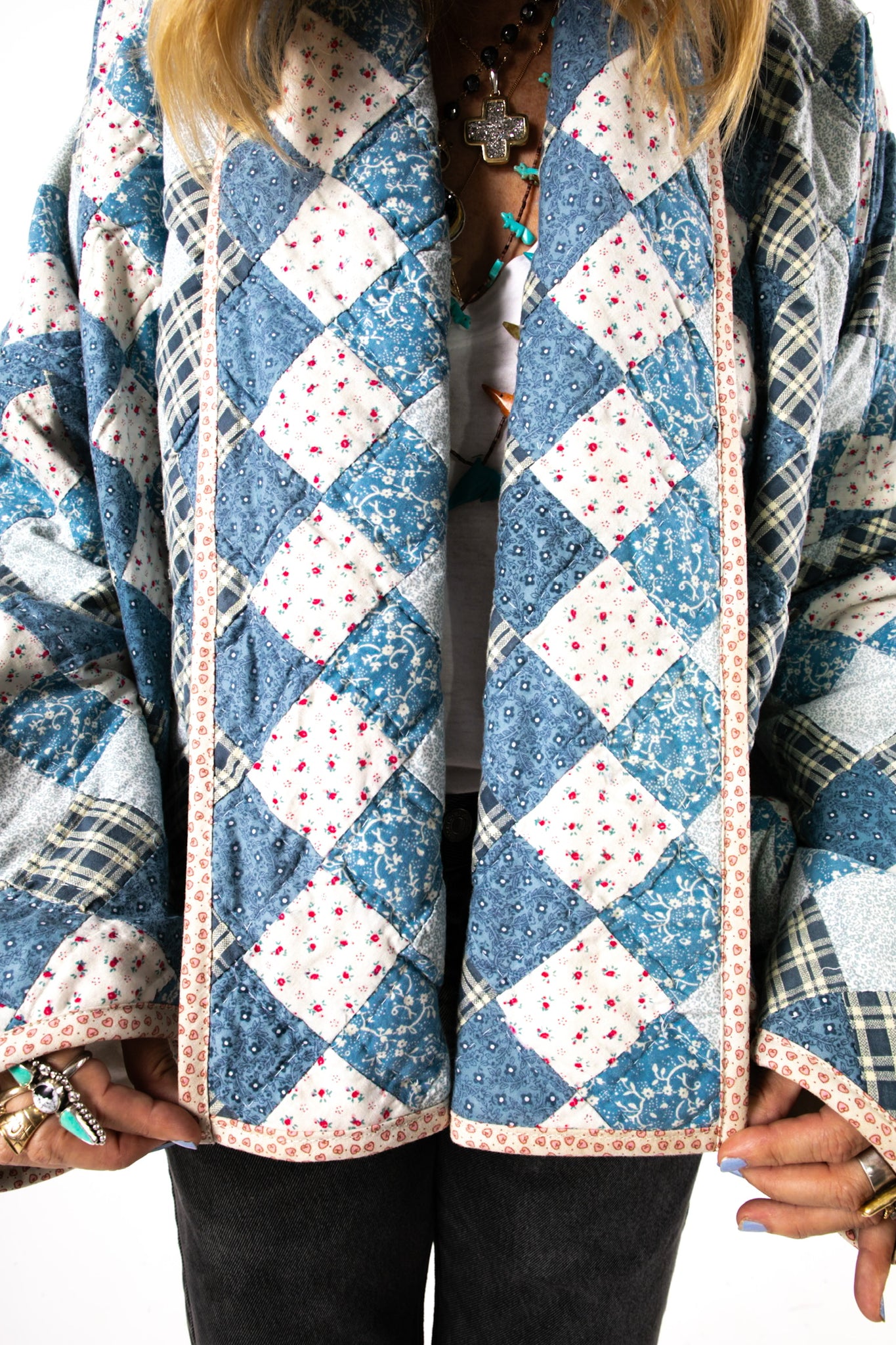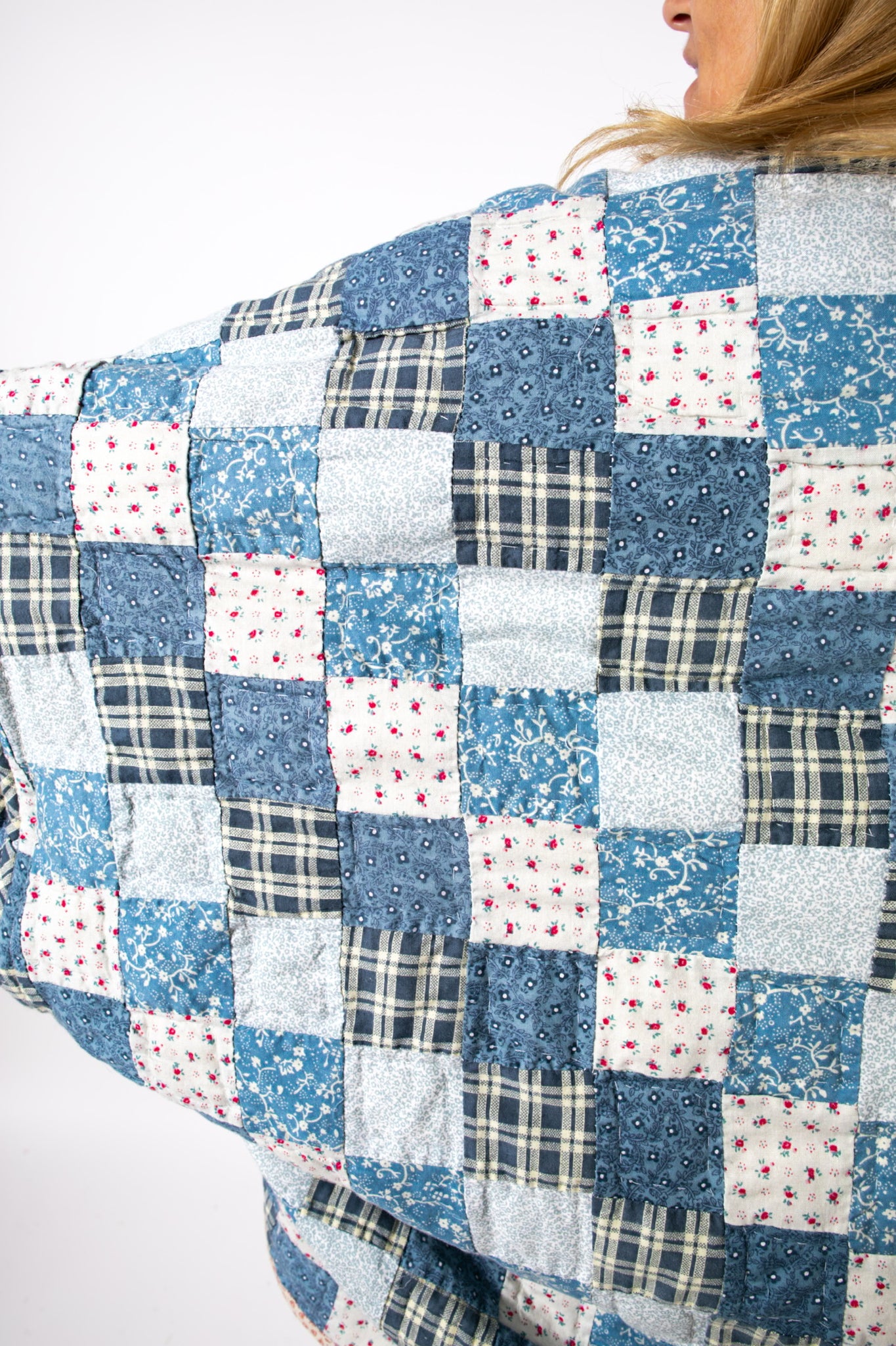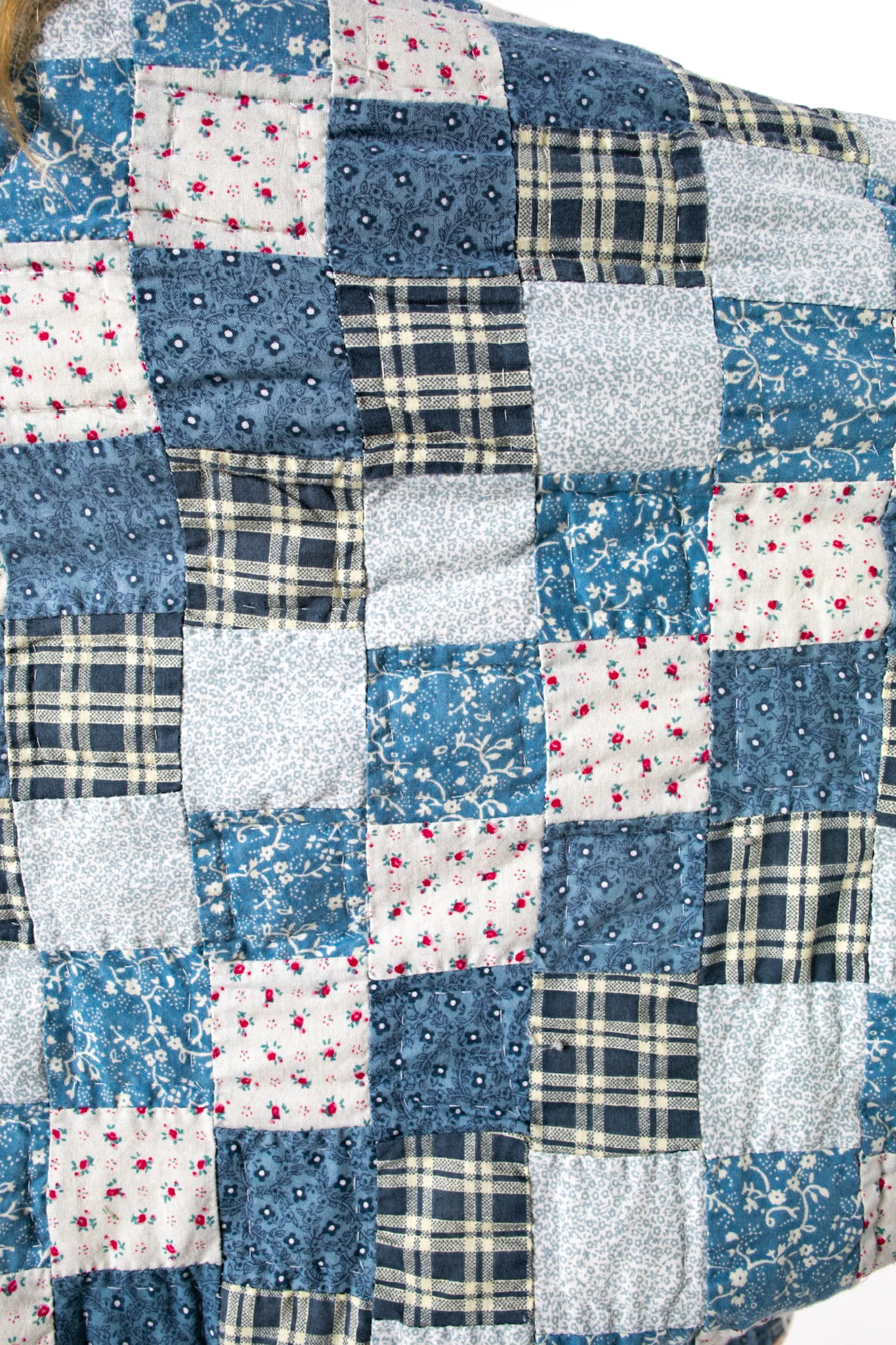 This is a vintage American quilt made circa 1980s. It is a traditional Trip Around the World quilt pattern. The quilt has been hand sewn and hand quilted, which is a labor of love and a lost art. In our opinion, the jacket is very thin, very lightweight, is extremely soft, and has an excellent drape. We love the neutral blue vibes. You will want to replace your jean jacket with this piece! If you have further questions, please direct message us and we are happy to send you a video.