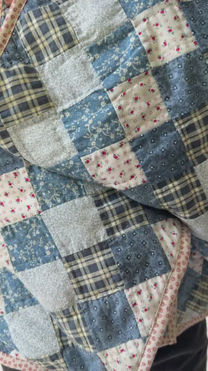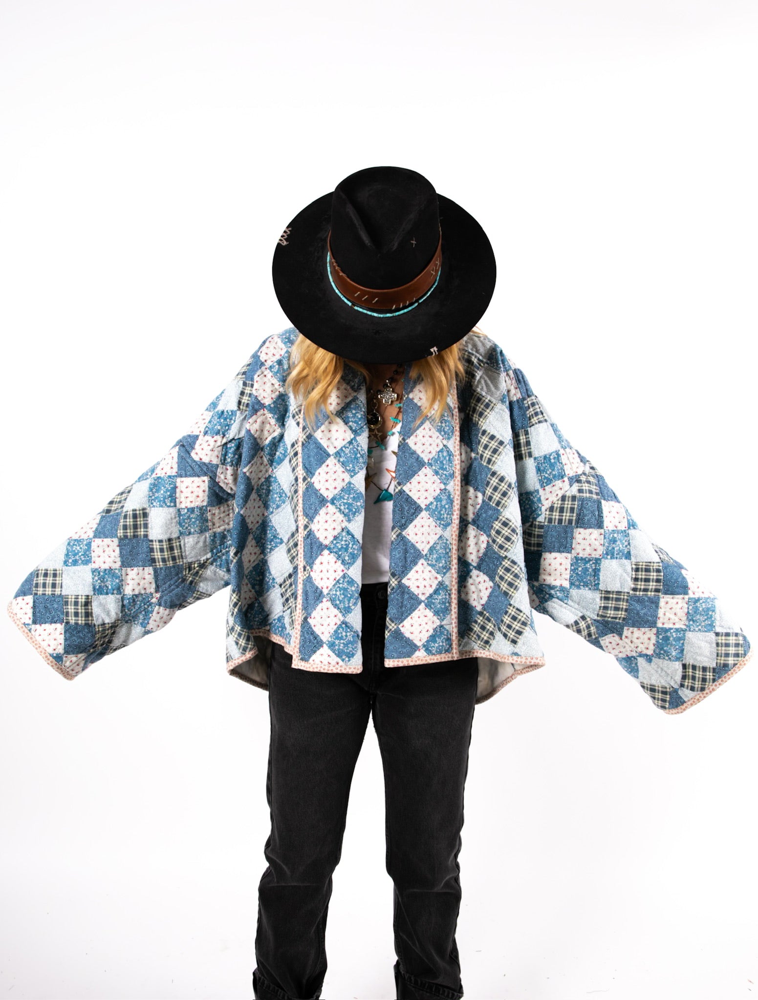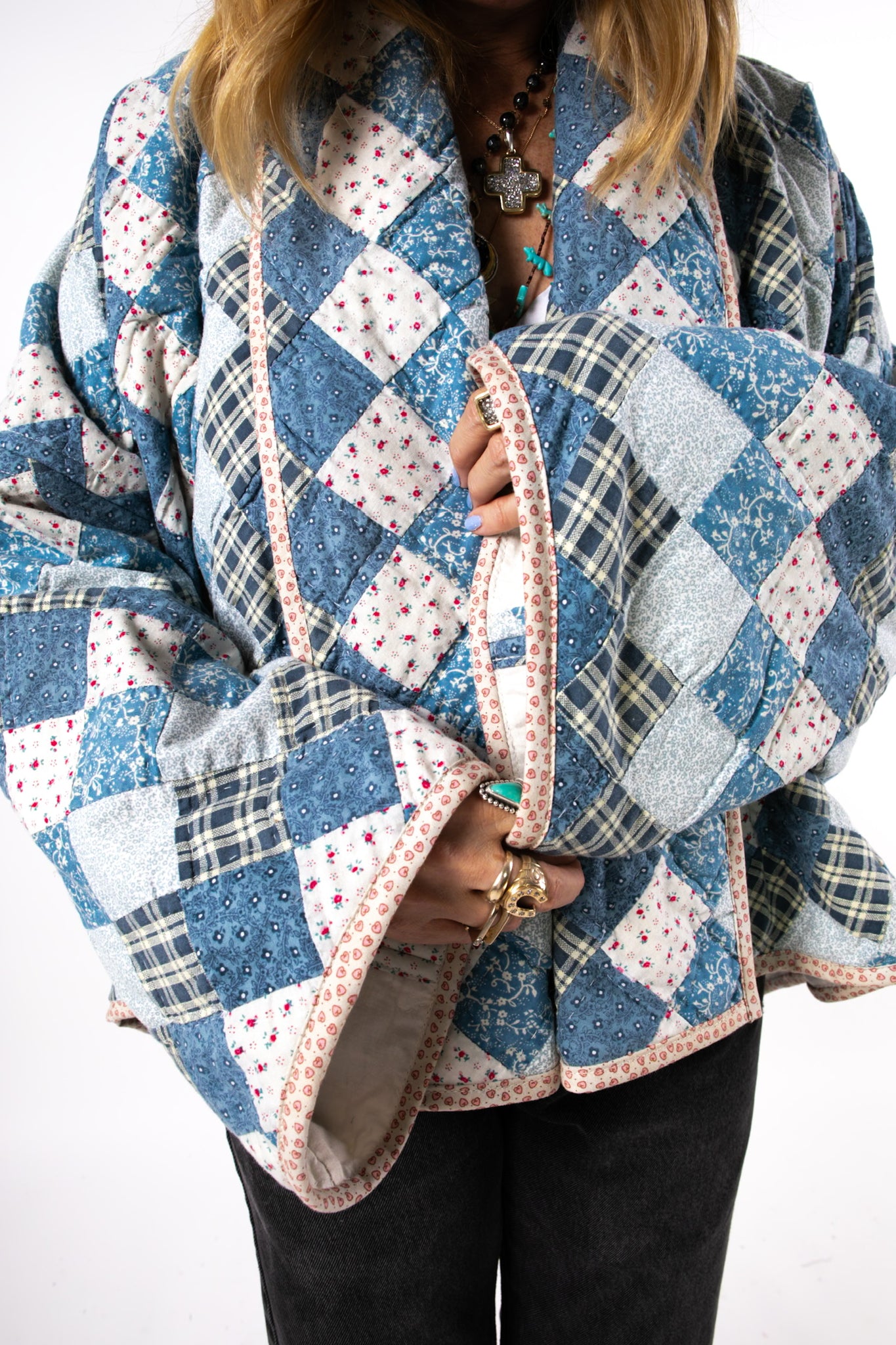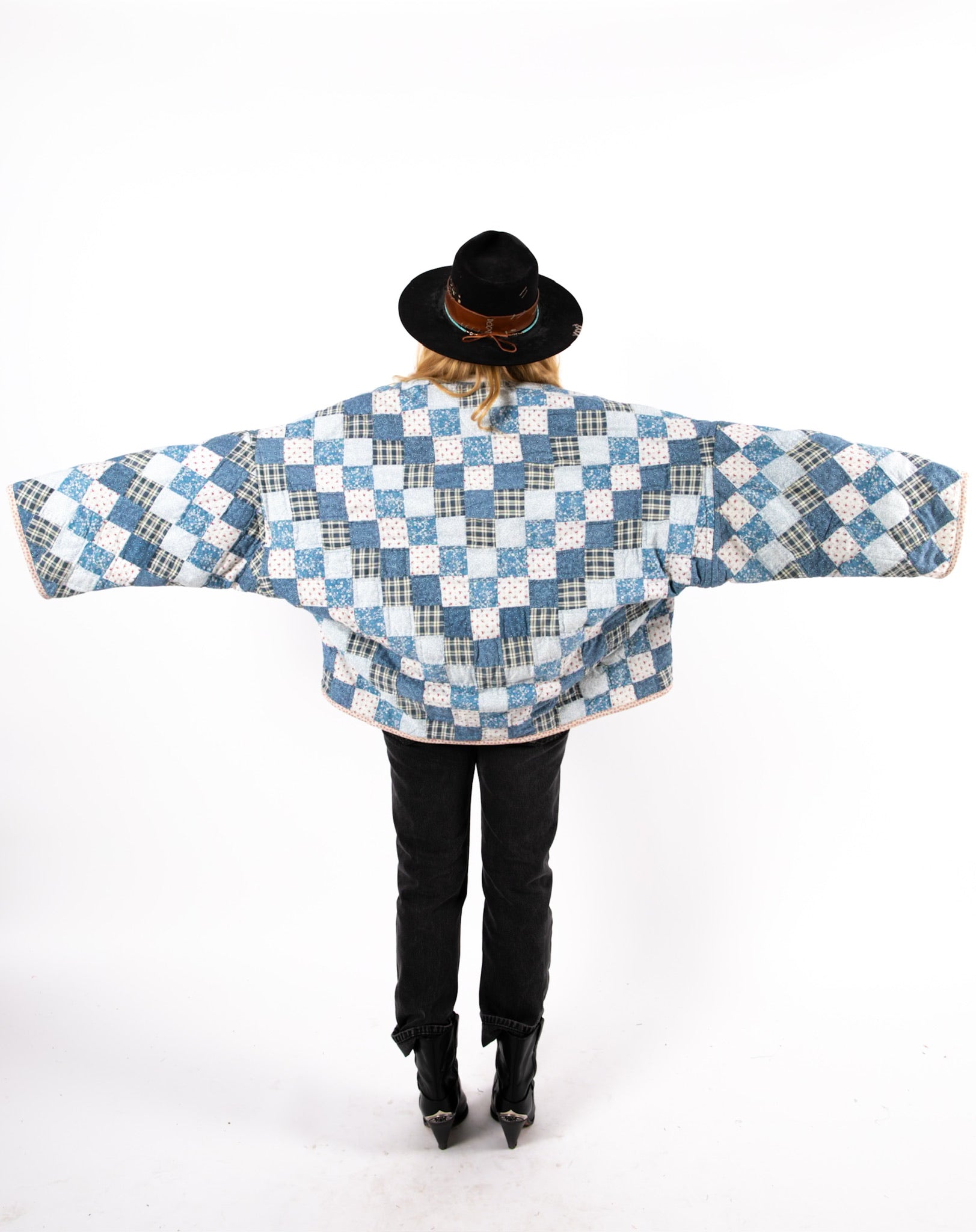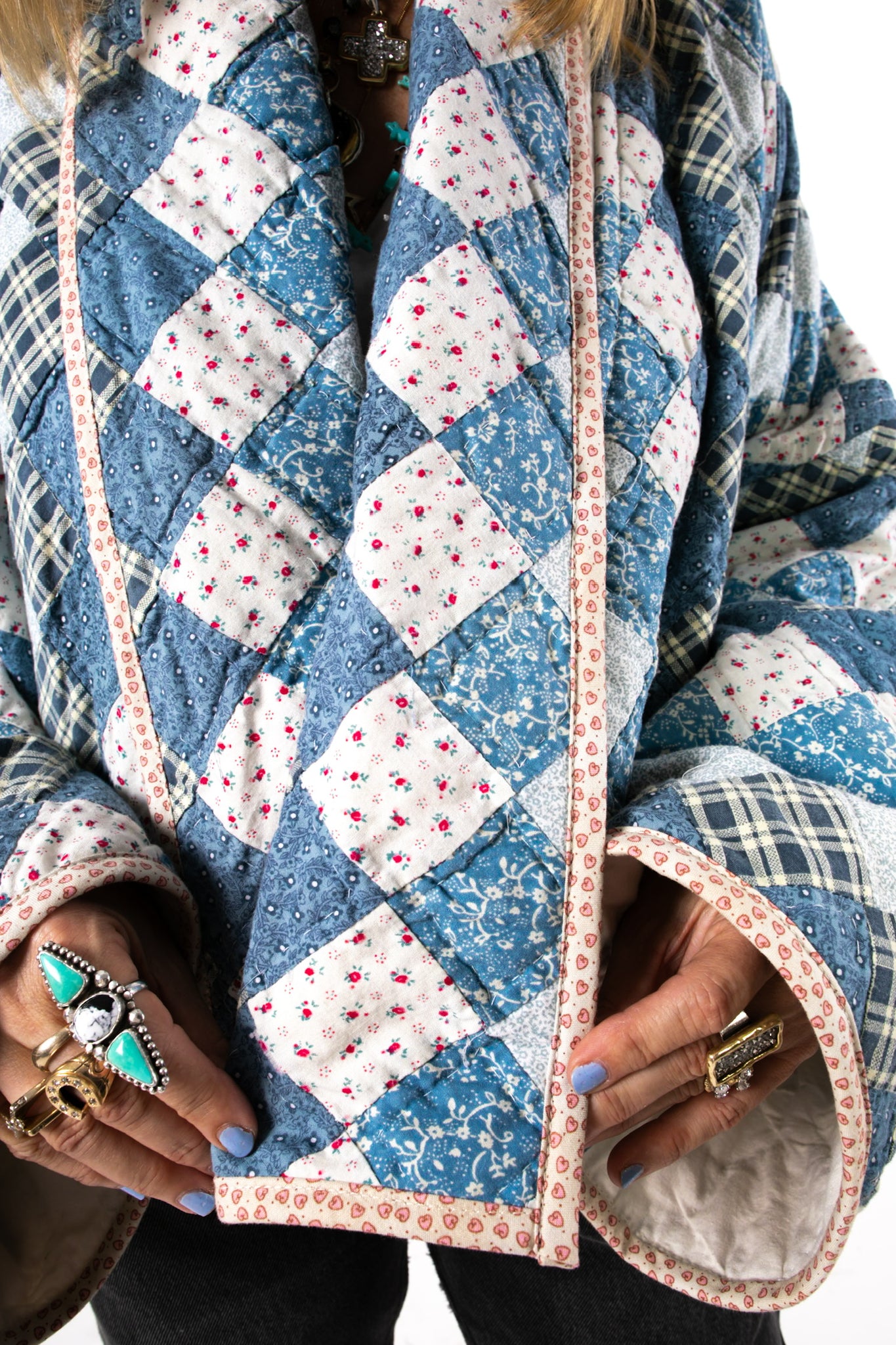 This is a vintage American quilt made circa 1980s. It is a traditional Trip Around the World quilt pattern. The quilt has been hand sewn and hand quilted, which is a labor of love and a lost art. In our opinion, the jacket is very thin, very lightweight, is extremely soft, and has an excellent drape. We love the neutral blue vibes. You will want to replace your jean jacket with this piece! If you have further questions, please direct message us and we are happy to send you a video.