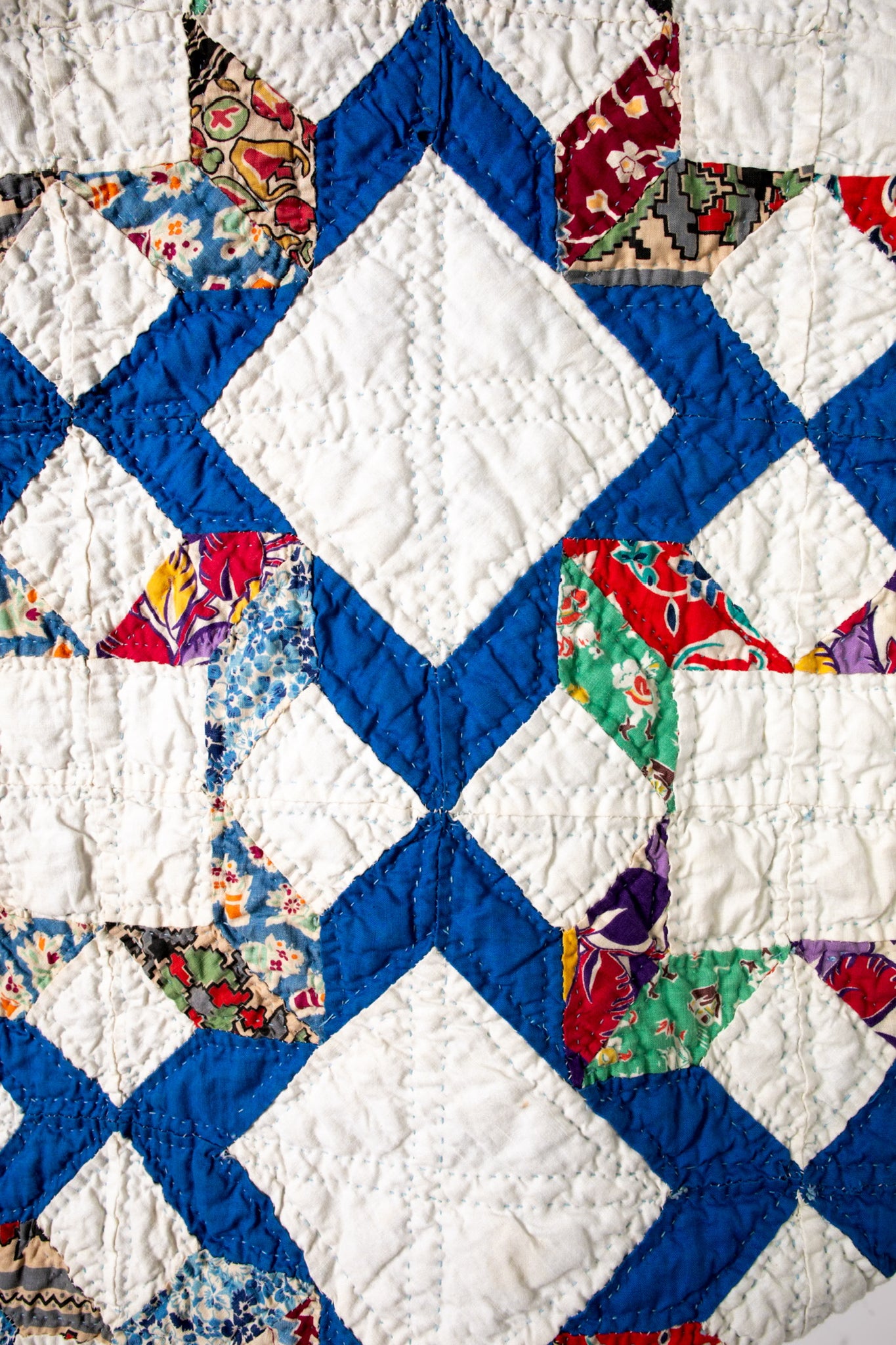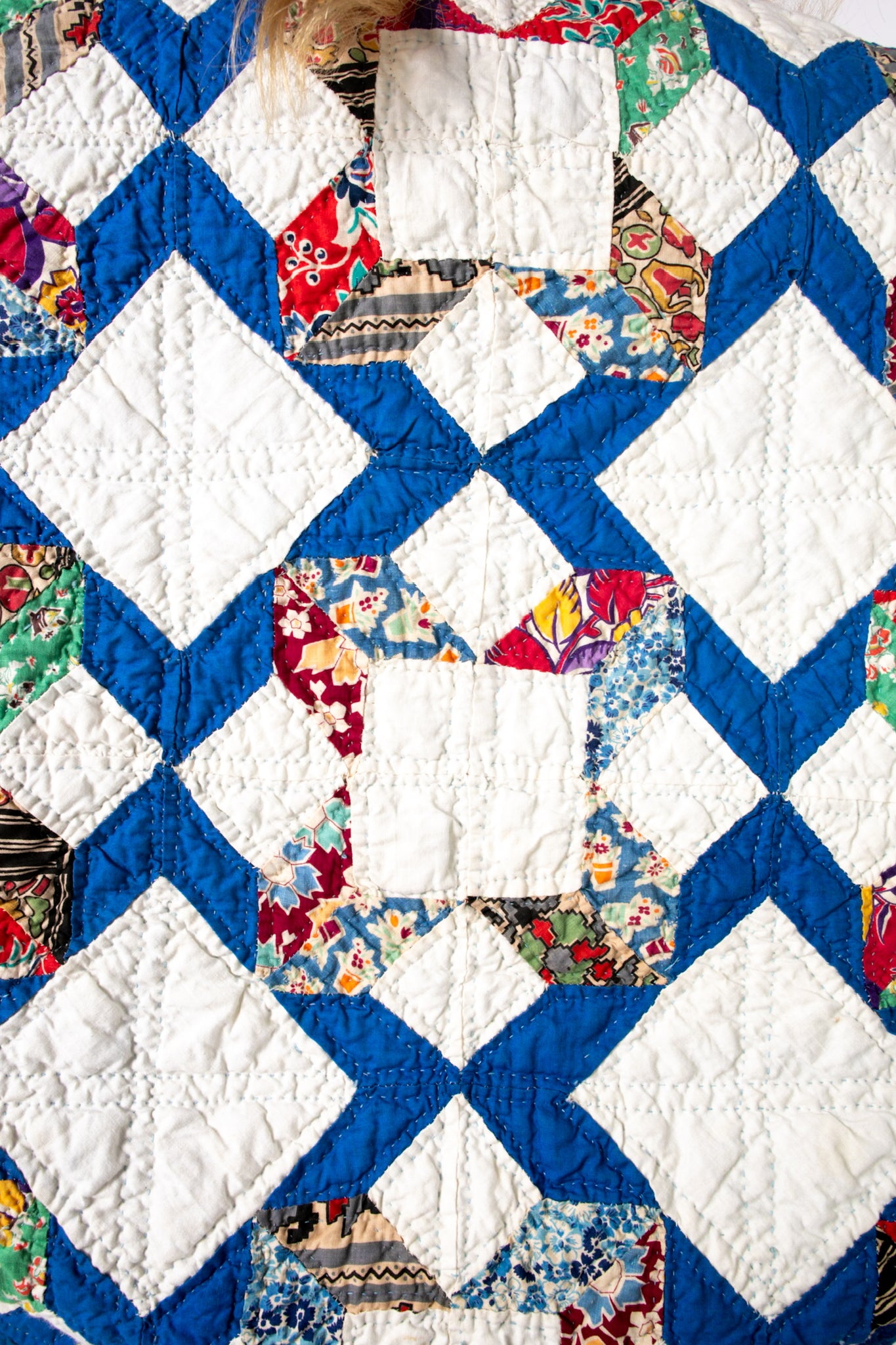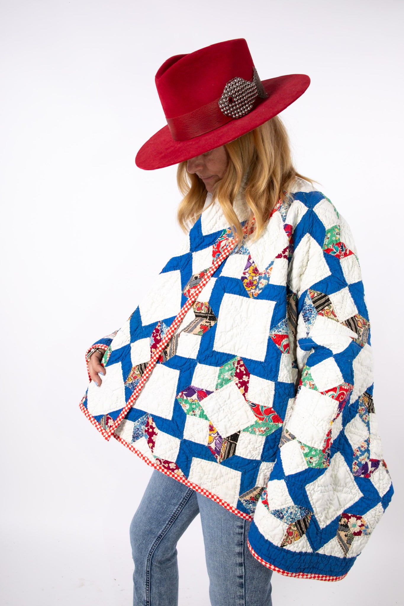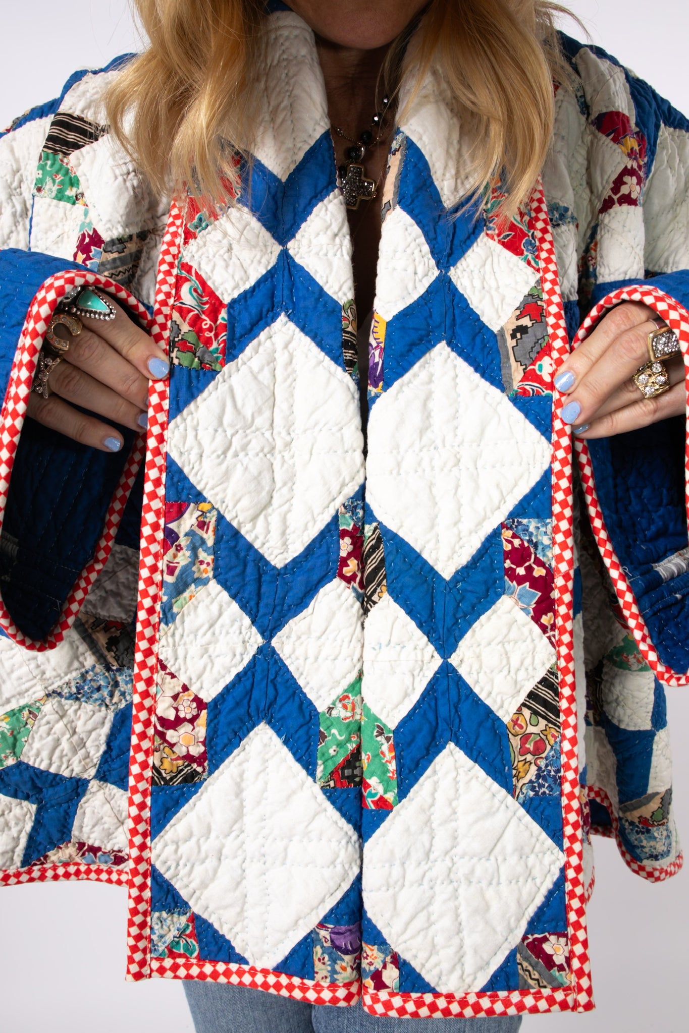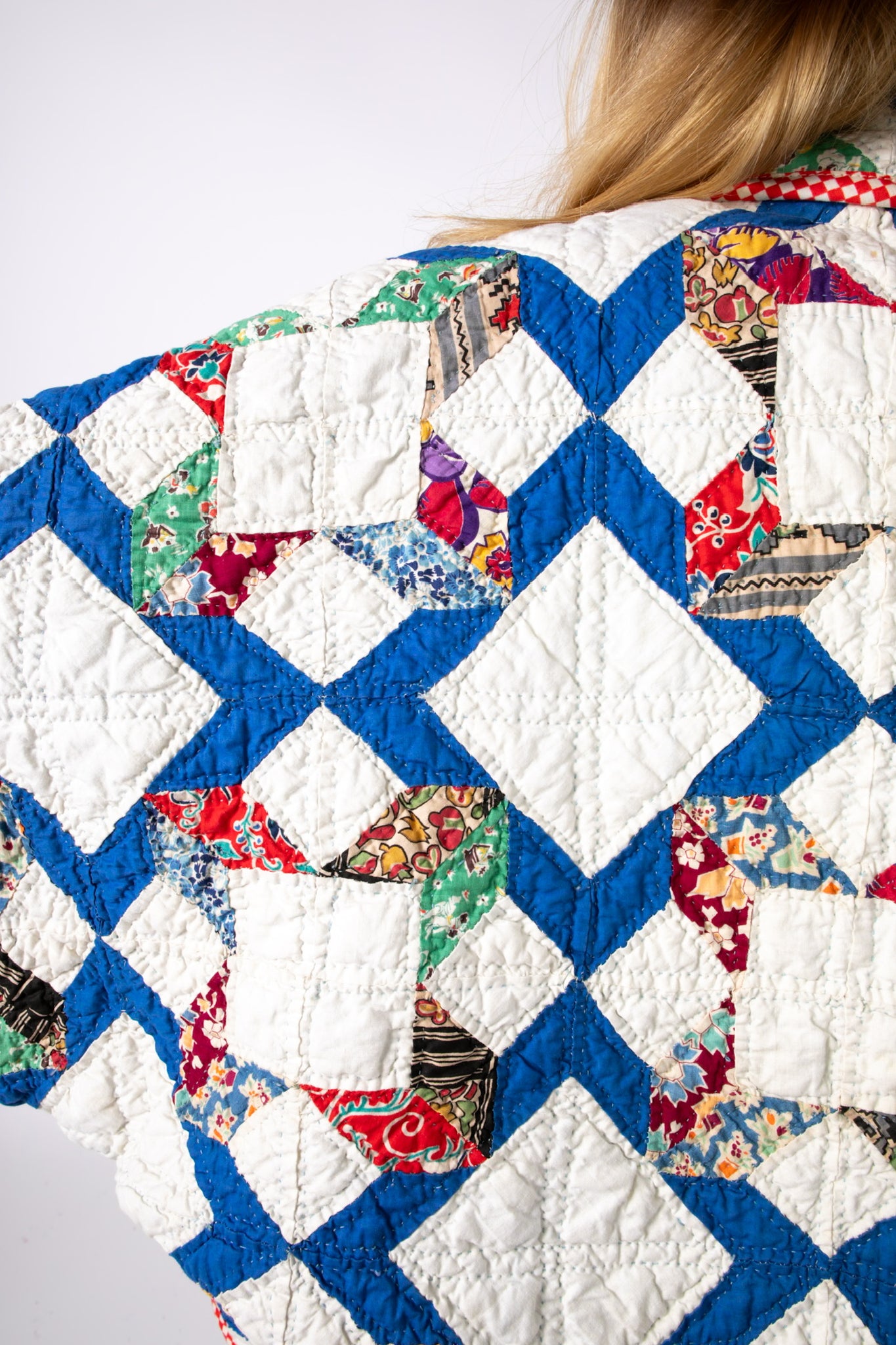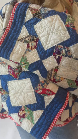 This is an antique American quilt pattern made circa 1930s to 1940s. It is a traditional A Beauty quilt pattern. It is a rare pattern and we absolutely love it! The maker beautifully hand quilted in a contrasting thread and hand sewed this piece. It contains lots of feed-sack fabrics. We love the solid royal blue fabric on the back of the quilt (inside of jacket), this makes the jacket a great candidate to be worn inside out and upside down. Please see photos of our favorite styling options. In our opinion, the jacket is thin, lightweight, and has a great drape. This is a Lady Lancaster 10/10. Please note there are a few small and faint age spots on the inside of the jacket that do no bleed to the outside of the jacket. If you have further questions, please direct message us and we are happy to send you a video.