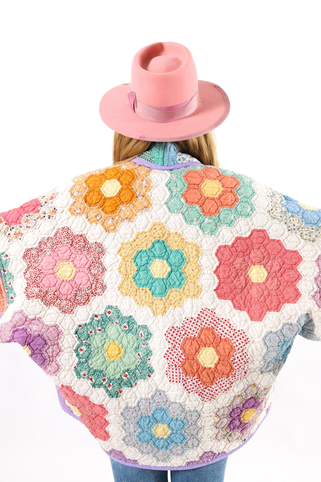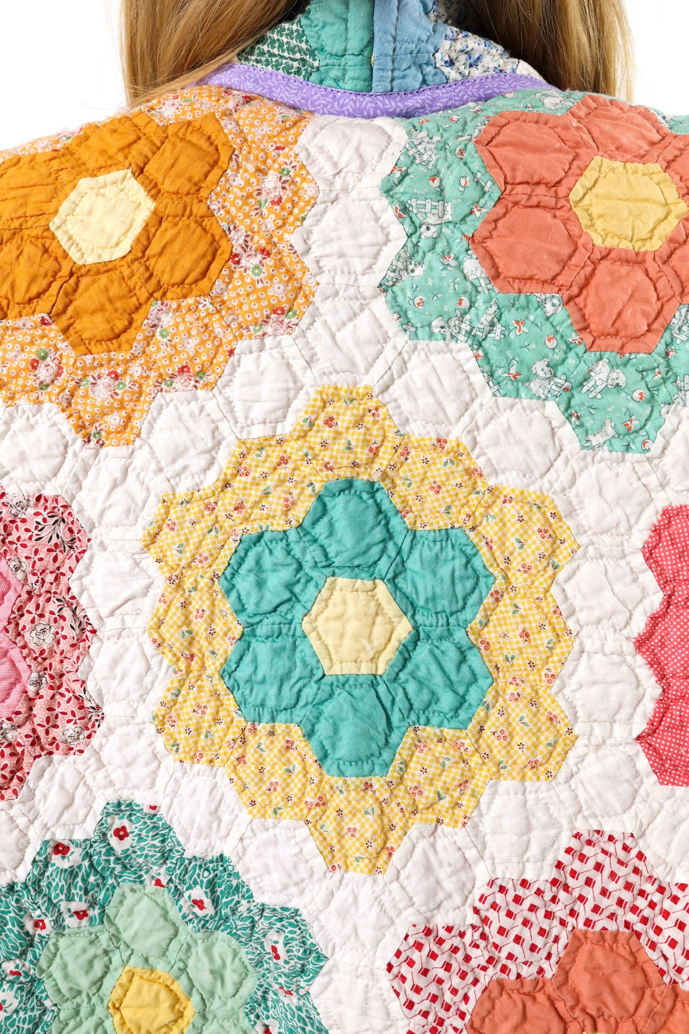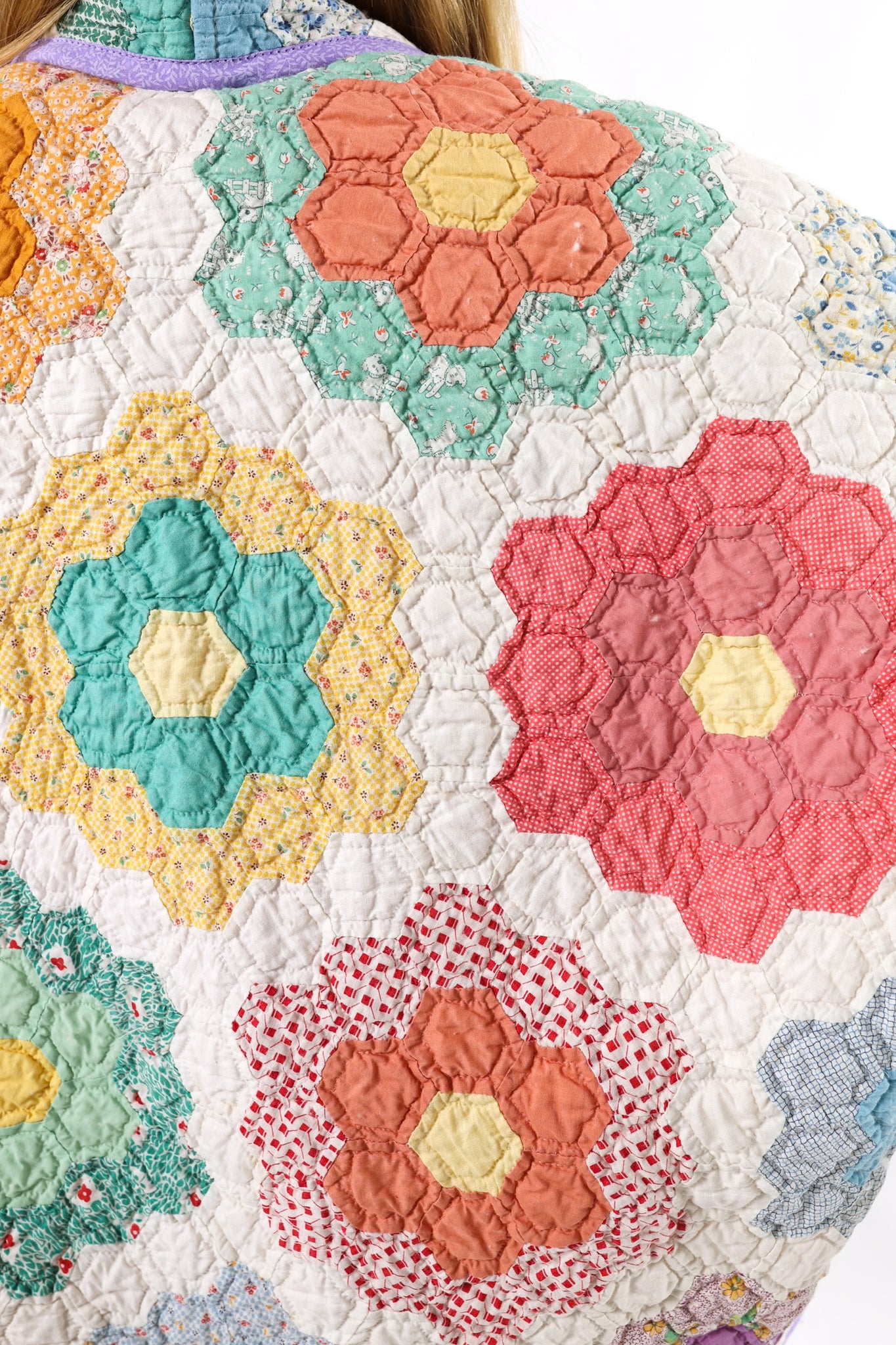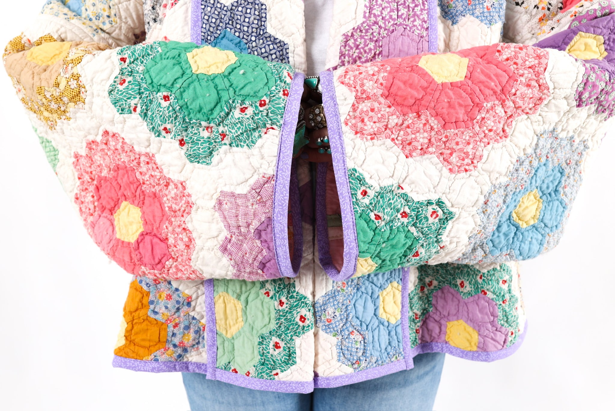 This is an antique American quilt made 1930s to 1940s. It is a traditional Grandma’s Garden quilt pattern. The quilt has been beautifully hand quilted and hand sewn. This piece was made by a master. We love the contrasting pink backing fabric on the inside of the jacket. This makes the jacket completely reversible. This piece looks great styled inside out and upside down. In our opinion, the jacket is thin, lightweight, soft and extremely comfortable to wear. It is in excellent condition except for pilling throughout. We were unable to capture the pilling in high resolution photos, but we were able to capture in the video included. The price reflects this. If you have further questions, please direct message us and we are happy to send you a video.