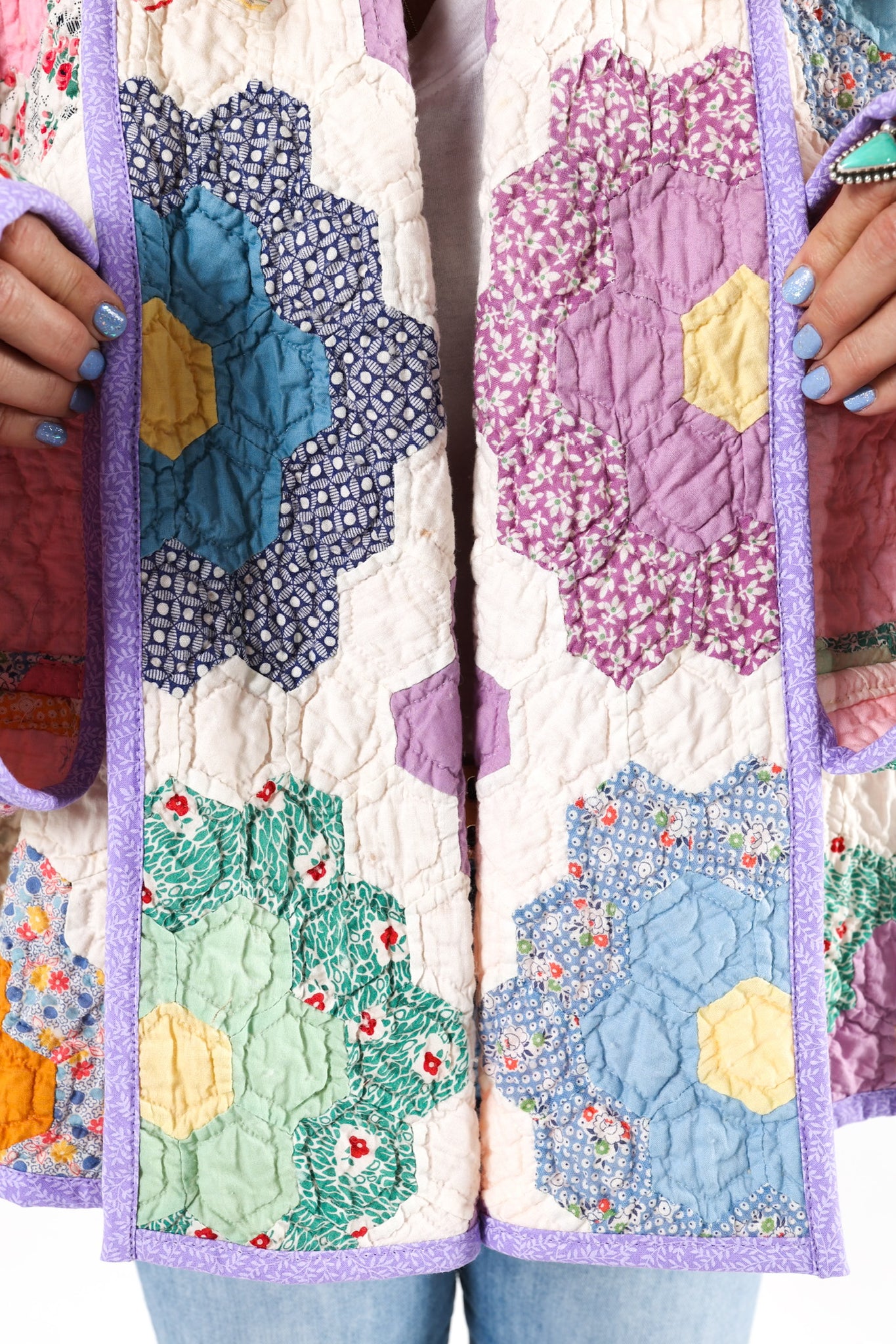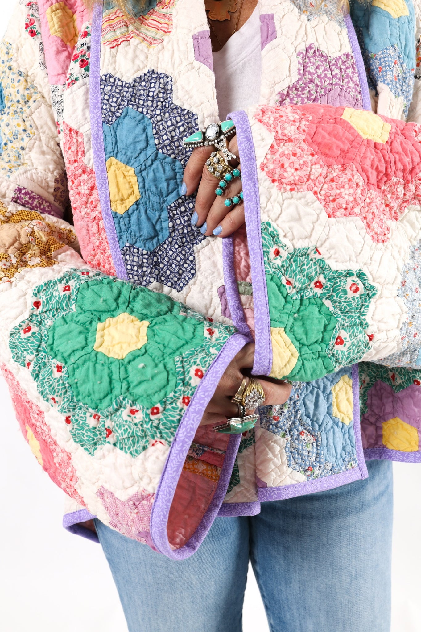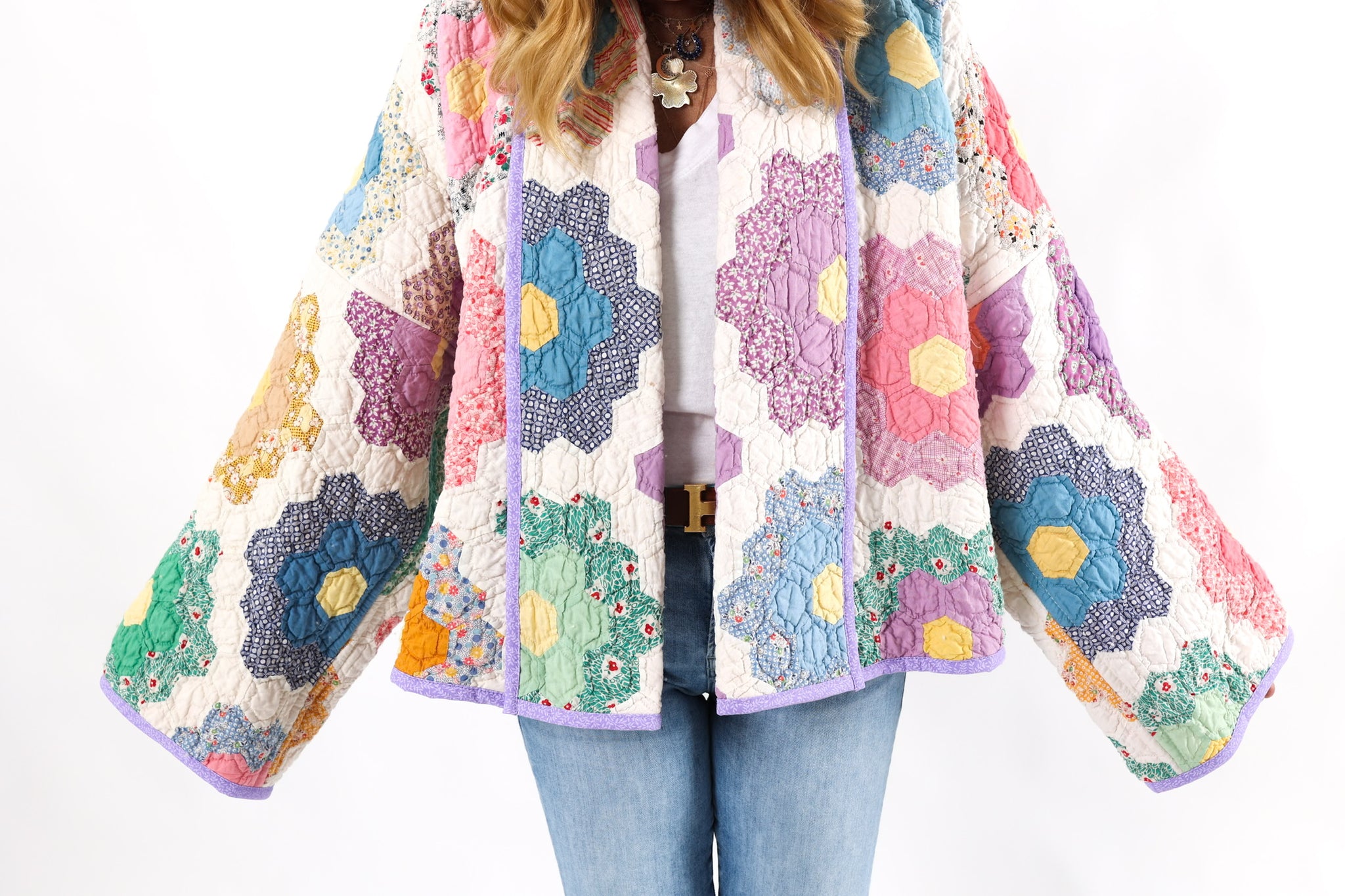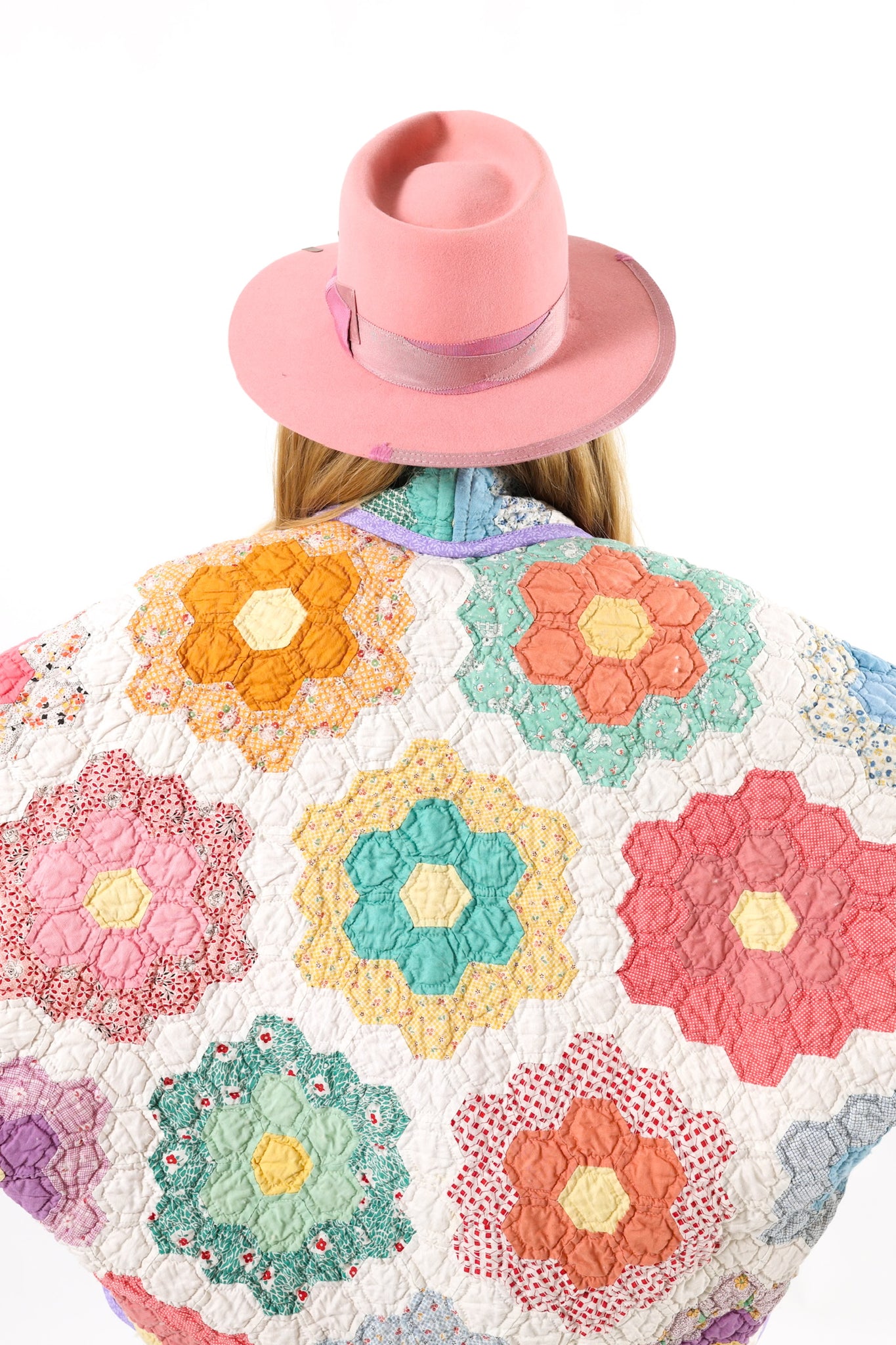 This is an antique American quilt made 1930s to 1940s. It is a traditional Grandma’s Garden quilt pattern. The quilt has been beautifully hand quilted and hand sewn. This piece was made by a master. We love the contrasting pink backing fabric on the inside of the jacket. This makes the jacket completely reversible. This piece looks great styled inside out and upside down. In our opinion, the jacket is thin, lightweight, soft and extremely comfortable to wear. It is in excellent condition except for pilling throughout. We were unable to capture the pilling in high resolution photos, but we were able to capture in the video included. The price reflects this. If you have further questions, please direct message us and we are happy to send you a video.