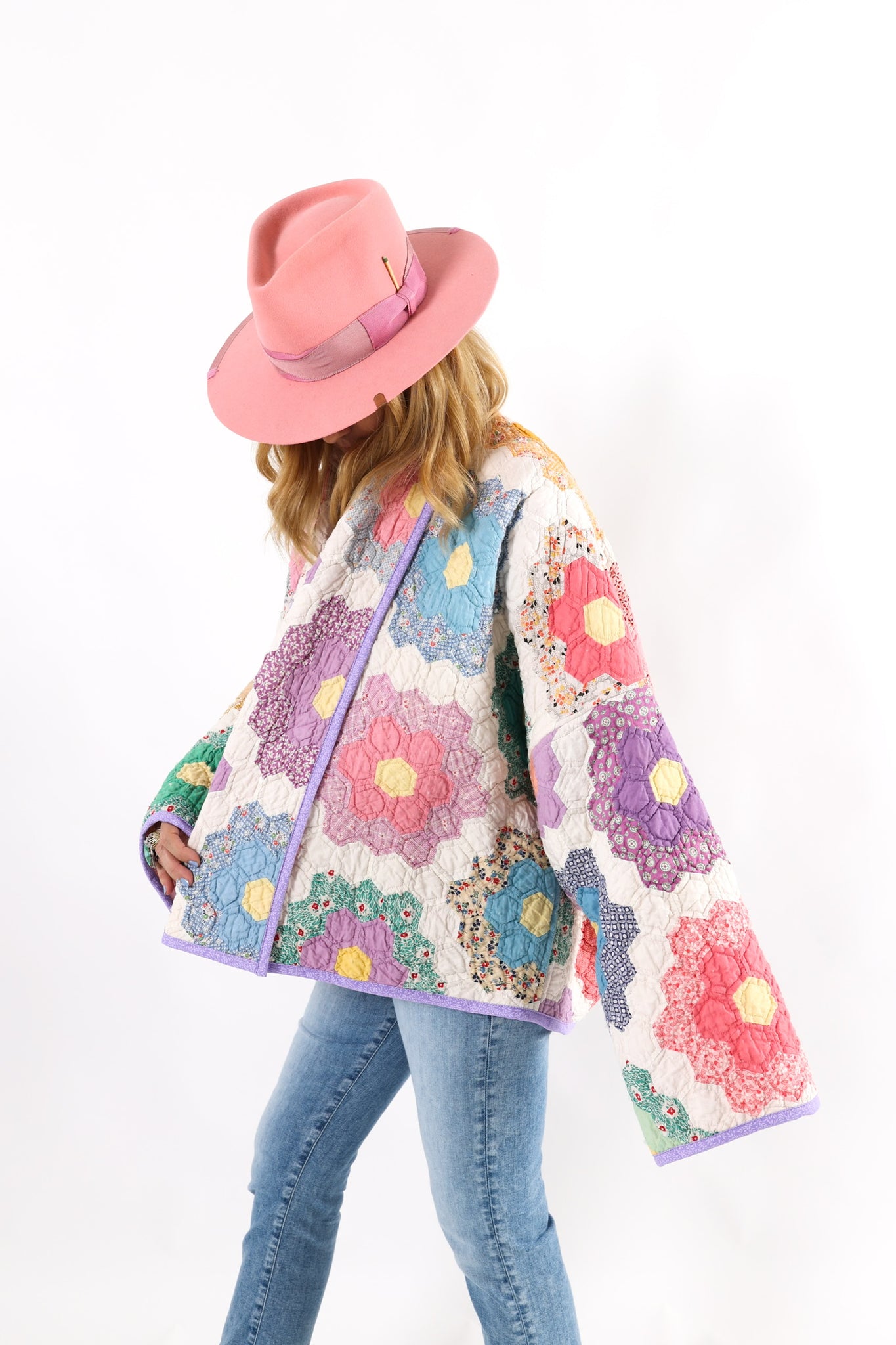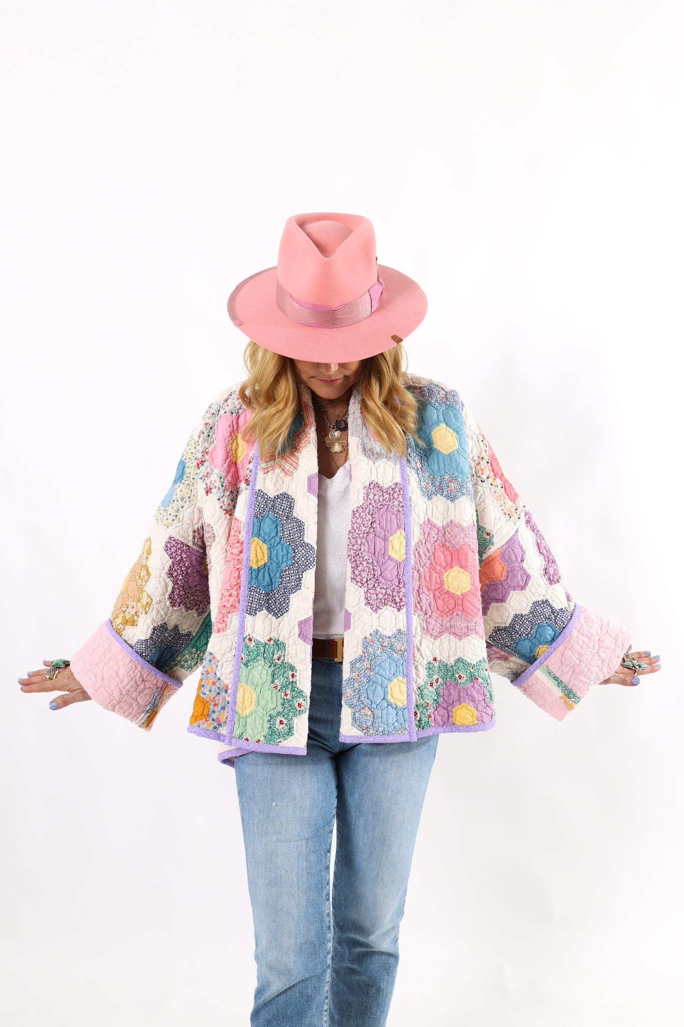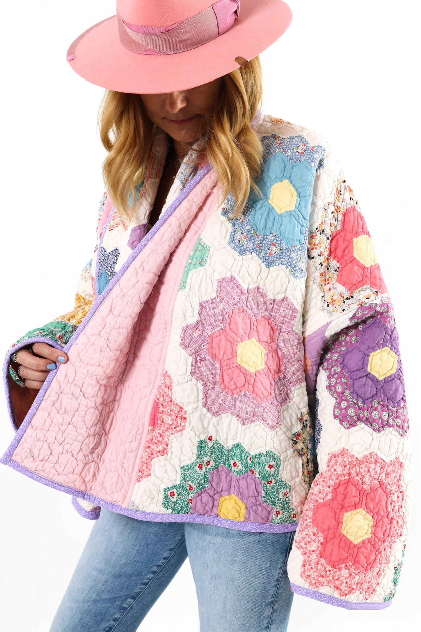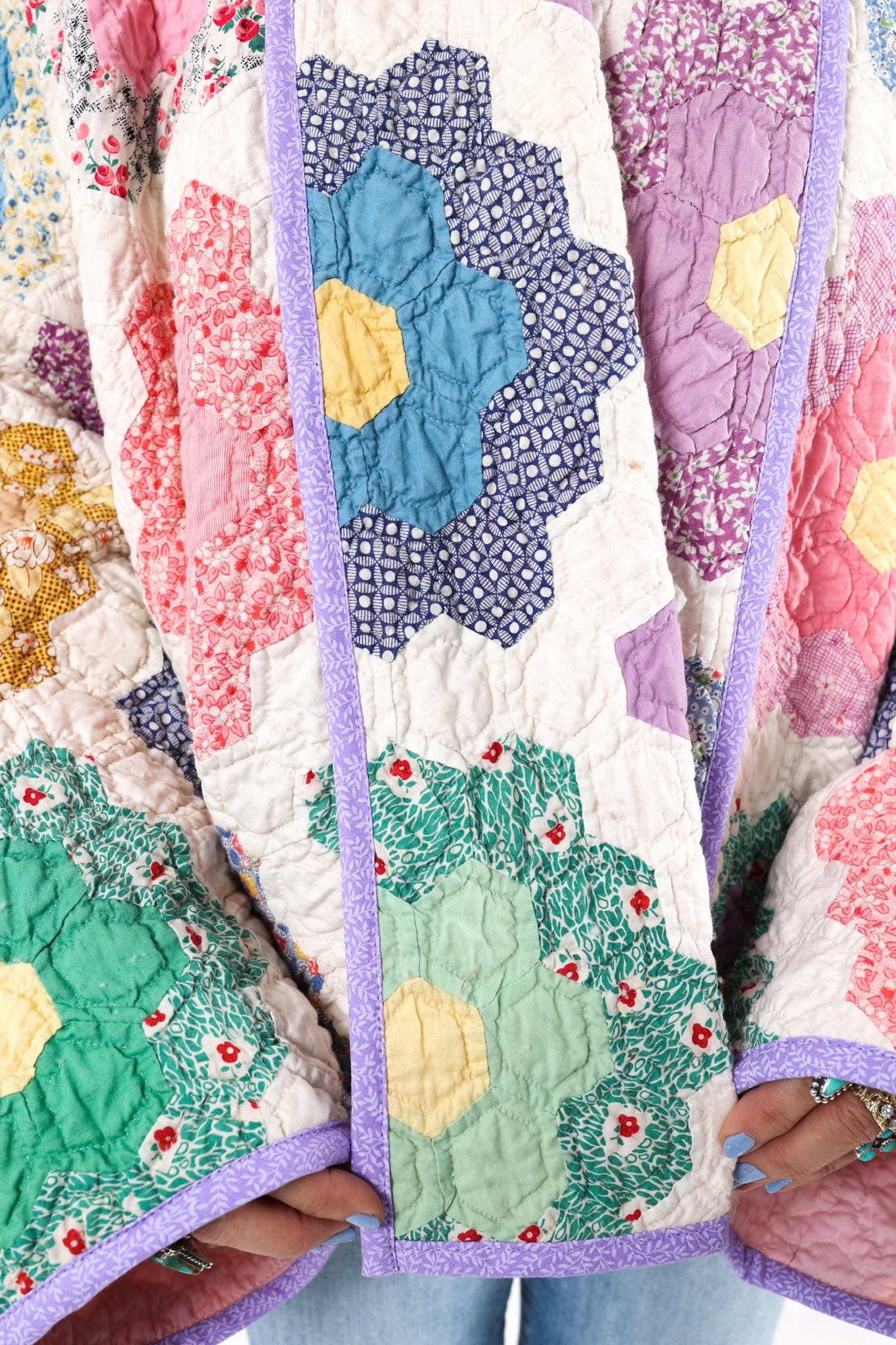 This is an antique American quilt made 1930s to 1940s. It is a traditional Grandma’s Garden quilt pattern. The quilt has been beautifully hand quilted and hand sewn. This piece was made by a master. We love the contrasting pink backing fabric on the inside of the jacket. This makes the jacket completely reversible. This piece looks great styled inside out and upside down. In our opinion, the jacket is thin, lightweight, soft and extremely comfortable to wear. It is in excellent condition except for pilling throughout. We were unable to capture the pilling in high resolution photos, but we were able to capture in the video included. The price reflects this. If you have further questions, please direct message us and we are happy to send you a video.