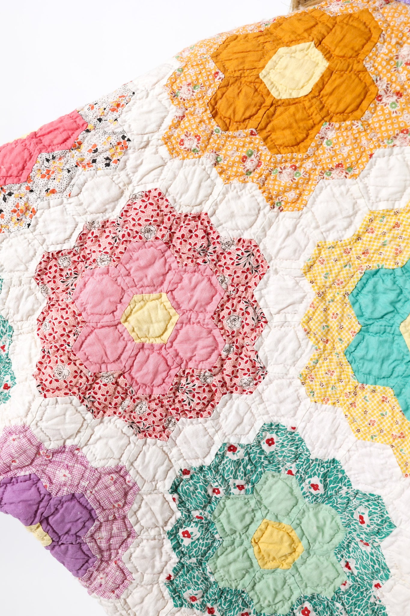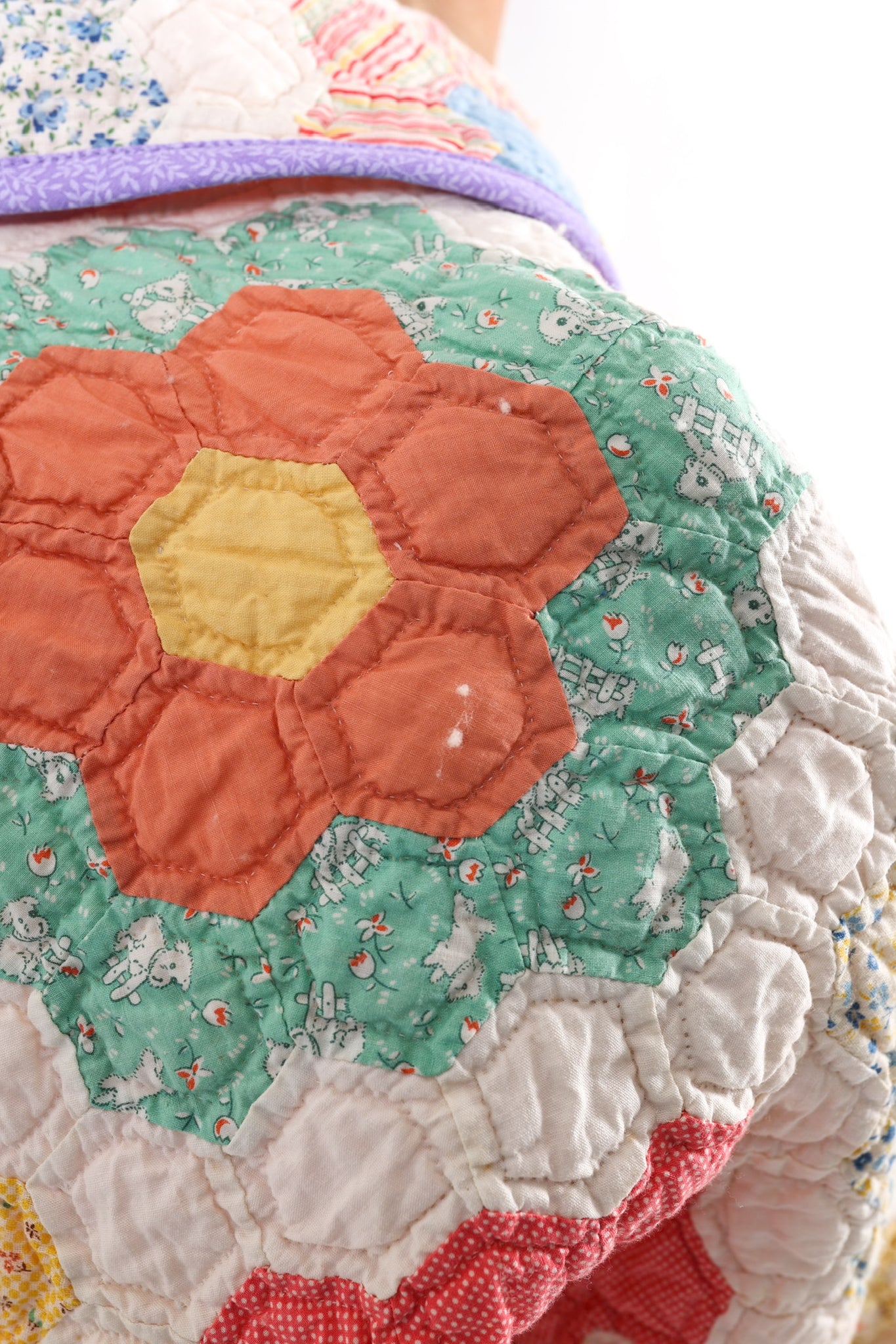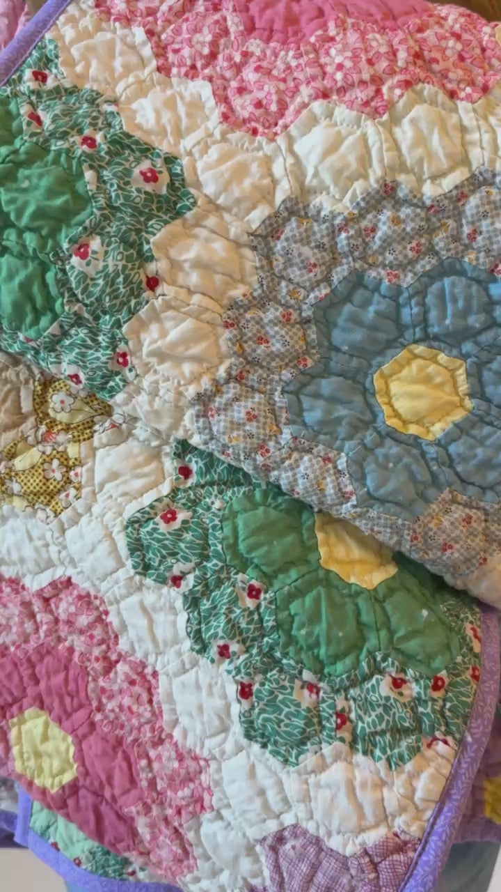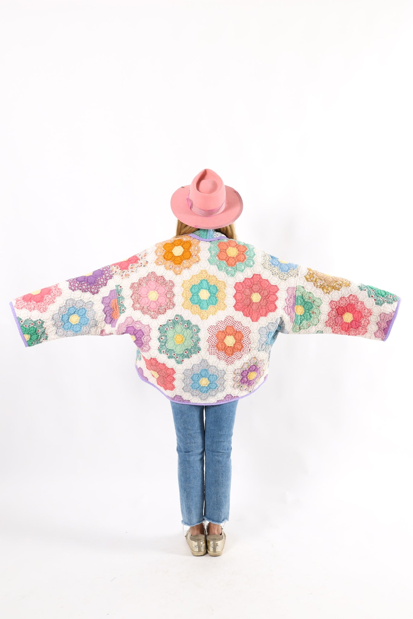 This is an antique American quilt made 1930s to 1940s. It is a traditional Grandma’s Garden quilt pattern. The quilt has been beautifully hand quilted and hand sewn. This piece was made by a master. We love the contrasting pink backing fabric on the inside of the jacket. This makes the jacket completely reversible. This piece looks great styled inside out and upside down. In our opinion, the jacket is thin, lightweight, soft and extremely comfortable to wear. It is in excellent condition except for pilling throughout. We were unable to capture the pilling in high resolution photos, but we were able to capture in the video included. The price reflects this. If you have further questions, please direct message us and we are happy to send you a video.