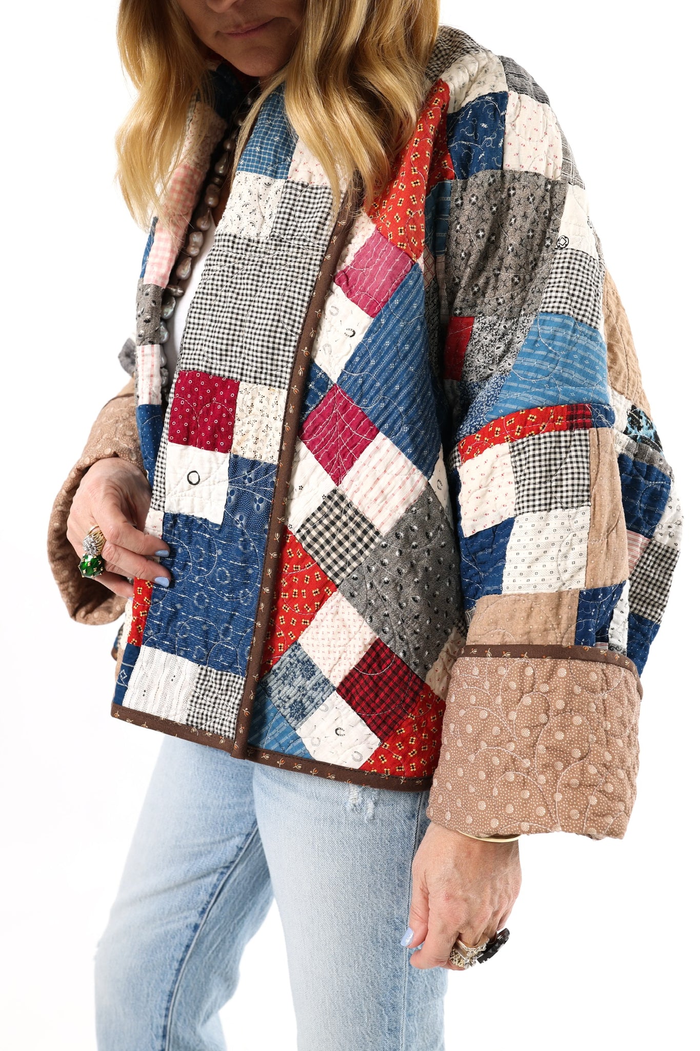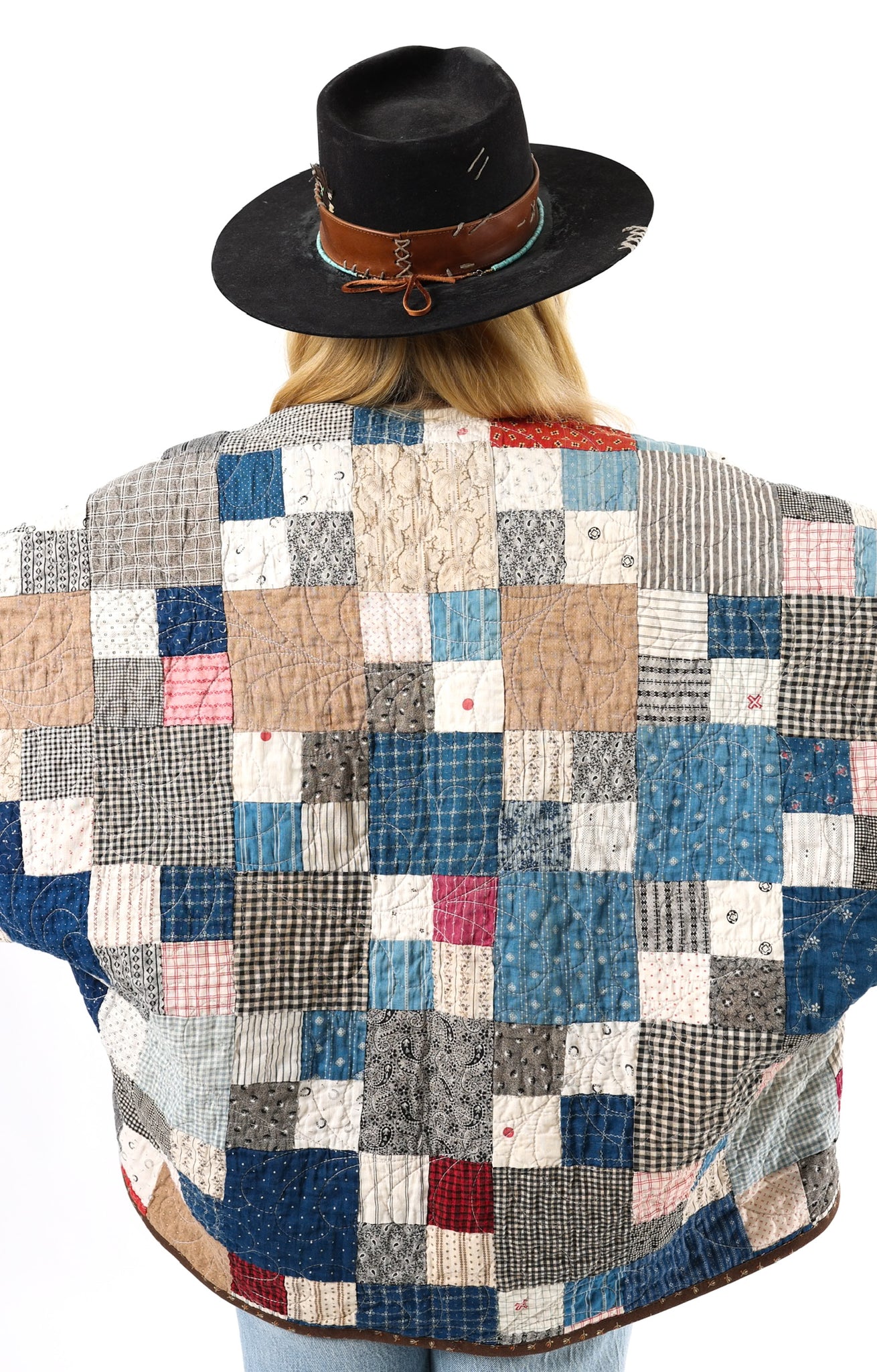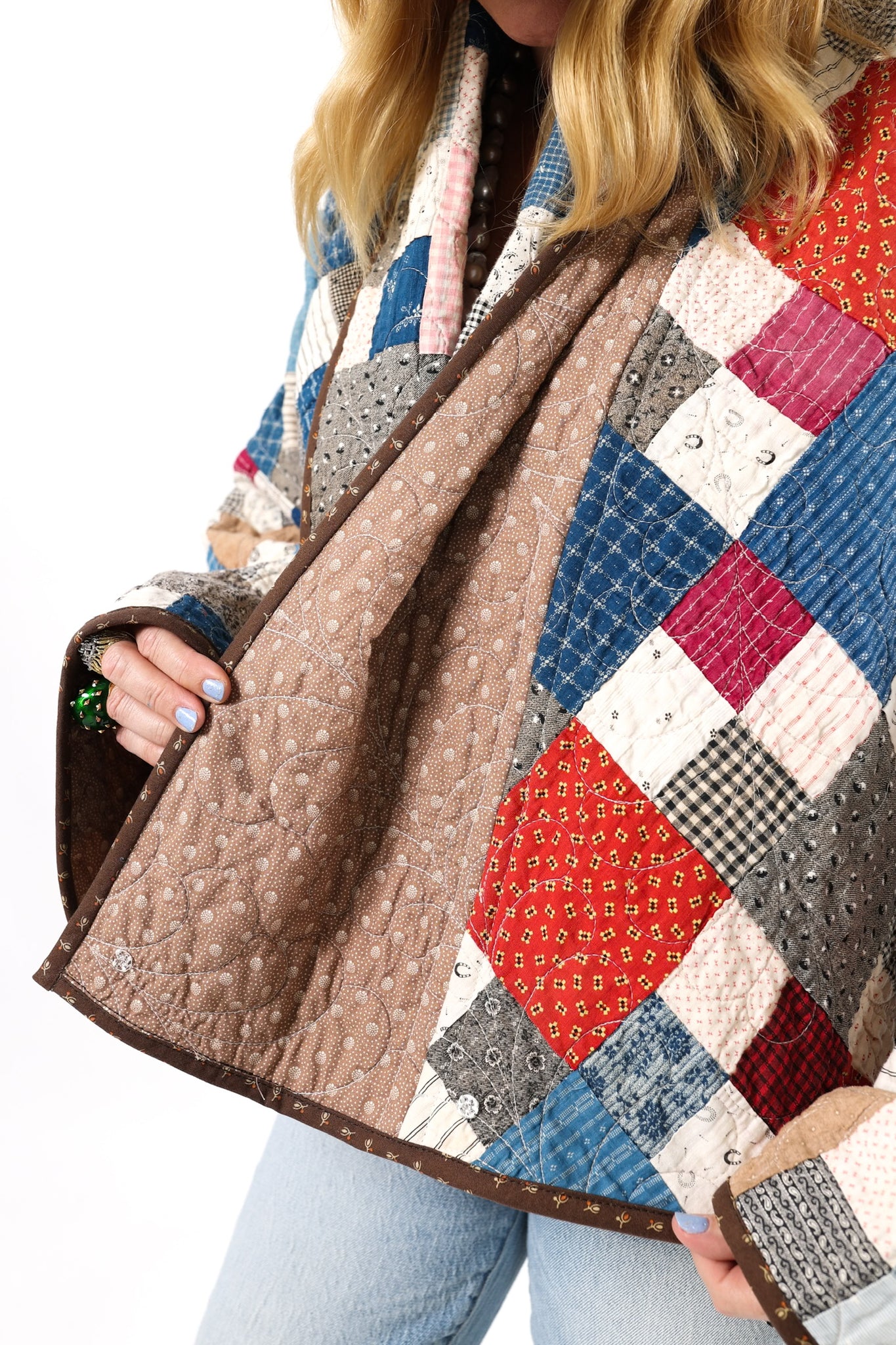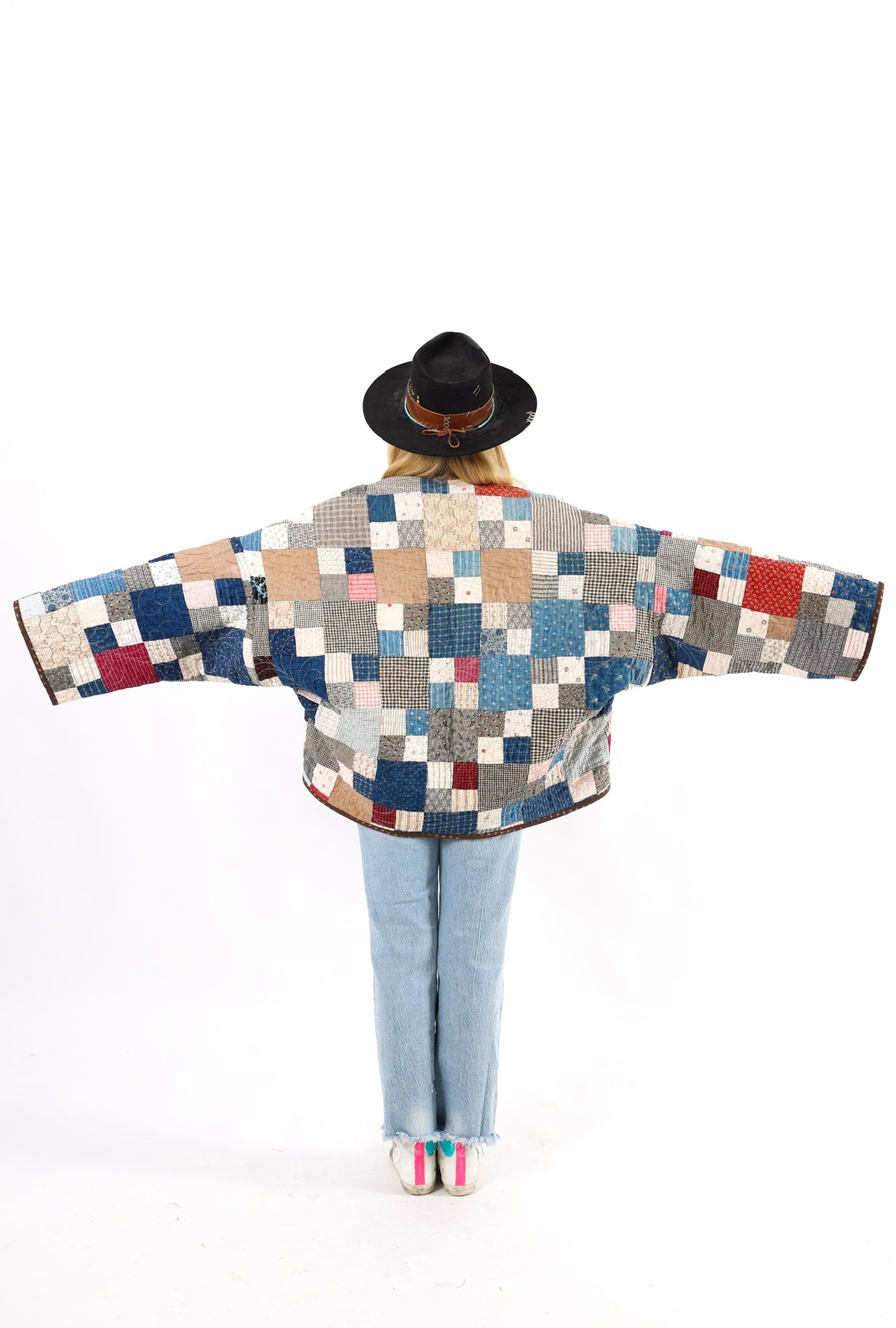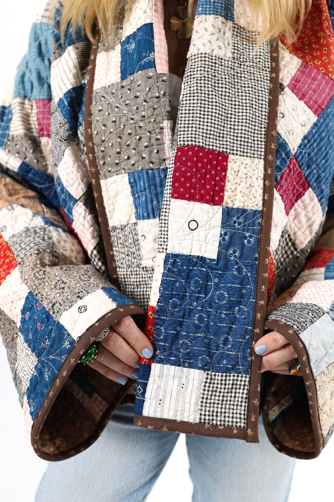 Please note that all of our jackets are made from antique quilts and the fabric reflects this. Our fabrics are sometimes older than 100 years and we believe that makes them perfectly imperfect. This is what makes them a one-of-a-kind piece of art. All of our garments are pre-washed in a special restoration quilt wash. We recommend spot cleaning if necessary.