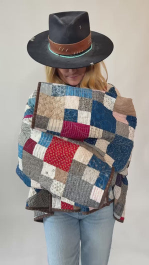 This is an antique American quilt top made circa 1890s to 1920. To complete the quilt we backed the orphaned quilt top with novelty fabric giving this quilt extra durability and new life. The quilt top has been beautifully hand sewn. It is a traditional Four Patch or Carmen's Block quilt pattern. The quilt top is loaded with rare and valuable antique indigos, men’s shirt scraps, and homespun ginghams. This jacket looks great worn inside out and upside down. It is a perfect palette for fall & winter styling. In our opinion, the jacket is thin, soft, lightweight, and has a buttery and flattering drape. If you have further questions, please direct message us and we are happy to send you a video.