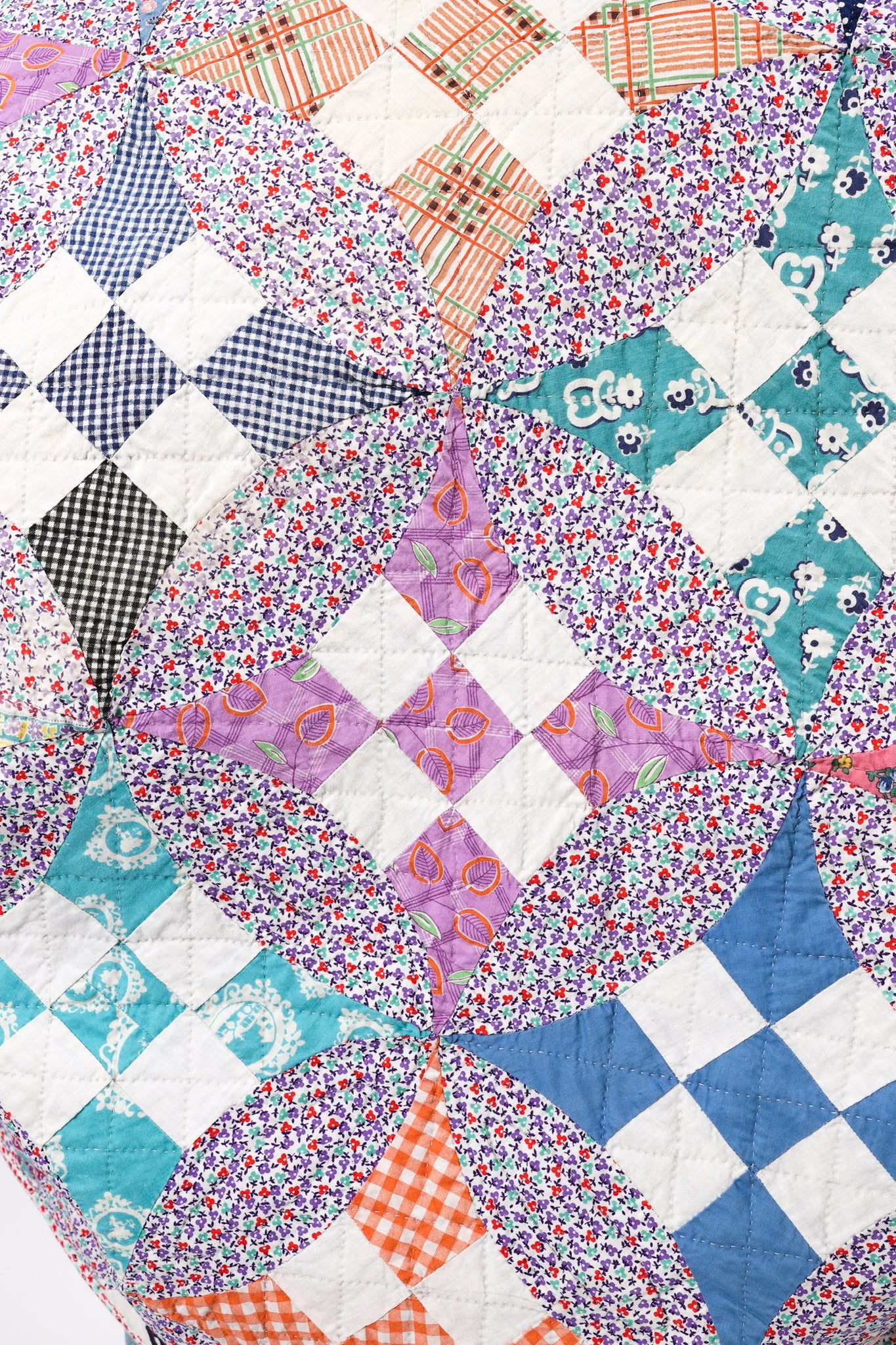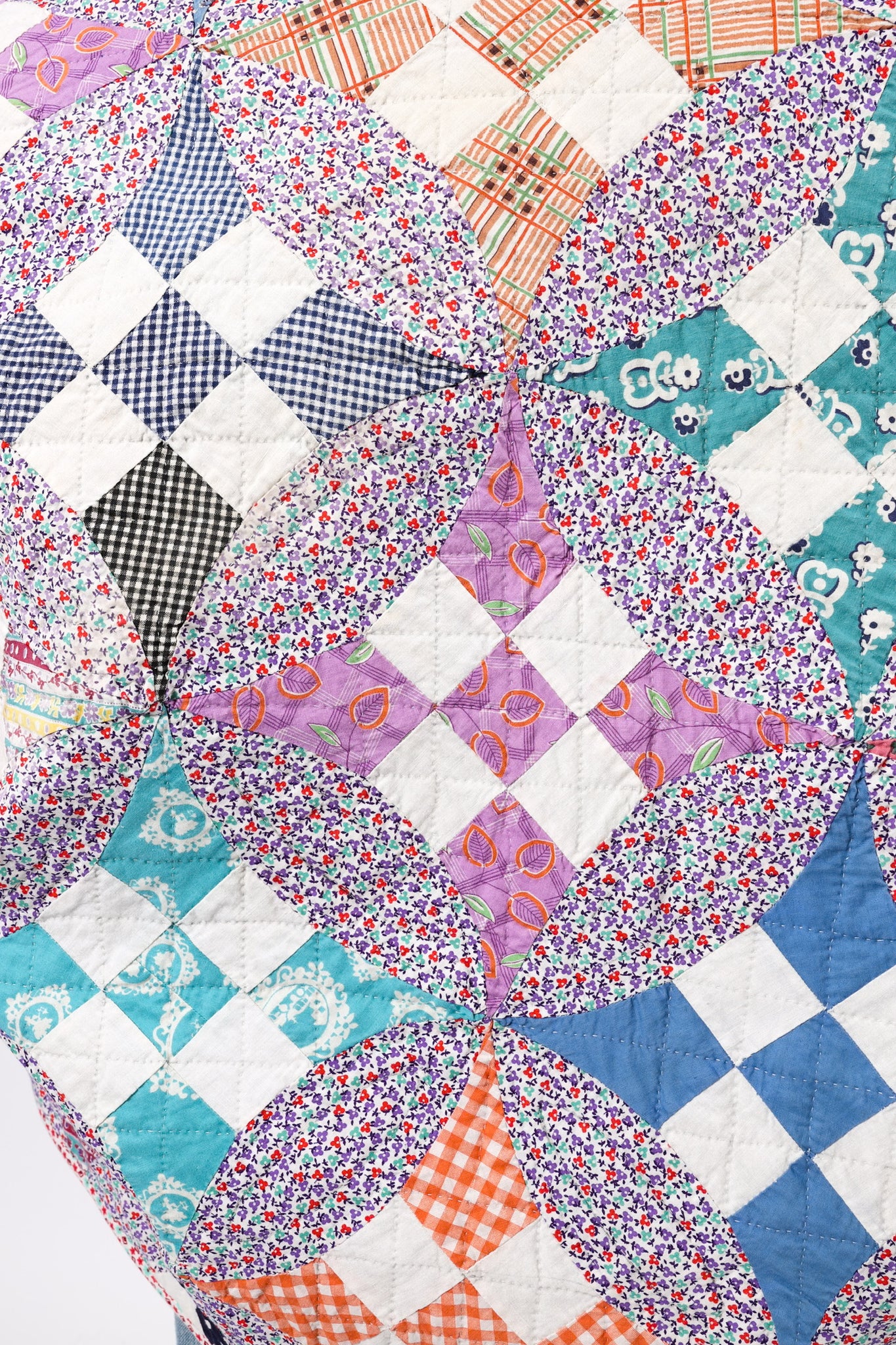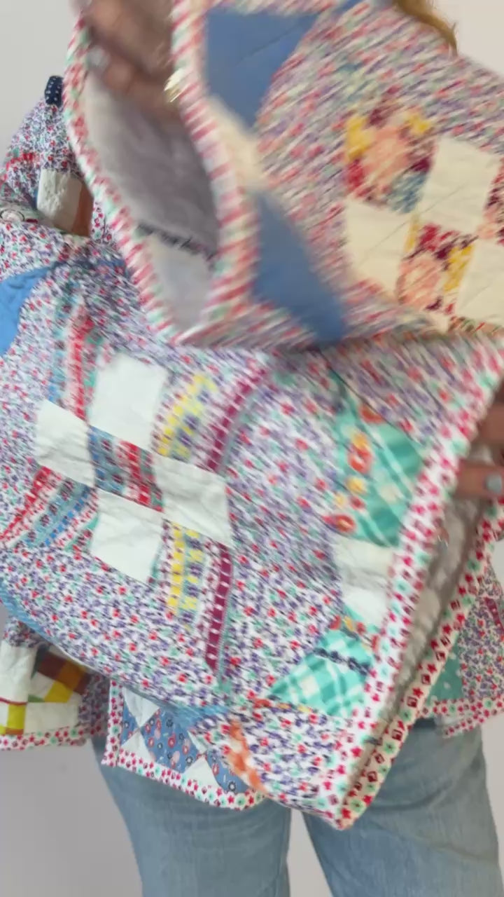 This is an antique American quilt. We believe that the quilt top was made around the 1930s to 1940s but was backed and quilted at a later time. It is a Glorified Nine Patch or Improved Nine Patch quilt pattern. The quilt has been hand quilted and hand sewn which is a labor of love and a lost art. The quilt is filled with a variety of beautiful novelty fabrics from the 1930s. In our opinion, the jacket is thin, soft, lightweight, has very little loft(puffiness), and has a great drape! Overall, the quilt is in great condition. If you have further questions, please direct message us and we are happy to send you a video.