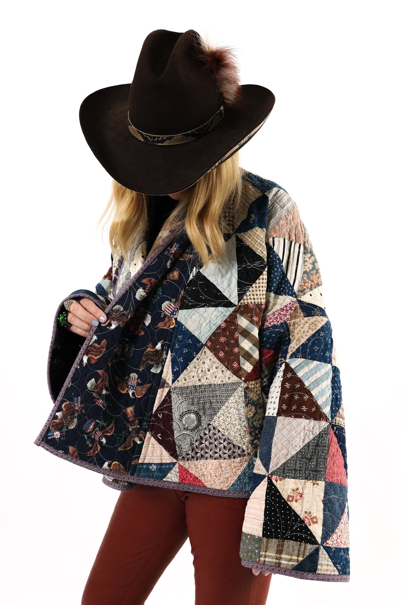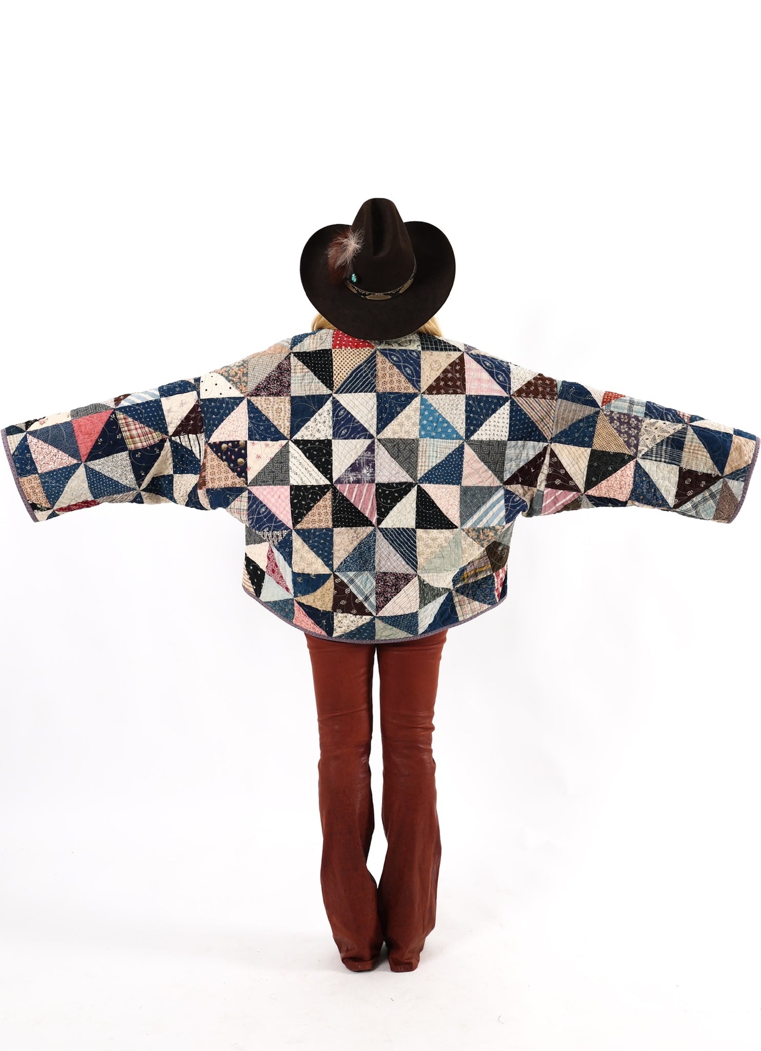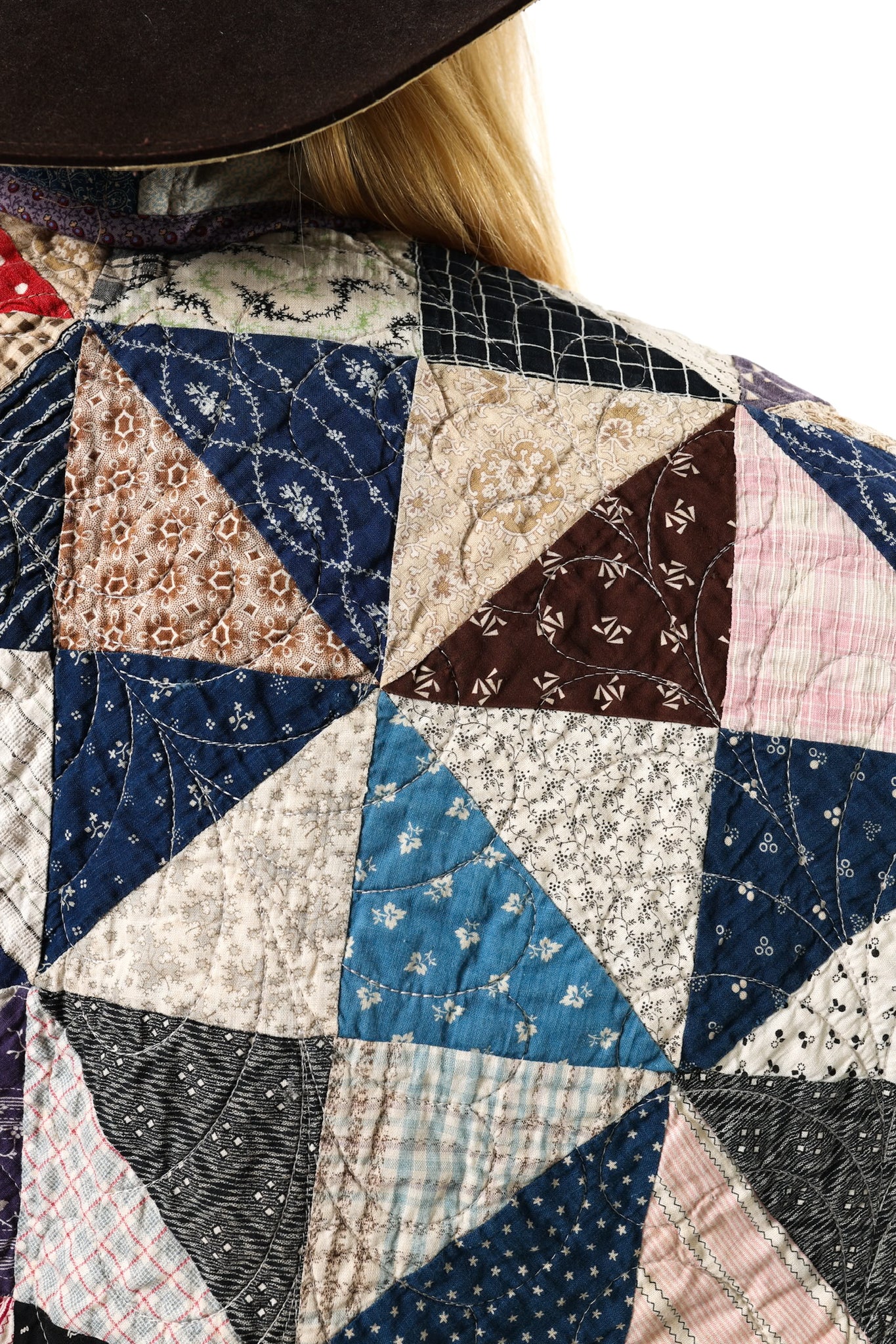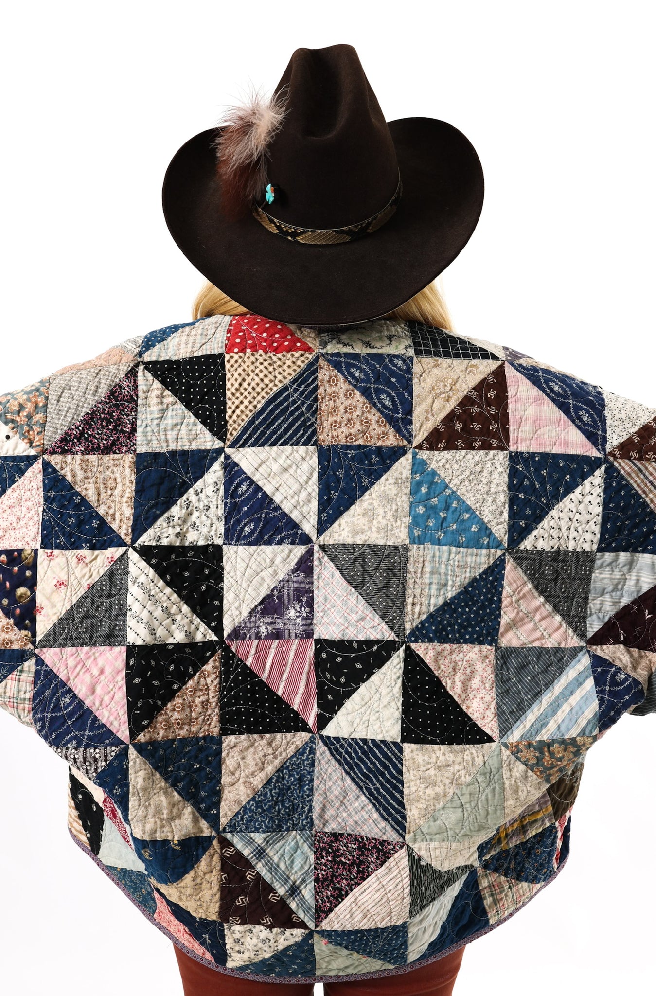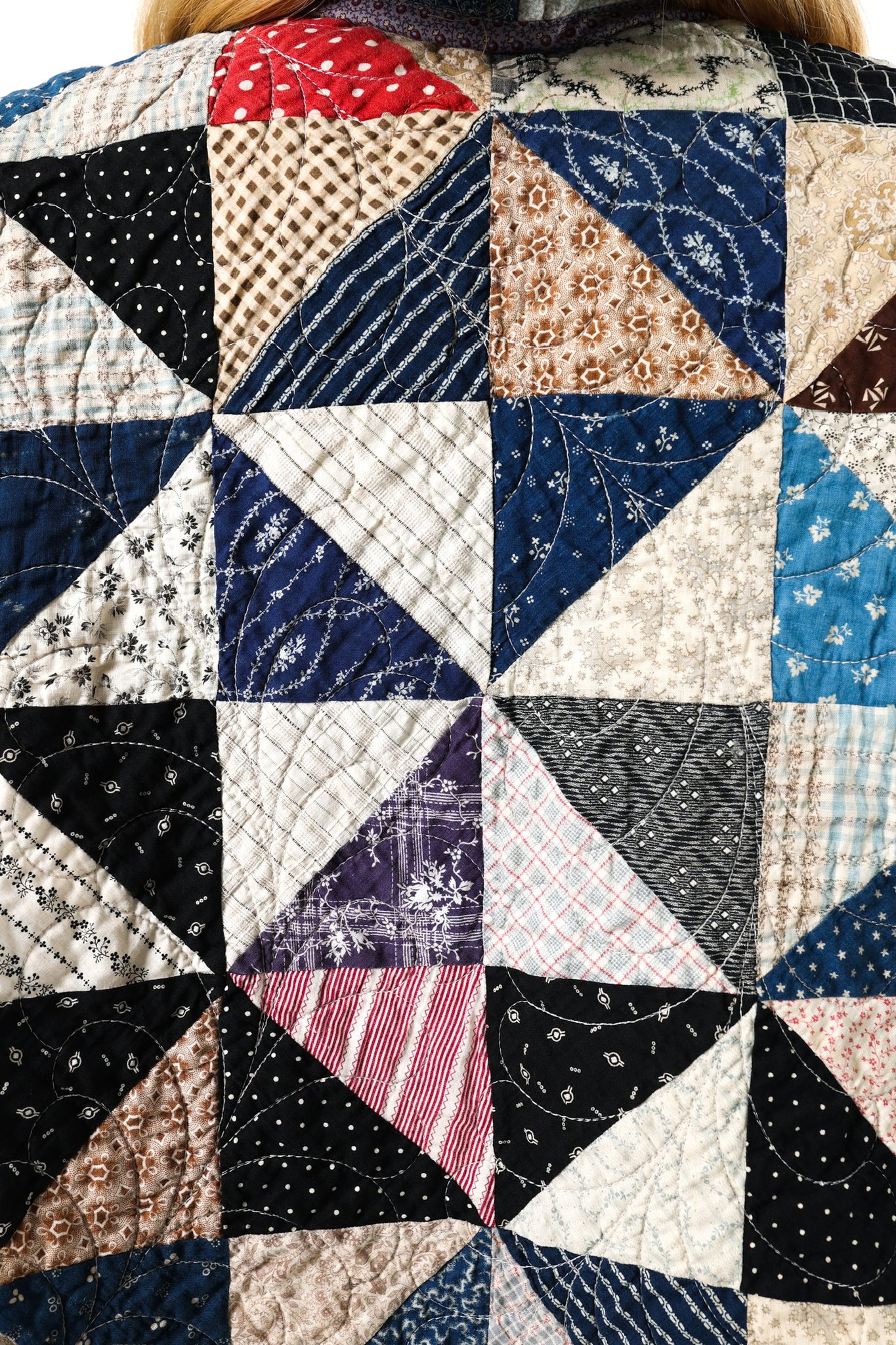 This is an American antique quilt top made circa 1890s to 1920s. To complete the quilt we backed this orphaned quilt top with novelty navy American eagle fabric. This is a traditional Pinwheel quilt pattern. The quilt top is hand sewn. The quilt top acts as a time capsule of turn of the century fabrics. It is loaded with rare indigo fabrics and men's shirt scraps. This piece is a workhorse and a show horse, however, we would encourage care when taking care of the outside of the jacket, antique quilt top. The jacket looks great worn inside out and upside down. This is a Lady Lancaster 10/10. In our opinion, the jacket is thin, lightweight, soft, and has a beautiful drape. If you have further questions, please direct message us and we are happy to send you a video.