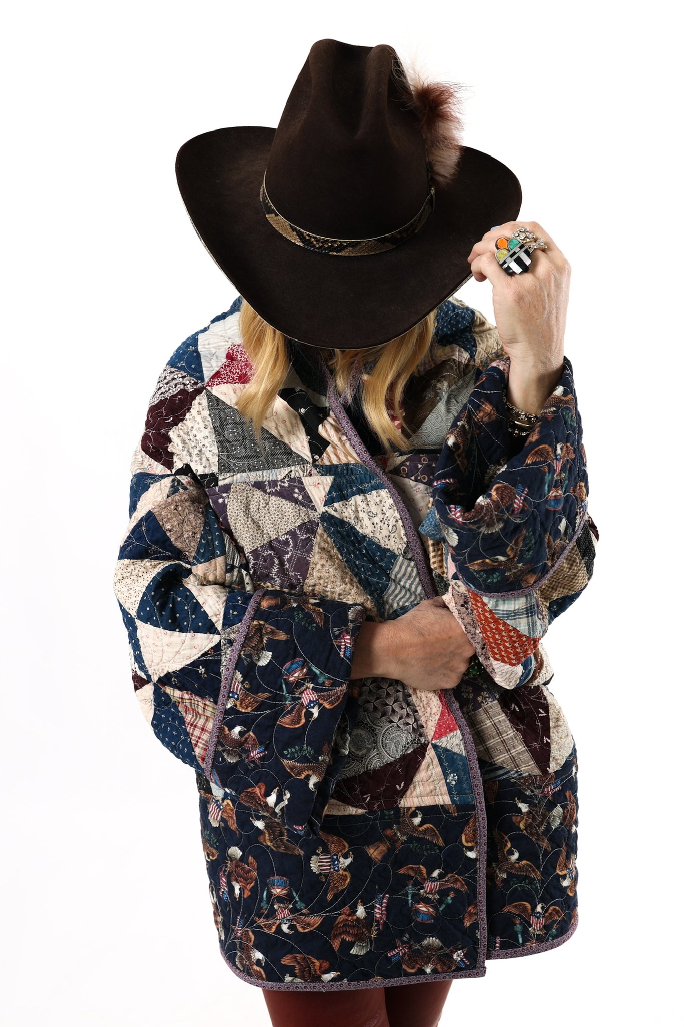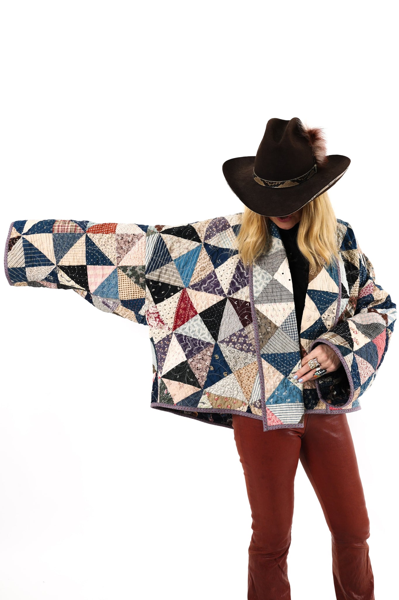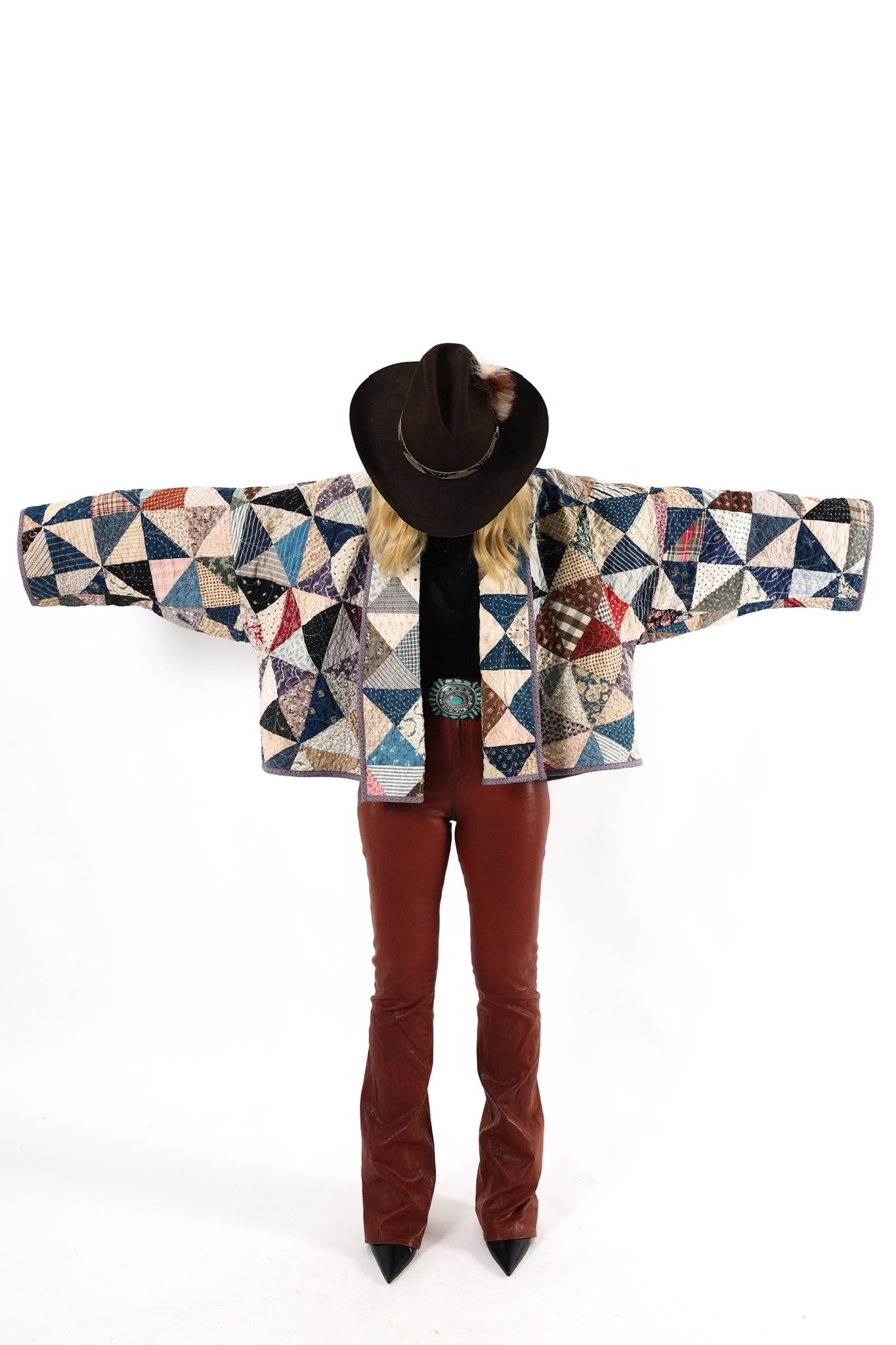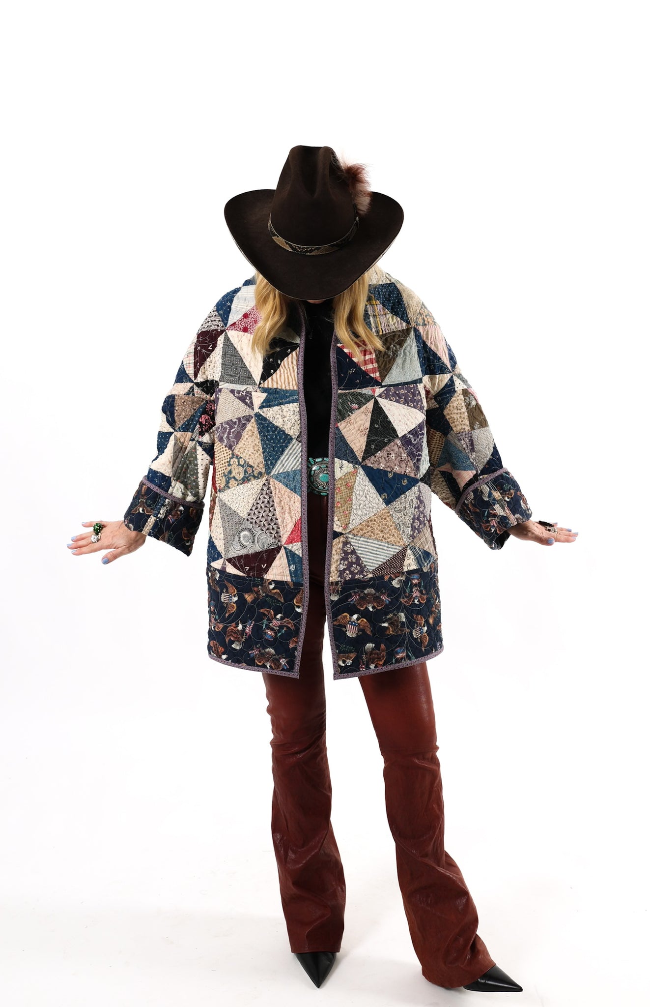 This is an American antique quilt top made circa 1890s to 1920s. To complete the quilt we backed this orphaned quilt top with novelty navy American eagle fabric. This is a traditional Pinwheel quilt pattern. The quilt top is hand sewn. The quilt top acts as a time capsule of turn of the century fabrics. It is loaded with rare indigo fabrics and men's shirt scraps. This piece is a workhorse and a show horse, however, we would encourage care when taking care of the outside of the jacket, antique quilt top. The jacket looks great worn inside out and upside down. This is a Lady Lancaster 10/10. In our opinion, the jacket is thin, lightweight, soft, and has a beautiful drape. If you have further questions, please direct message us and we are happy to send you a video.