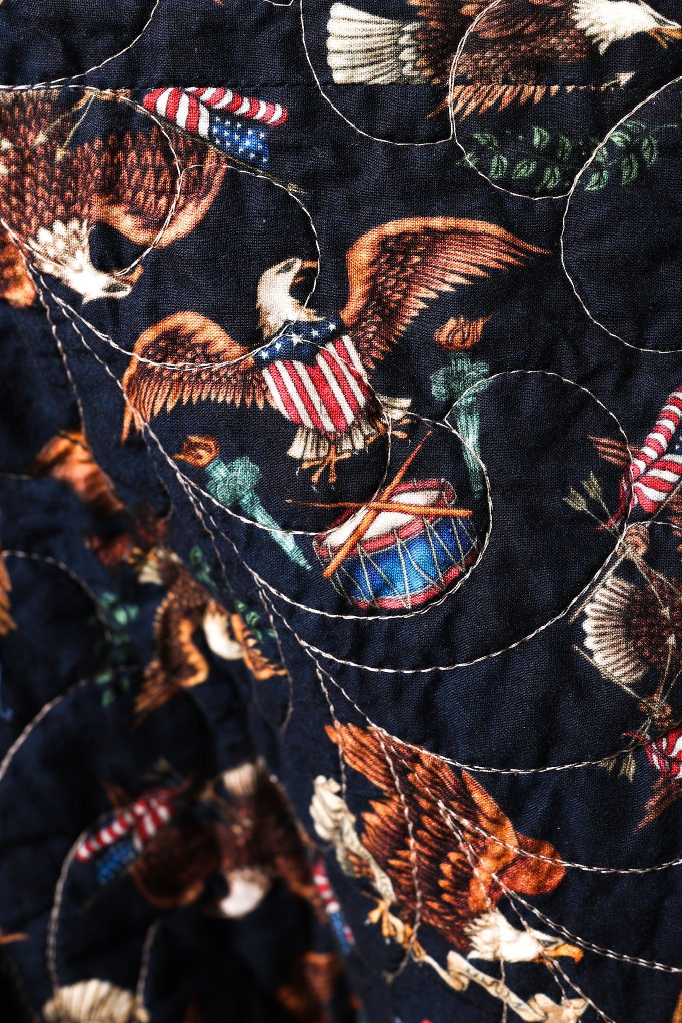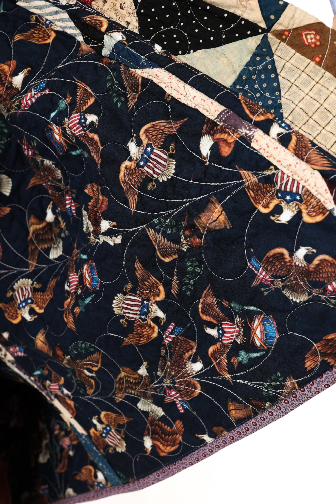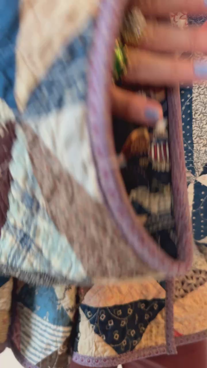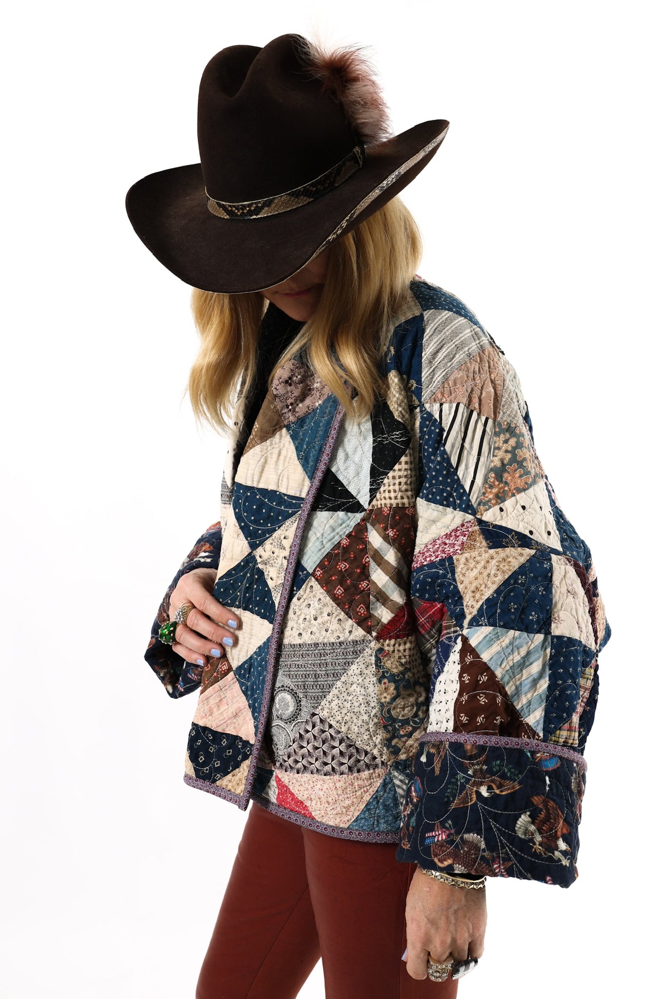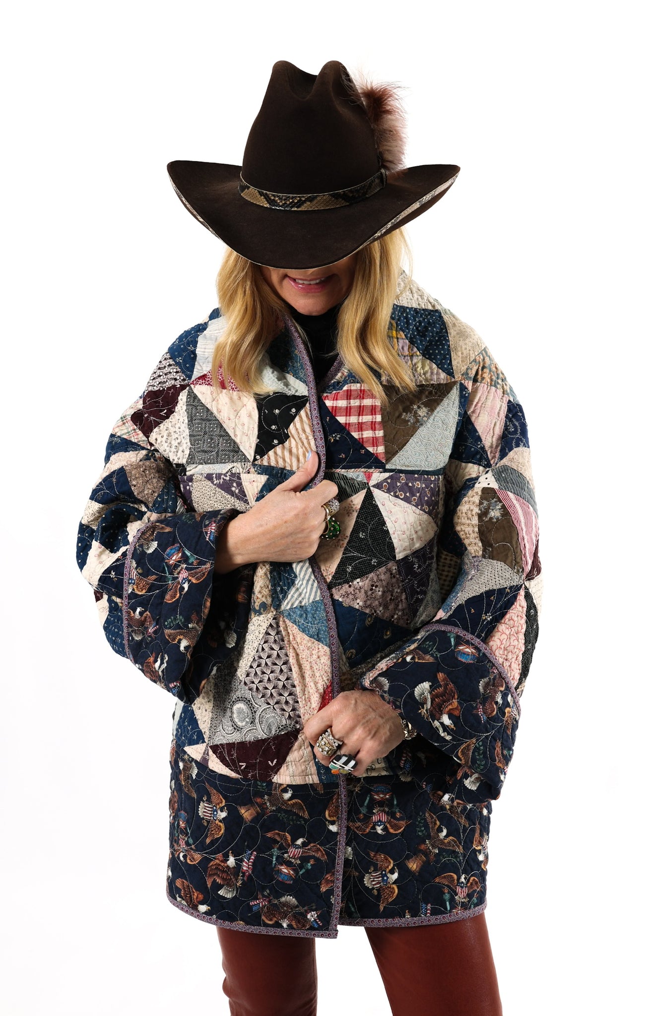 This is an American antique quilt top made circa 1890s to 1920s. To complete the quilt we backed this orphaned quilt top with novelty navy American eagle fabric. This is a traditional Pinwheel quilt pattern. The quilt top is hand sewn. The quilt top acts as a time capsule of turn of the century fabrics. It is loaded with rare indigo fabrics and men's shirt scraps. This piece is a workhorse and a show horse, however, we would encourage care when taking care of the outside of the jacket, antique quilt top. The jacket looks great worn inside out and upside down. This is a Lady Lancaster 10/10. In our opinion, the jacket is thin, lightweight, soft, and has a beautiful drape. If you have further questions, please direct message us and we are happy to send you a video.