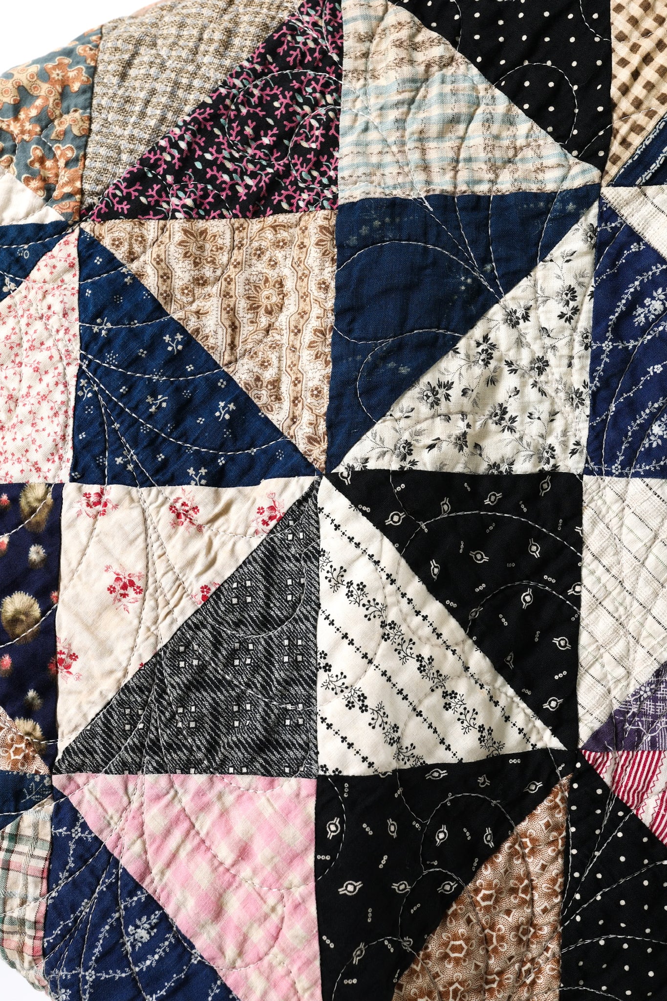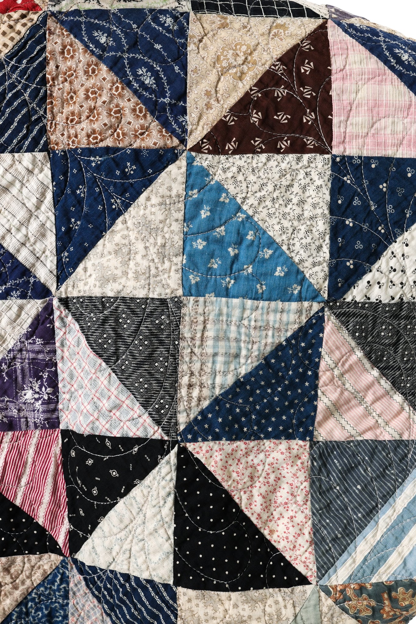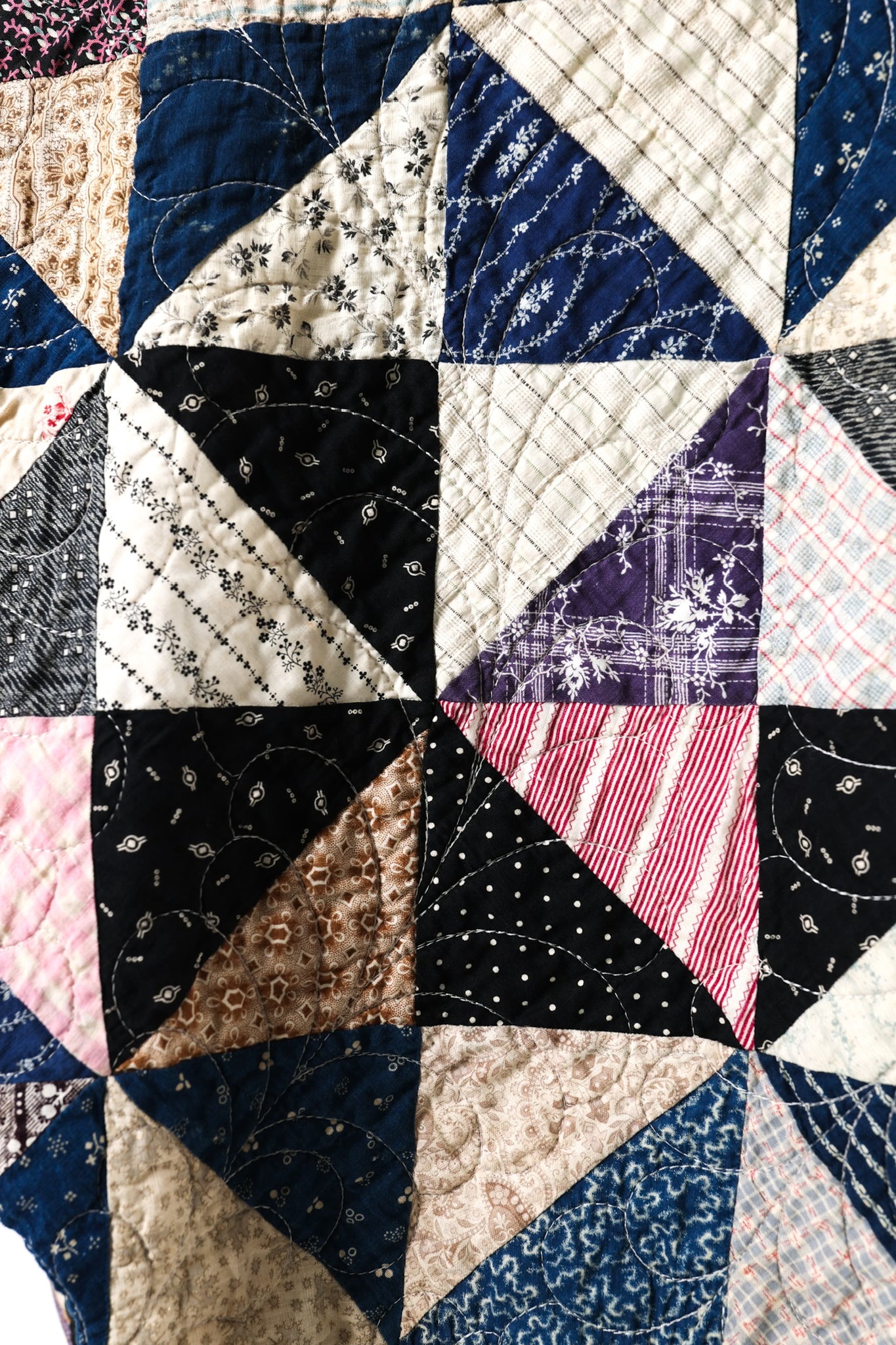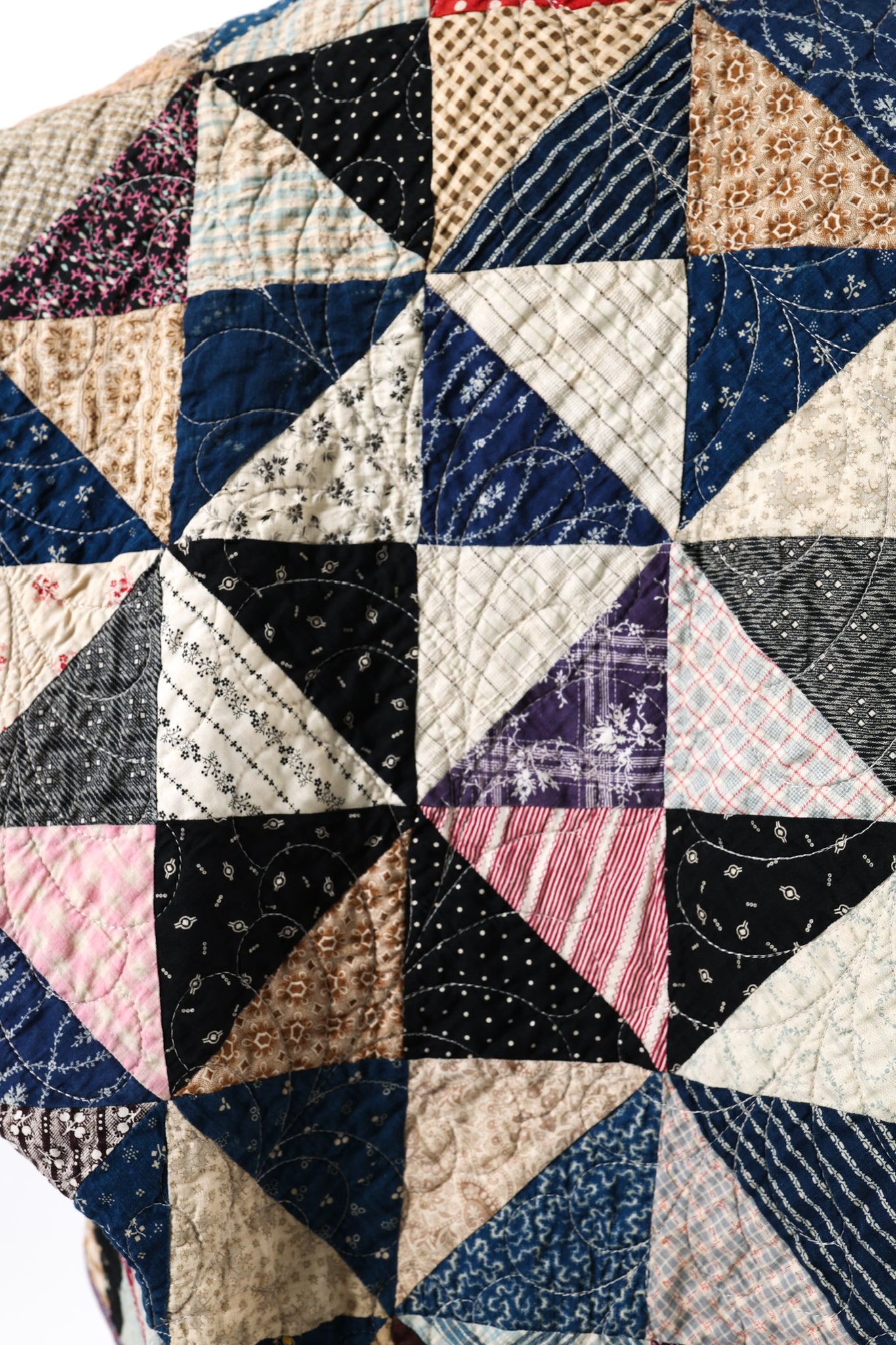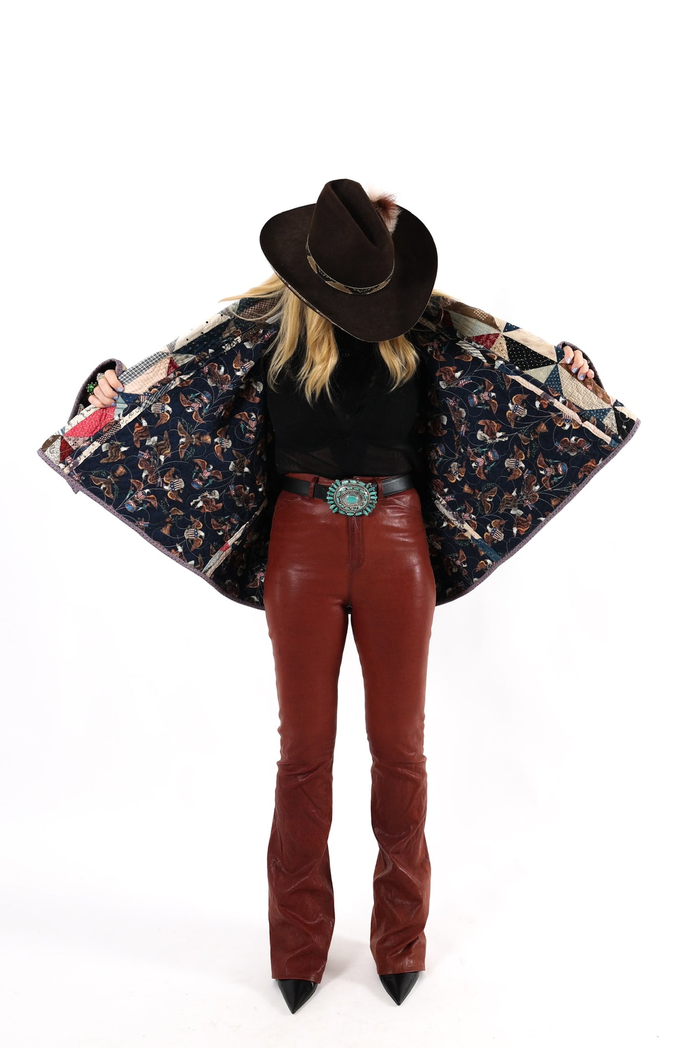 This is an American antique quilt top made circa 1890s to 1920s. To complete the quilt we backed this orphaned quilt top with novelty navy American eagle fabric. This is a traditional Pinwheel quilt pattern. The quilt top is hand sewn. The quilt top acts as a time capsule of turn of the century fabrics. It is loaded with rare indigo fabrics and men's shirt scraps. This piece is a workhorse and a show horse, however, we would encourage care when taking care of the outside of the jacket, antique quilt top. The jacket looks great worn inside out and upside down. This is a Lady Lancaster 10/10. In our opinion, the jacket is thin, lightweight, soft, and has a beautiful drape. If you have further questions, please direct message us and we are happy to send you a video.
