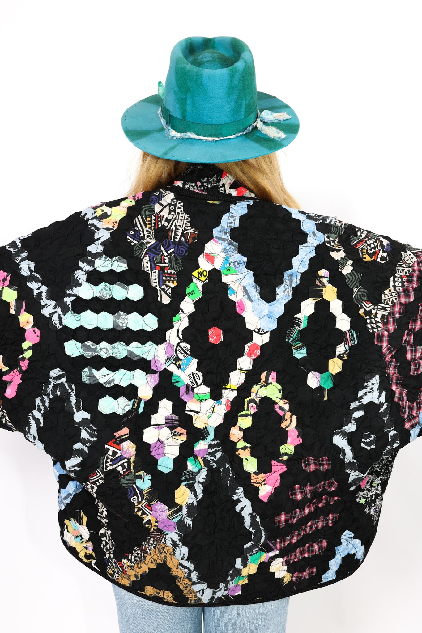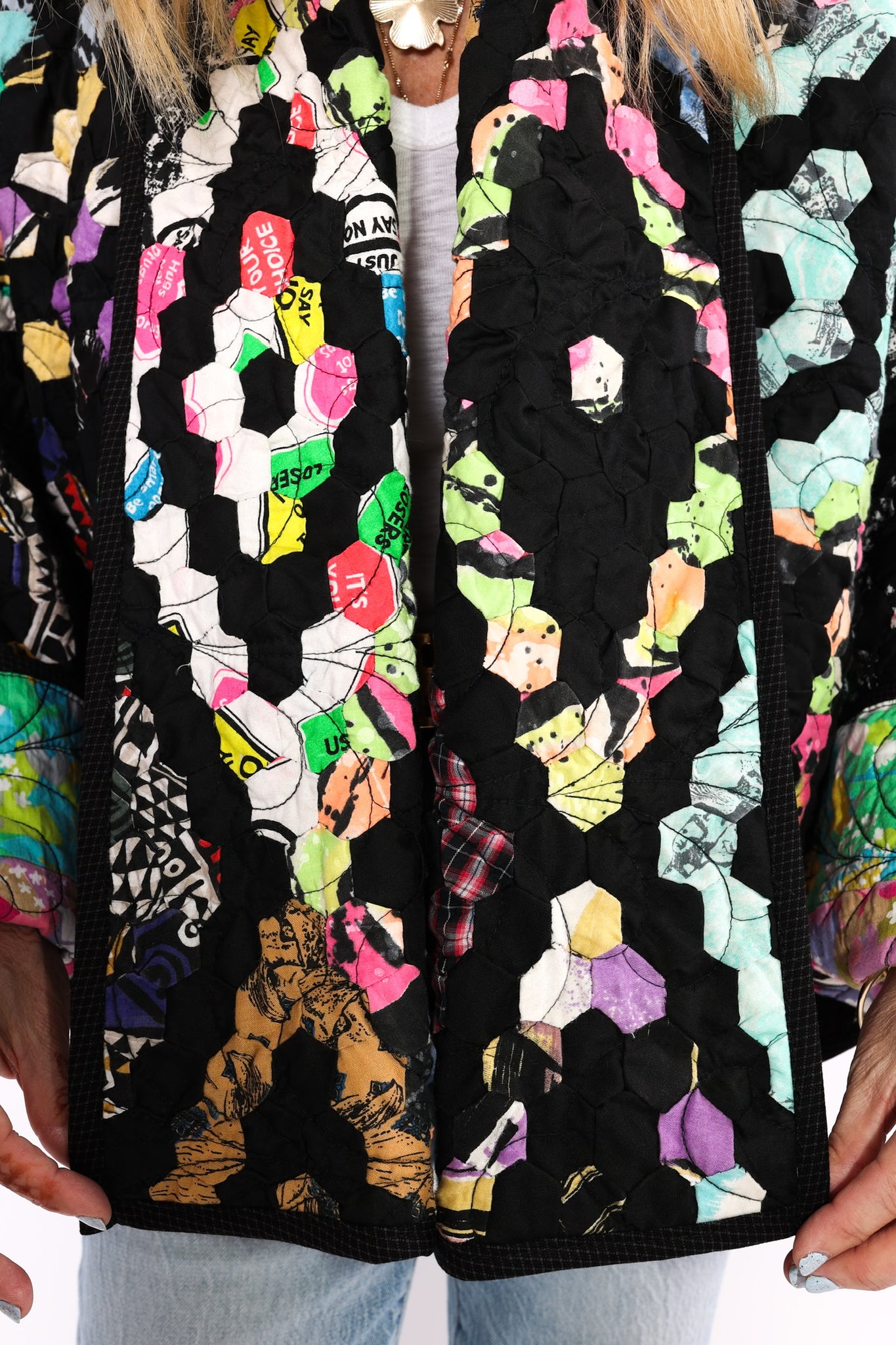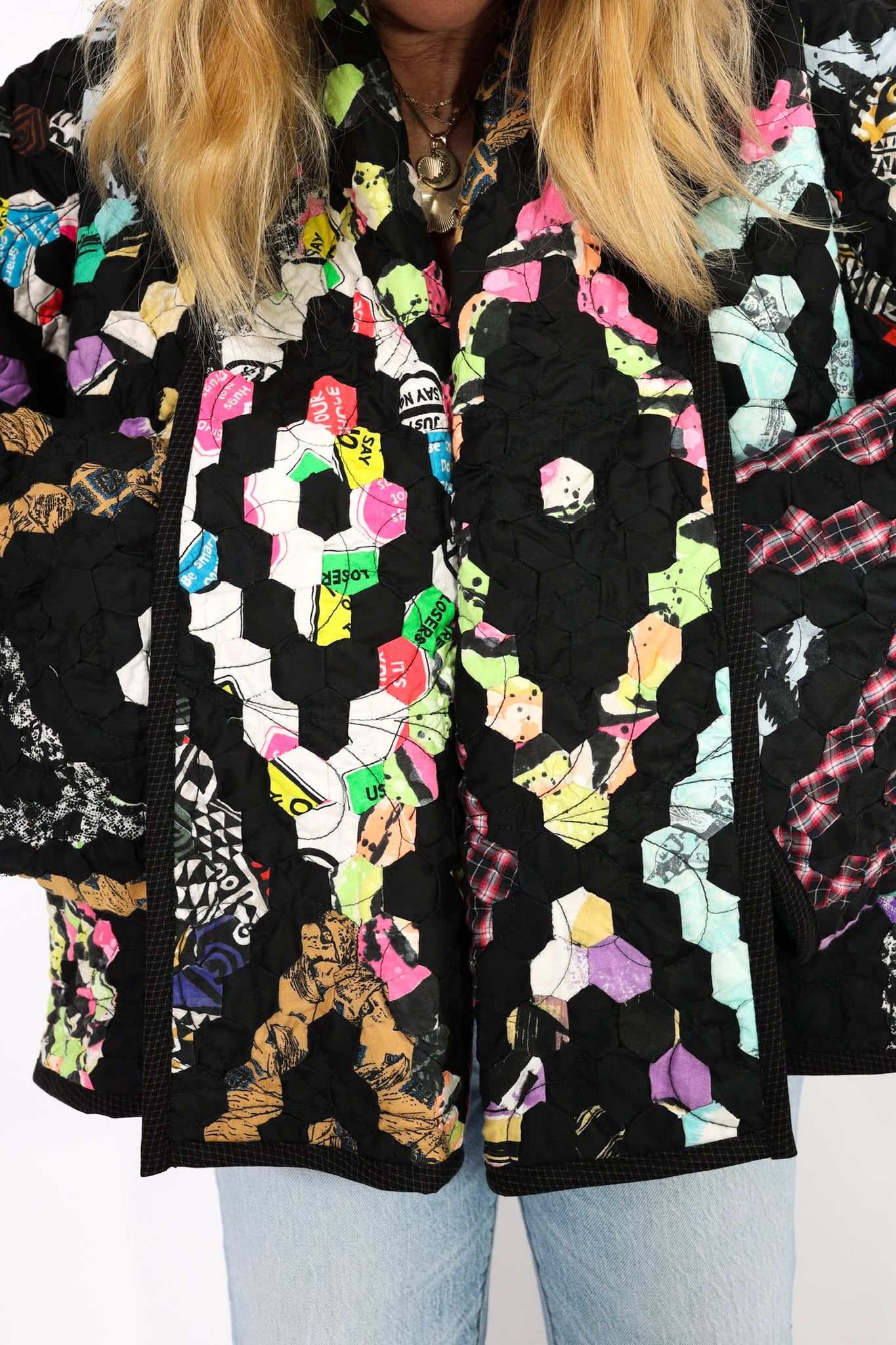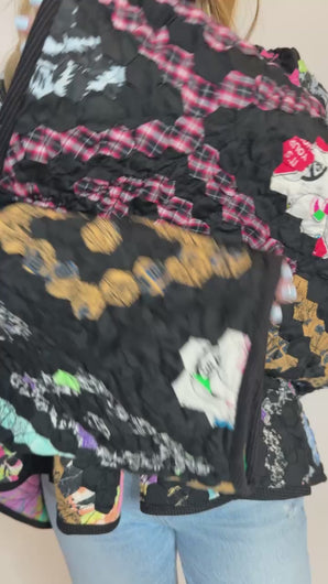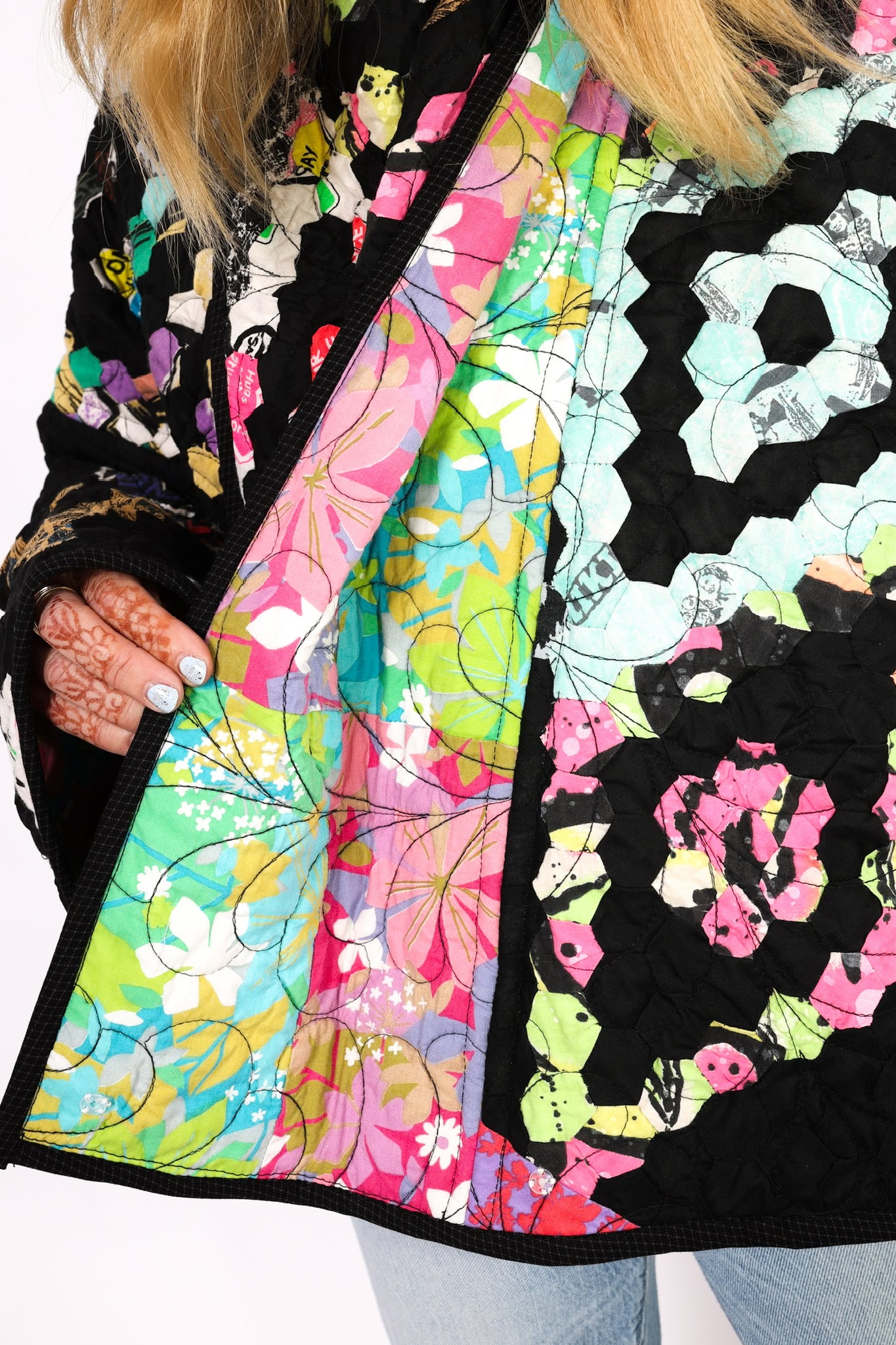 This quilt is a combination of two quilt tops! The outside of the jacket is most commonly called Martha Washington's Flower Garden but can also be called The Diamond Field or Rainbow Tile. It was made in a very unorthodox colorway and we love it! It is so rare to see this much black fabric in quilts, and even better, it has pops of so many colors and even neons! The quilt top is hand sewn and made with very small hexi pieces! The inside of the jacket is a large scale postage stamp quilt of alternation blocks of funky neon floral fabric. This orphaned top was made around the 1960s. You must cuff the sleeves or wear this piece inside out! This fabric is meant to be show off! In our opinion, the jacket is soft, thin, and lightweight. Since these fabrics have never seen any pre-love it will need worn to achieve the buttery drape that we all love! This piece is in excellent condition! If you have further questions, please direct message us and we are happy to send you a video.