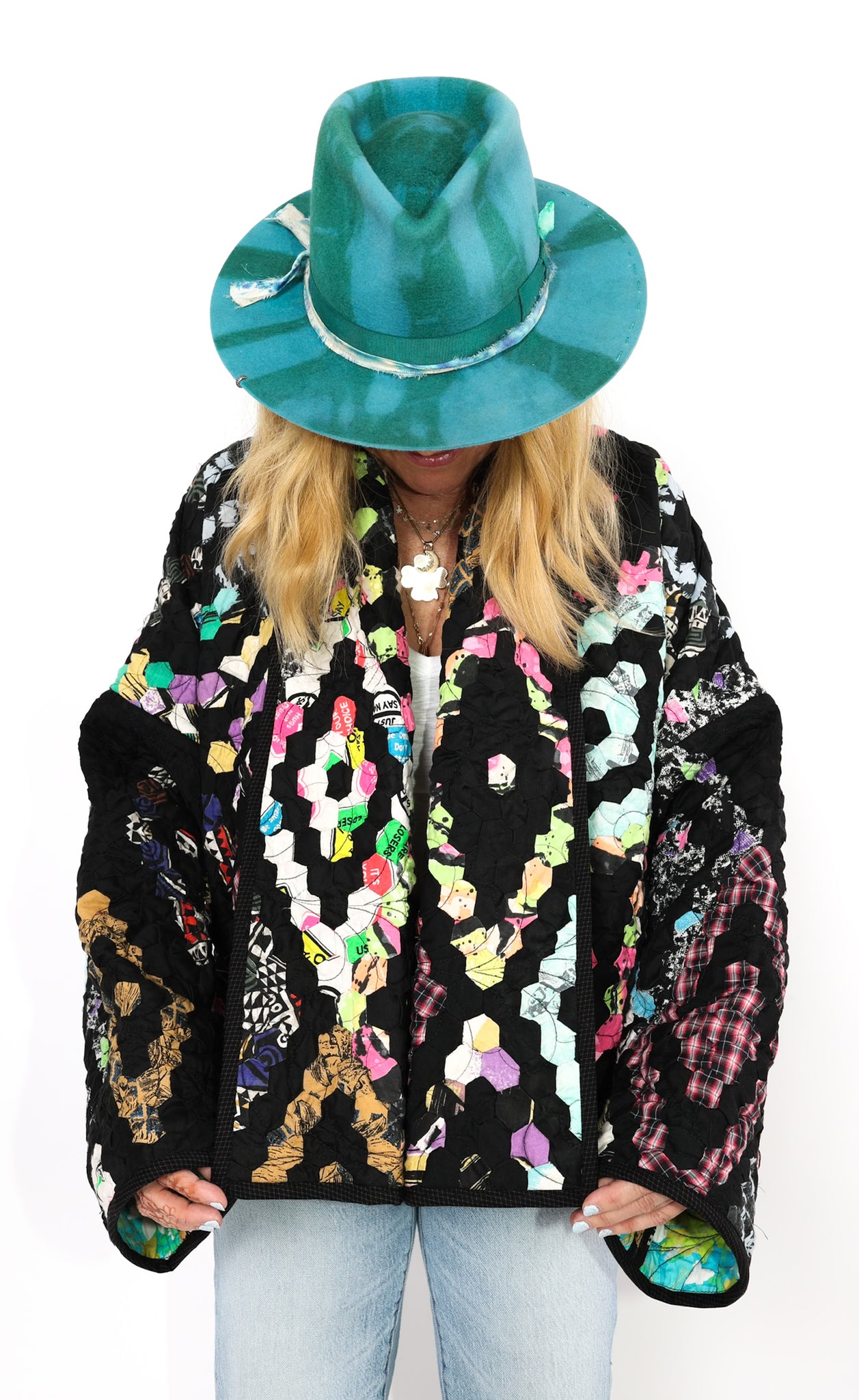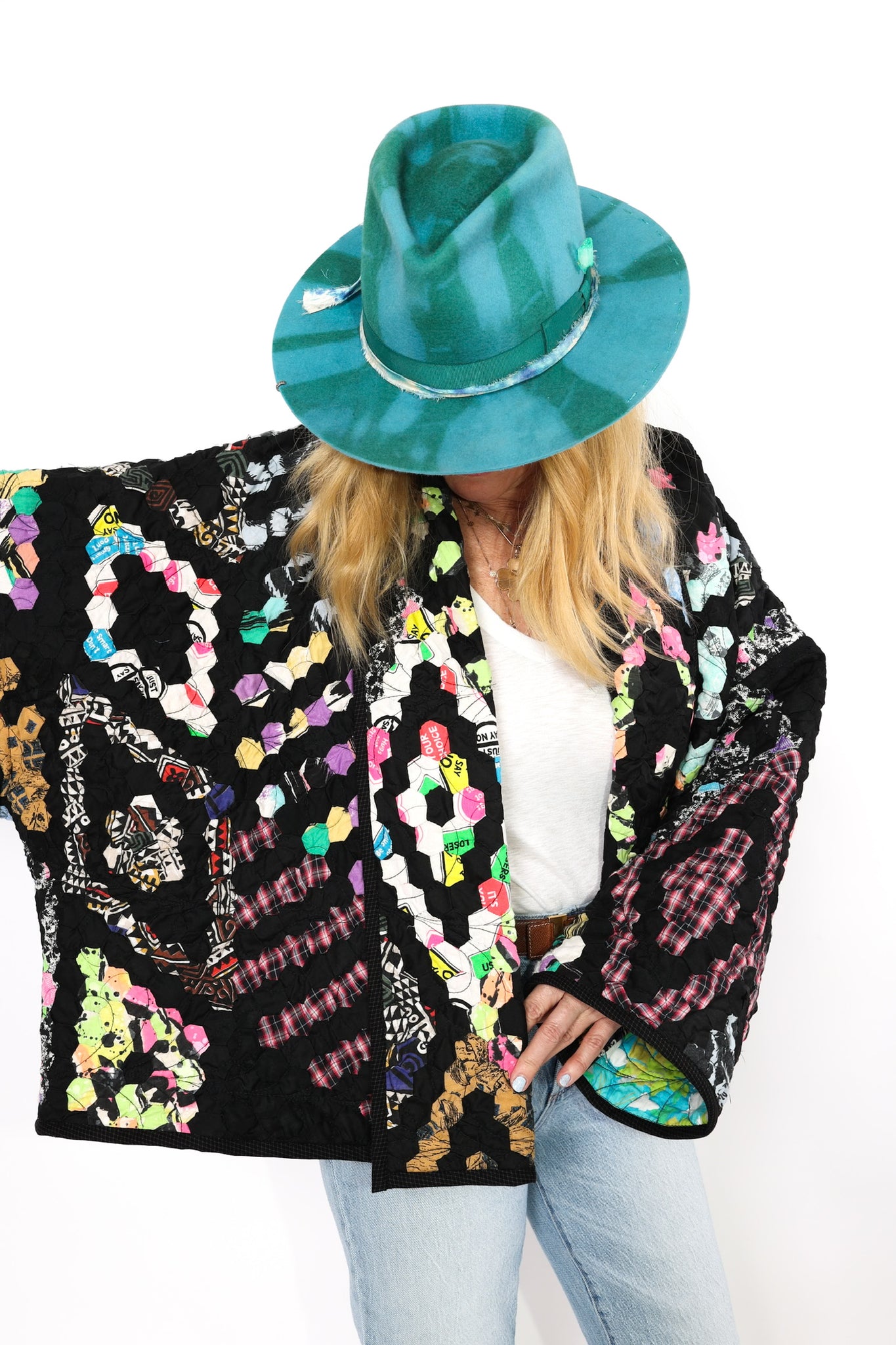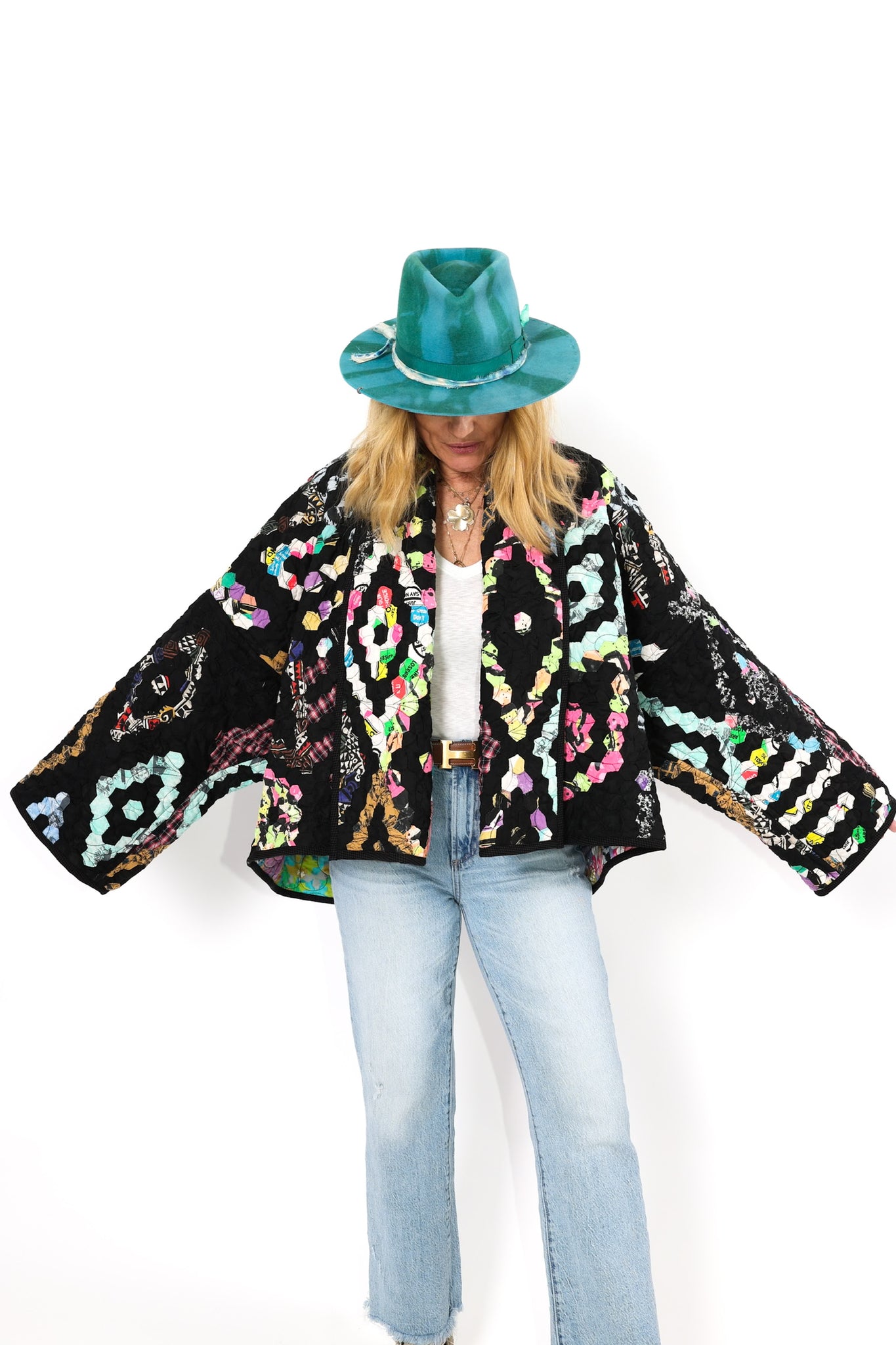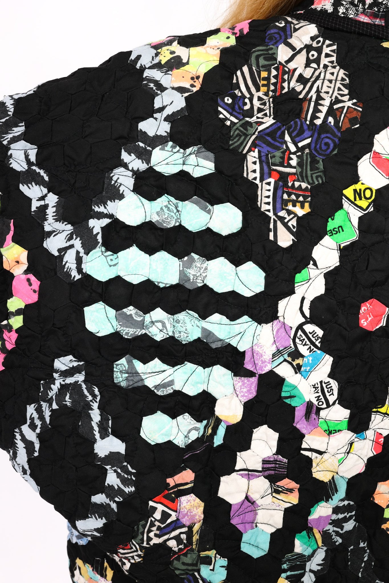 This quilt is a combination of two quilt tops! The outside of the jacket is most commonly called Martha Washington's Flower Garden but can also be called The Diamond Field or Rainbow Tile. It was made in a very unorthodox colorway and we love it! It is so rare to see this much black fabric in quilts, and even better, it has pops of so many colors and even neons! The quilt top is hand sewn and made with very small hexi pieces! The inside of the jacket is a large scale postage stamp quilt of alternation blocks of funky neon floral fabric. This orphaned top was made around the 1960s. You must cuff the sleeves or wear this piece inside out! This fabric is meant to be show off! In our opinion, the jacket is soft, thin, and lightweight. Since these fabrics have never seen any pre-love it will need worn to achieve the buttery drape that we all love! This piece is in excellent condition! If you have further questions, please direct message us and we are happy to send you a video.