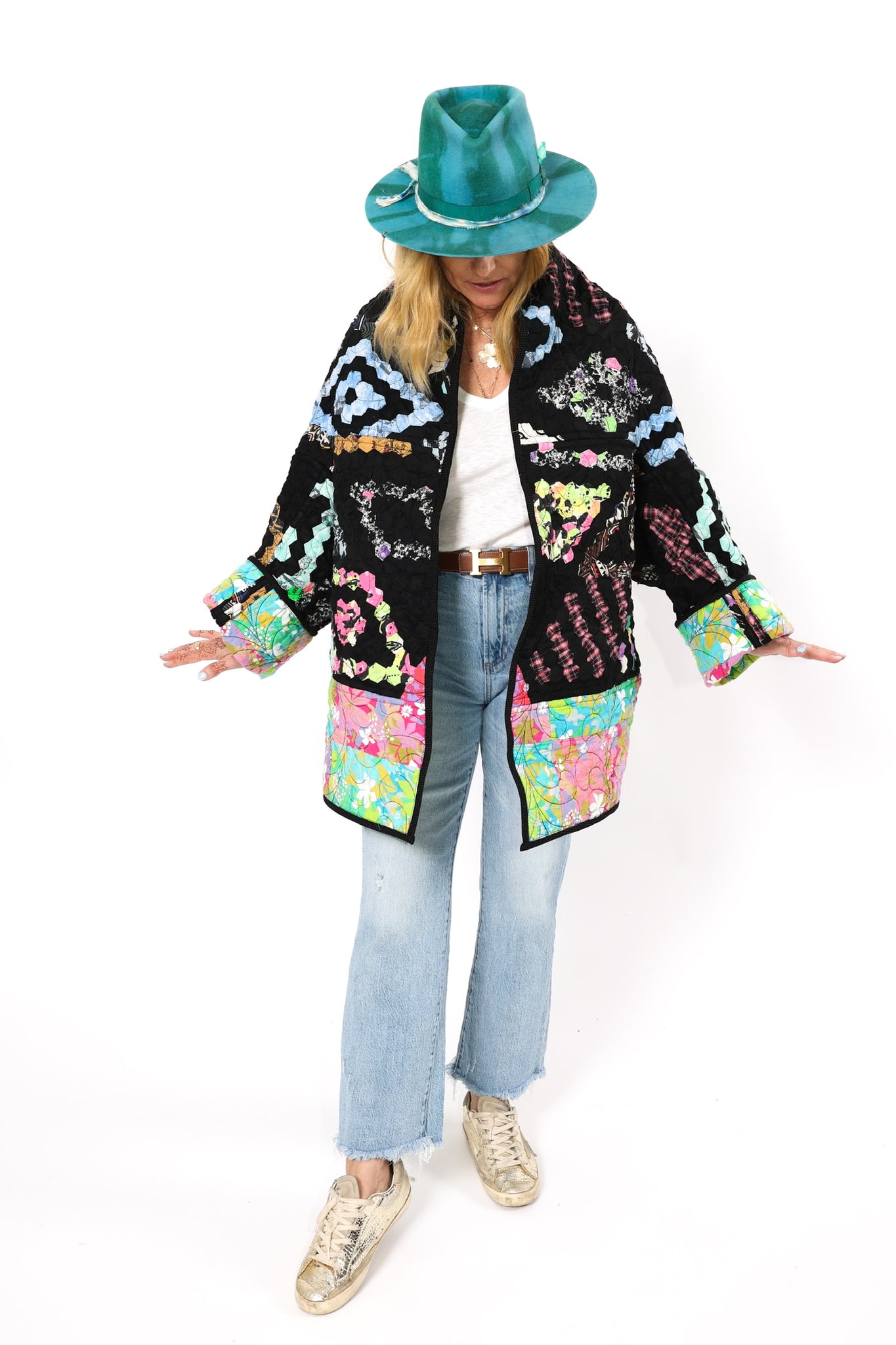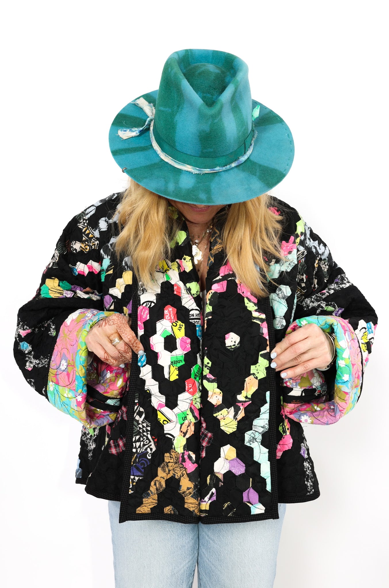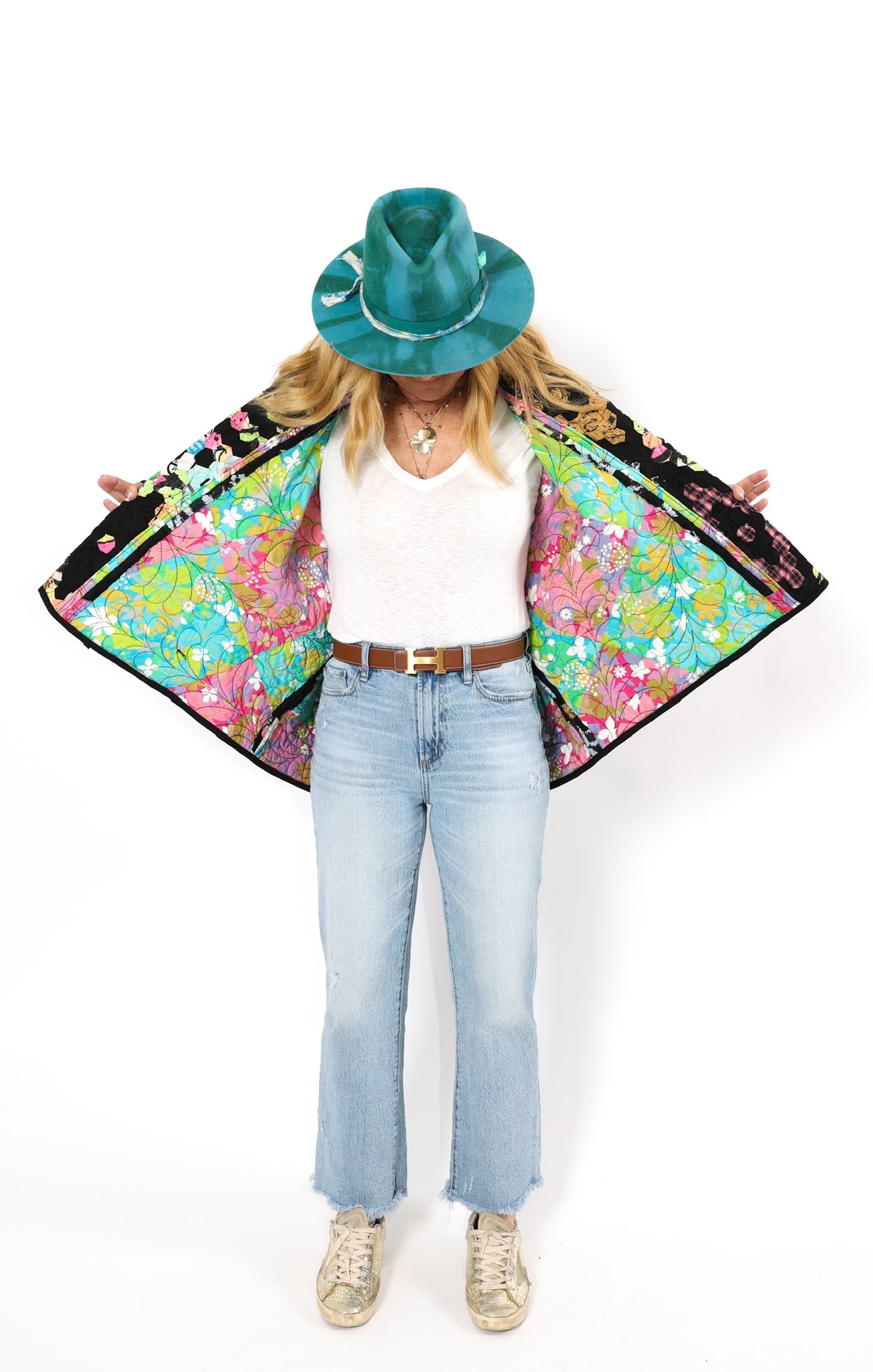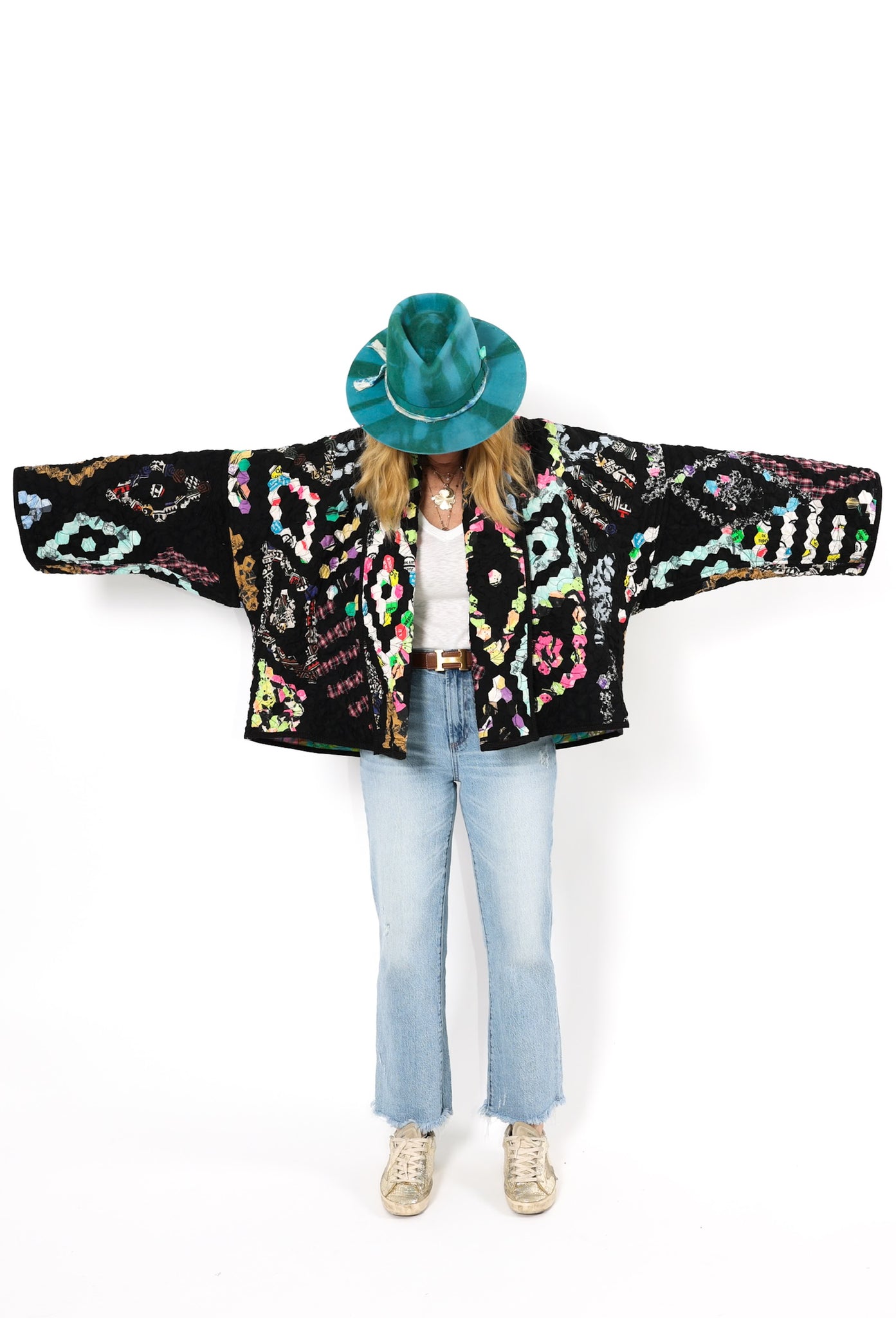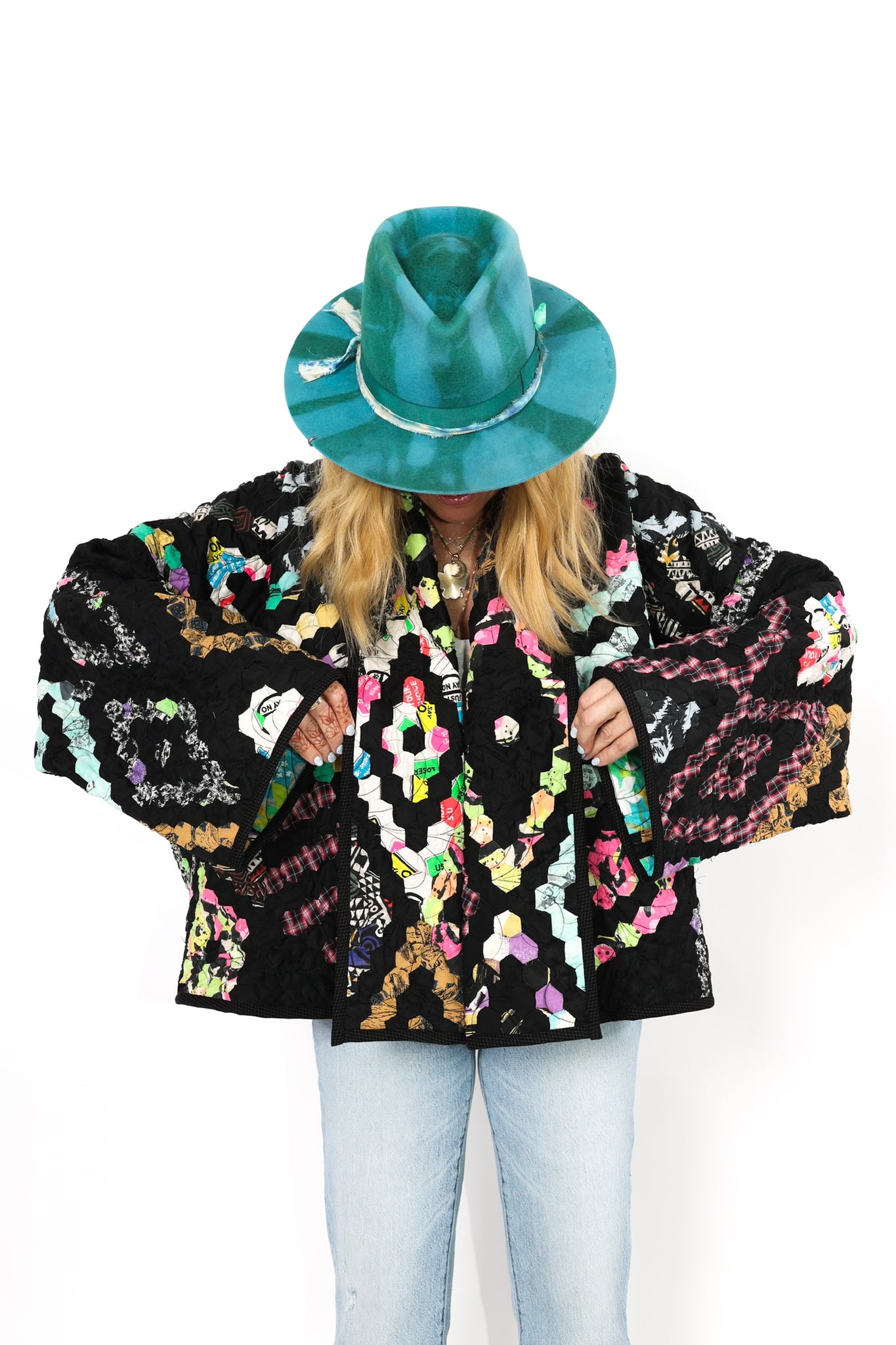 This quilt is a combination of two quilt tops! The outside of the jacket is most commonly called Martha Washington's Flower Garden but can also be called The Diamond Field or Rainbow Tile. It was made in a very unorthodox colorway and we love it! It is so rare to see this much black fabric in quilts, and even better, it has pops of so many colors and even neons! The quilt top is hand sewn and made with very small hexi pieces! The inside of the jacket is a large scale postage stamp quilt of alternation blocks of funky neon floral fabric. This orphaned top was made around the 1960s. You must cuff the sleeves or wear this piece inside out! This fabric is meant to be show off! In our opinion, the jacket is soft, thin, and lightweight. Since these fabrics have never seen any pre-love it will need worn to achieve the buttery drape that we all love! This piece is in excellent condition! If you have further questions, please direct message us and we are happy to send you a video.