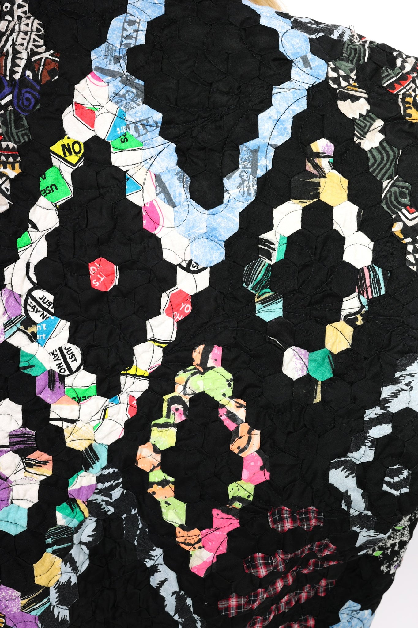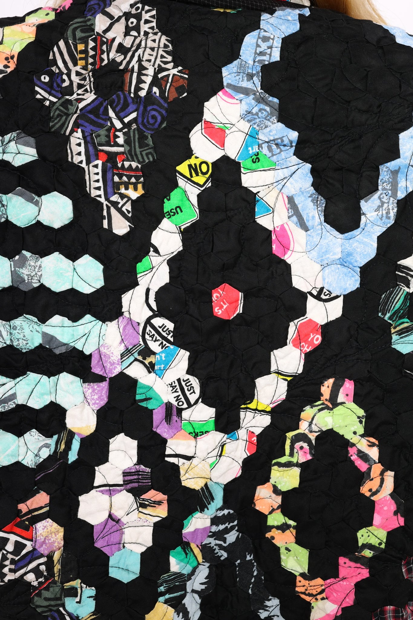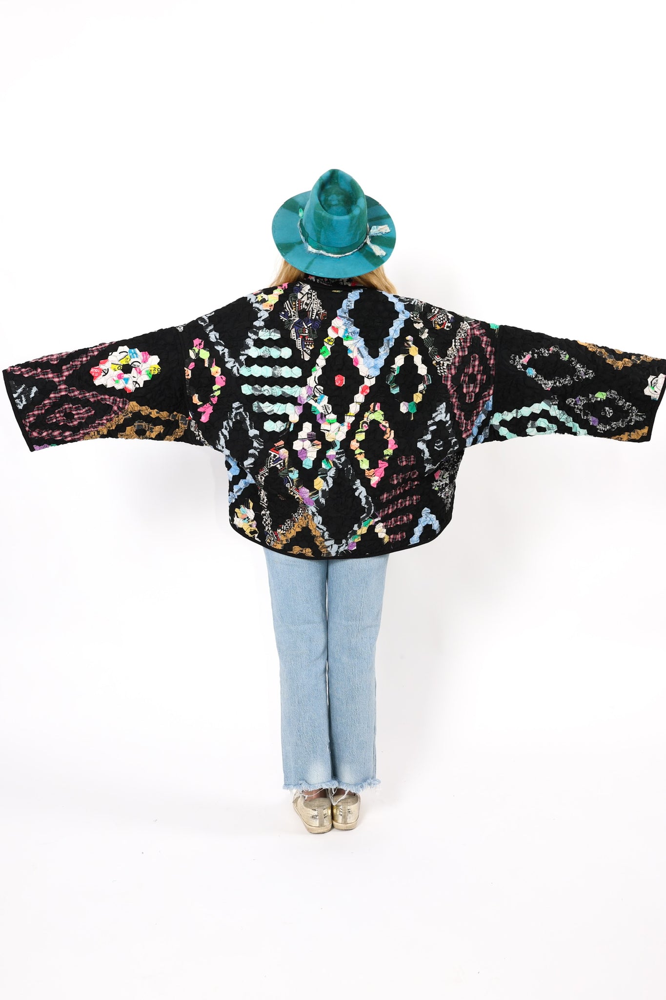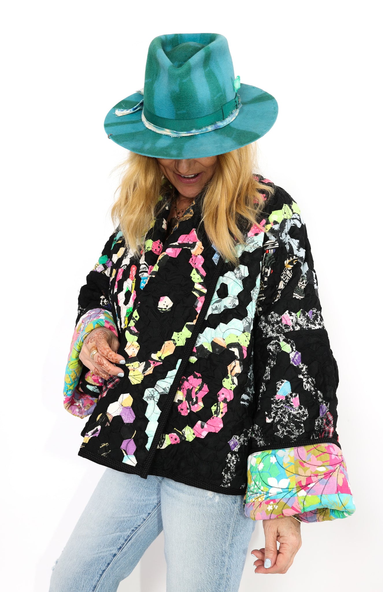 This quilt is a combination of two quilt tops! The outside of the jacket is most commonly called Martha Washington's Flower Garden but can also be called The Diamond Field or Rainbow Tile. It was made in a very unorthodox colorway and we love it! It is so rare to see this much black fabric in quilts, and even better, it has pops of so many colors and even neons! The quilt top is hand sewn and made with very small hexi pieces! The inside of the jacket is a large scale postage stamp quilt of alternation blocks of funky neon floral fabric. This orphaned top was made around the 1960s. You must cuff the sleeves or wear this piece inside out! This fabric is meant to be show off! In our opinion, the jacket is soft, thin, and lightweight. Since these fabrics have never seen any pre-love it will need worn to achieve the buttery drape that we all love! This piece is in excellent condition! If you have further questions, please direct message us and we are happy to send you a video.