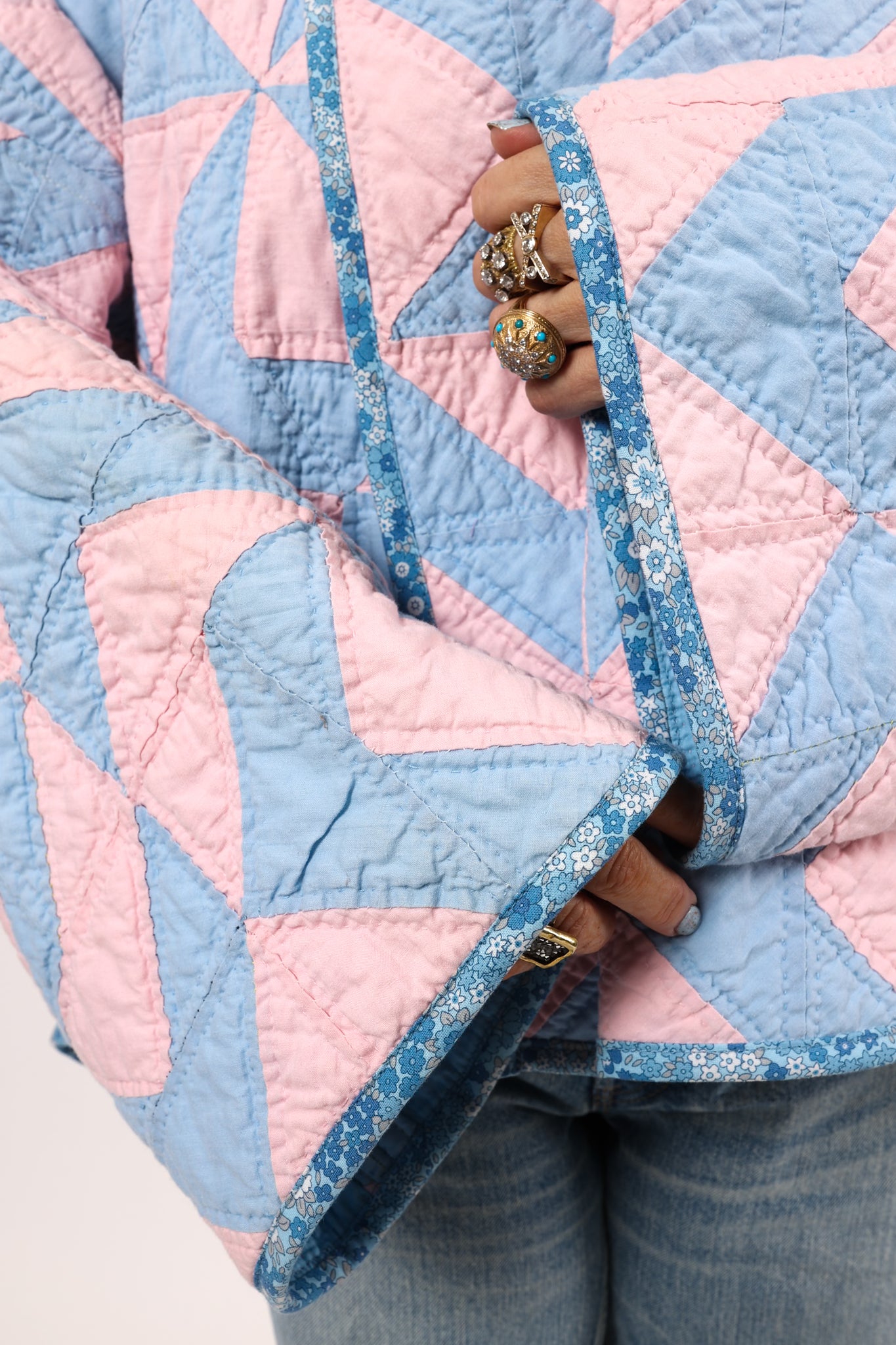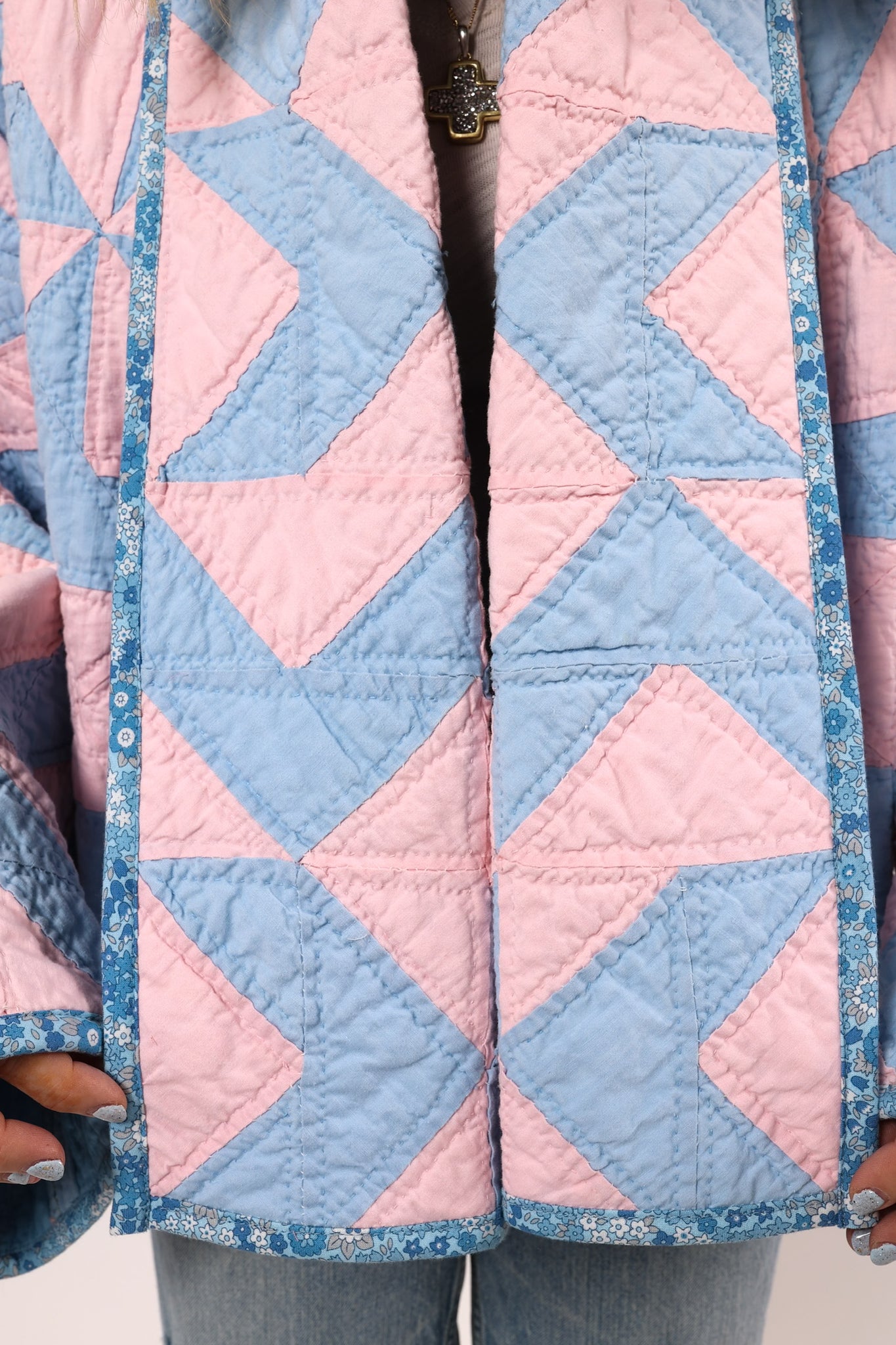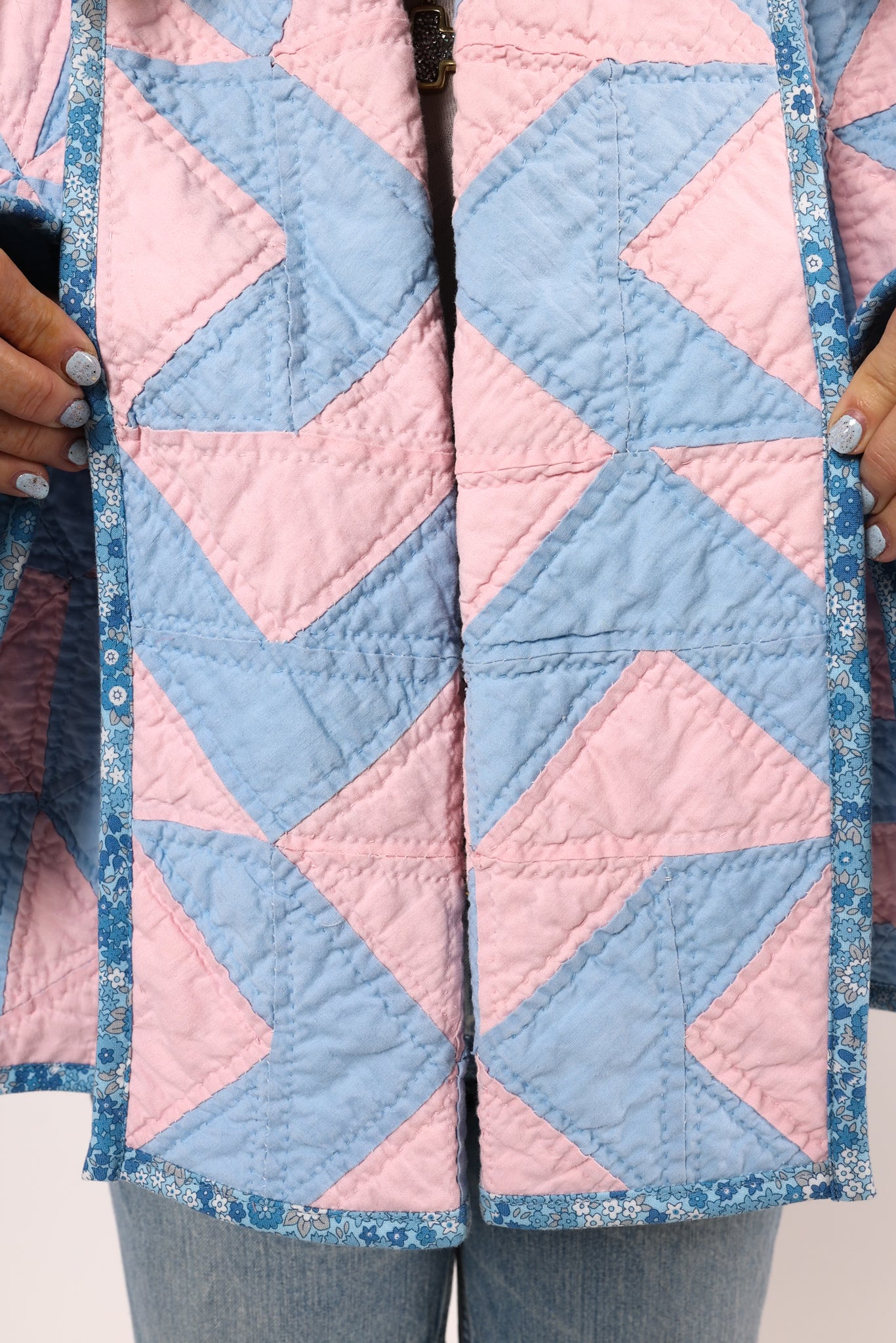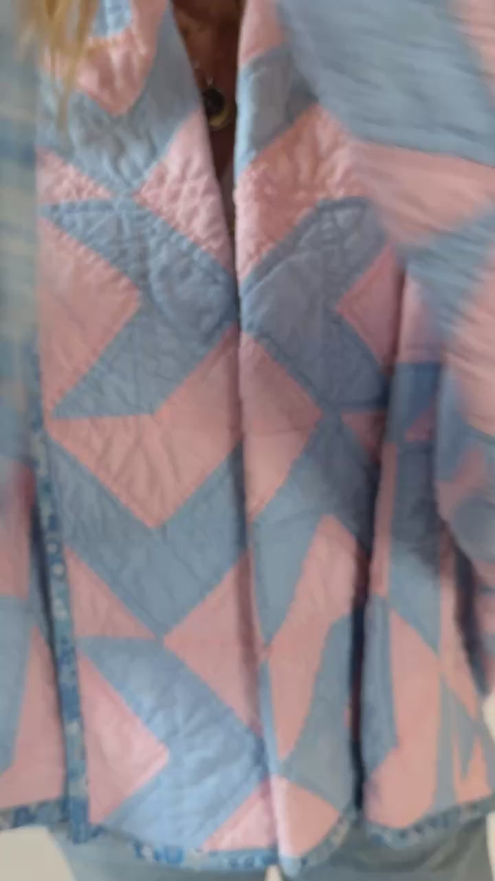 This is an antique American quilt made circa 1930s to 1960s. It is a traditional Virginia Reel or Zig Zag quilt pattern. The maker both hand quilted and hand sewed this piece, which is a labor of love and a lost art. We love that the maker backed the quilt(inside of jacket) with a coordinating blue fabric. This makes the jacket look great when worn upside down! We love the two tone pastels in this piece and would style it with white jeans in the summer! In our opinion, the quilt is thin, soft, lightweight, has a little loft(puffiness), and has a great drape. If you have further questions, please direct message us and we are happy to send you a video.