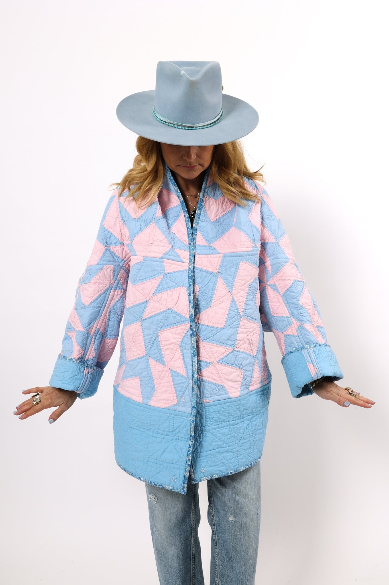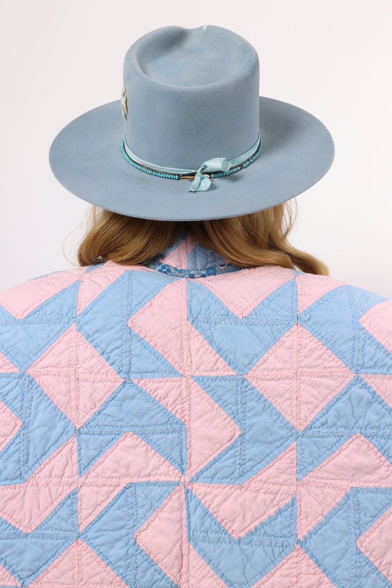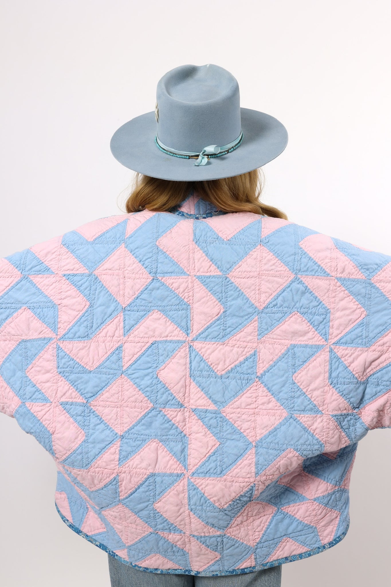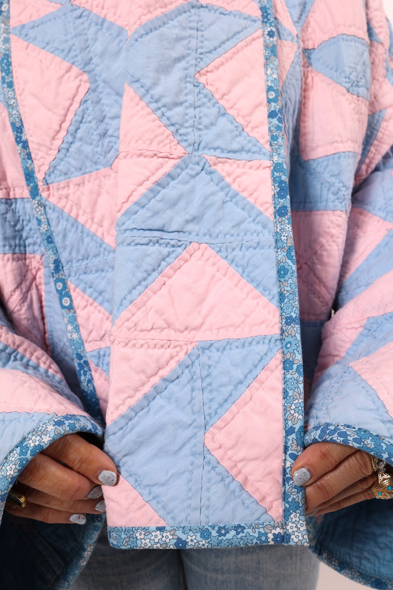This is an antique American quilt made circa 1930s to 1960s. It is a traditional Virginia Reel or Zig Zag quilt pattern. The maker both hand quilted and hand sewed this piece, which is a labor of love and a lost art. We love that the maker backed the quilt(inside of jacket) with a coordinating blue fabric. This makes the jacket look great when worn upside down! We love the two tone pastels in this piece and would style it with white jeans in the summer! In our opinion, the quilt is thin, soft, lightweight, has a little loft(puffiness), and has a great drape. If you have further questions, please direct message us and we are happy to send you a video.