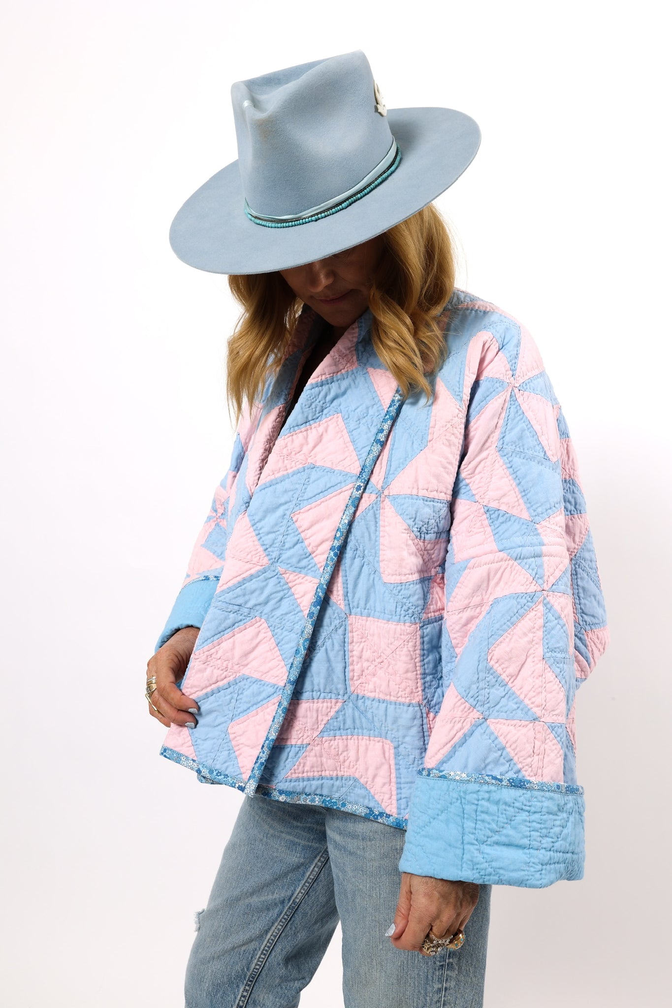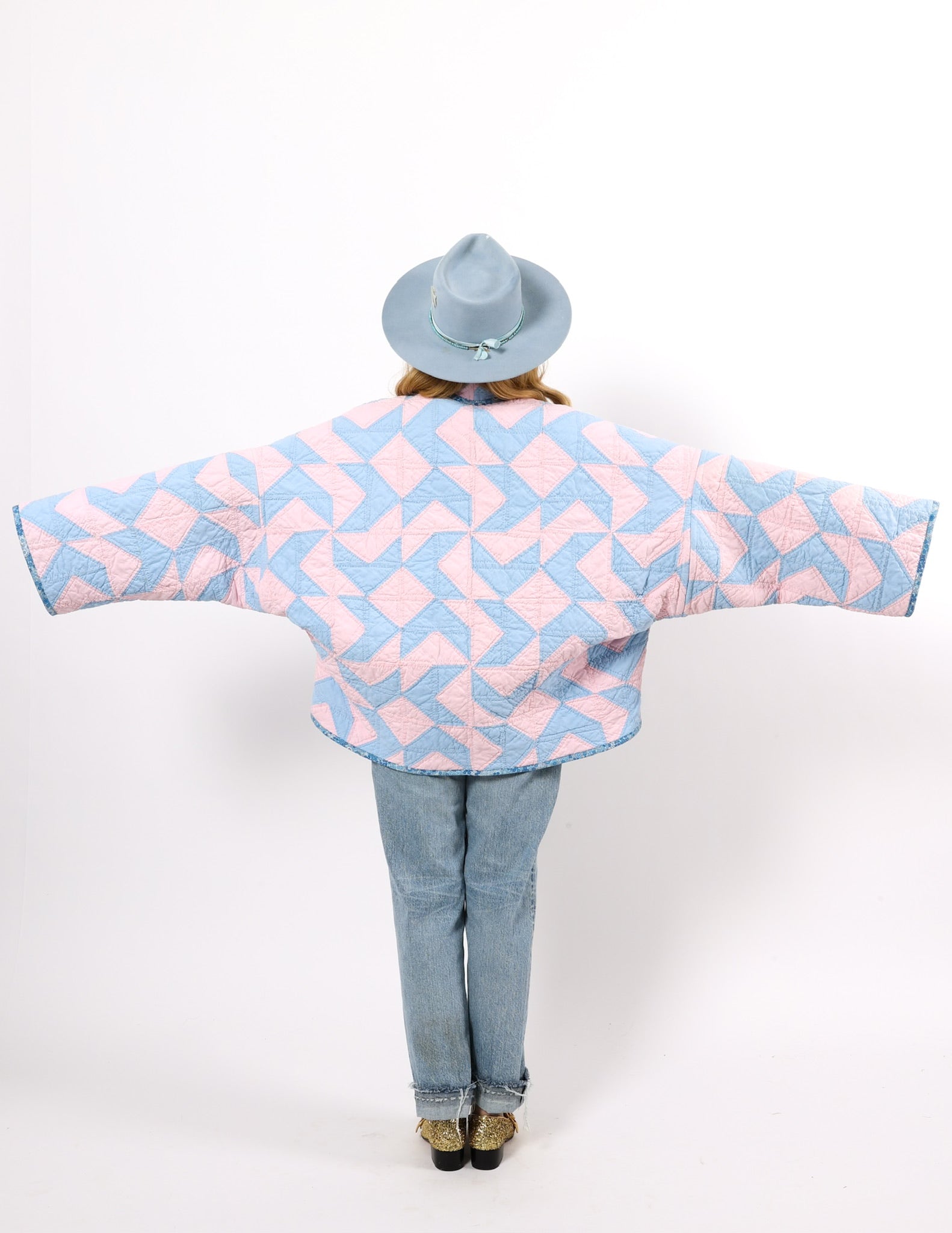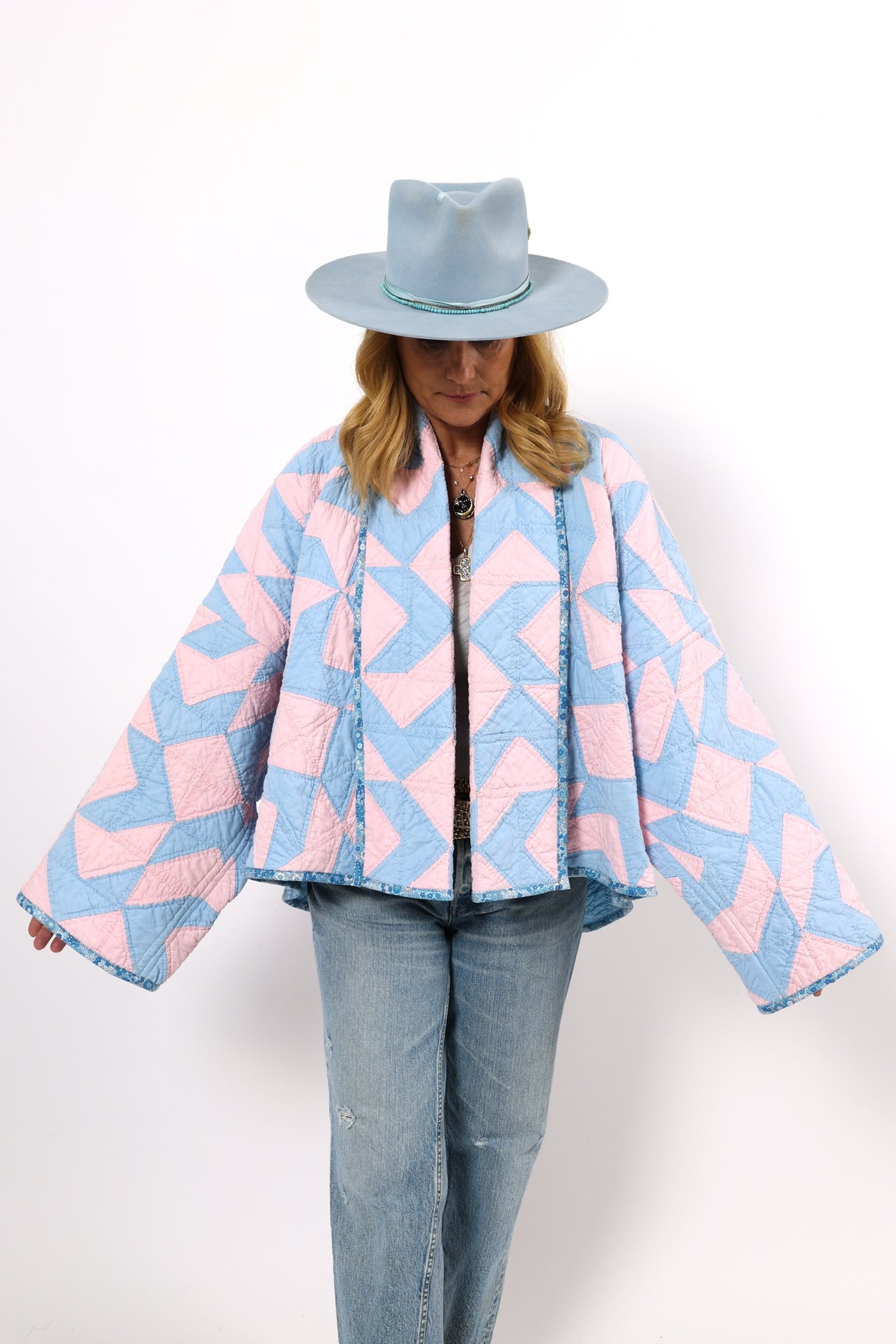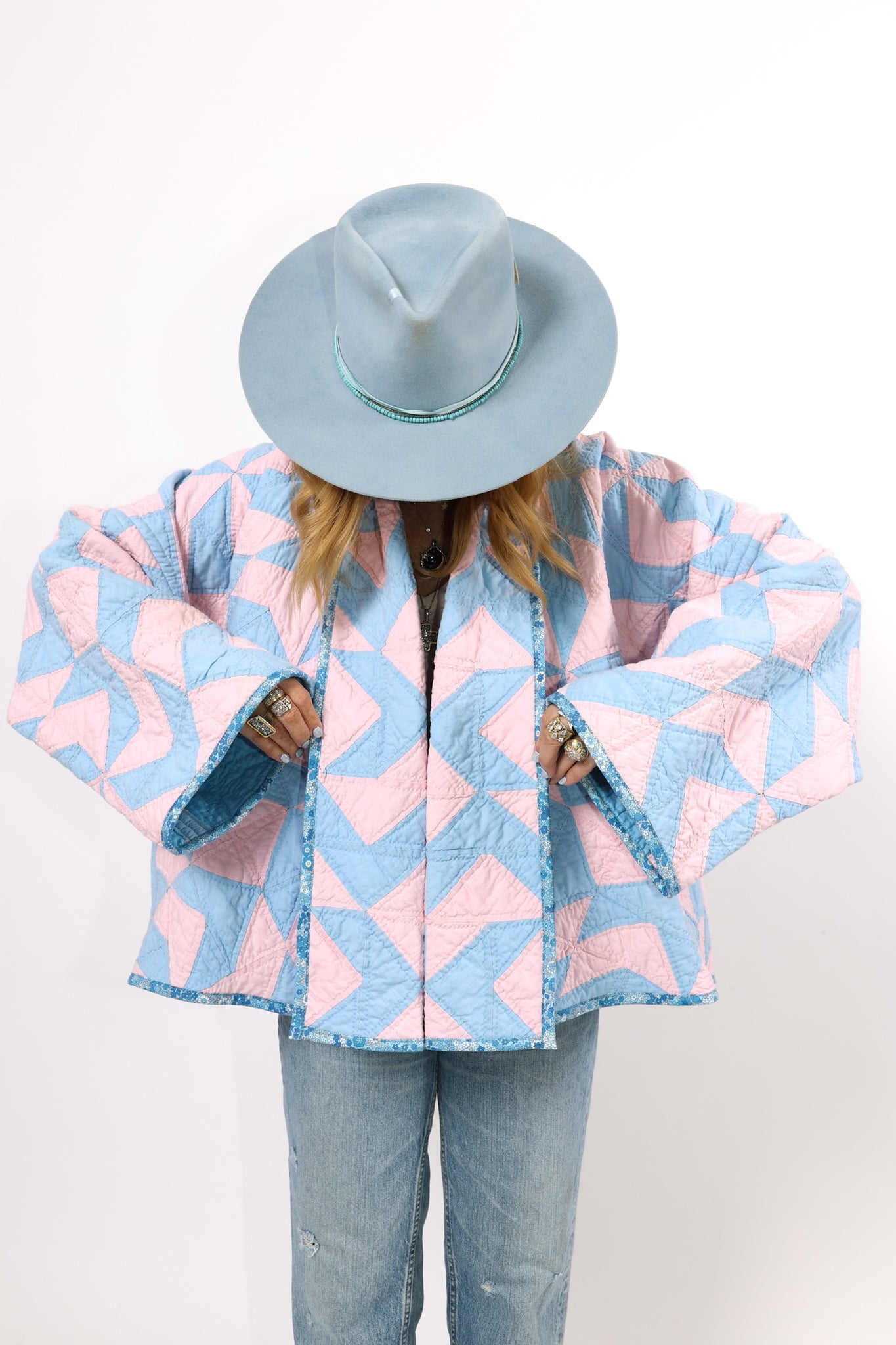 This is an antique American quilt made circa 1930s to 1960s. It is a traditional Virginia Reel or Zig Zag quilt pattern. The maker both hand quilted and hand sewed this piece, which is a labor of love and a lost art. We love that the maker backed the quilt(inside of jacket) with a coordinating blue fabric. This makes the jacket look great when worn upside down! We love the two tone pastels in this piece and would style it with white jeans in the summer! In our opinion, the quilt is thin, soft, lightweight, has a little loft(puffiness), and has a great drape. If you have further questions, please direct message us and we are happy to send you a video.