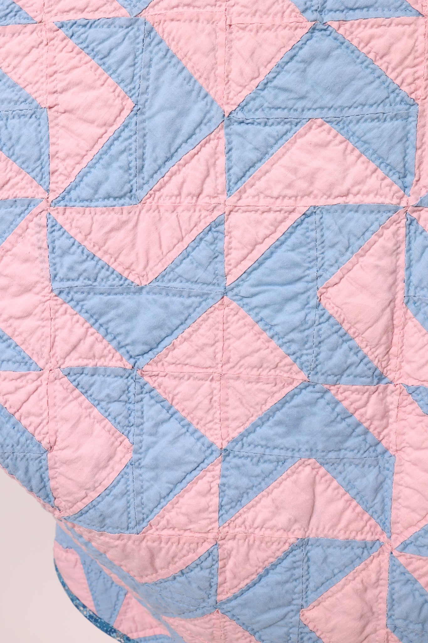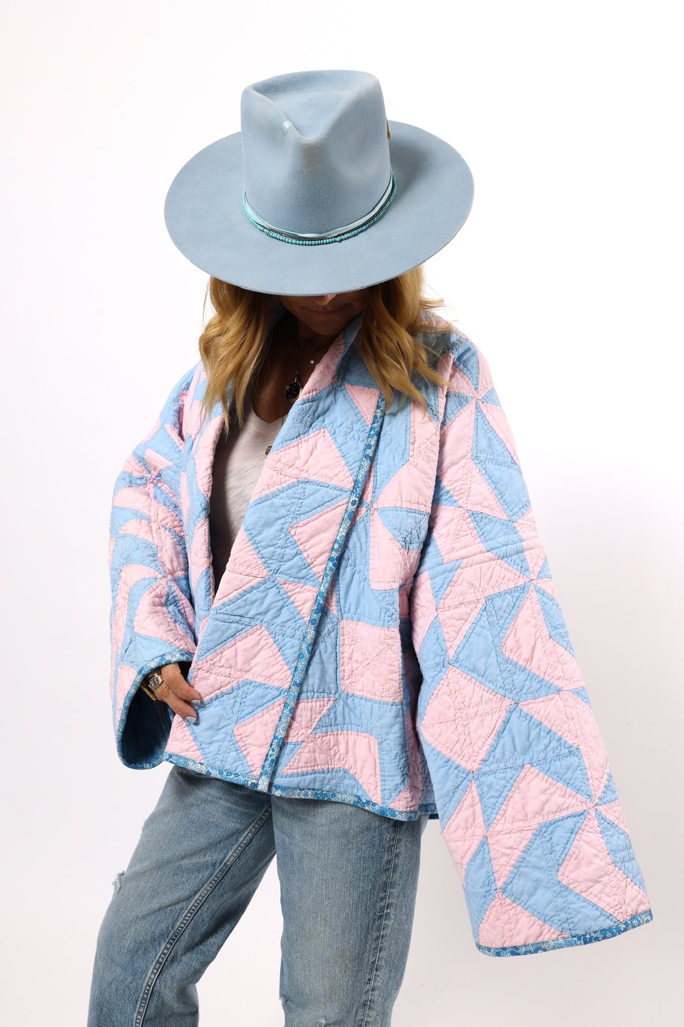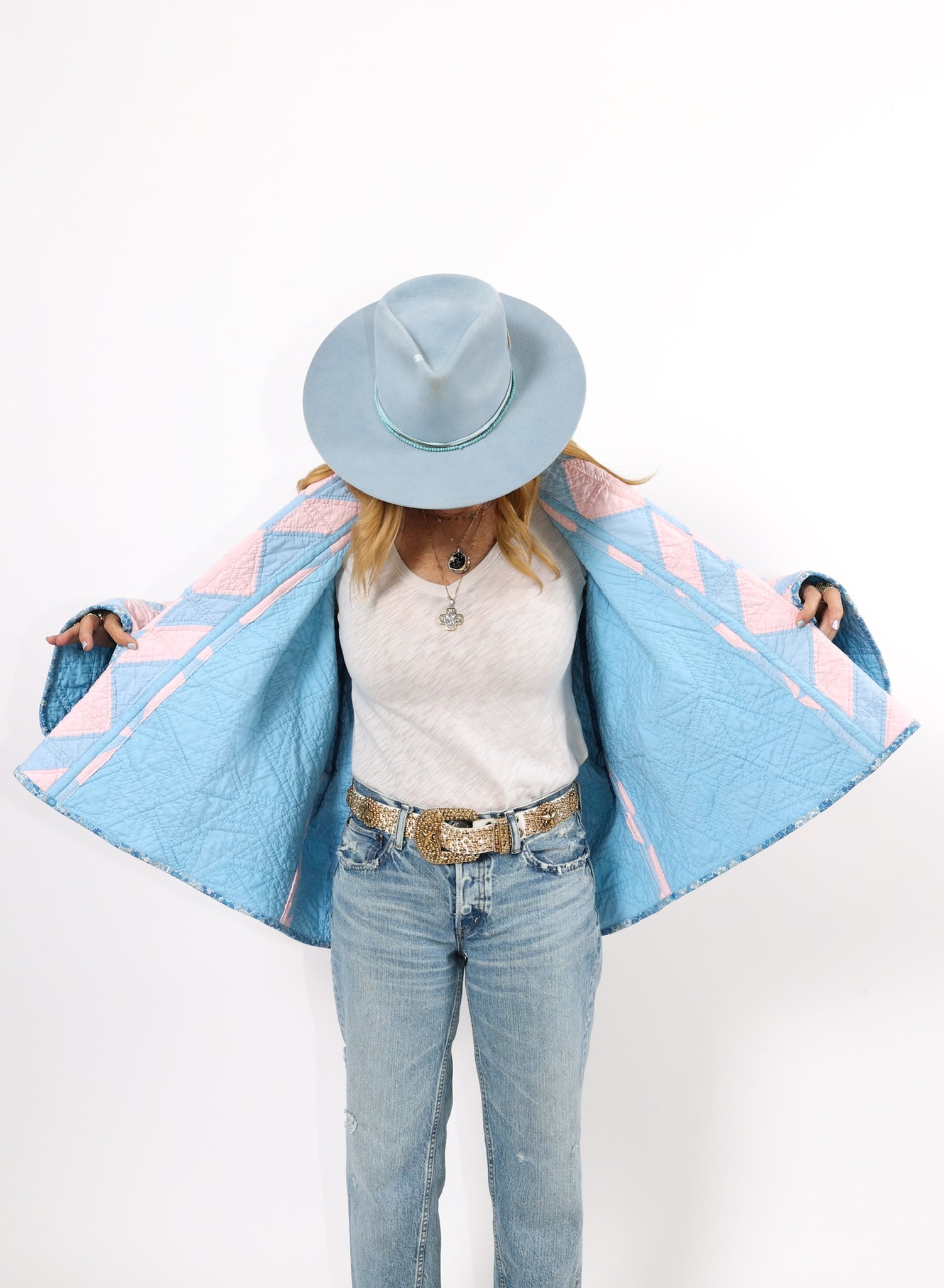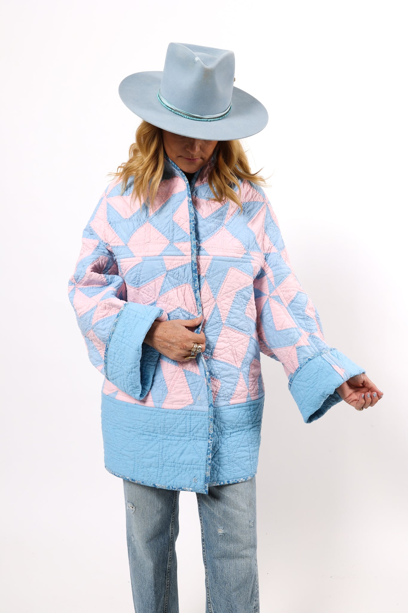 This is an antique American quilt made circa 1930s to 1960s. It is a traditional Virginia Reel or Zig Zag quilt pattern. The maker both hand quilted and hand sewed this piece, which is a labor of love and a lost art. We love that the maker backed the quilt(inside of jacket) with a coordinating blue fabric. This makes the jacket look great when worn upside down! We love the two tone pastels in this piece and would style it with white jeans in the summer! In our opinion, the quilt is thin, soft, lightweight, has a little loft(puffiness), and has a great drape. If you have further questions, please direct message us and we are happy to send you a video.