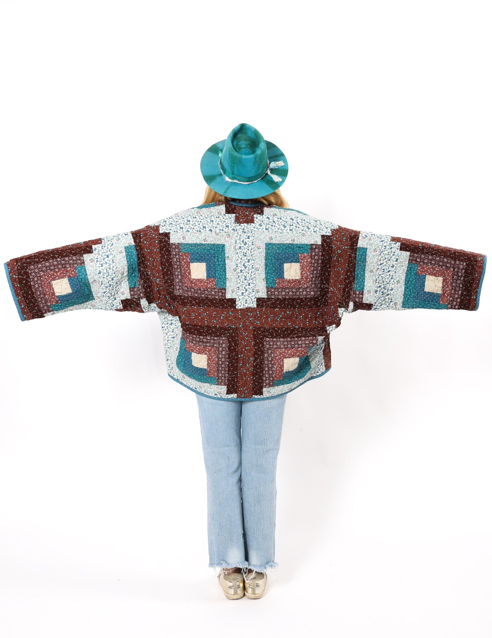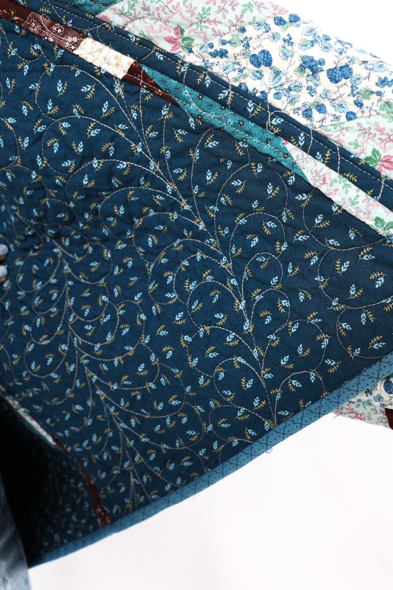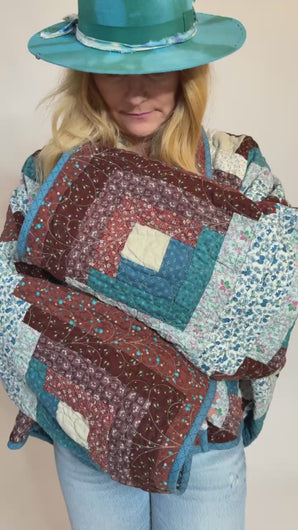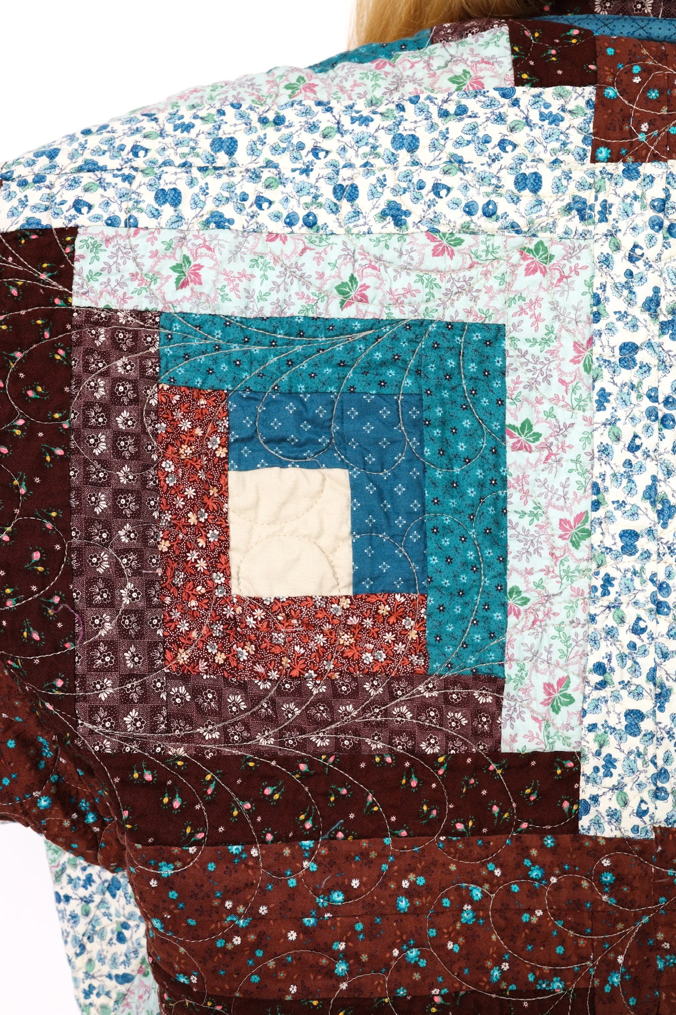 This is a vintage American quilt. The top was made circa 1980s to early 2000s. To complete the quilt we backed the top with a coordinating blue novelty fabric. The quilt is a traditional Log Cabin quilt pattern. We love the neutral colorway of this piece! It is both a work horse and show pony due to its newer fabrics! It is also a fashion multitasker! You will want to wear this piece inside out and upside down! In our opinion, the jacket is super soft, very thin, and lightweight with little to no loft. Since this piece has seen to pre-love, the drape will get better with each and every wear! If you have further questions, please direct message us and we are happy to send you a video.