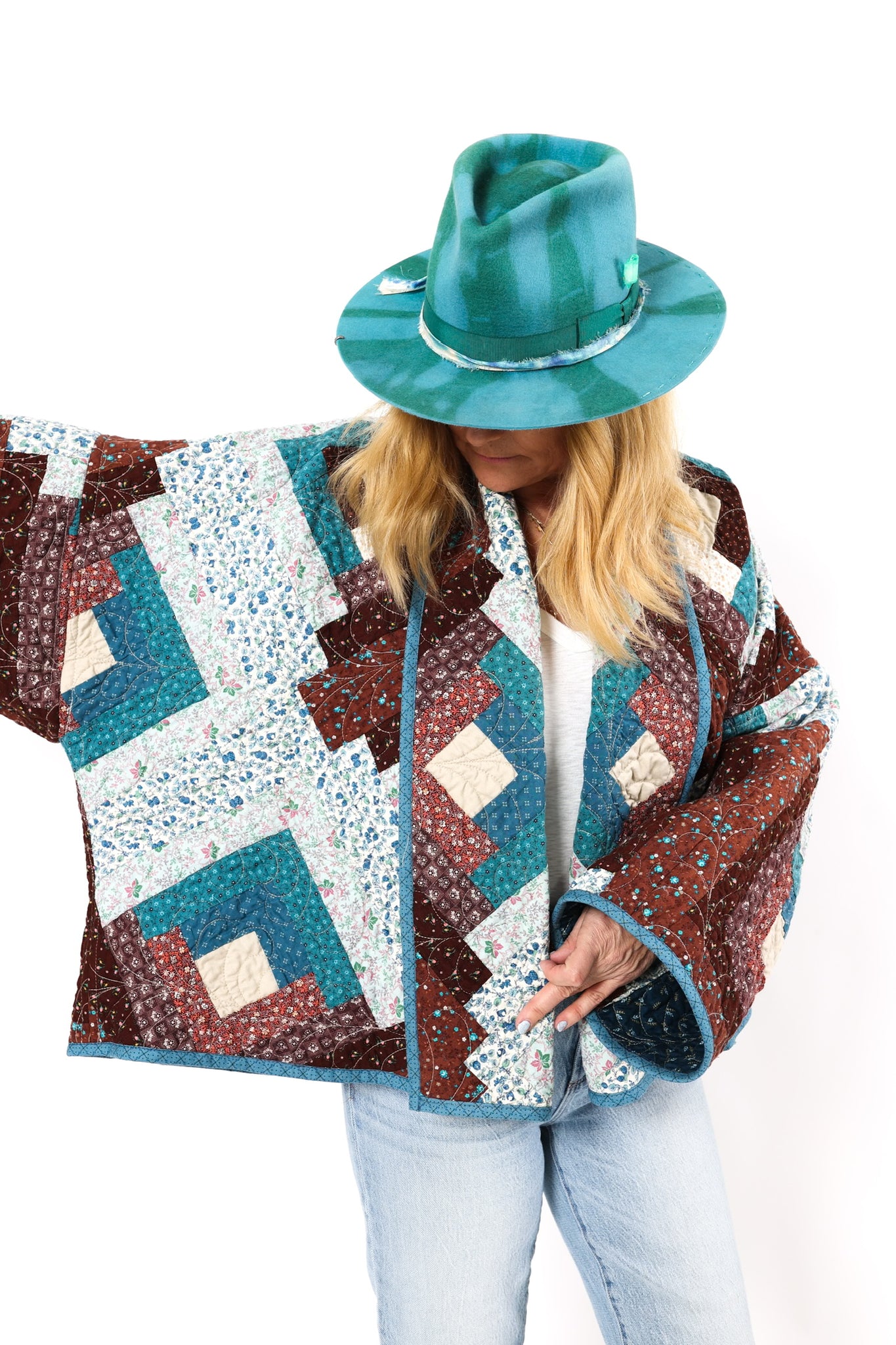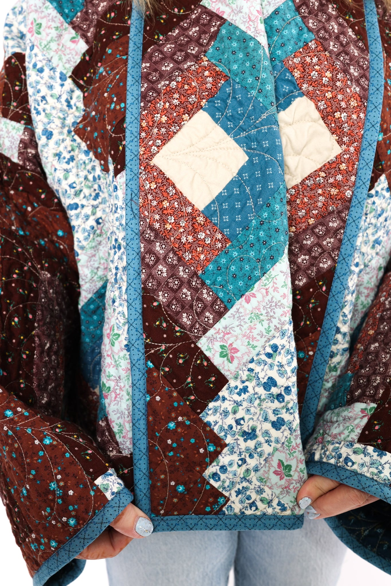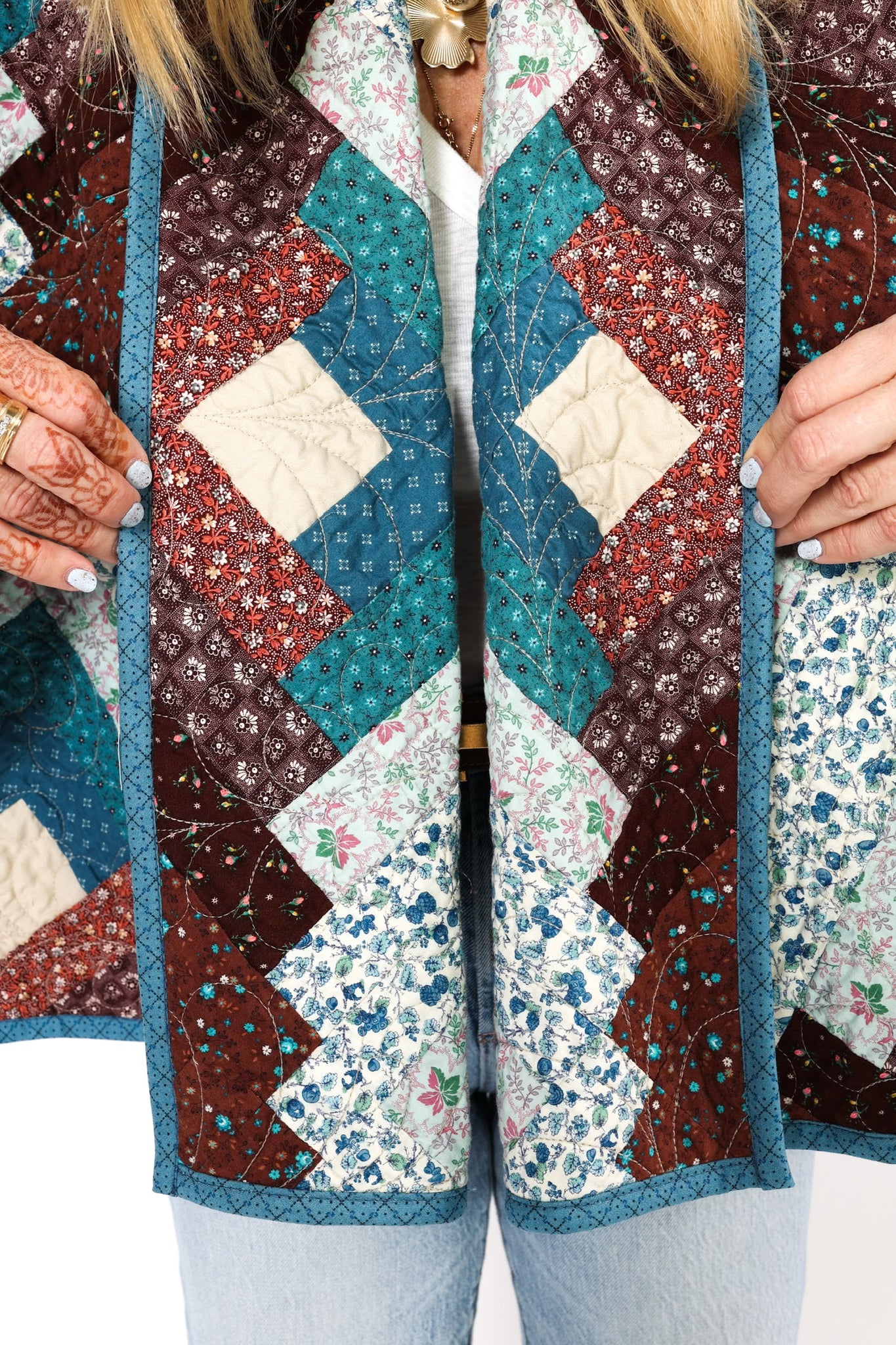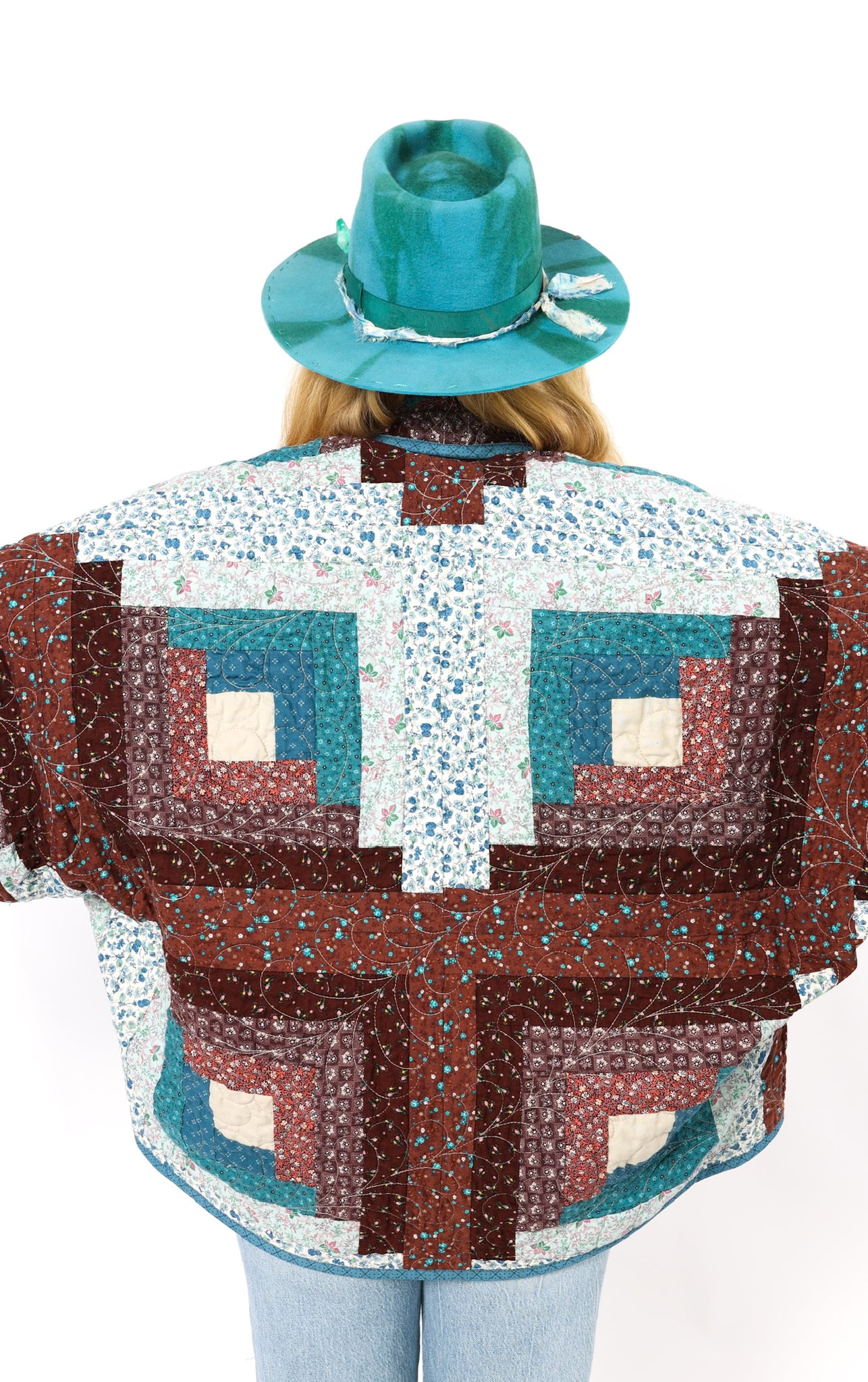 This is a vintage American quilt. The top was made circa 1980s to early 2000s. To complete the quilt we backed the top with a coordinating blue novelty fabric. The quilt is a traditional Log Cabin quilt pattern. We love the neutral colorway of this piece! It is both a work horse and show pony due to its newer fabrics! It is also a fashion multitasker! You will want to wear this piece inside out and upside down! In our opinion, the jacket is super soft, very thin, and lightweight with little to no loft. Since this piece has seen to pre-love, the drape will get better with each and every wear! If you have further questions, please direct message us and we are happy to send you a video.