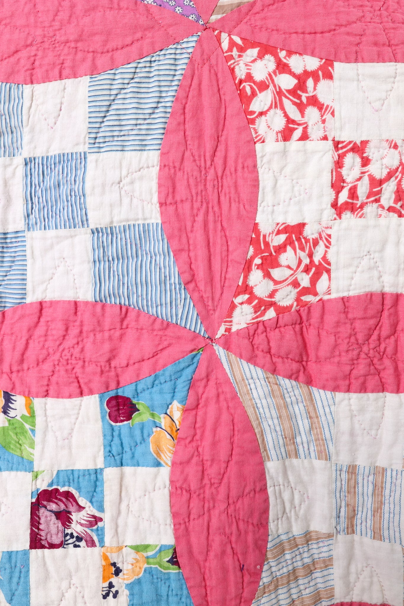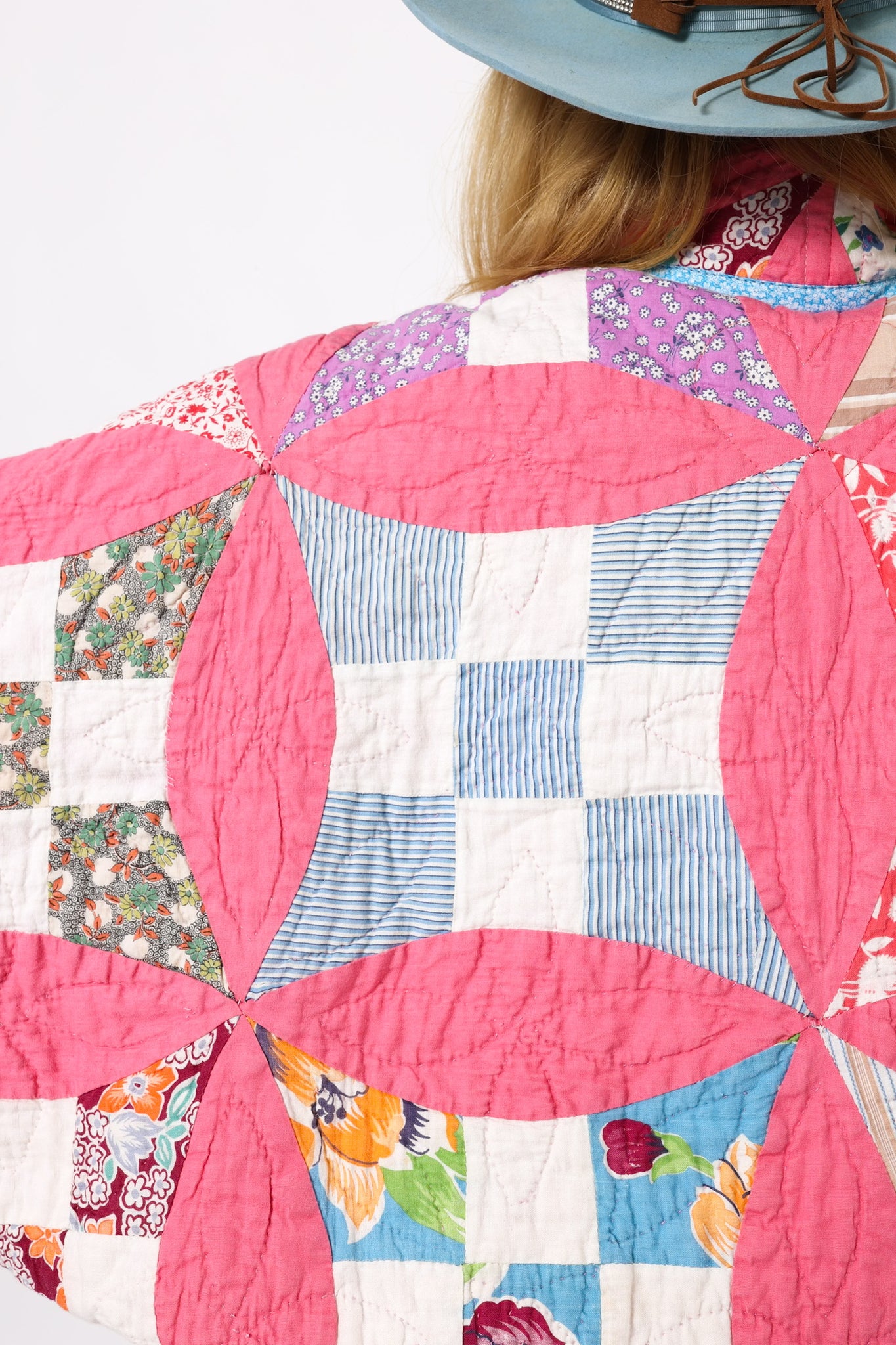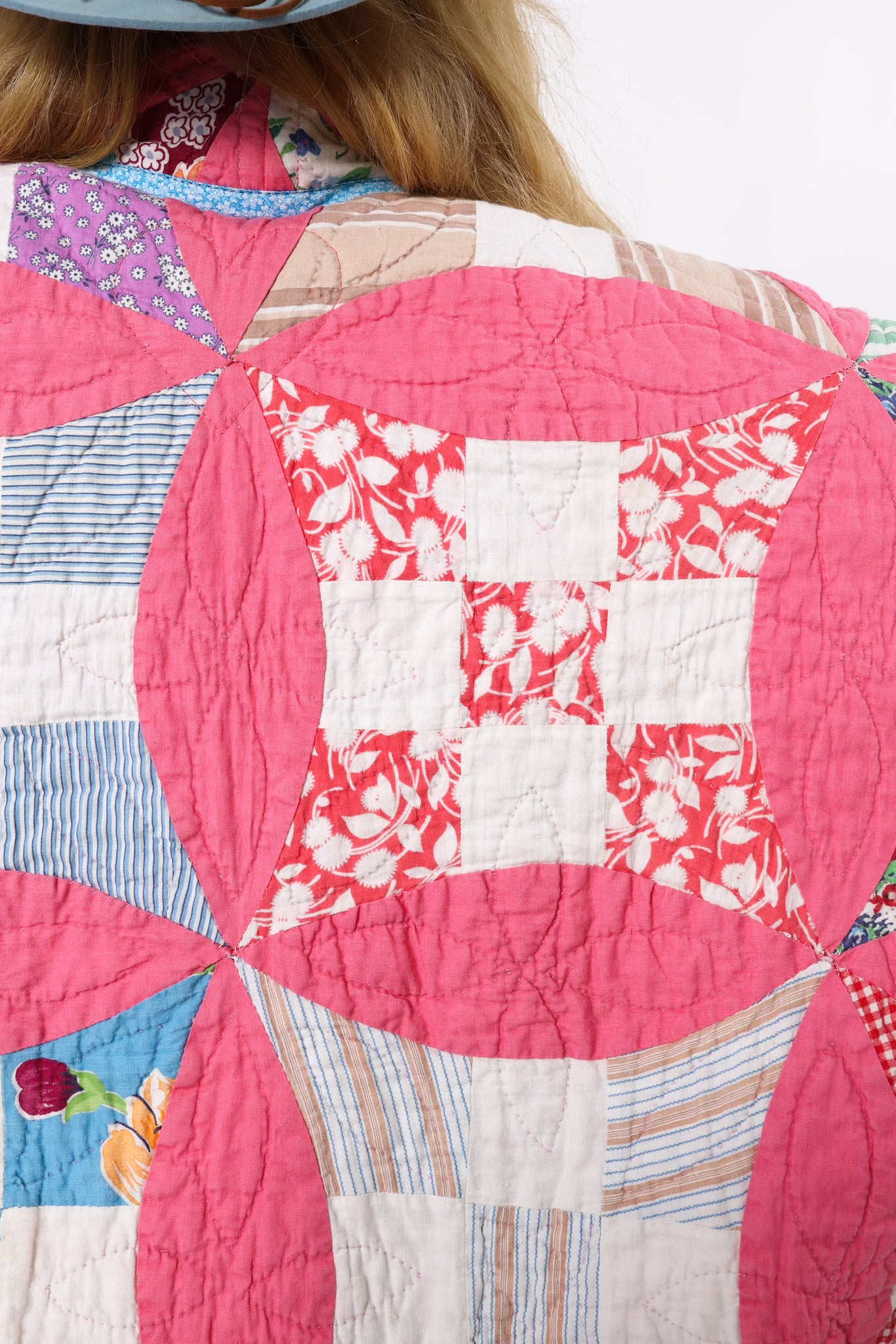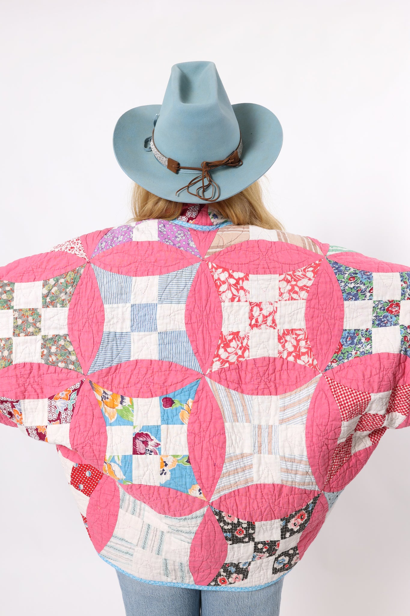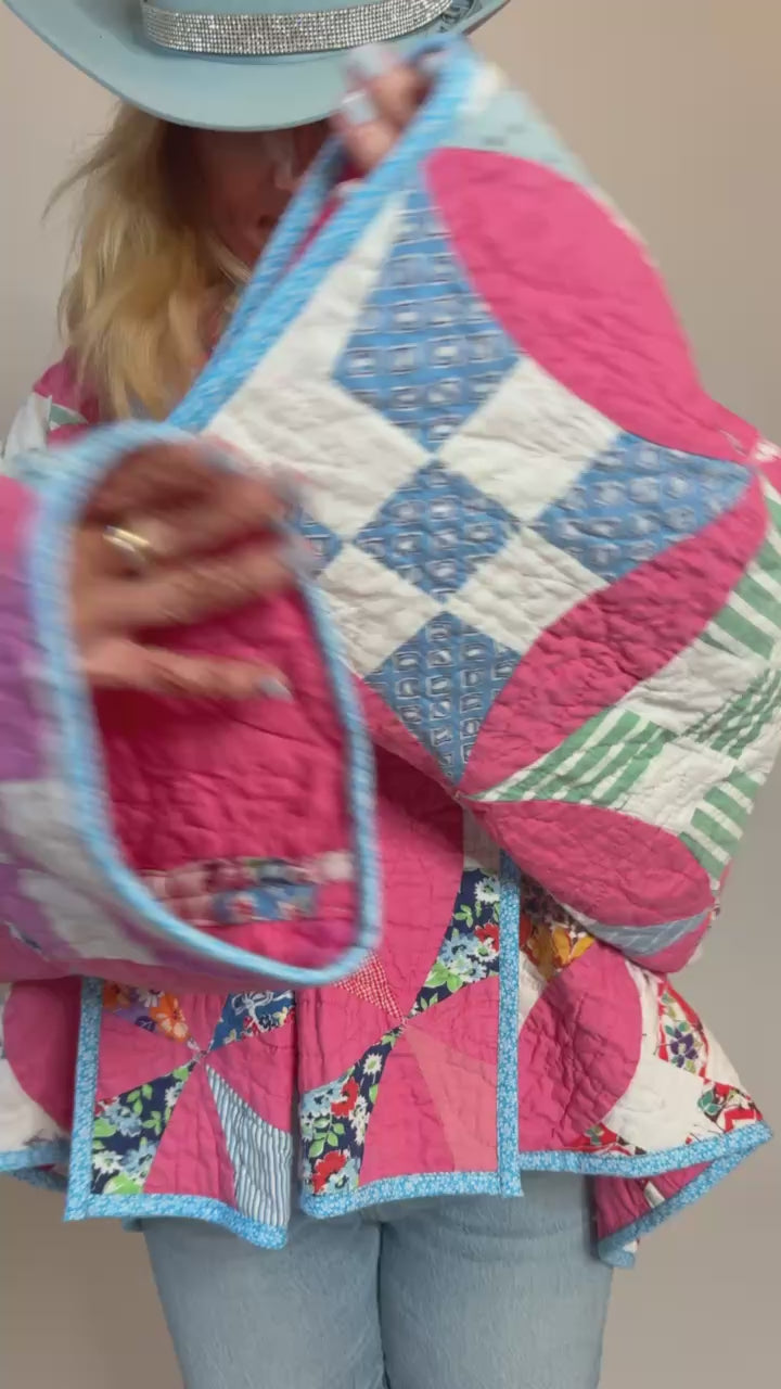 This is an Antique American quilt made circa 1930s to 1940s. It is a traditional Improved Nine Patch or Circle Upon Circle quilt pattern. The quilt has been beautifully hand quilted. We love the 1930's novelty fabrics the maker used! The quilt is backed(inside of jacket) with coordinating pink fabric. You will want to cuff the sleeves to show this off! In our opinion, the jacket is super soft, thin, lightweight, and has a great drape! The quilt is in great condition for its age! If you have further questions, please direct message us and we are happy to send you a video.