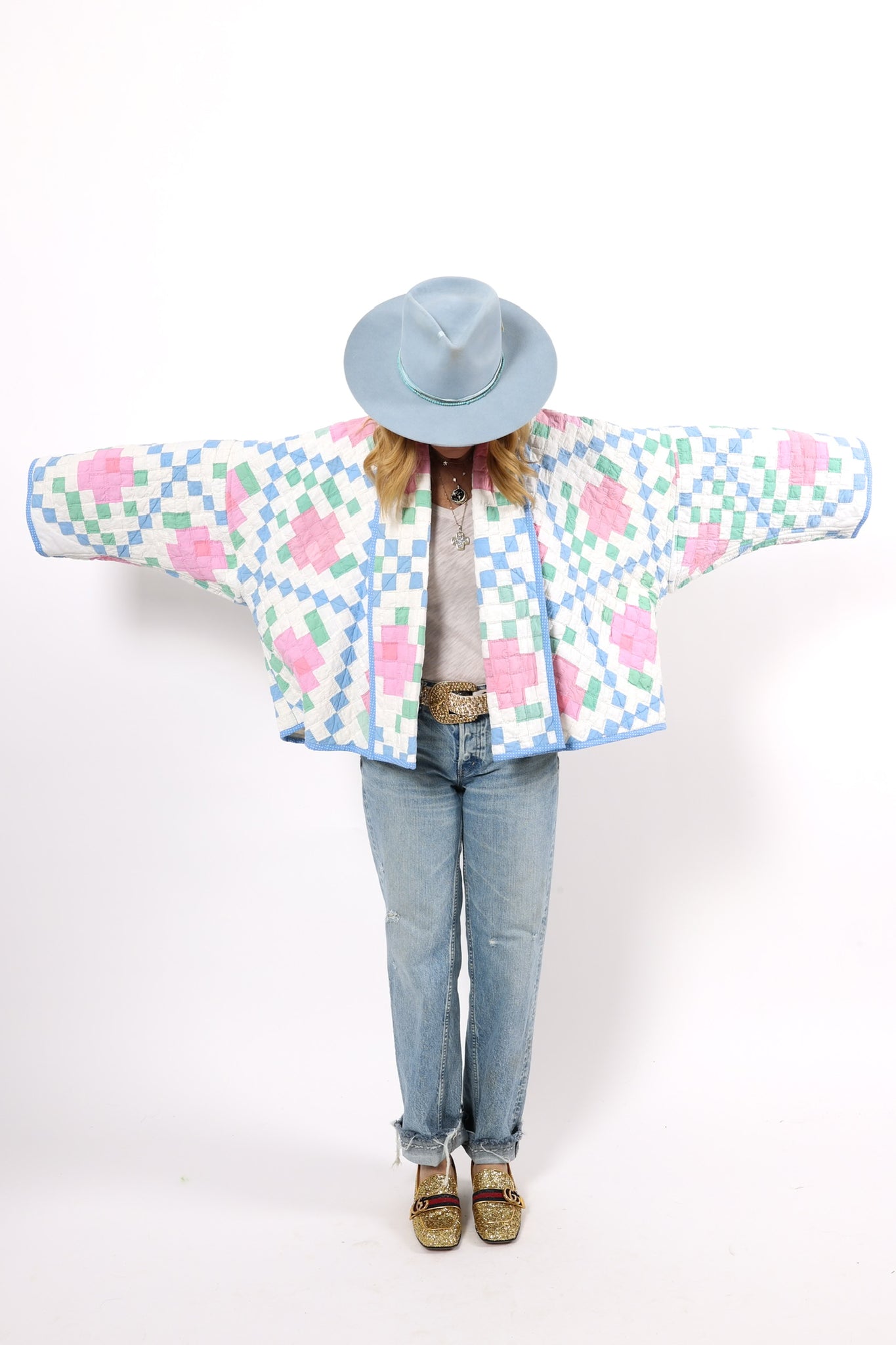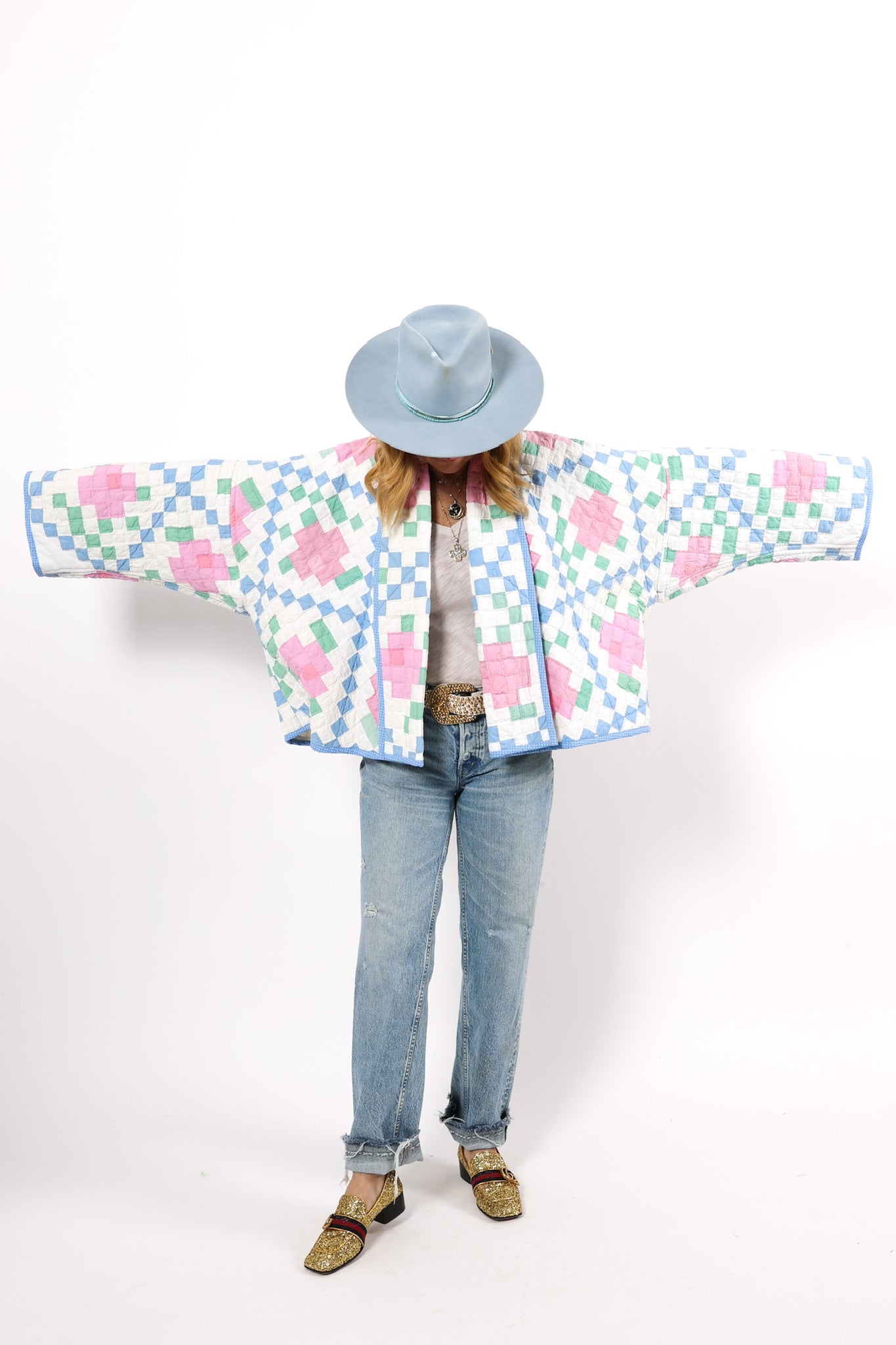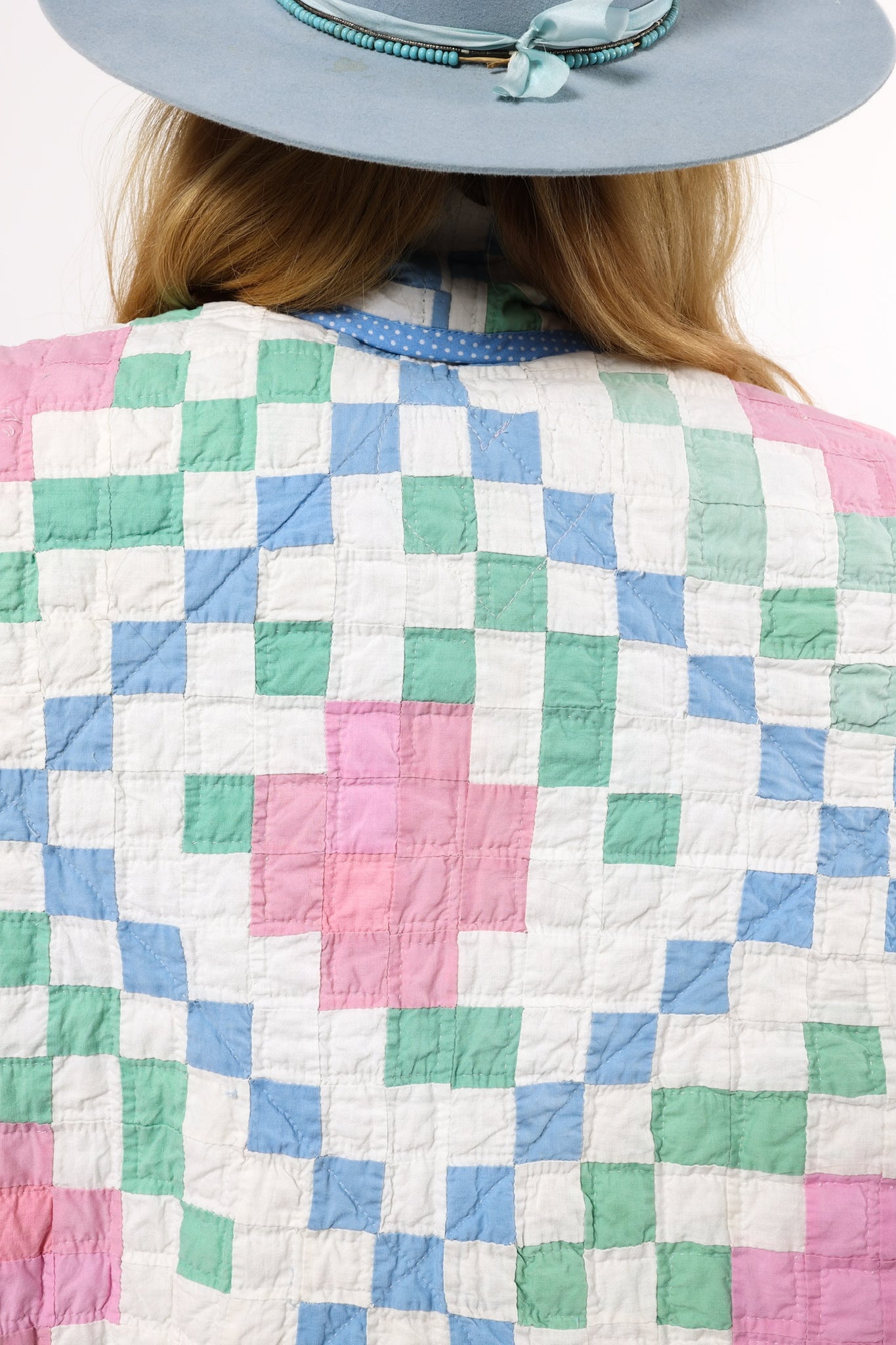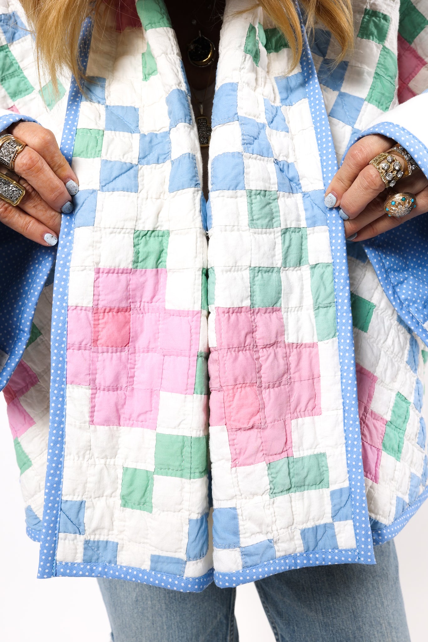 This is an American antique quilt started in 1935 and completed in 1936 by Kittie J. Loughlin. We know this because Kittie hand embroidered her name and these dates into the quilt. Kittie beautifully hand quilted and hand sewed this quilt, which is a labor of love and a lost art. It is a traditional Irish Chain quilt pattern with the addition of flowers inside the Irish Chain. The quilt is absolutely gorgeous. In our opinion, the quilt is thin, soft, lightweight, and has a super flattering drape. Please note to add interest and fun to the piece we lined the sleeves with coordinating blue polka dot fabric. You will want to cuff the sleeves to show this off! If you have further questions, please direct message us and we are happy to send you a video.