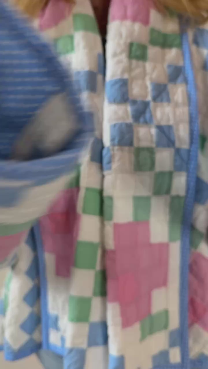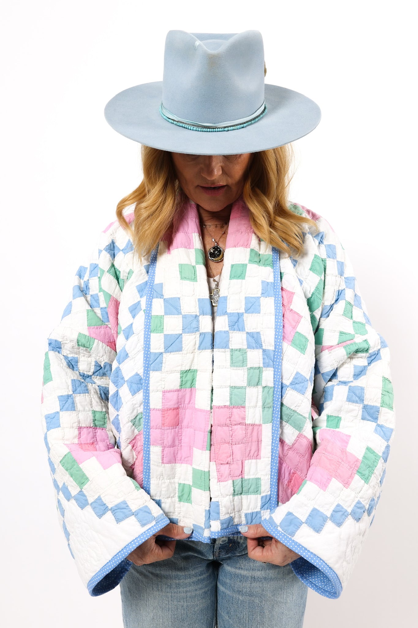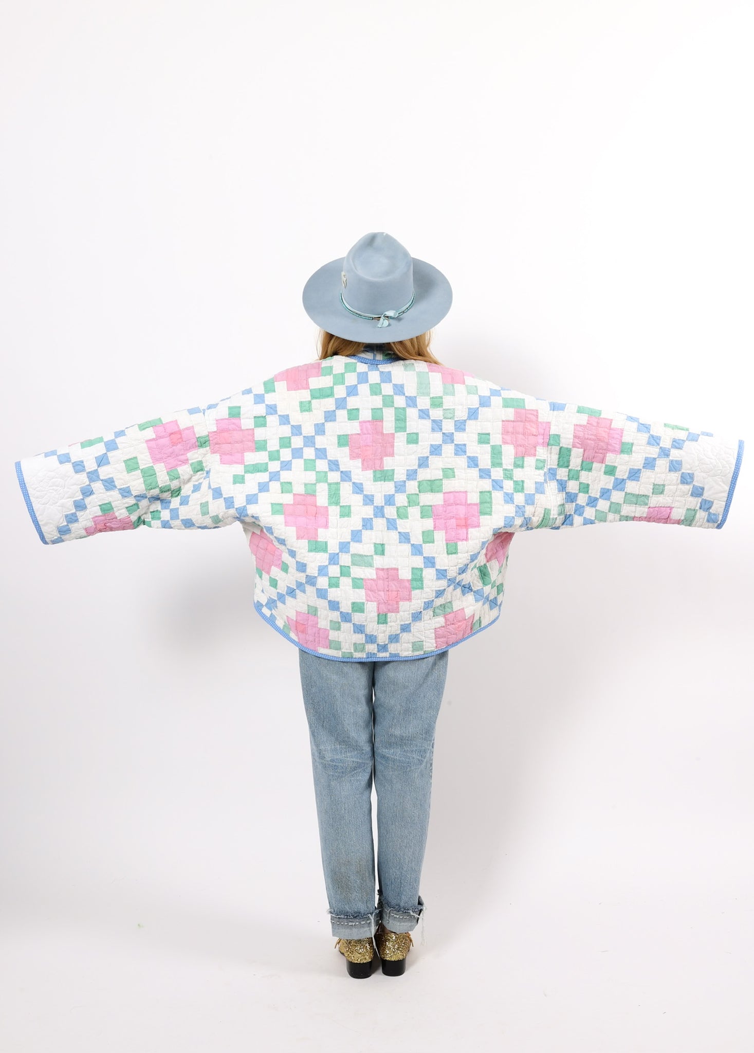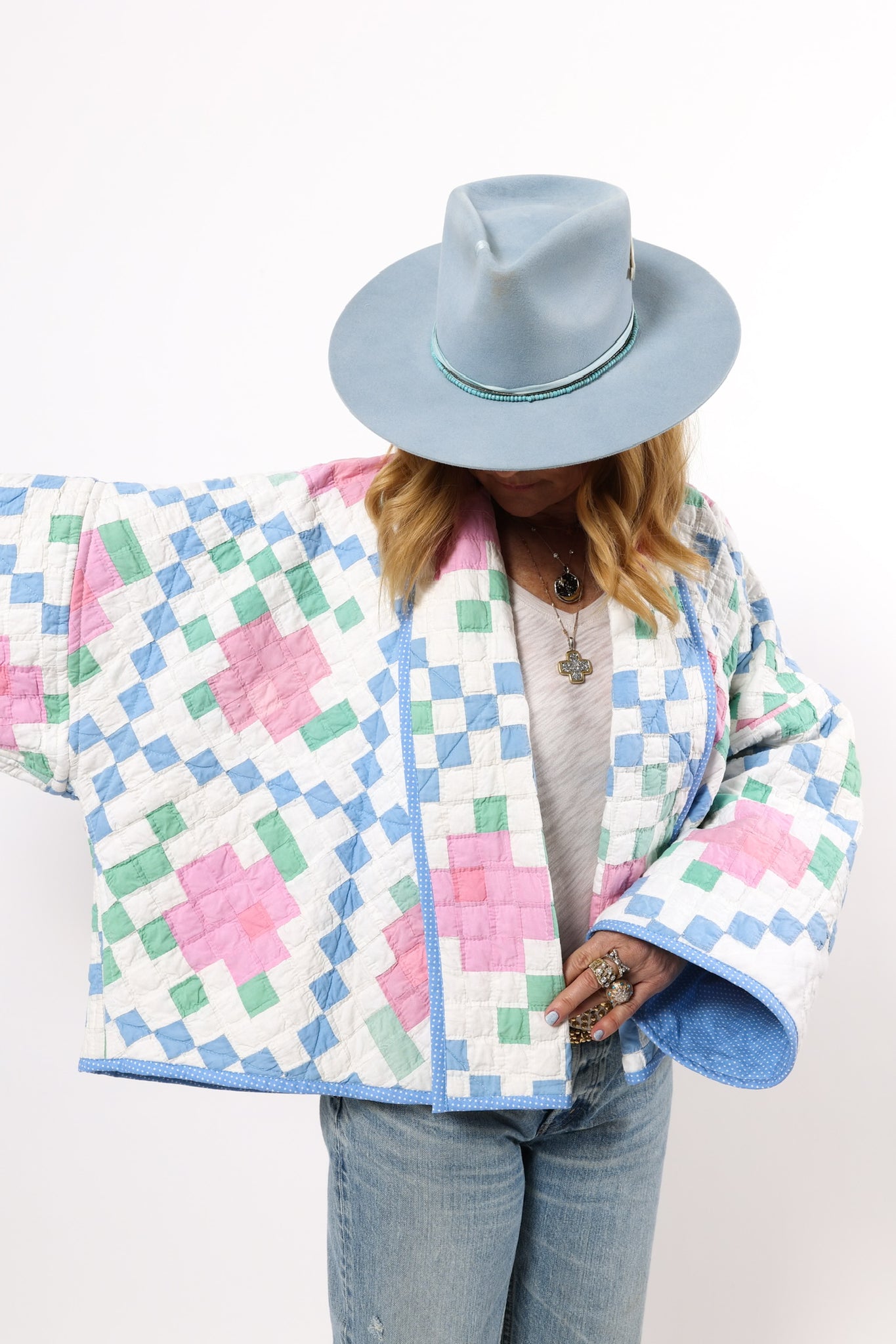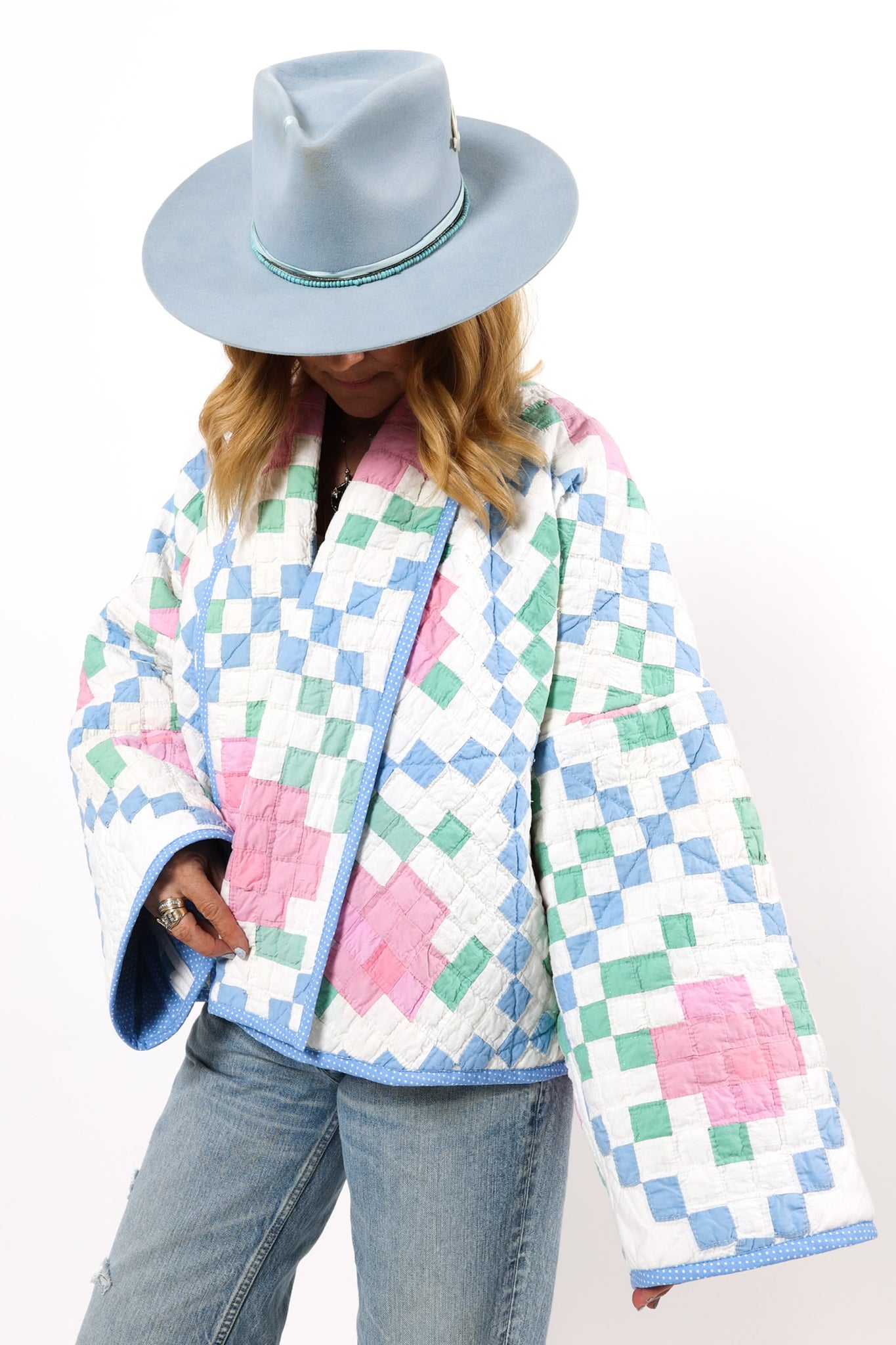 This is an American antique quilt started in 1935 and completed in 1936 by Kittie J. Loughlin. We know this because Kittie hand embroidered her name and these dates into the quilt. Kittie beautifully hand quilted and hand sewed this quilt, which is a labor of love and a lost art. It is a traditional Irish Chain quilt pattern with the addition of flowers inside the Irish Chain. The quilt is absolutely gorgeous. In our opinion, the quilt is thin, soft, lightweight, and has a super flattering drape. Please note to add interest and fun to the piece we lined the sleeves with coordinating blue polka dot fabric. You will want to cuff the sleeves to show this off! If you have further questions, please direct message us and we are happy to send you a video.