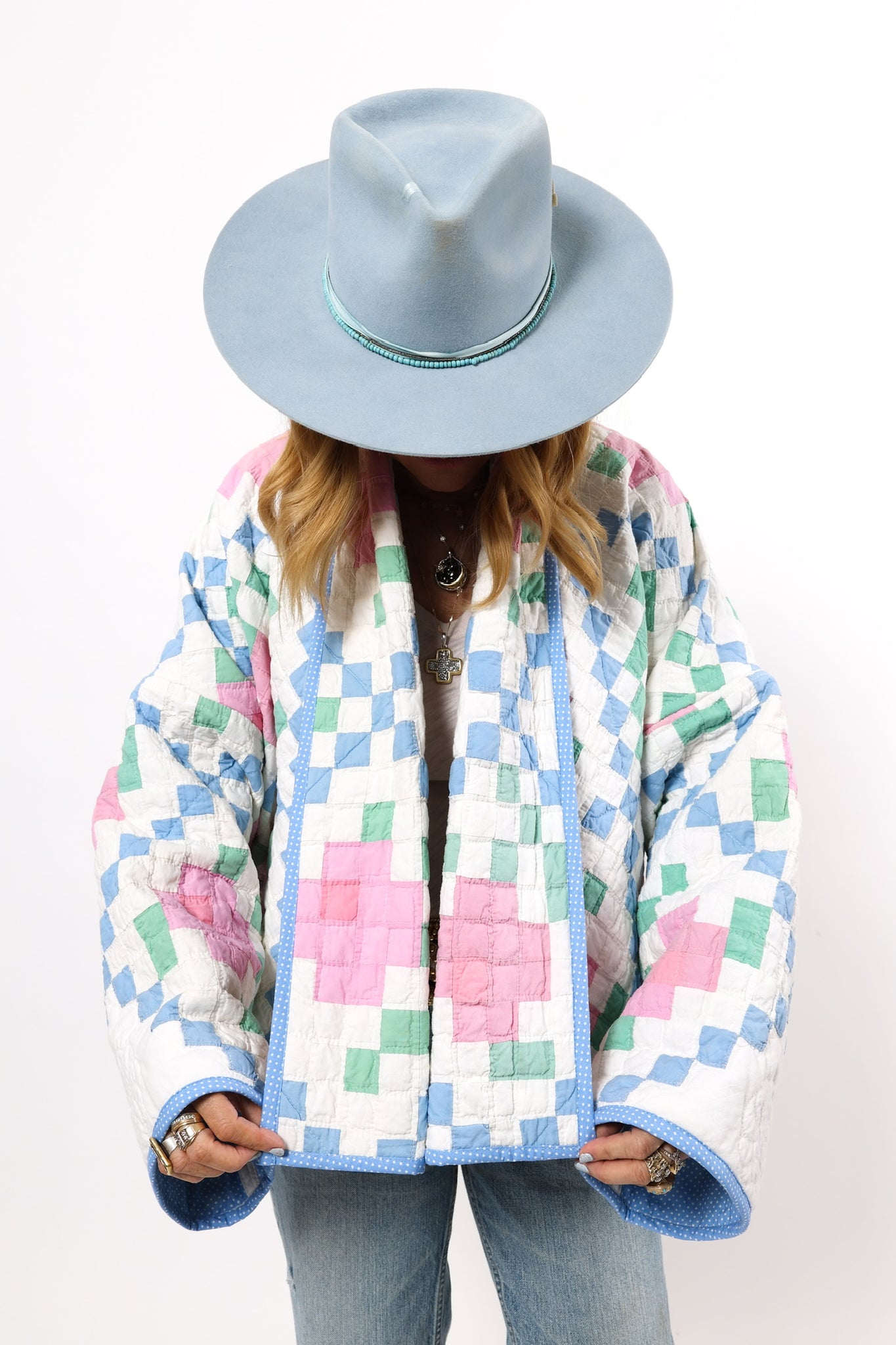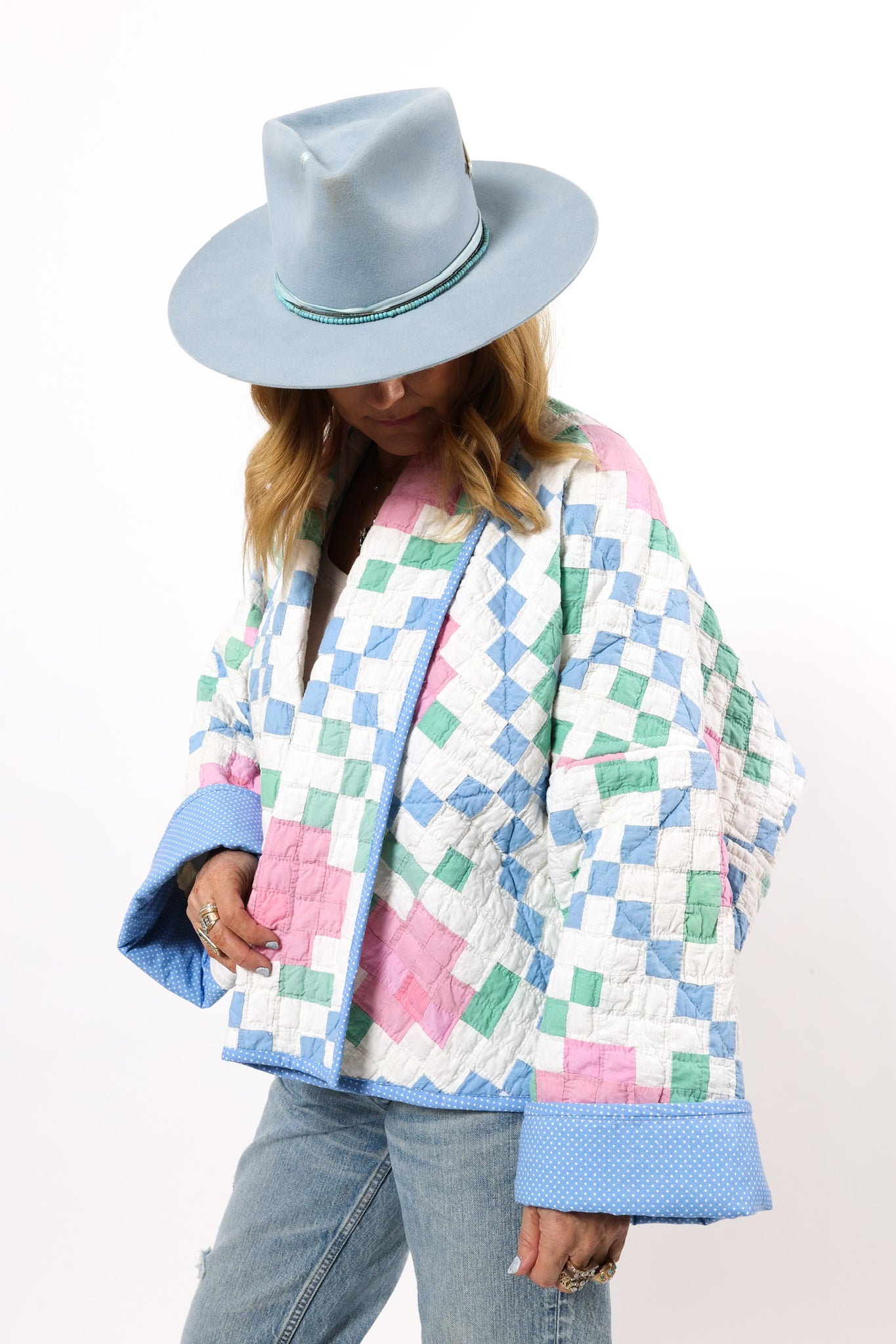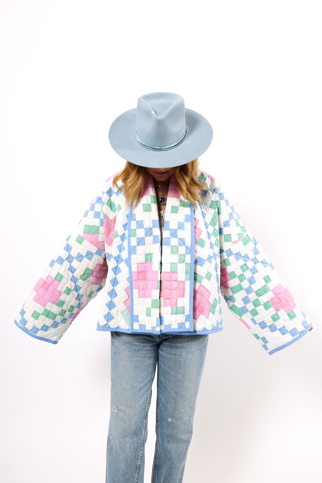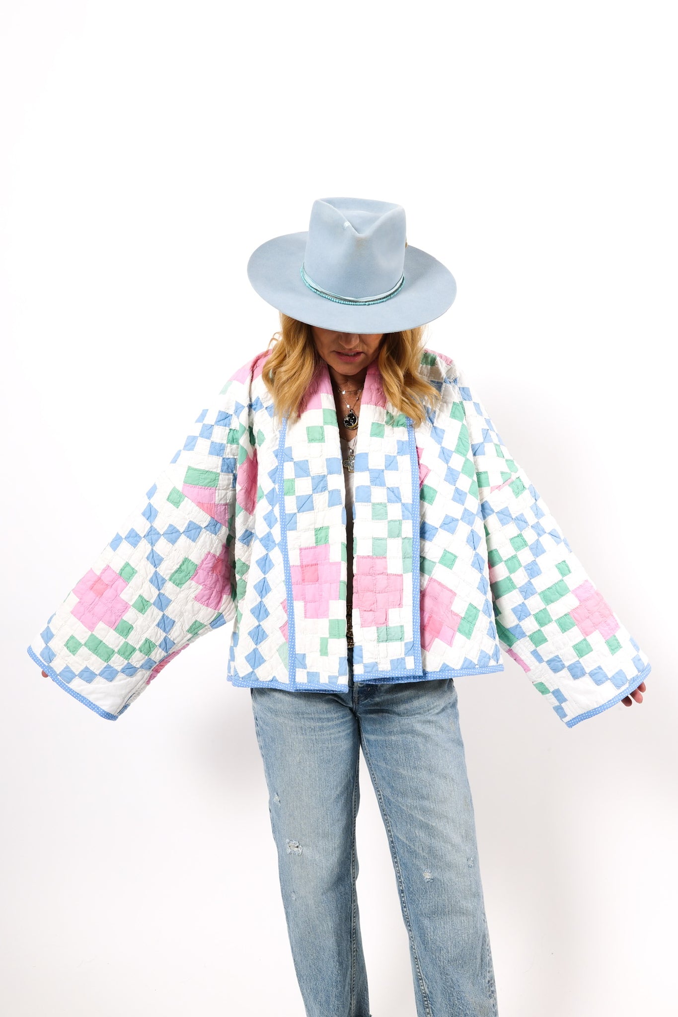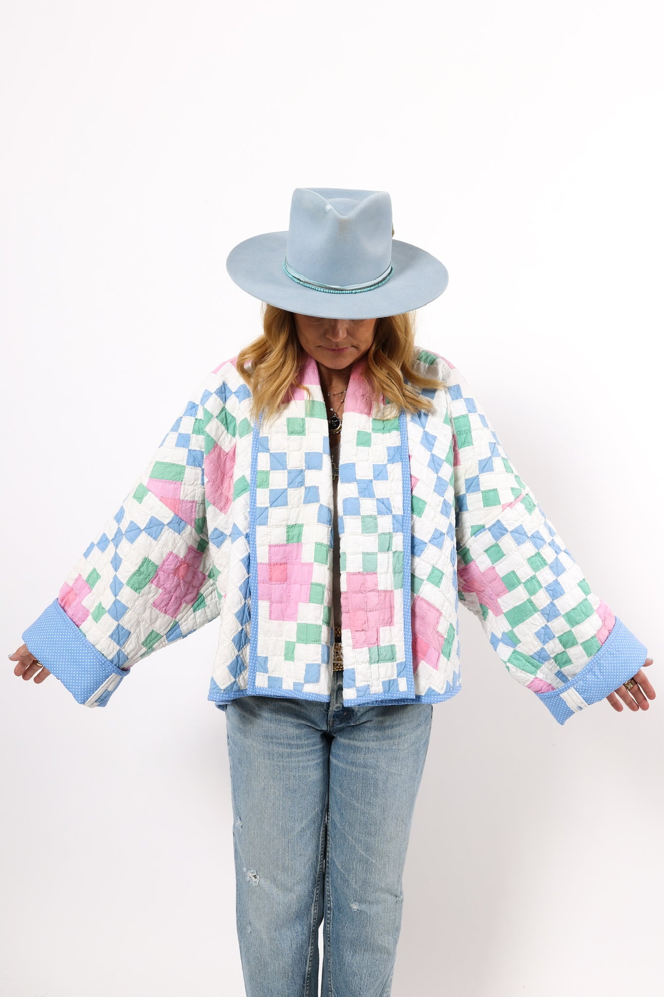 This is an American antique quilt started in 1935 and completed in 1936 by Kittie J. Loughlin. We know this because Kittie hand embroidered her name and these dates into the quilt. Kittie beautifully hand quilted and hand sewed this quilt, which is a labor of love and a lost art. It is a traditional Irish Chain quilt pattern with the addition of flowers inside the Irish Chain. The quilt is absolutely gorgeous. In our opinion, the quilt is thin, soft, lightweight, and has a super flattering drape. Please note to add interest and fun to the piece we lined the sleeves with coordinating blue polka dot fabric. You will want to cuff the sleeves to show this off! If you have further questions, please direct message us and we are happy to send you a video.